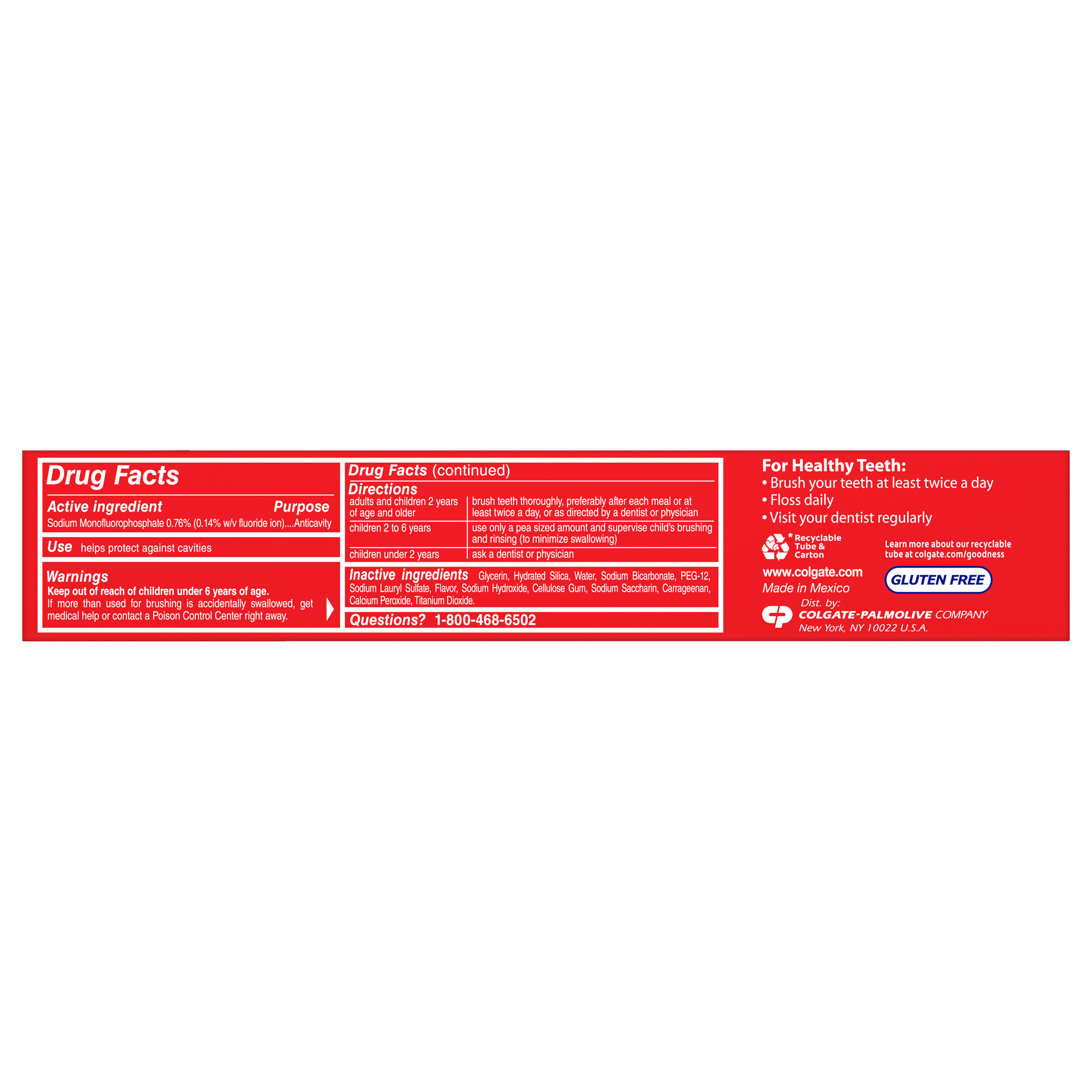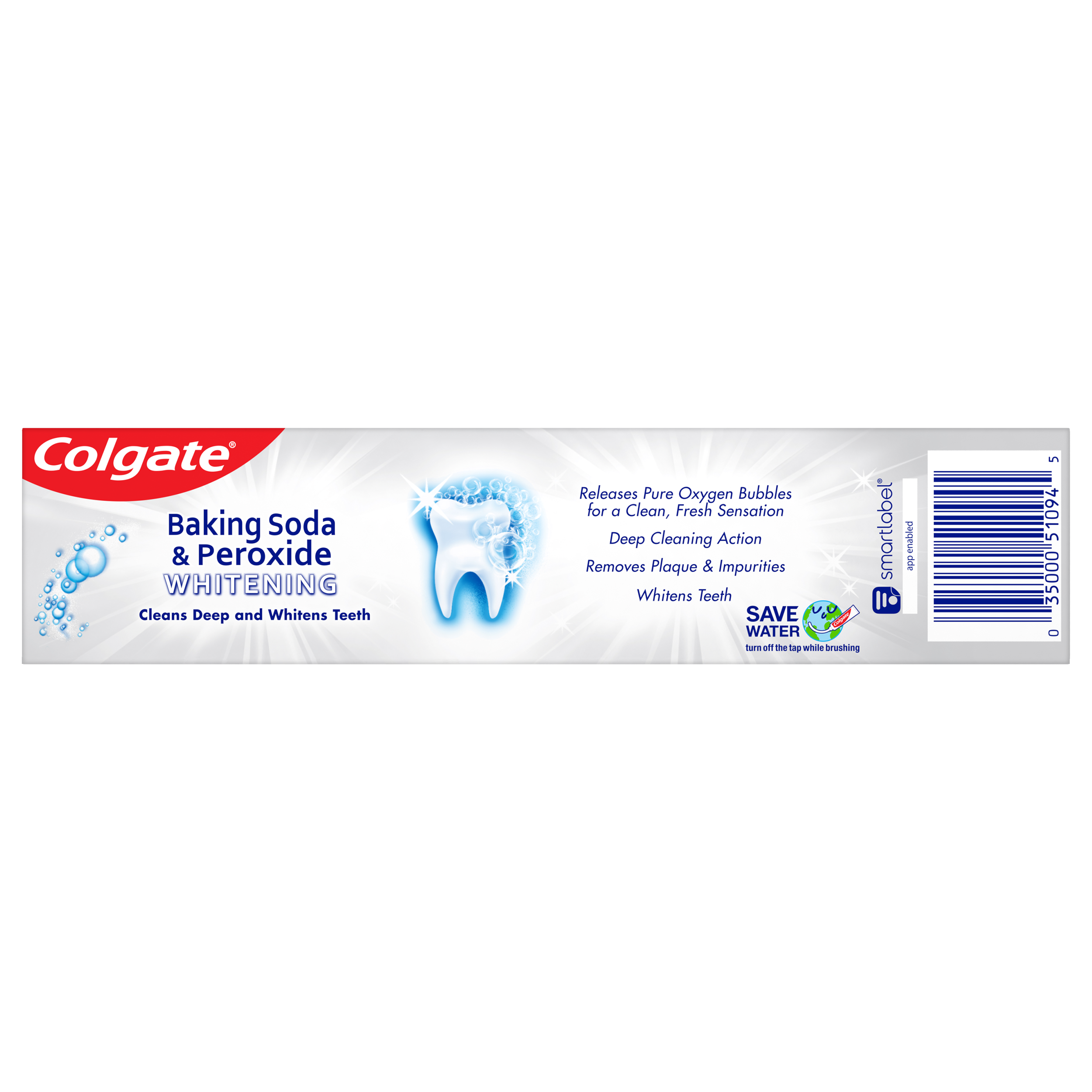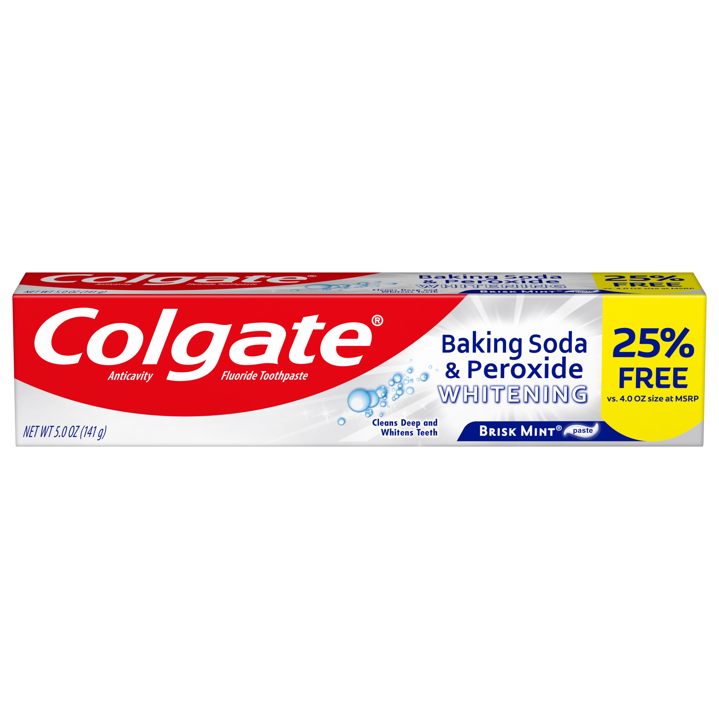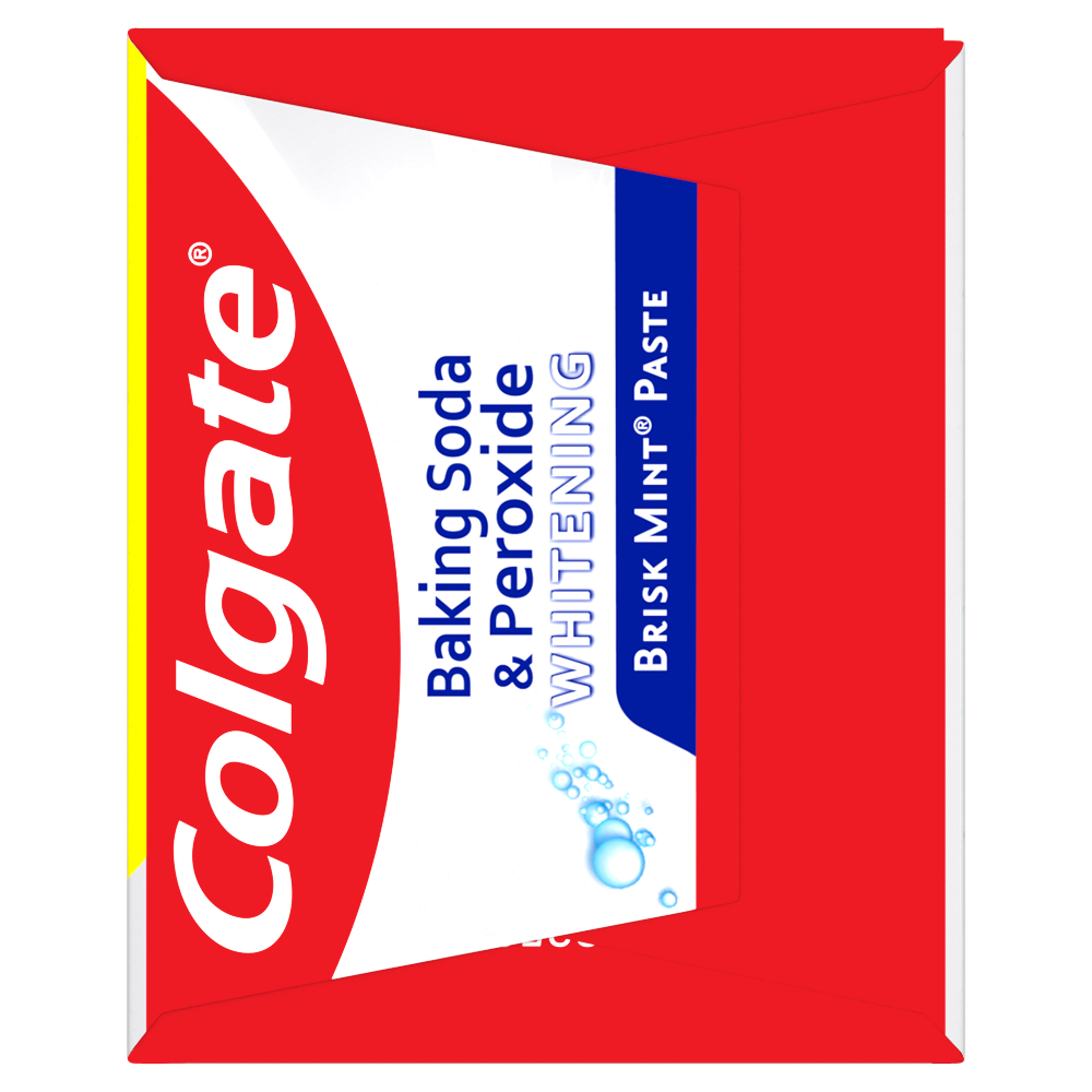 SKU 151094 Consumer Unit - GTIN 00035000510945 Case - GTIN 10035000510942 Product Category Oral Care Product Sub Category Toothpaste Product Equity (Brand) Colgate Product Sub Brand Colgate Baking Soda TP Product Title Colgate Baking Soda and Peroxide Whitening Toothpaste, Brisk Mint - 4 Ounce + 25% Free Product Description Colgate Baking Soda and Peroxide Whitening Toothpaste, with a great Brisk Mint flavor, refreshes & cleans for whiter teeth. This whitening toothpaste cleans deep, preventing cavities and the build-up of tartar. Our unique formula releases pure oxygen bubbles every time you brush your teeth for a clean, fresh sensation. This baking soda and peroxide whitening toothpaste has a Brisk Mint flavor that freshens breath. Bullet 1 Whitening toothpaste releases pure oxygen bubbles for a clean fresh sensation Bullet 2 Helps remove teeth stains Bullet 3 Cleans deep and whitens teeth Bullet 4 Fights cavities Bullet 5 Removes plaque and impurities Bullet 6 Long lasting cooling effect Active Ingredients Active Ingredient: Sodium Monofluorophosphate (0.76% (0.14% w/v Fluoride Ion)). Purpose: Anticavity. Dollar Tree RPC 240096