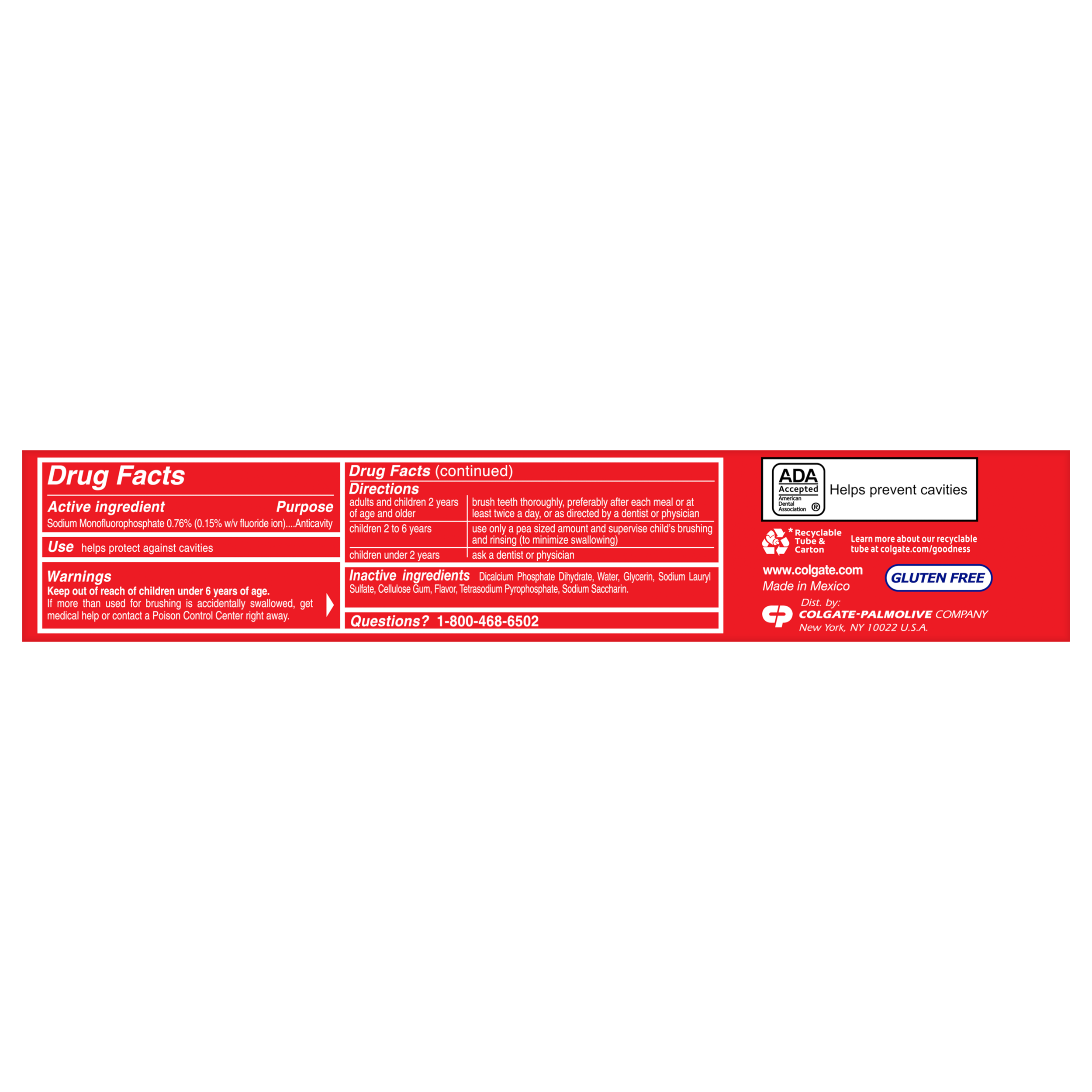 SKU 151108 Consumer Unit - GTIN 00035000511089 Case - GTIN 10035000511086 Product Category Oral Care Product Sub Category Toothpaste Product Equity (Brand) Colgate Product Sub Brand Colgate Maximum Cavity Protection TP Product Title Colgate Cavity Protection Toothpaste with Fluoride, Great Regular Flavor - 4 Ounce + 25% Free Product Description Colgate Cavity Protection Toothpaste with Fluoride provides trusted cavity protection for the entire family. Formulated with active fluoride, this toothpaste is clinically proven to help strengthen teeth and leave your mouth feeling fresh and clean. This Colgate toothpaste is ADA (American Dental Association) accepted. It has been trusted by dentists and parents globally for over 45 years. eCommerce Copy- Long Description Colgate Cavity Protection Toothpaste with Fluoride provides trusted cavity protection for the entire family. Formulated with active fluoride, this toothpaste is clinically proven to help strengthen teeth and leave your mouth feeling fresh and clean. This Colgate toothpaste is ADA (American Dental Association) accepted. It has been trusted by dentists and parents globally for over 45 years. Bullet 1 Fluoride toothpaste fights cavities Bullet 2 Cleans teeth thoroughly Bullet 3 Strengthens teeth enamel with active fluoride Bullet 4 Great Mint Taste Bullet 5 Anticavity fluoride toothpaste Active Ingredients Sodium Monofluorophosphate 0.76 % (0.15% w/v fluoride ion) Dollar Tree RPC 240094