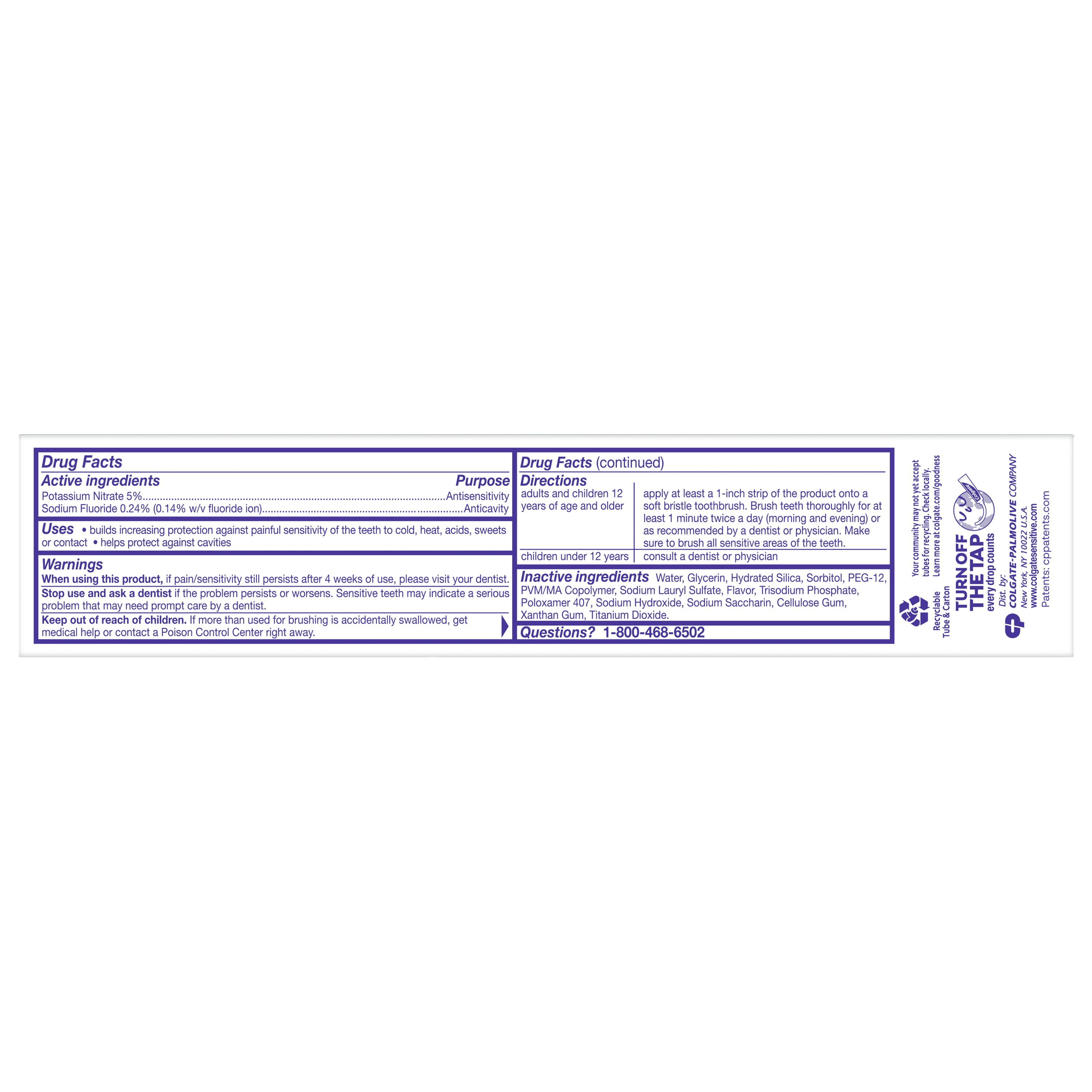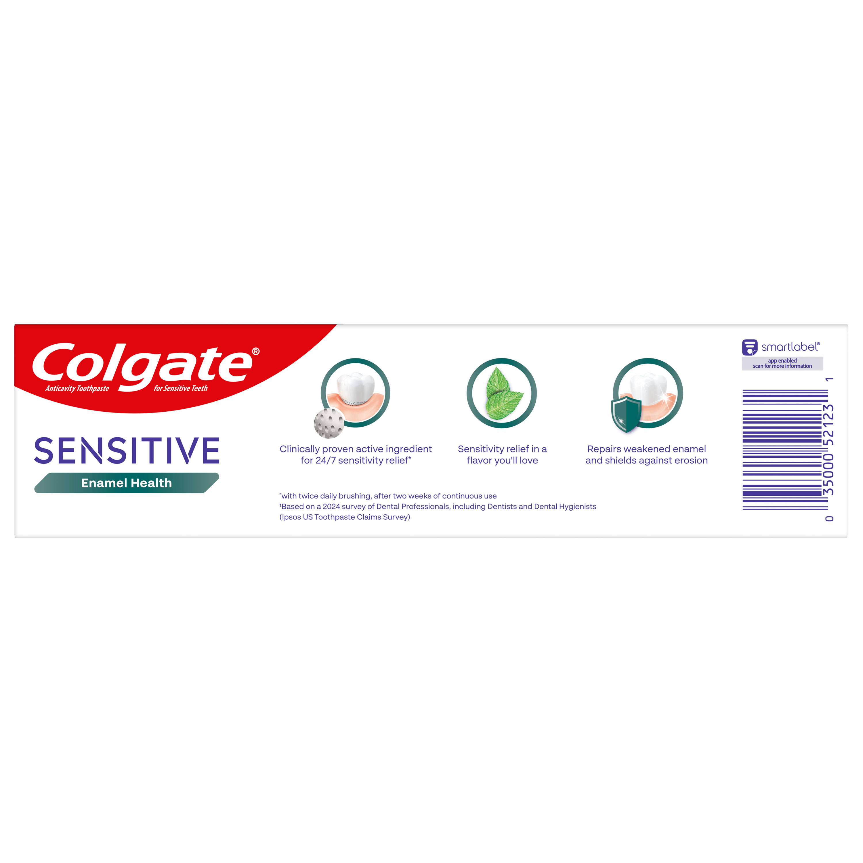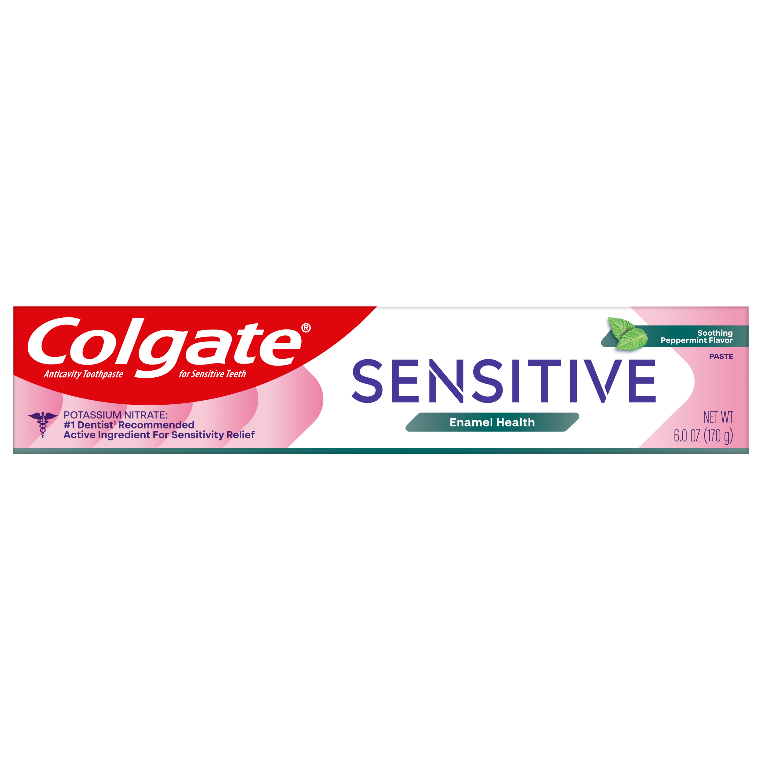 SKU 152123 Consumer Unit - GTIN 00035000521231 Case - GTIN 10035000521238 Product Category Oral Care Product Sub Category Toothpaste Product Equity (Brand) Colgate Product Sub Brand Colgate Sensitive TP Product Title Colgate Sensitive Enamel Health Toothpaste for Sensitive Teeth, Peppermint, 1 Pack, 6 oz Product Description Sensitivity relief never tasted so good with Colgate Sensitive Enamel Health Enamel Repair Toothpaste. This Soothing Peppermint flavored fluoride toothpaste for sensitive teeth offers 24/7 sensitivity relief*, repairs weakened enamel, and shields against erosion. This Colgate sensitive toothpaste contains potassium nitrate, a dentist recommended active ingredient for sensitivity relief. Potassium nitrate is clinically proven to offer long-term sensitivity protection.* Colgate Sensitive Enamel Health Peppermint Toothpaste is designed for daily use and offers sensitivity relief in a flavor you’ll love. Because it’s formulated with 5% potassium nitrate, this sensitive toothpaste offers sensitivity relief that works so you can enjoy cold, hot, and sweet food and drinks. In addition to offering lasting sensitivity relief, this potassium nitrate toothpaste helps repair and protect teeth against the effects of acid erosion and helps prevent tartar buildup**. Help prevent bad breath, cavities, and tartar buildup** while repairing weakened enamel and shielding against erosion with Colgate Sensitive Enamel Health Toothpaste for Sensitive Teeth. *with twice daily brushing after two weeks of continuous use **with regular brushing eCommerce Copy- Long Description Colgate Sensitive Prevent and Repair toothpaste is a clinically proven formula that works fast, within 2 weeks, and provides long-lasting sensitivity relief and builds a protective shield to help prevent painful sensitivity with regular use. This sensitive toothpaste contains an advanced dual-action formula that helps prevent painful sensitivity and helps repair weakened parts of sensitive teeth. Plus Colgate Sensitive Prevent and Repair toothpaste helps strengthen enamel with fluoride, whiten teeth, defend against cavities and provides the freshness you trust from Colgate. Bullet 1 Includes one (1) 6.0 oz tube of Colgate Sensitive Enamel Health Toothpaste for Sensitive Teeth, 5% Potassium Nitrate Toothpaste with Fluoride Bullet 2 This enamel repair sensitive toothpaste contains 5% potassium nitrate, a dentist recommended active ingredient for sensitivity relief Bullet 3 The fluoride formulated fresh breath toothpaste tackles cavities and comes in a Soothing Peppermint toothpaste flavor Bullet 4 This enamel strengthening toothpaste provides 24/7 sensitivity protection* and also helps shield tooth enamel against erosion and cavities Bullet 5 Colgate Sensitive Enamel Repair Toothpaste is a daily toothpaste that helps repair weakened enamel and shields against acid erosion Bullet 6 Experience sensitive teeth relief with Colgate Sensitive Enamel Strength Toothpaste for Sensitive Teeth Active Ingredients Potassium Nitrate 5%, Sodium Fluoride 0.24% (0.14% w/v fluoride ion) Walmart RPC 35706534 Walmart URL (Computed) https://www.walmart.com/ip/a/35706534 Albertsons RPC 960105767 Albertsons URL https://www.albertsons.com/shop/product-details.960105767.html CVS RPC 397303