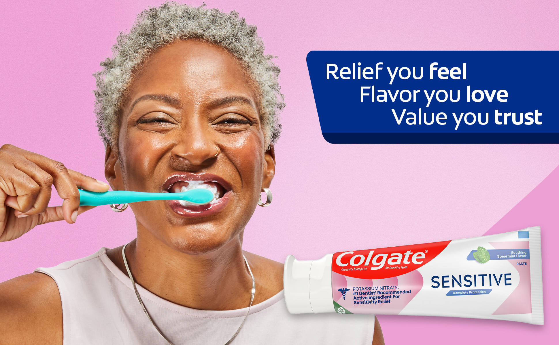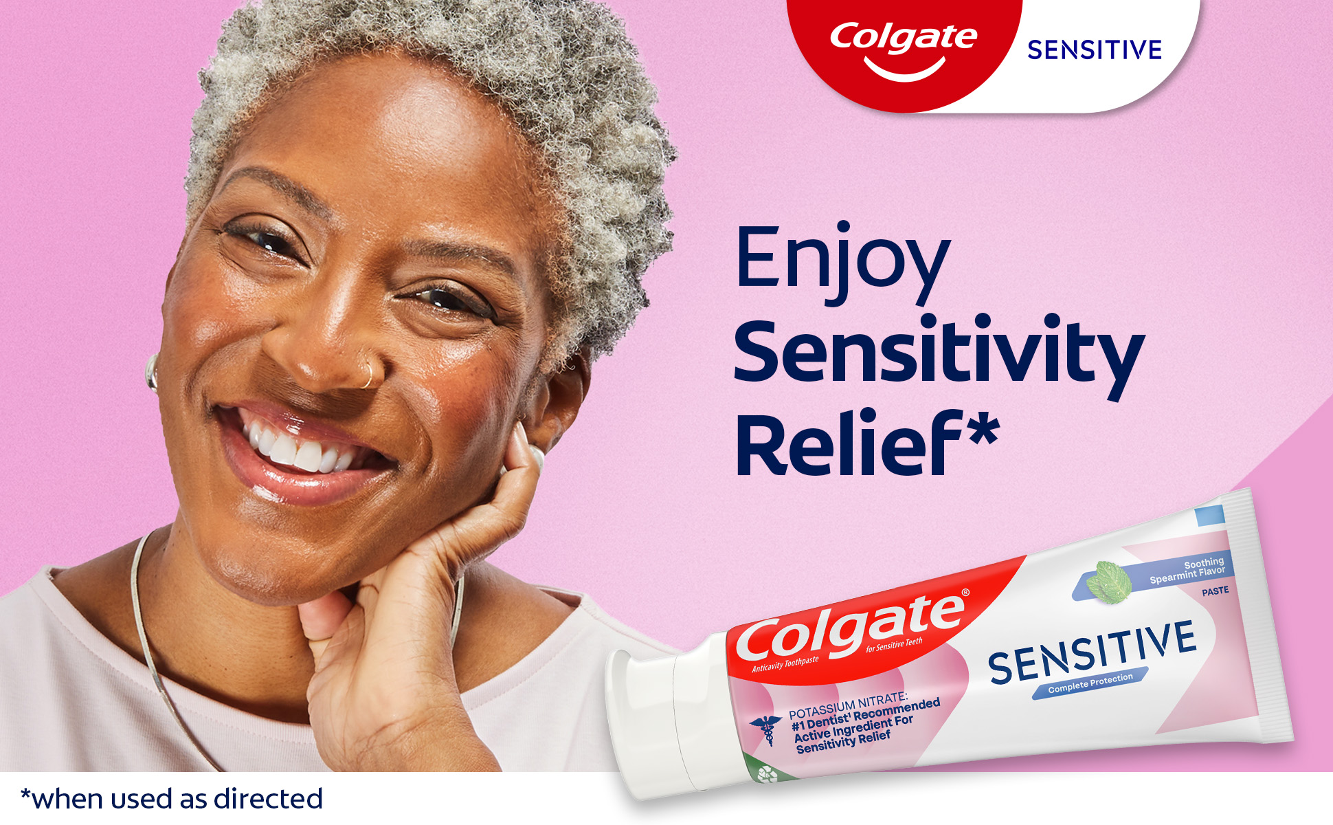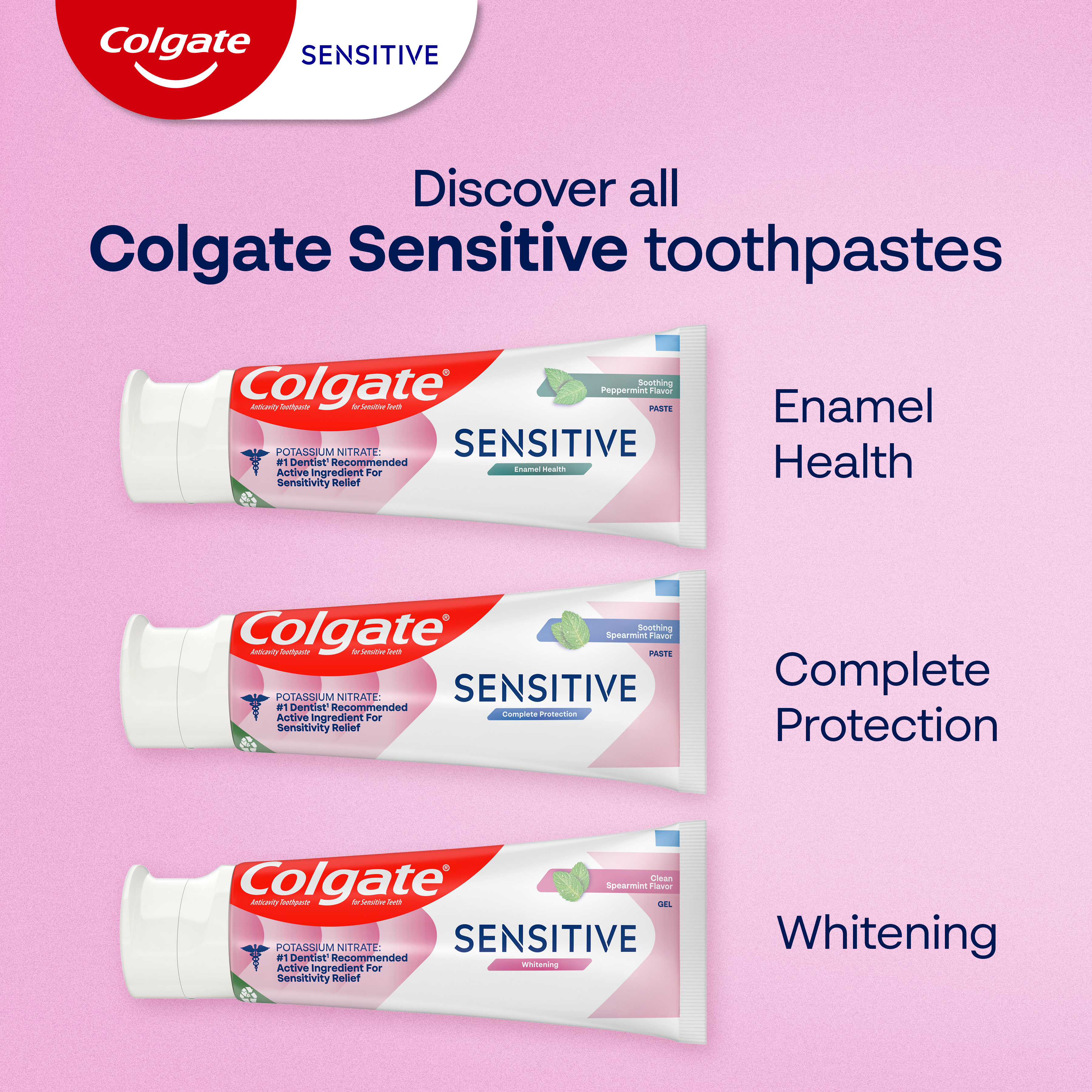 SKU 152584 Consumer Unit - GTIN 00035000525840 Case - GTIN 10035000525847 Product Category Oral Care Product Sub Category Toothpaste Product Equity (Brand) Colgate Product Sub Brand Colgate Sensitive TP Product Title Colgate Sensitive Complete Protection Toothpaste for Sensitive Teeth, Spearmint, 2 Pack, 6 oz Product Description Sensitivity relief never tasted so good with Colgate Sensitive Complete Protection Toothpaste. This Soothing Spearmint flavored fluoride toothpaste for sensitive teeth offers 24/7 sensitivity relief* and helps shield tooth enamel against erosion and cavities. This Colgate sensitive toothpaste pack contains potassium nitrate, a dentist recommended active ingredient for sensitivity relief. Potassium nitrate is clinically proven to offer long-term sensitivity protection.* Colgate Sensitive Complete Protection Spearmint Toothpaste is designed for daily use and offers sensitivity relief in a flavor you’ll love. Because it’s formulated with 5% potassium nitrate, this sensitive toothpaste offers sensitivity relief that works so you can enjoy cold, hot, and sweet food and drinks. In addition to offering lasting sensitivity relief, this potassium nitrate toothpaste helps repair and protect teeth against the effects of acid erosion and helps prevent tartar buildup**. Help prevent bad breath, cavities, and tartar buildup** while repairing weakened enamel and protecting against erosion with Colgate Sensitive Complete Protection Toothpaste for Sensitive Teeth. *with twice daily brushing after two weeks of continuous use **with regular brushing eCommerce Copy- Long Description Colgate® Sensitive Complete Protection Toothpaste is a sensitive toothpaste that combines all the benefits of a daily toothpaste while providing clinically-proven sensitivity relief for your teeth. But it doesn’t stop there, it provides tartar control, freshens breath, and yes, even plaque and cavity prevention with regular brushing. You really can whiten your smile while avoiding sensitive teeth pain with this sensitive toothpaste from the Colgate® Sensitive line. Experience a Brighter Smile Without Sensitivity* Daily brushing and flossing are essential habits if you want to prevent oral health issues like early gum disease and cavities. However, if you have sensitive teeth, the Colgate® Sensitive line of sensitive teeth toothpastes with sensitivity relief can help! Formulated to give your teeth 24/7 sensitivity protection**, anti sensitivity toothpastes are the proven solution to reduce pain with long-lasting** sensitivity relief, cavity protection and refreshing flavor. Relief is never far away with our Colgate® Sensitive line of products. *Colgate® Sensitive toothpaste helps relieve sensitivity in up to 2 weeks with twice-daily brushing **with twice-daily brushing Healthy Smiles At Colgate, we make toothpaste that promotes healthy smiles. Not only because having a healthy smile is important to your overall health, but because when you have a healthy smile, you actually smile more – and that’s a powerful thing. Smiles are the simplest form of optimism, something we need now more than ever. That’s why we’re committed to raising oral healthcare standards everywhere. Bullet 1 Includes two (2) 6.0 oz tubes of Colgate Sensitive Complete Protection Toothpaste for Sensitive Teeth, 5% Potassium Nitrate Toothpaste with Fluoride Bullet 2 This sensitive toothpaste pack contains 5% potassium nitrate, a dentist recommended active ingredient for sensitivity relief Bullet 3 The fluoride formulated toothpaste for bad breath tackles cavities and comes in a Soothing Spearmint toothpaste flavor Bullet 4 This double pack of anticavity toothpaste provides 24/7 sensitivity protection* and helps shield tooth enamel against erosion and cavities Bullet 5 Colgate Sensitive Complete Protection Toothpaste is a tartar toothpaste that helps repair weakened enamel and protects against acid erosion Bullet 6 Experience sensitive teeth relief with Colgate Sensitive Complete Protection Toothpaste for Sensitive Teeth Active Ingredients Potassium Nitrate 5%, Sodium Fluoride 0.24% (0.14% w/v fluoride ion) Walmart RPC 33141127 Walmart URL (Computed) https://www.walmart.com/ip/a/33141127 Target RPC 75563177 Target URL https://www.target.com/p/a/-/A-75563177 CVS RPC 499352