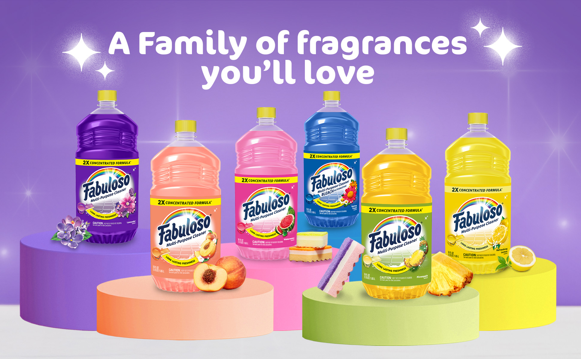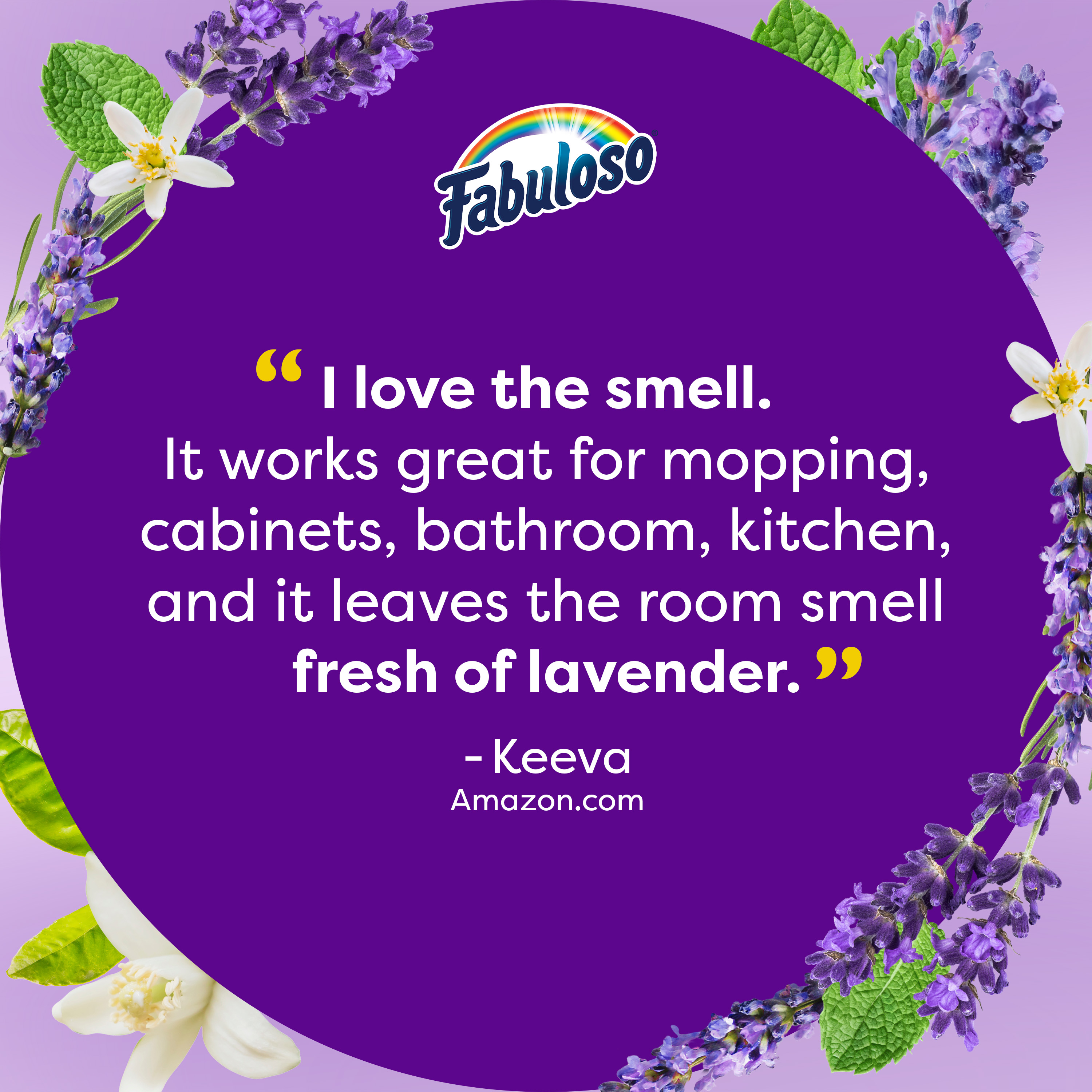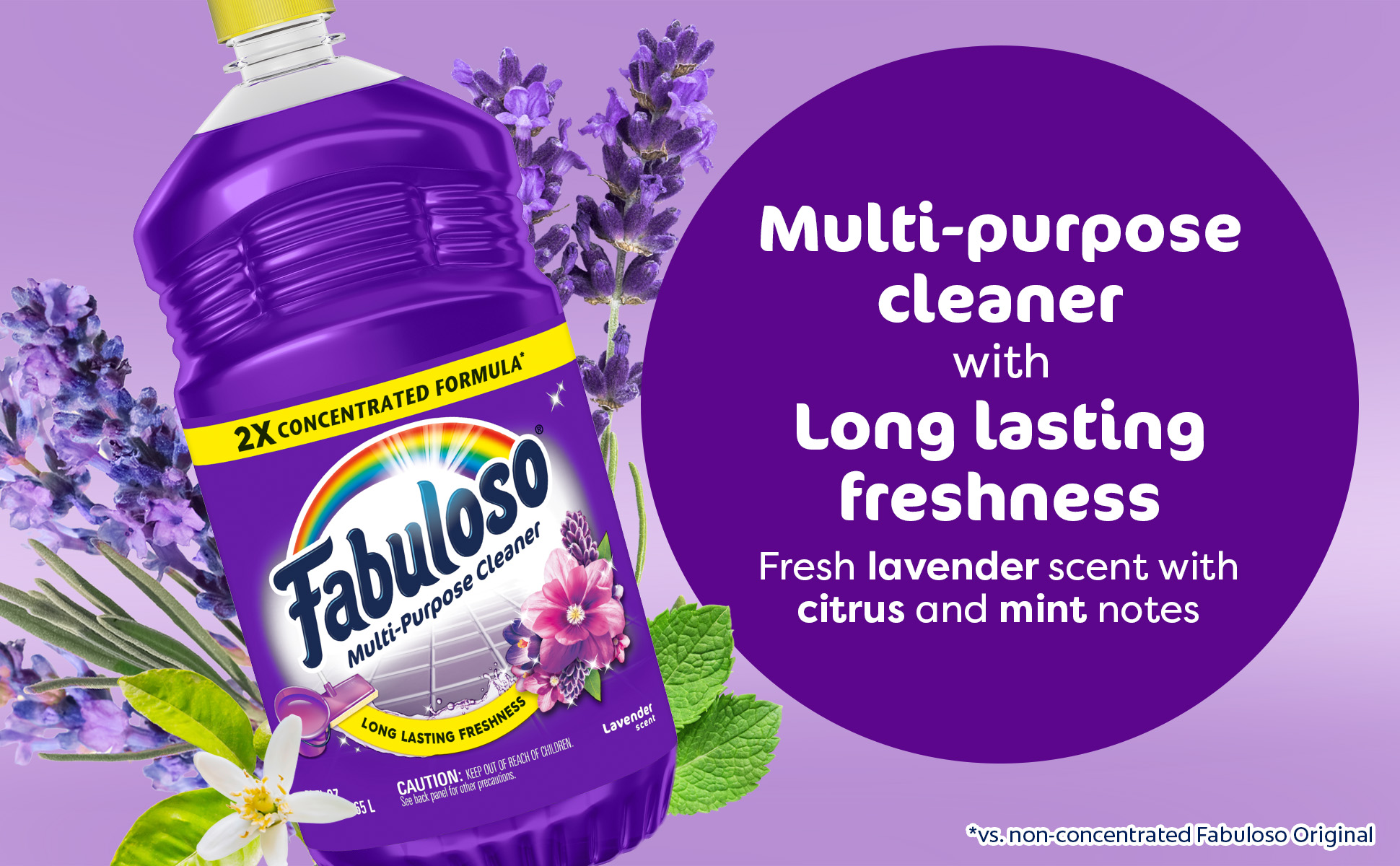 SKU 153041 Consumer Unit - GTIN 00035000530325 Case - GTIN 00035000530417 Product Category Home Care Product Sub Category Cleaners Liquid / Gel Product Equity (Brand) Fabuloso Product Sub Brand Fabuloso Liq Cln Product Title Fabuloso 2X Multi-Purpose Cleaner, No Rinse Floor Cleaner, Long-Lasting Freshness, Lavender Scent, 56 fl oz Product Description Discover the exceptional cleaning power and long-lasting freshness of Fabuloso 2X Multi-Purpose Cleaner with Lavender scent. This cleaner features the soothing essence of lavender blended with citrus and mint, complemented by a floral-fruity heart of jasmine and raspberry, and finished with warm amber, sandalwood, and vanilla undertones, leaving your home feeling fresh and revitalized. Fabuloso 2X concentrated formula provides 2X more uses in the same bottle compared to non-concentrated Fabuloso Original. The no rinse floor cleaner provides long-lasting freshness and is safe for everyday cleaning on floors, sinks, toilets, tubs, showers, sealed wood, appliances, counters, walls, doorknobs, and furniture. Ideal as a kitchen cleaner and bathroom cleaner, it keeps every room smelling fresh long after you clean. For best results, follow dosing instructions by mixing 1/8 cup of Fabuloso to a bucket of water for mopping, or use undiluted on a sponge for general surface cleaning and spot treatment, giving you flexibility for all your cleaning needs. Keep in a cool, dry place and do not freeze; if the product freezes, simply defrost and shake well before use to restore optimal cleaning performance. Experience the confidence of a powerful, reliable cleaner that transforms your entire home with every use, backed by the trusted Fabuloso brand families have depended on for generations. eCommerce Copy- Long Description Fabuloso® Multi-Purpose Cleaner, 2X Concentrated Formula, Lavender Scent Fabuloso® Multi-Purpose Cleaner, 2X Concentrated Formula in Lavender Scent transforms your home with a fresh scent that lasts. Bring the fragrance of lavender indoors, and experience a warm, joyful feeling your friends and family will love. Fabuloso®’s 2X Concentrated Formula now provides 2X more active ingredients compared to non-concentrated Fabuloso Original, giving you 2X the dosage in the same bottle. Every colorful pour from the easy-pour bottle delivers a long-lasting, unmistakable freshness and leaves your home bright and clean. Use Fabuloso® Multi-Purpose Cleaner, on sinks, toilets, tubs, showers, kitchen and bathroom floors, sealed wood surfaces, appliances, counters, windows, mirrors, walls, doorknobs and furniture, and fill every room in your home with joy. Uplifting fragrances. Clean surfaces. Irresistible joy. Life isn’t always easy, but cleaning it up sure can be. Fabuloso® combines cleaning power with fresh scents that fill your home with joy, to make it a welcoming place no matter how hard your day. Fabuloso®’s 2X Concentrated Formula provides 2X more uses in the same bottle compared to non-concentrated Fabuloso Original. From the kitchen to the bathroom and beyond, Fabuloso® Multi-Purpose, Cleaner 2X Concentrated has a wide variety of long-lasting fragrances that deliver hope for a better tomorrow. Try all of our uplifting scents: Refreshing Lemon, Passion of Fruits, Citrus & Fruits with Baking Soda, Bleach Alternative† Spring Fresh, Tropical Spring, and Orange Scent with Baking Soda. † Bleach-free option with 20% more active ingredients vs other Fabuloso 2X Concentrated products Bullet 1 Includes one 56 fl oz bottle of Fabuloso 2X Multi-Purpose Cleaner, Lavender Scent Bullet 2 Enjoy the fresh lavender scent of Fabuloso blended with citrus, mint, jasmine, and raspberry, finished with warm amber, sandalwood, and vanilla Bullet 3 Fabuloso 2X concentrated formula provides 2X more uses in the same bottle compared to non-concentrated Fabuloso Original Bullet 4 This all-purpose cleaner can be used on floors, sinks, toilets, tubs, showers, sealed wood, appliances, counters, walls, doorknobs, and furniture Bullet 5 Fabuloso is ready to use: add 1/8 cup to a bucket of water for mopping, or use undiluted on a sponge for general surface cleaning and spot treatment Bullet 6 Keep Fabuloso in a cool, dry place and do not freeze; if the product freezes, simply defrost and shake well before use Bullet 7 Fabuloso is the perfect cleaning product for families and households delivering the trusted clean you love Amazon RPC B00R1CQXNS AMZ URL https://www.amazon.com/dp/B00R1CQXNS Walmart RPC 14320559 Walmart URL (Computed) https://www.walmart.com/ip/a/14320559 Target RPC 13459043 Target URL https://www.target.com/p/a/-/A-13459043 Albertsons RPC 960043092 Albertsons URL https://www.albertsons.com/shop/product-details.960043092.html CVS RPC 941436 Family Dollar RPC 1412566