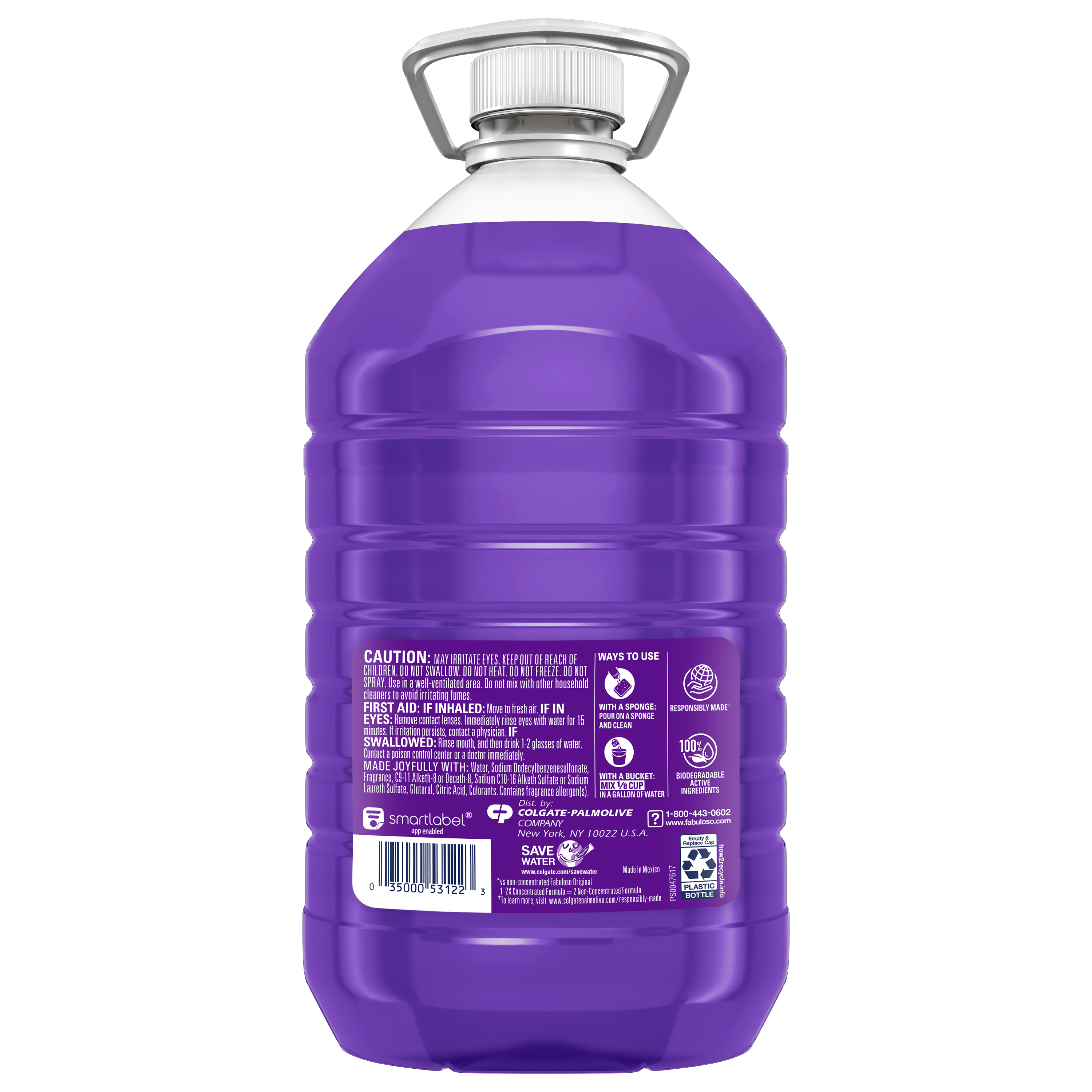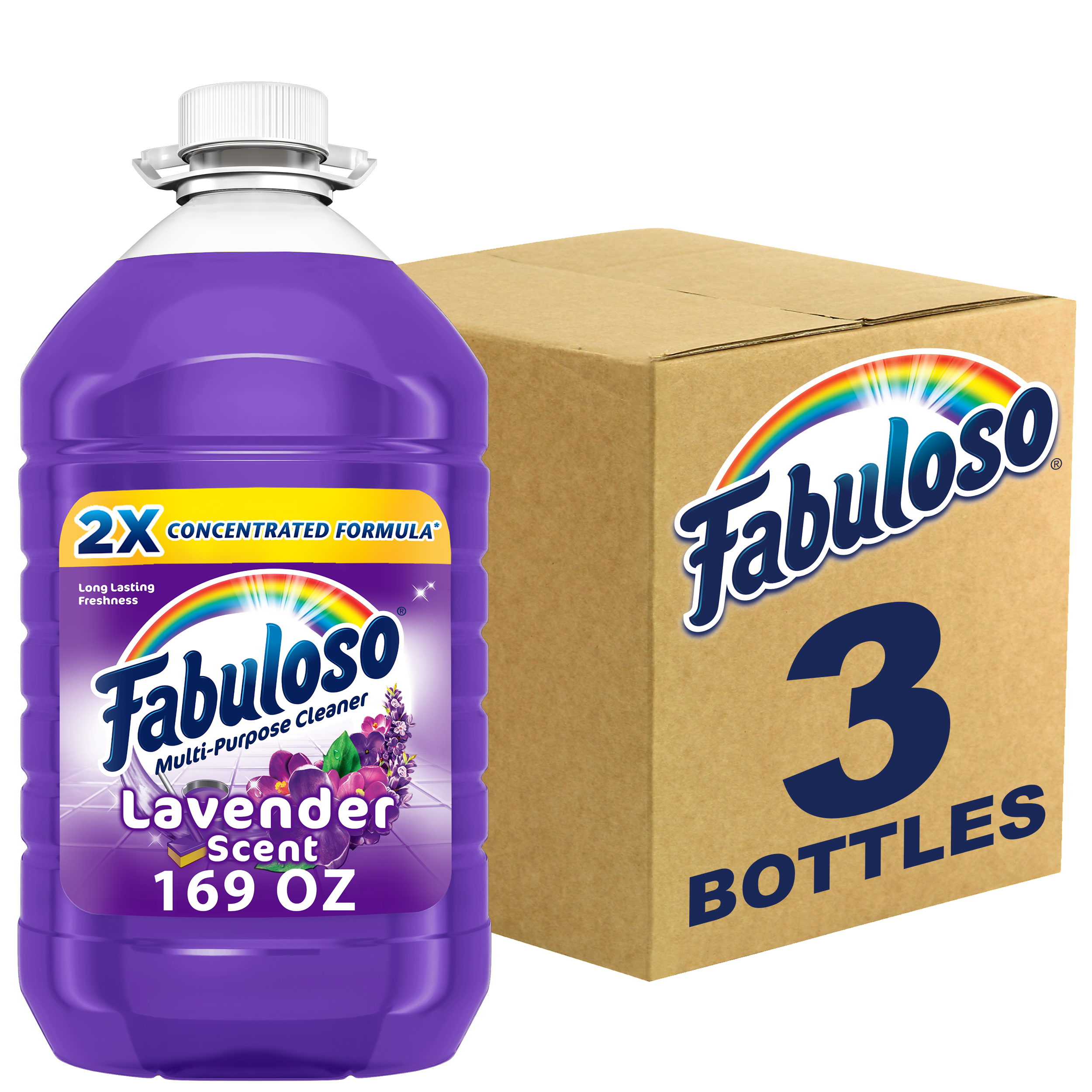 SKU 153122 Consumer Unit - GTIN 00035000531223 Case - GTIN 10035000531220 Product Category Home Care Product Sub Category Cleaners Liquid / Gel Product Equity (Brand) Fabuloso Product Sub Brand Fabuloso Liq Cln Product Title Fabuloso Multi-Purpose Cleaner, 2X Concentrated Formula, Lavender Scent, 169 oz Product Description Fabuloso 2x Multi-Purpose Cleaner is the perfect solution for anyone looking for an effective way to keep their home clean and smelling great. Whether used as a bathroom cleaner, kitchen cleaner, or floor cleaner, the long-lasting lavender fragrance will fill your home with joy. Our multi-purpose cleaner cuts through grease, grime, and dirt. Its easy-pour bottle delivers a colorful and satisfying pour every time. We understand that life isn't always easy, but cleaning it up can be with Fabuloso multi-purpose surface cleaner. Our 2X concentrated formula provides 2x more uses and 2x more active ingredients vs our non-concentrated Fabuloso Original. It also uses 50% less plastic by following dosing instructions and getting twice as many uses out of one bottle vs. the same size of Fabuloso Original. It's important to use Fabuloso cleaning products safely, please follow the instructions on the label. Mix 1/8 cup in a gallon of water or pour on a sponge and clean. eCommerce Copy- Long Description Fabuloso® Multi-Purpose Cleaner, 2X Concentrated Formula, Lavender Scent Fabuloso® Multi-Purpose Cleaner, 2X Concentrated Formula in Lavender Scent transforms your home with a fresh scent that lasts. Bring the fragrance of lavender indoors, and experience a warm, joyful feeling your friends and family will love. Fabuloso®’s 2X Concentrated Formula now provides 2X more active ingredients compared to non-concentrated Fabuloso Original, giving you 2X the dosage in the same bottle. Every colorful pour from the easy-pour bottle delivers a long-lasting, unmistakable freshness and leaves your home bright and clean. Use Fabuloso® Multi-Purpose Cleaner, on sinks, toilets, tubs, showers, kitchen and bathroom floors, sealed wood surfaces, appliances, counters, windows, mirrors, walls, doorknobs and furniture, and fill every room in your home with joy. Uplifting fragrances. Clean surfaces. Irresistible joy. Life isn’t always easy, but cleaning it up sure can be. Fabuloso® combines cleaning power with fresh scents that fill your home with joy, to make it a welcoming place no matter how hard your day. Fabuloso®’s 2X Concentrated Formula provides 2X more uses in the same bottle compared to non-concentrated Fabuloso Original. From the kitchen to the bathroom and beyond, Fabuloso® Multi-Purpose, Cleaner 2X Concentrated has a wide variety of long-lasting fragrances that deliver hope for a better tomorrow. Try all of our uplifting scents: Refreshing Lemon, Passion of Fruits, Citrus & Fruits with Baking Soda, Bleach Alternative† Spring Fresh, Tropical Spring, and Orange Scent with Baking Soda. † Bleach-free option with 20% more active ingredients vs other Fabuloso 2X Concentrated products Shared Moments of Joy All Over the World Our story begins in Venezuela, circa 1980. Cleaning products lacked fragrance and distinction. But families wanted lasting scents that kept their homes fresh and clean for hours. Enter the bold colors and joyful fragrances of Fabuloso® ! 16 years later, families across America also got to experience the joy: we became a household staple thanks to our rainbow of colors and playful, distinctive scents. Today, across the world, we’re more than cleaning products. We’re a catalyst for joy. Bullet 1 2X concentrated formula provides 2X more active ingredients compared to non-concentrated Fabuloso Original Bullet 2 Multi-purpose cleaner for a wide range of surfaces, from floors to furniture to appliances Bullet 3 Mix 1/8 cup in a gallon of water or pour on a sponge and clean Bullet 4 Lavender scent provides long-lasting freshness Bullet 5 Uses 50% less plastic by following dosing instructions to get twice as many uses out of one bottle v. the same size of Fabuloso Original Walmart RPC 42386794 Walmart URL (Computed) https://www.walmart.com/ip/a/42386794 CVS RPC 266903