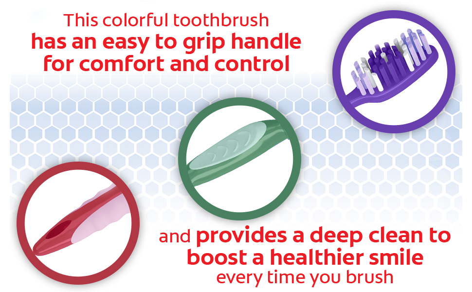 SKU 155539 Consumer Unit - GTIN 00035000555397 Case - GTIN 10035000555394 Product Category Oral Care Product Sub Category Manual TB Product Equity (Brand) Colgate Product Sub Brand Colgate Extra Clean Man TB Product Title Colgate Extra Clean Full Head Medium Adult Manual Toothbrush, 6 pack Product Description Colgate Extra Clean Full Head Medium Adult Manual Toothbrush, 6 pack Brush your teeth with cleaning power using the Colgate Extra Clean Full Head Medium Adult Manual Toothbrush. This medium toothbrush is made with circular power bristles to help remove surface stains. Its cleaning tip features bristles that effectively clean teeth, while a tongue cleaner also helps clean mouth. With an easy-to-grip handle, this medium bristle toothbrush provides comfort and control while brushing. Extra Clean Get extra clean teeth with Colgate Extra Clean. Made for deep cleaning, this toothbrush for adults boosts a beautiful smile with every brush. Unique cleaning tip bristles provide cleaning power to clean teeth. This manual toothbrush makes brushing a breeze. And remember to change your toothbrush every 3 months! A Healthy Smile With Colgate At Colgate, we make products that promote healthy smiles. Not only because having a healthy smile is important to your overall health, but because when you have a healthy smile, you actually smile more – and that’s a powerful thing. Smiles are the simplest form of optimism, something we need now more than ever. That’s why we’re championing optimism – we are committed to creating a healthier planet and working every day to create healthy smiles for all. Everyone has the right to a bright smile. That’s why we’re committed to raising oral healthcare standards everywhere. Whether it’s building healthy new habits as kids or learning something new from the experts, we’re here for you eCommerce Copy- Long Description Colgate Extra Clean Full Head Medium Adult Manual Toothbrush, 6 pack Brush your teeth with cleaning power using the Colgate Extra Clean Full Head Medium Adult Manual Toothbrush. This medium toothbrush is made with circular power bristles to help remove surface stains. Its cleaning tip features bristles that effectively clean teeth, while a tongue cleaner also helps clean mouth. With an easy-to-grip handle, this medium bristle toothbrush provides comfort and control while brushing. Extra Clean Get extra clean teeth with Colgate Extra Clean. Made for deep cleaning, this toothbrush for adults boosts a beautiful smile with every brush. Unique cleaning tip bristles provide cleaning power to clean teeth. This manual toothbrush makes brushing a breeze. And remember to change your toothbrush every 3 months! A Healthy Smile With Colgate At Colgate, we make products that promote healthy smiles. Not only because having a healthy smile is important to your overall health, but because when you have a healthy smile, you actually smile more – and that’s a powerful thing. Smiles are the simplest form of optimism, something we need now more than ever. That’s why we’re championing optimism – we are committed to creating a healthier planet and working every day to create healthy smiles for all. Everyone has the right to a bright smile. That’s why we’re committed to raising oral healthcare standards everywhere. Whether it’s building healthy new habits as kids or learning something new from the experts, we’re here for you Bullet 1 Cleaning tip bristles effectively clean hard-to-reach areas. Bullet 2 The colorful toothbrush is designed with an easy to grip handle for comfort and control while brushing. Bullet 3 Features circular power soft bristles that provides a deep clean to boost a healthier smile every time you brush. Bullet 4 Colgate Extra Clean bulk 6ct makes it easy to replace your soft toothbrush every 3 months. Amazon RPC B00CC6XSRC AMZ URL https://www.amazon.com/dp/B00CC6XSRC Walmart RPC 434605842 Walmart URL (Computed) https://www.walmart.com/ip/a/434605842 Target RPC 14299923 Target URL https://www.target.com/p/a/-/A-14299923 CVS RPC 646993 Family Dollar RPC 902465