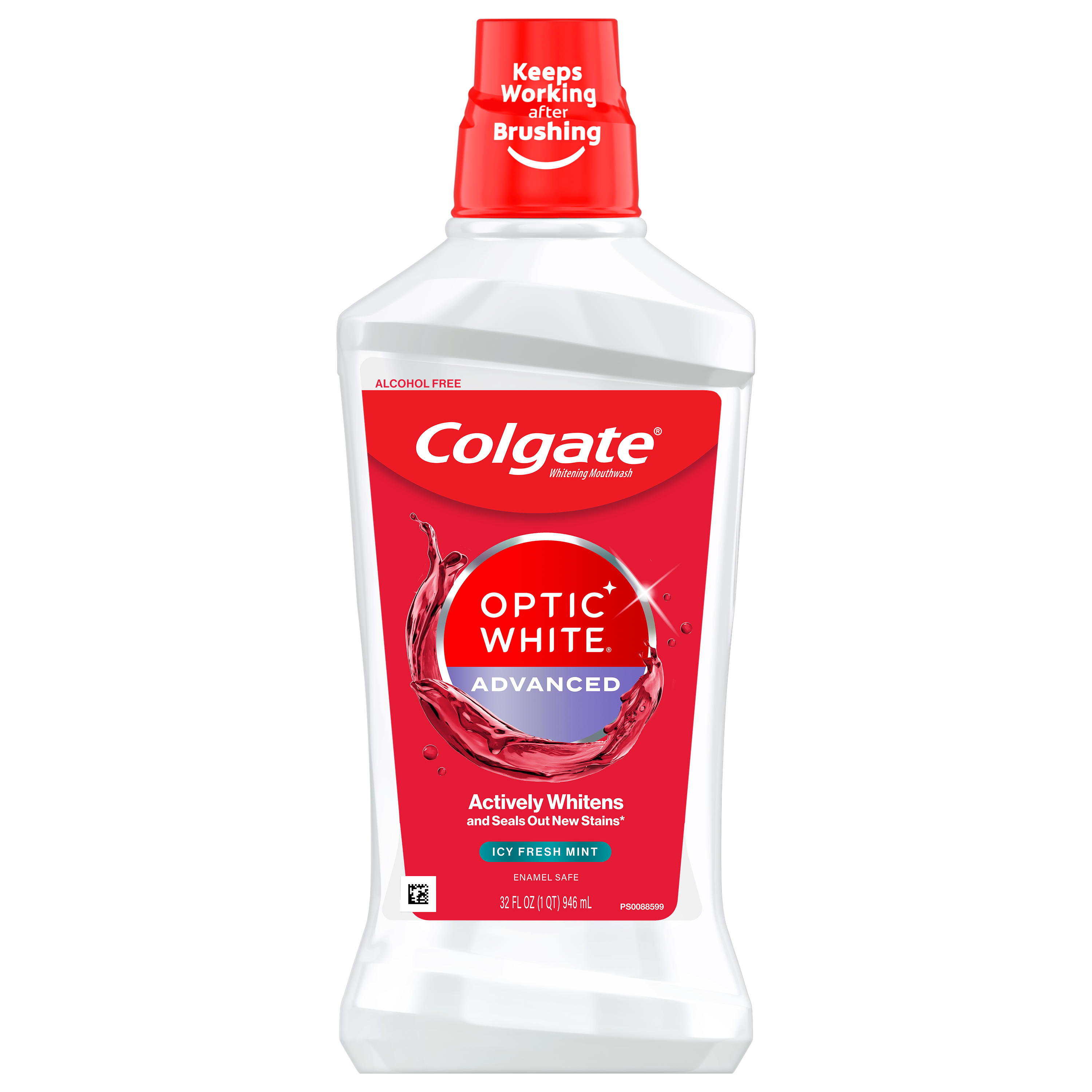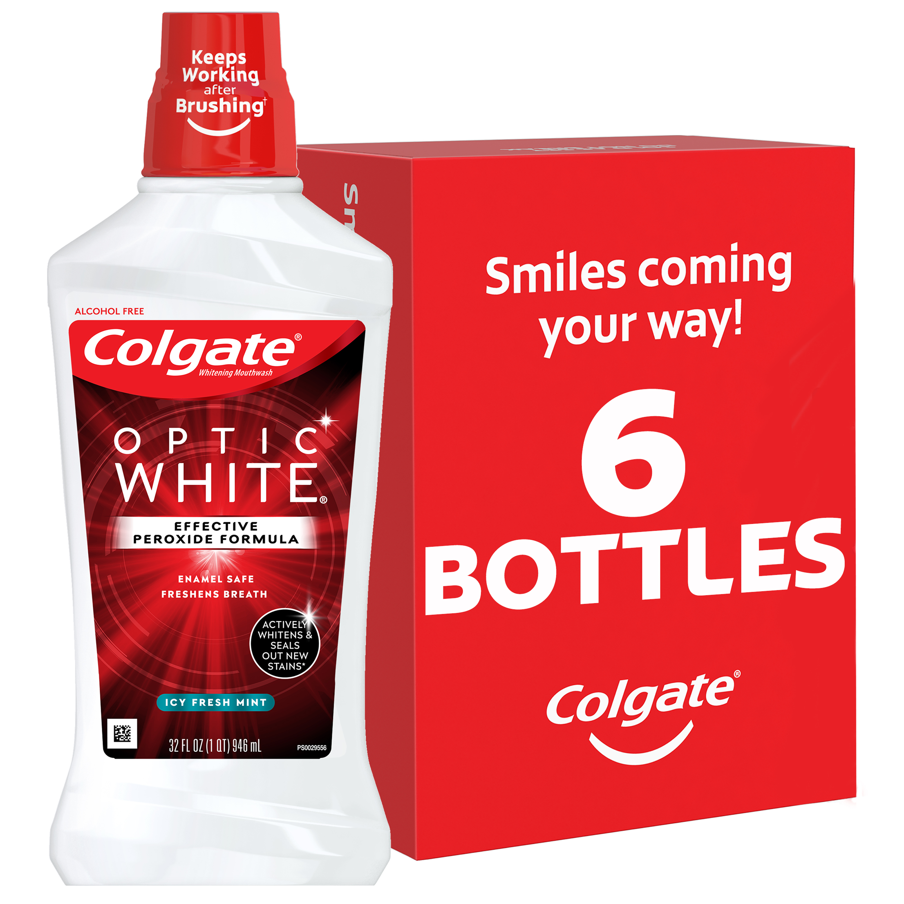 SKU 167112 Consumer Unit - GTIN 00035000671127 Case - GTIN 10035000671124 Product Category Oral Care Product Sub Category Mouthwash Product Equity (Brand) Colgate Product Sub Brand Colgate Optic White MW Product Title Colgate Optic White Whitening Mouthwash, Fresh Mint - 946 mL, 32 fl.oz. Product Description Colgate Optic White High Impact White whitening mouthwash contains 2% hydrogen peroxide to effectively whiten teeth by removing surface stains. This alcohol-free mouthwash (does not contain ethanol) is available in a Sparkling Fresh Mint flavor to freshen breath while whitening teeth and contains Whiteseal technology to help prevent future stains. The mouthwash's action reaches hard-to-brush places, helping to whiten teeth and freshen breath. For an extra white smile, use after brushing with Colgate Optic White toothbrushes and toothpastes. eCommerce Copy- Long Description Colgate Optic White High Impact White whitening mouthwash contains 2% hydrogen peroxide to effectively whiten teeth by removing surface stains. This alcohol-free mouthwash (does not contain ethanol) is available in a Sparkling Fresh Mint flavor to freshen breath while whitening teeth and contains Whiteseal technology to help prevent future stains. The mouthwash's action reaches hard-to-brush places, helping to whiten teeth and freshen breath. For an extra white smile, use after brushing with Colgate Optic White toothbrushes and toothpastes. Bullet 1 Whiter teeth in 1 day with the Optic White Line (With Colgate Optic White Toothpaste, Mouthwash and Toothbrush + Whitening Pen, use as directed. Use Mouthwash prior to Optic White Whitening Pen. For best results continue routine as directed) Bullet 2 Actively whitens and seals out new stains (whitens by removing surface stains and helping to prevent future stains) Bullet 3 Enamel safe Bullet 4 Kills bad breath germs Amazon RPC B07CHFLZZV AMZ URL https://www.amazon.com/dp/B07CHFLZZV Walmart RPC 21551140 Walmart URL (Computed) https://www.walmart.com/ip/a/21551140 Albertsons RPC 960318702 Albertsons URL https://www.albertsons.com/shop/product-details.960318702.html CVS RPC 897465