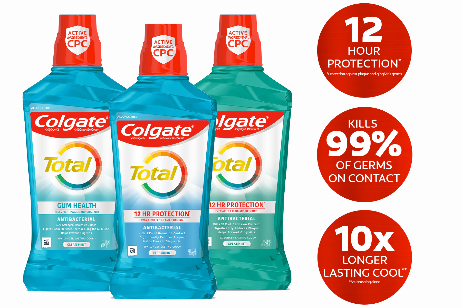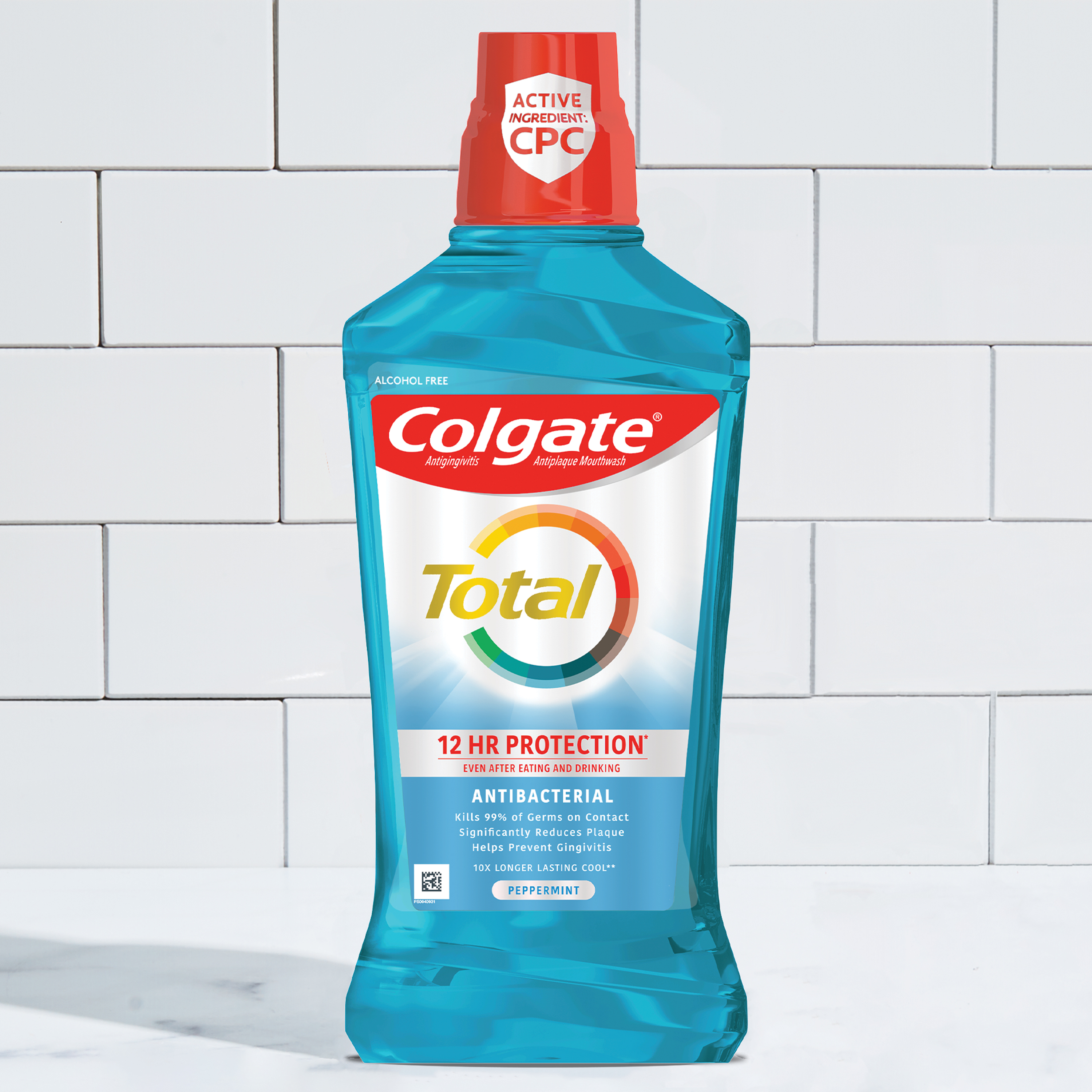 SKU 167122 Consumer Unit - GTIN 00035000671226 Case - GTIN 10035000671223 Product Category Oral Care Product Sub Category Mouthwash Product Equity (Brand) Colgate Product Sub Brand Colgate Total MW Product Title Colgate Total Pro-Shield Alcohol Free Mouthwash, Antibacterial Formula, Peppermint - 500 mL, 16.9 fl.oz. (6 Pack) Product Description Colgate Total 12HR Pro-Shield Mouthwash doesn't just freshen breath, it provides 12-hour protection against germs, even after eating and drinking, helping to keep your mouth healthy and fresh. It kills 99% of germs on contact, significantly reduces plaque and helps prevent the gum disease gingivitis. Colgate Total 12HR Pro-Shield Mouthwash is an alcohol-free mouthwash (does not contain ethanol) and has a refreshing Peppermint Blast flavor. This antibacterial mouthwash offers germ protection for fresh breath. eCommerce Copy- Long Description Colgate Total 12HR Pro-Shield Mouthwash doesn't just freshen breath, it provides 12-hour protection against germs, even after eating and drinking, helping to keep your mouth healthy and fresh. It kills 99% of germs on contact, significantly reduces plaque and helps prevent the gum disease gingivitis. Colgate Total 12HR Pro-Shield Mouthwash is an alcohol-free mouthwash (does not contain ethanol) and has a refreshing Peppermint Blast flavor. This antibacterial mouthwash offers germ protection for fresh breath. Bullet 1 Antibacterial Mouthwash Provides 12-hour protection against germs even after eating and drinking Bullet 2 Kills 99% of Germs on Contact Bullet 3 Significantly Reduces Plaque Bullet 4 Helps Prevent Gingivitis Bullet 5 Alcohol Free Mouthwash So There's No Burn Bullet 6 Gluten-free Bullet 7 1. Data on fi le. Colgate-Palmolive Company. May 2013. 2. Data on fi le. Colgate-Palmolive Company. Results of a 6-Week Plaque and Gingivitis Clinical Study in Puerto Rico. Results of a 6-Week Plaque and Gingivitis Clinical Study in Dominican Republic. December 2012. Active Ingredients Cetylpyridinium Chloride 0.075 % Albertsons RPC 960164782 Albertsons URL https://www.albertsons.com/shop/product-details.960164782.html CVS RPC 926305