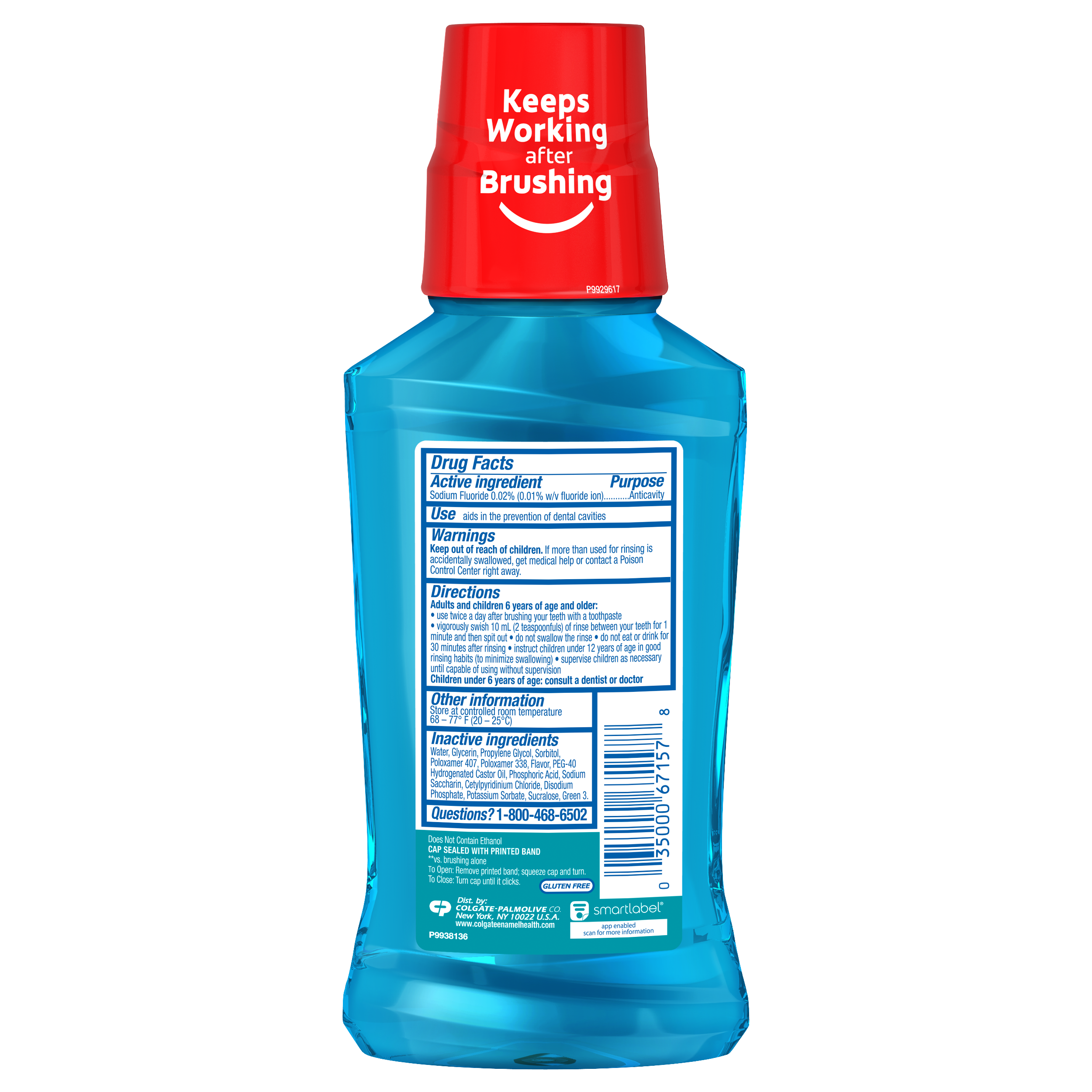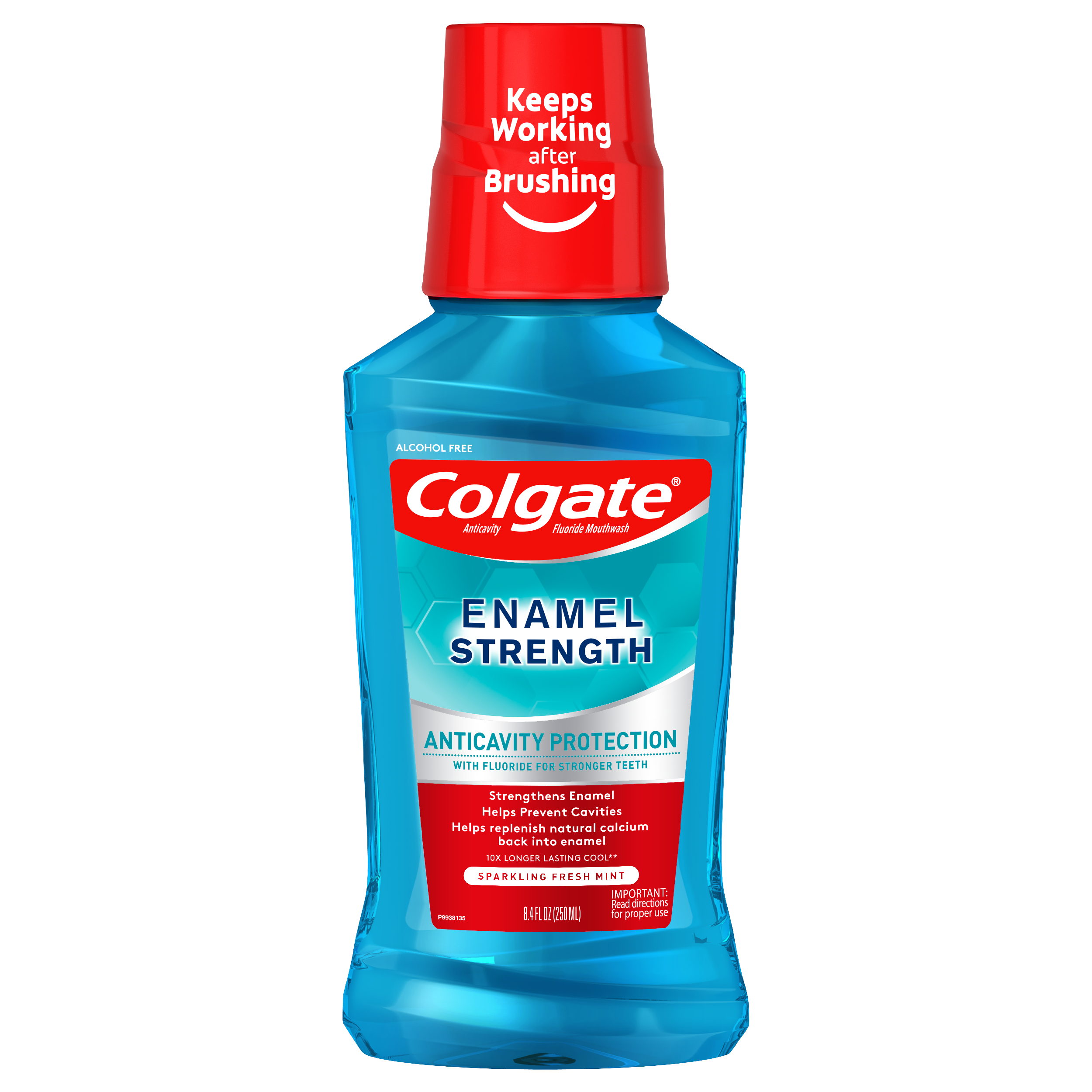 SKU 167157 Consumer Unit - GTIN 00035000671578 Case - GTIN 10035000671575 Product Category Oral Care Product Sub Category Mouthwash Product Equity (Brand) Colgate Product Sub Brand Colgate Enamel Health MW Product Title Colgate Enamel Health Mouthwash, Fresh Mint - 250 mL, 8.4 fl.oz. Product Description Colgate Enamel Health Sparkling Fresh Mint Anticavity Fluoride Mouthwash is alcohol-free (does not contain ethanol), and strengthens tooth enamel even where brushing may miss. It helps replenish natural calcium back into enamel and reverse enamel softening to help prevent cavities. This mouthwash has a sparkling fresh mint flavor to help freshen your breath. To promote healthy teeth and gums, use after brushing with Colgate Enamel Health toothpastes and toothbrushes. Bullet 1 Strengthens enamel even where brushing may miss Bullet 2 Helps replenish natural calcium back into enamel Bullet 3 Reverses enamel softening to help prevent cavities Bullet 4 Freshens breath Active Ingredients Active Ingredient: Sodium Fluoride 0.02% (0.01% w/v Fluoride ion). Purpose: Anticavity CVS RPC 253326
