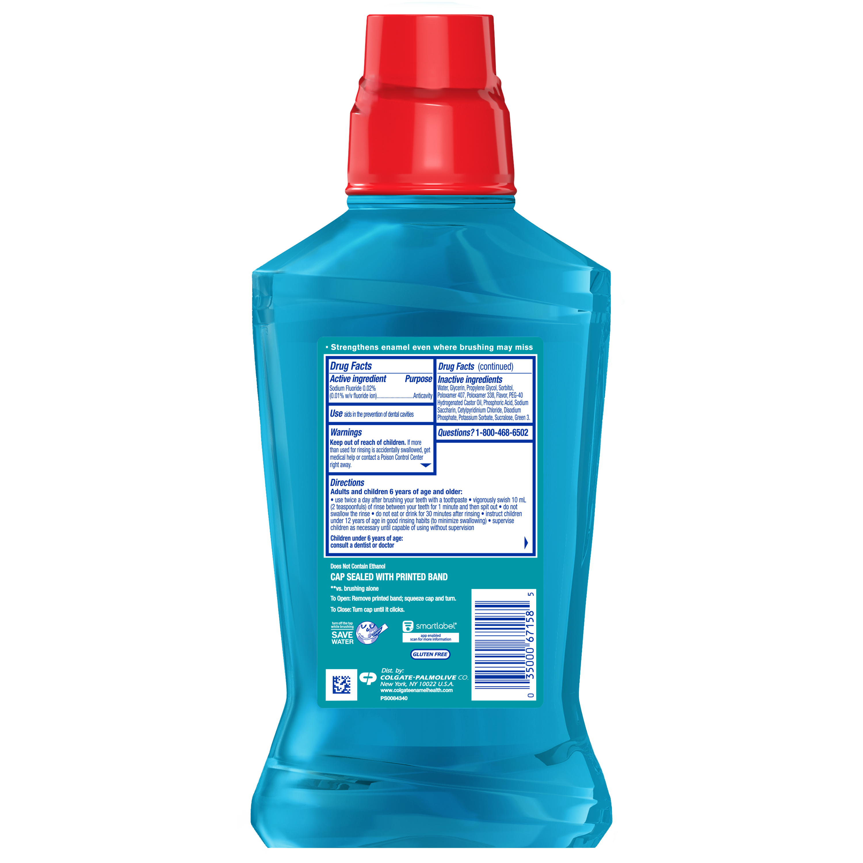SKU 167158 Consumer Unit - GTIN 00035000671585 Case - GTIN 10035000671582 Product Category Oral Care Product Sub Category Mouthwash Product Equity (Brand) Colgate Product Sub Brand Colgate Enamel Health MW Product Title Colgate Enamel Health Mouthwash, Fresh Mint - 500 mL, 16.9 fl.oz. Product Description Colgate Enamel Health Sparkling Fresh Mint Anticavity Fluoride Mouthwash is alcohol-free (does not contain ethanol), and strengthens tooth enamel even where brushing may miss. It helps replenish natural calcium back into enamel and reverse enamel softening to help prevent cavities. This mouthwash has a sparkling fresh mint flavor to help freshen your breath. To promote healthy teeth and gums, use after brushing with Colgate Enamel Health toothpastes and toothbrushes. eCommerce Copy- Long Description Colgate Enamel Health Sparkling Fresh Mint Anticavity Fluoride Mouthwash is alcohol-free (does not contain ethanol), and strengthens tooth enamel even where brushing may miss. It helps replenish natural calcium back into enamel and reverse enamel softening to help prevent cavities. This mouthwash has a sparkling fresh mint flavor to help freshen your breath. To promote healthy teeth and gums, use after brushing with Colgate Enamel Health toothpastes and toothbrushes. Bullet 1 Strengthens enamel even where brushing may miss Bullet 2 Helps replenish natural calcium back into enamel Bullet 3 Reverses enamel softening to help prevent cavities Bullet 4 Freshens breath Active Ingredients Sodium Fluoride 0.02 % (0.01% w/v fluoride ion) Amazon RPC B011YUMJ9O AMZ URL https://www.amazon.com/dp/B011YUMJ9O Walmart RPC 45098531 Walmart URL (Computed) https://www.walmart.com/ip/a/45098531 CVS RPC 236329