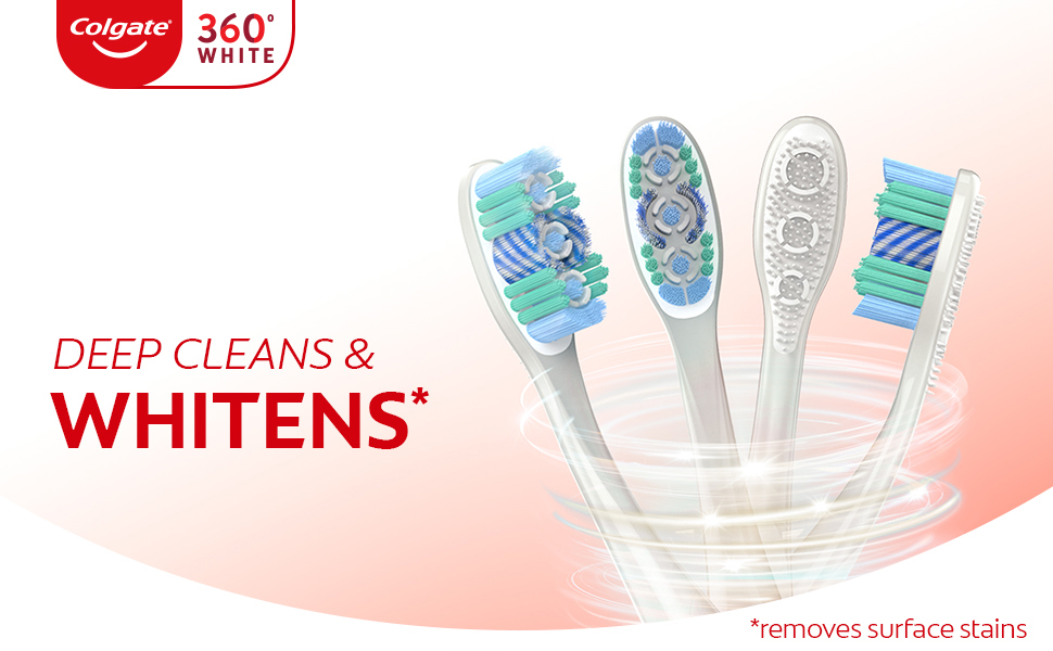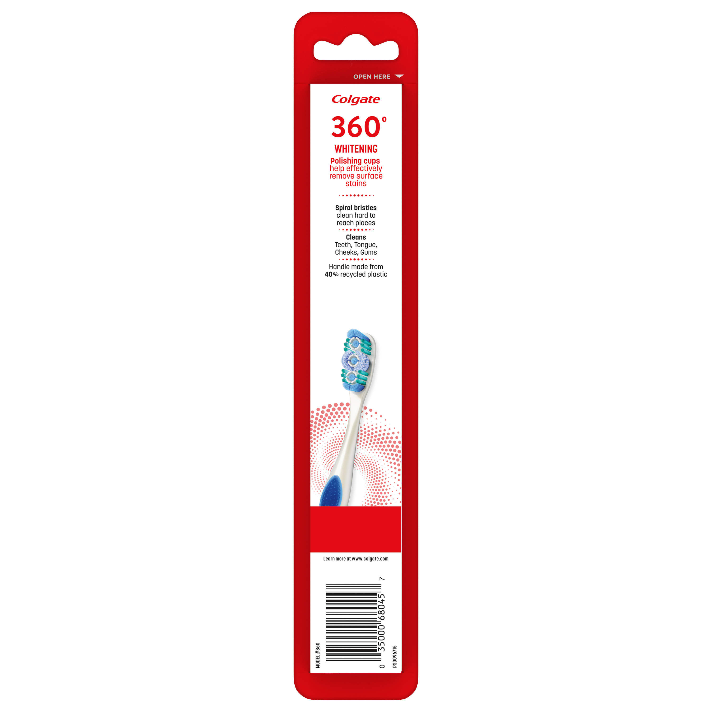 SKU 168045 Consumer Unit - GTIN 00035000680457 Case - GTIN 10035000680454 Product Category Oral Care Product Sub Category Manual TB Product Equity (Brand) Colgate Product Sub Brand Colgate 360 Man TB Product Title Colgate 360 Optic White soft Whitening Toothbrush, for adults 1pk eCommerce Copy- Long Description Colgate 360 Optic White Advanced Soft Adult Manual Toothbrush, 1 pk The Colgate 360 Optic White Advanced Soft Adult Manual Toothbrush, 1 pk is an adult manual toothbrush made for easy brushing. This soft toothbrush for adults is designed with whitening cups to remove teeth stains and special polishing soft bristles to whiten teeth. Plus, a unique tongue and cheek cleaner removes odor causing bacteria for a 360 toothbrushing experience! The 360 Teeth Brushing Experience The Colgate 360 Optic White Advanced Soft Adult Manual Toothbrush features multi-action, tooth-fitting polishing cups to remove surface stains. An ergonomic handle design fits comfortably in your hand while flexible finger grips help the adult manual toothbrush to stay in place; reducing slippage and allowing for more precise maneuvering as you brush your teeth. Healthy Smiles With Colgate At Colgate, we make products that promote healthy smiles. Not only because having a healthy smile is important to your overall health, but because when you have a healthy smile, you actually smile more – and that’s a powerful thing. Smiles are the simplest form of optimism, something we need now more than ever. That’s why we’re championing optimism – we are committed to creating a healthier planet and working every day to create healthy smiles for all. Everyone has the right to a bright smile. That’s why we’re committed to raising oral healthcare standards everywhere. Whether it’s building healthy new habits as kids or learning something new from the experts, we’re here for you. Target RPC 13748010 Target URL https://www.target.com/p/a/-/A-13748010 Albertsons RPC 960056075 Albertsons URL https://www.albertsons.com/shop/product-details.960056075.html CVS RPC 855381