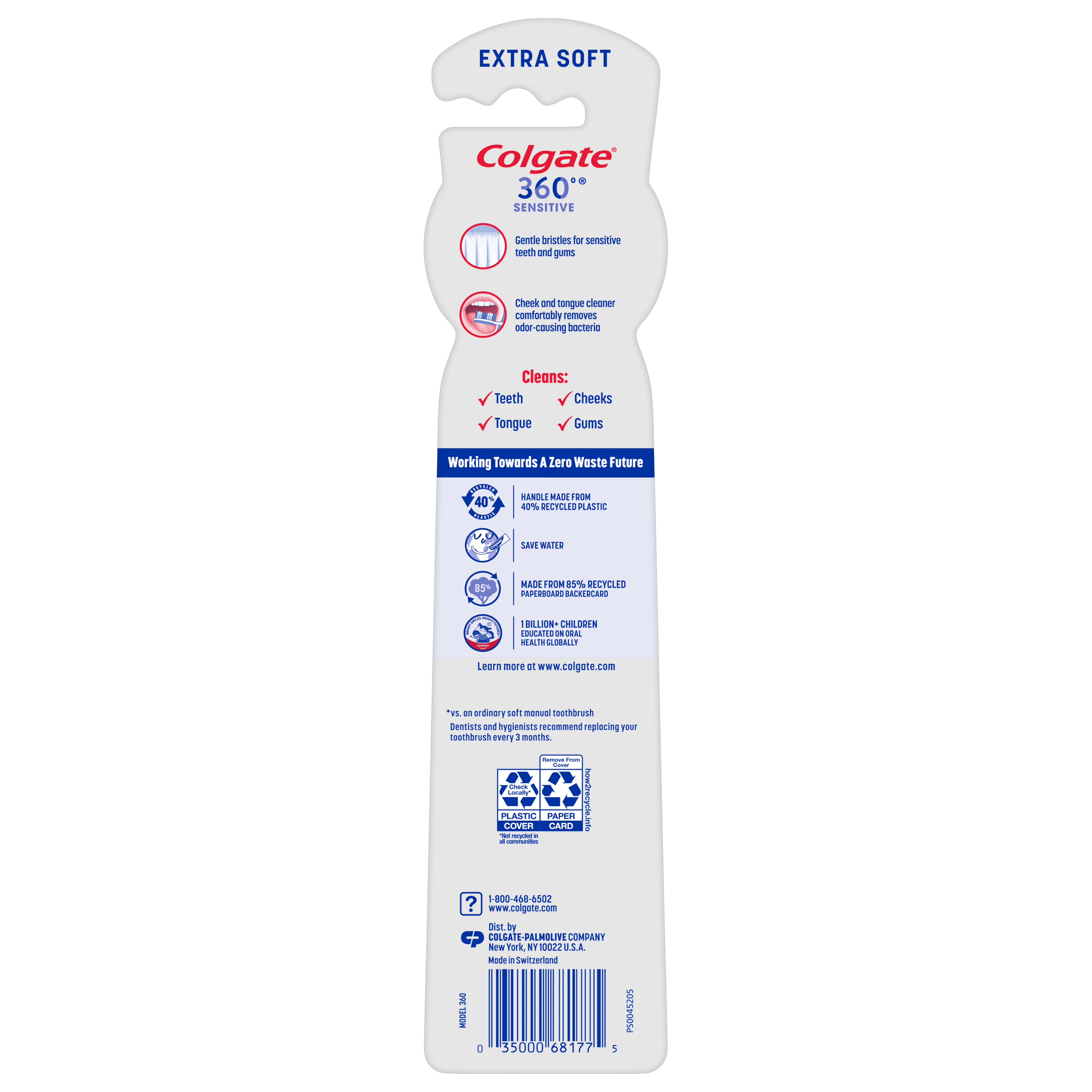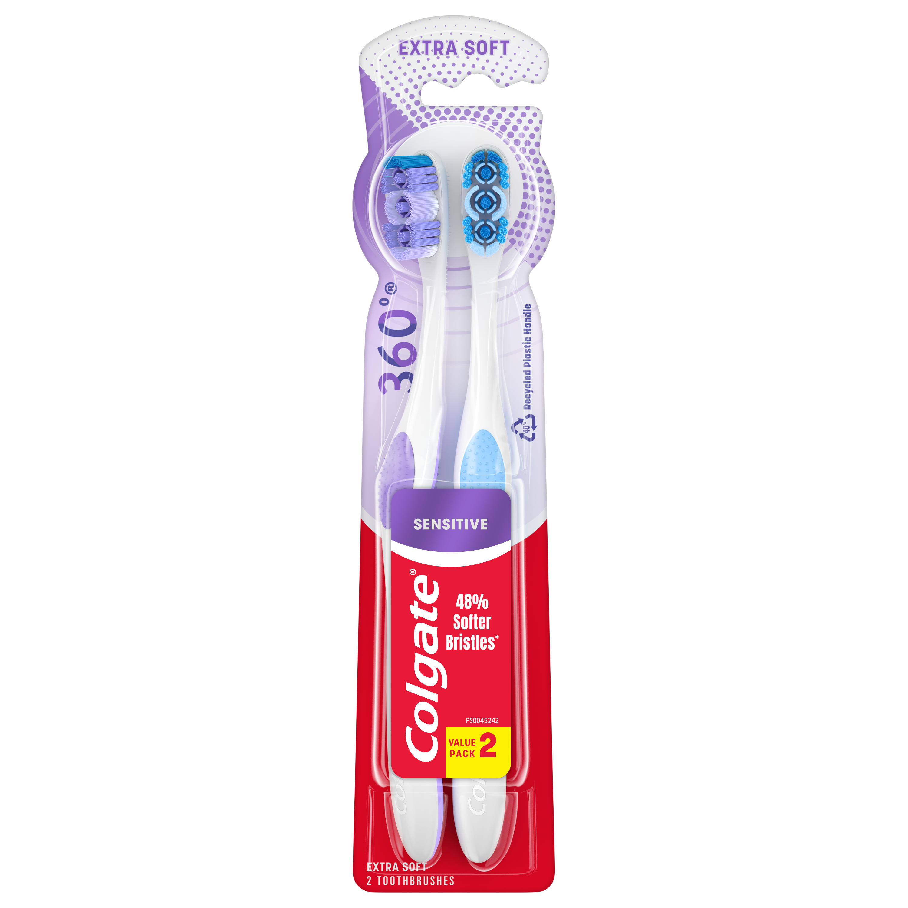 SKU 168177 Consumer Unit - GTIN 00035000681775 Case - GTIN 10035000681772 Product Category Oral Care Product Sub Category Manual TB Product Equity (Brand) Colgate Product Sub Brand Colgate 360 Man TB Product Title Colgate Enamel Health Sensitive Toothbrush, Extra Soft, 2 ct eCommerce Copy- Long Description <lt/>p<gt/>The Colgate 360⁰ Enamel Health Sensitive manual extra soft toothbrush has 48% softer bristles (vs. an ordinary soft manual toothbrush) to help protect enamel surfaces and gums. This extra soft toothbrush features a raised cleaning tip that helps get into hard-to-reach areas, polishing whitening cups that gently remove stains for a bright smile, and the unique cheek & tongue cleaner that helps remove odor-causing bacteria. <lt/>/p<gt/> Amazon RPC B00O33B29S AMZ URL https://www.amazon.com/dp/B00O33B29S Walmart RPC 38543184 Walmart URL (Computed) https://www.walmart.com/ip/a/38543184 Albertsons RPC 960241519 Albertsons URL https://www.albertsons.com/shop/product-details.960241519.html CVS RPC 548525