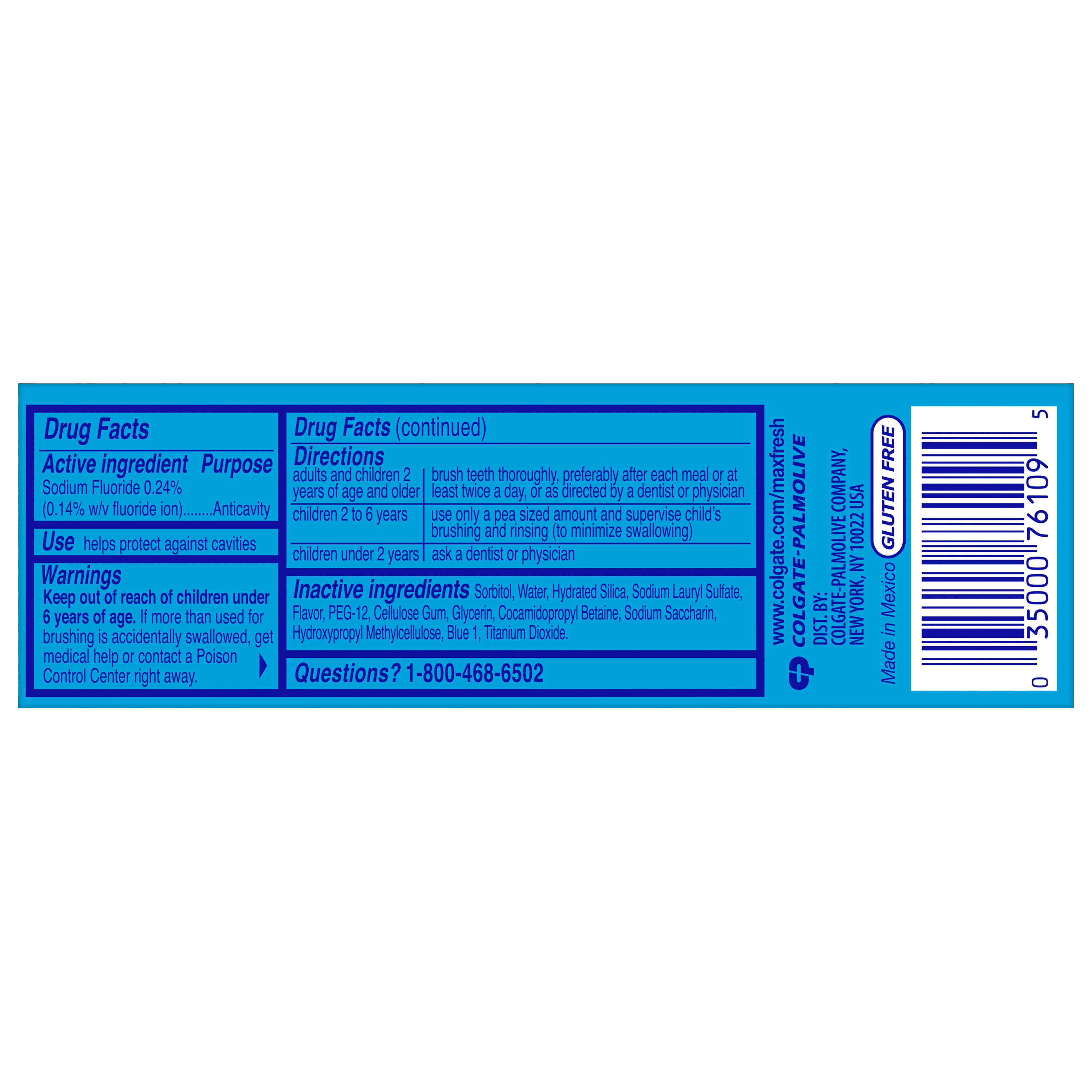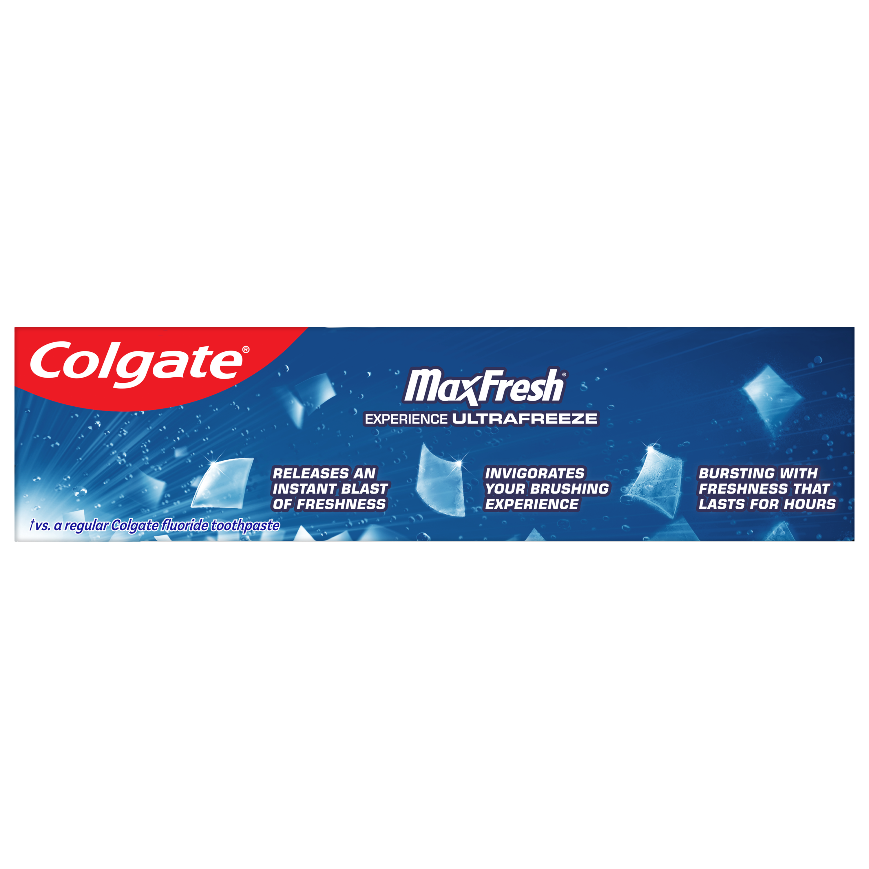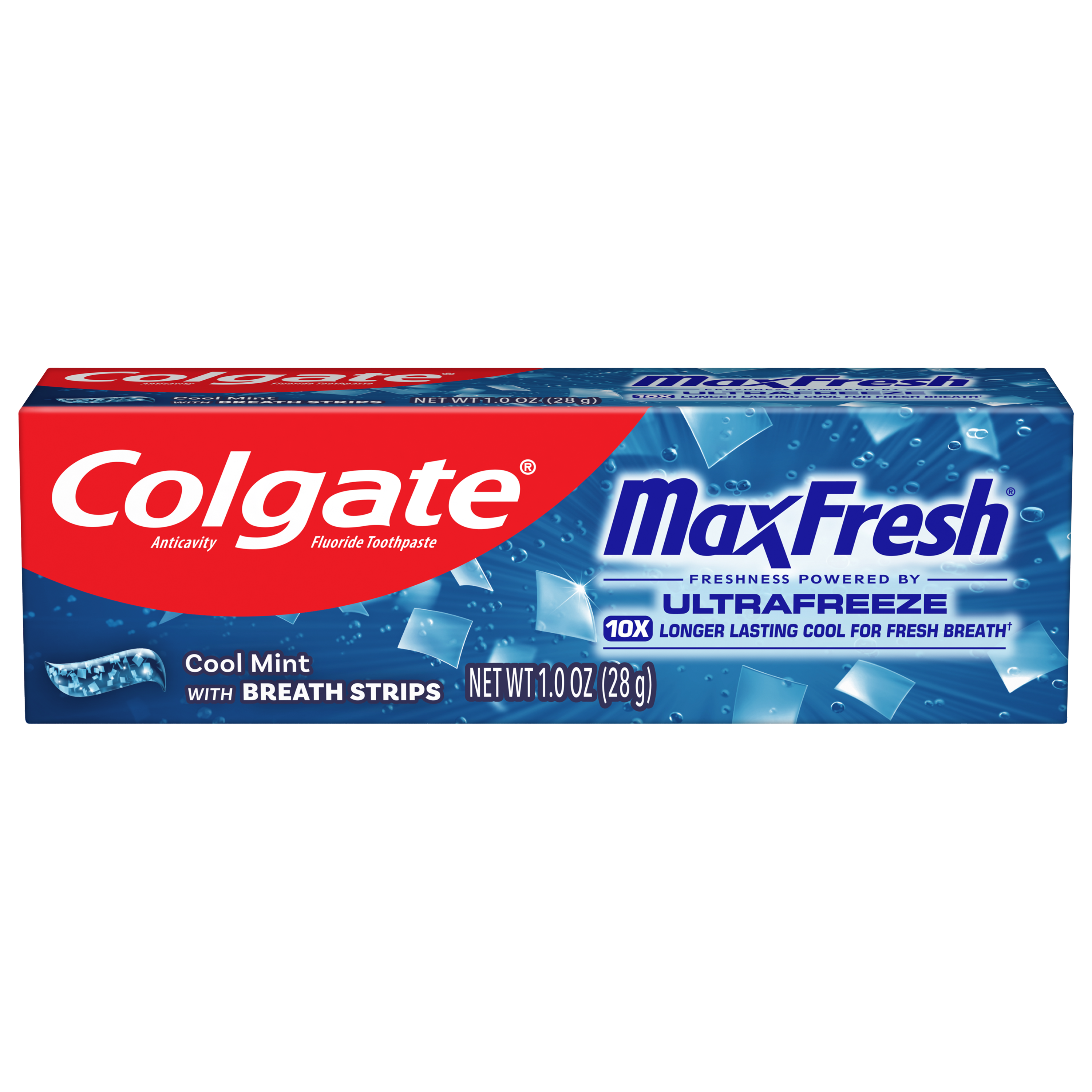 SKU 176664 Consumer Unit - GTIN 00035000761095 Case - GTIN 00035000766649 Product Category Oral Care Product Sub Category Toothpaste Product Equity (Brand) Colgate Product Sub Brand Colgate Max Fresh TP Product Title Colgate MaxFresh Cool Mint Toothpaste, Travel Toothpaste, 1.0 oz Product Description Release an instant blast of freshness while you’re on the go with Colgate MaxFresh Cool Mint Toothpaste. Powered by Ultrafreeze, this invigorating travel-size peppermint toothpaste offers 10X longer-lasting cool for fresh breath*. This minty travel toothpaste, with the help of Ultrafreeze and hundreds of mini breath strips, is bursting with freshness that lasts for hours. In addition, this Colgate MaxFresh mini toothpaste comes in a refreshing Cool Mint flavor that invigorates the brushing experience. However, it’s more than just a travel size toothpaste for bad breath, Colgate MaxFresh Cool Mint Toothpaste is also a fluoride toothpaste and helps prevent cavities. With its refreshing Cool Mint flavor and hundreds of mini breath strips, Colgate MaxFresh Travel Toothpaste leaves your breath feeling fresh for hours. Plus, the fluoride-based formula helps fight cavities. Get long-lasting fresh breath with Colgate MaxFresh Cool Mint Toothpaste. *vs. a regular Colgate fluoride toothpaste eCommerce Copy- Long Description Release an instant blast of freshness with Colgate® Max Fresh Cool Mint Toothpaste. Powered by Ultrafreeze, this invigorating peppermint toothpaste offers 10X longer-lasting cool for fresh breath*. This mint toothpaste, with the help of Ultrafreeze and hundreds of breath strips, releases a powerful rush of freshness and leaves your breath feeling fresh for hours. However, it’s more than just a toothpaste for fresh breath, Colgate® Max Fresh Cool Mint Toothpaste is also a fluoride toothpaste and helps prevent cavities. *vs. a regular Colgate® fluoride toothpaste Bullet 1 Includes one (1) 1.0 oz tube of Colgate MaxFresh Cool Mint Toothpaste, Travel Size Toothpaste Bullet 2 Powered by Ultrafreeze, this Colgate MaxFresh mini toothpaste offers 10X longer-lasting cool for fresh breath* Bullet 3 Fluoride toothpaste formula helps fight cavities Bullet 4 This travel-size peppermint toothpaste, with hundreds of mini breath strips, is bursting with freshness that lasts for hours Bullet 5 Release an instant blast of freshness with Colgate MaxFresh Cool Mint Travel Toothpaste Amazon RPC B07G74P9Q7 AMZ URL https://www.amazon.com/dp/B07G74P9Q7 Walmart RPC 10311739 Walmart URL (Computed) https://www.walmart.com/ip/a/10311739 Target RPC 75663044 Target URL https://www.target.com/p/a/-/A-75663044 Family Dollar RPC 2009504