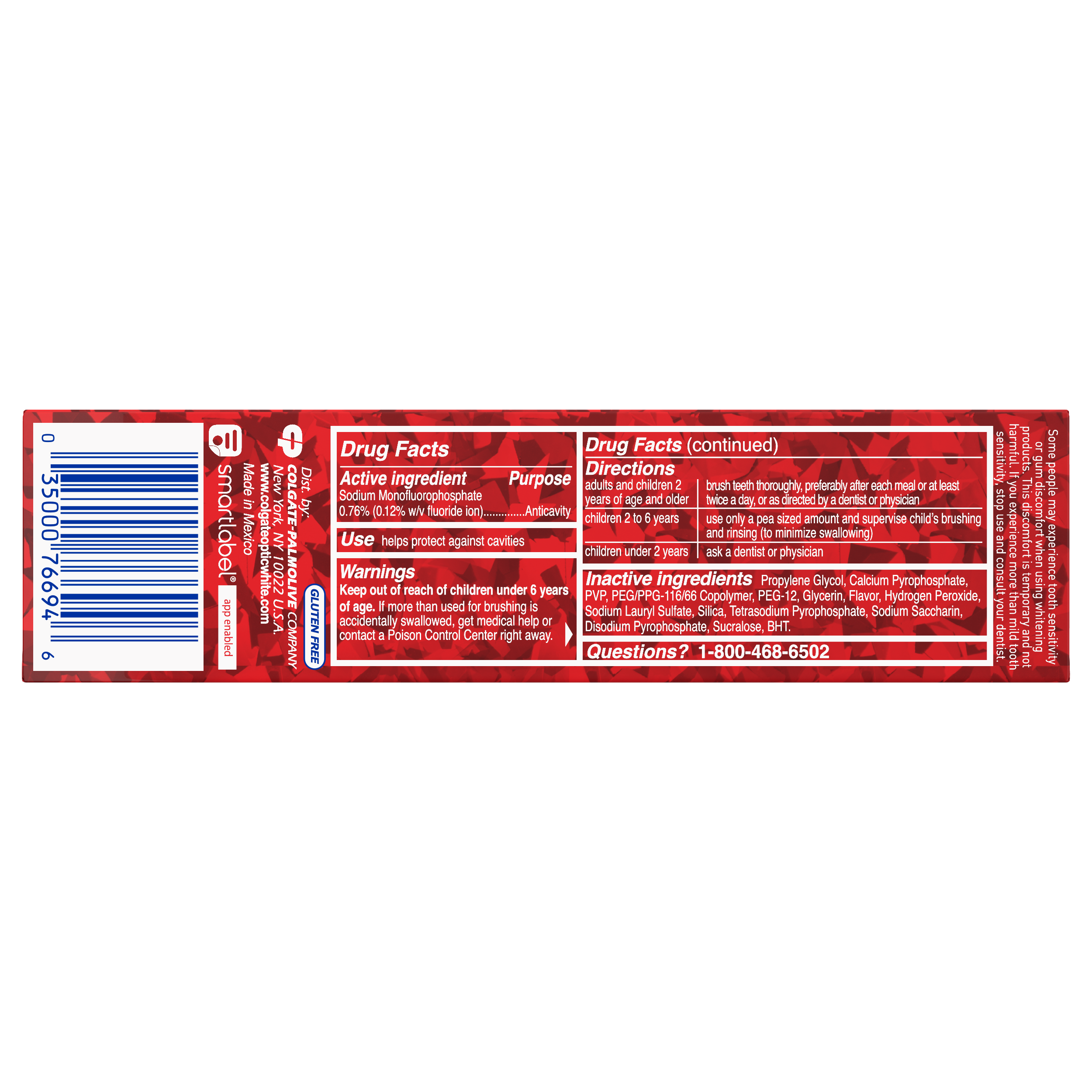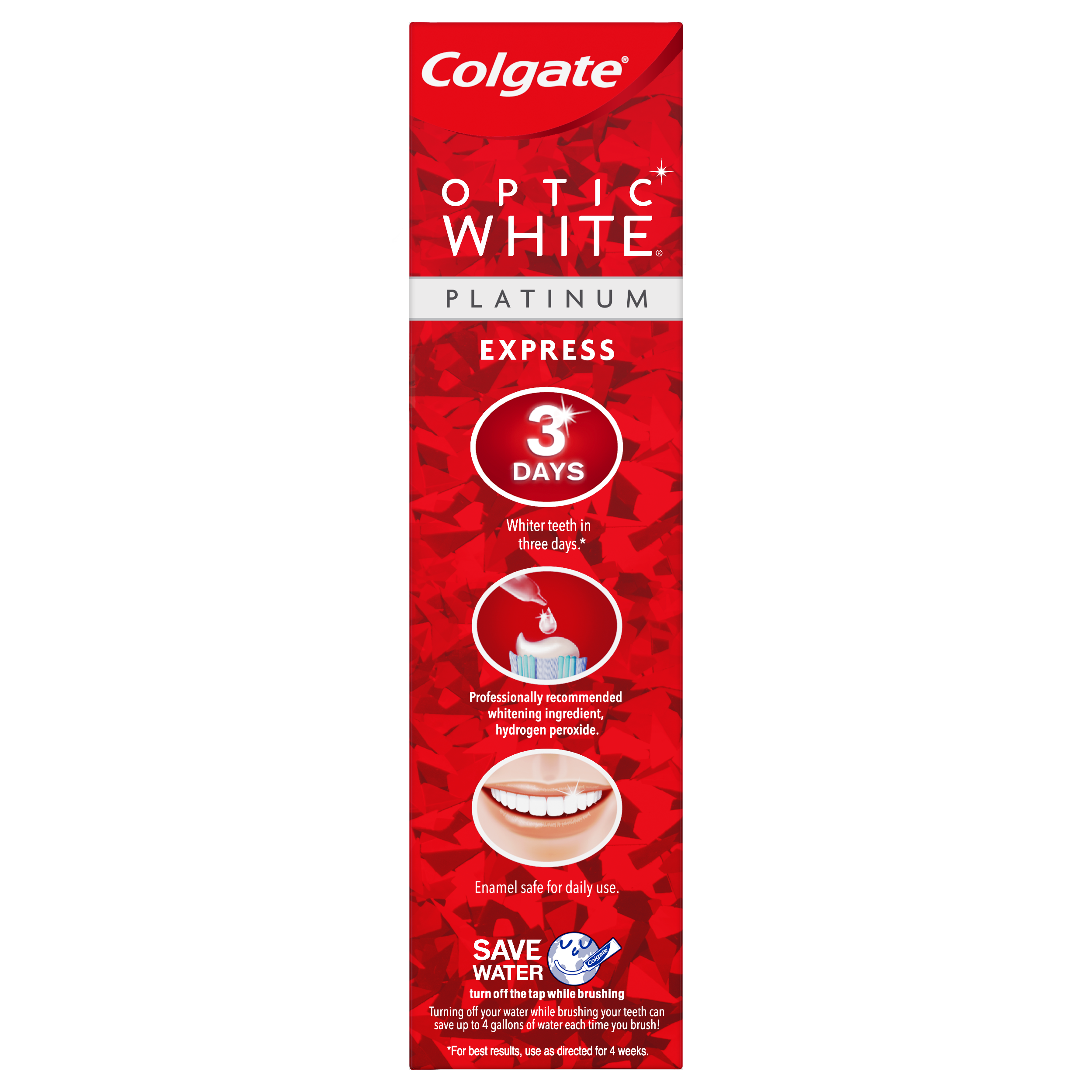 SKU 176694 Consumer Unit - GTIN 00035000766946 Product Category Oral Care Product Sub Category Toothpaste Product Equity (Brand) Colgate Product Sub Brand Colgate Optic White TP Product Title Colgate Optic White Express White Whitening Toothpaste - 3 ounce Product Description Colgate Optic White Platinum Express White whitening toothpaste is a revolutionary product in the Optic White collection. This breakthrough formula gives users whiter teeth in just three days just by brushing (for best results, use as directed for 4 weeks). The toothpaste contains 2x more of the whitening ingredient, Hydrogen Peroxide (vs. Colgate Optic White Sparkling Mint). Colgate Optic White Platinum Express White whitening toothpaste is safe for daily use, protects enamel and provides anti-cavity protection. Having a radiant and polished look is quick and easy with Colgate Optic White Platinum Express White. Bullet 1 Breakthrough formula offers whiter teeth in 3 days (for best results, use as directed for 4 weeks) just by brushing. Bullet 2 Professionally recommended whitening ingredient, hydrogen peroxide. Bullet 3 Contains 2x the whitening ingredient (Vs Optic White Sparkling Mint). Bullet 4 Safe for daily use. Protects enamel and provides anti-cavity fluoride protection. Active Ingredients Active Ingredient: Sodium Monofluorophosphate (0.76% (0.12% w/v Fluoride Ion)). Purpose: Anticavity.