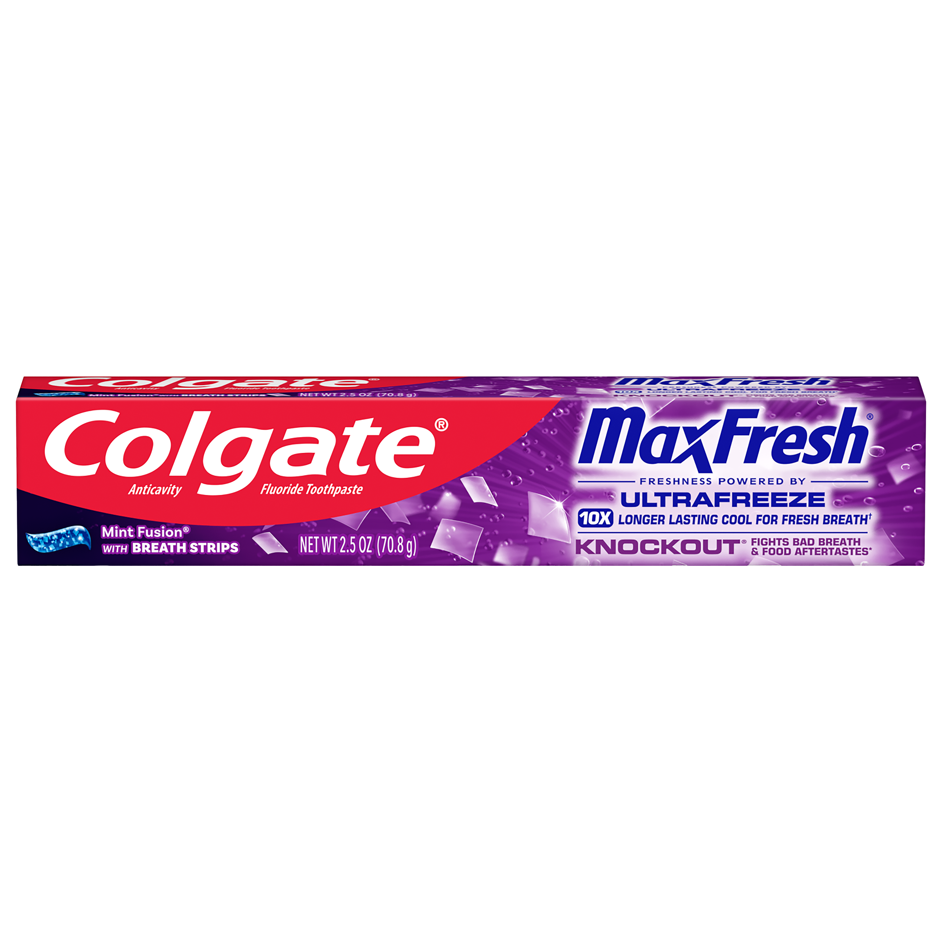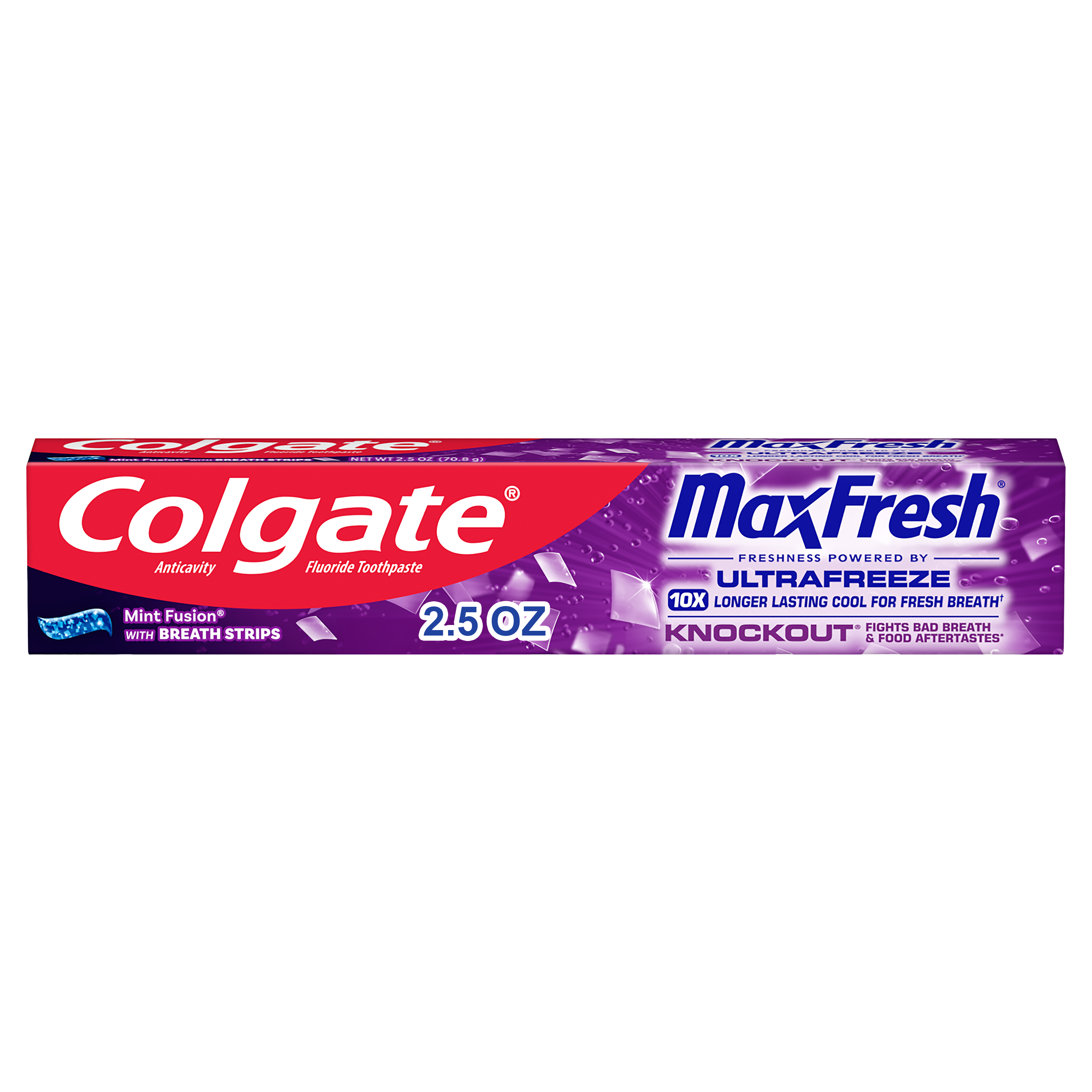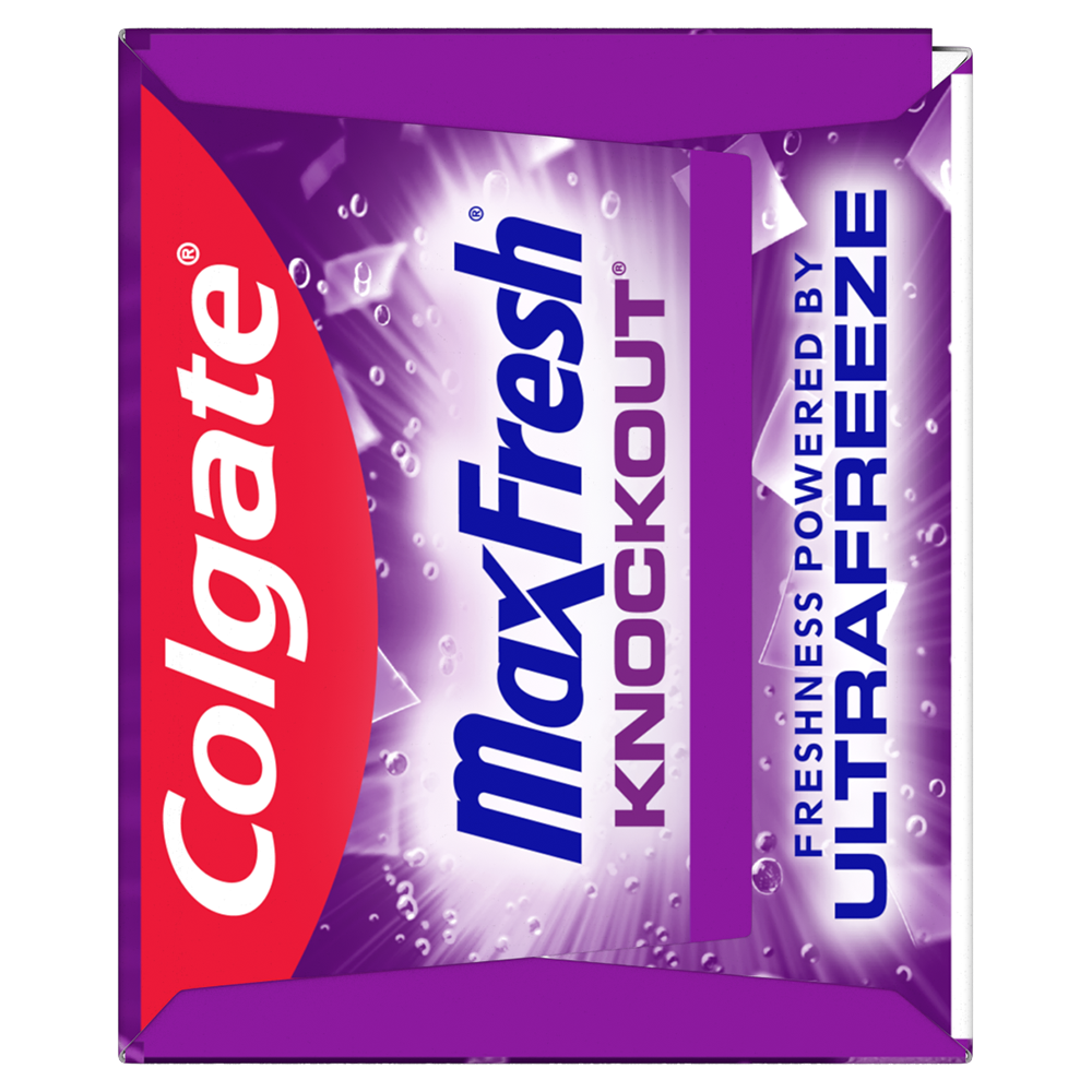 SKU 176725 Consumer Unit - GTIN 00035000767257 Product Category Oral Care Product Sub Category Toothpaste Product Equity (Brand) Colgate Product Sub Brand Colgate Max Fresh TP Product Title Colgate MaxFresh Knockout Mint Toothpaste, Travel Toothpaste, 2.5 oz Product Description Release an instant blast of freshness and help destroy nasty odors with Colgate MaxFresh Knockout Mint Toothpaste. Powered by Ultrafreeze, this invigorating travel size fresh breath toothpaste offers 10X longer-lasting cool for fresh breath* and fights lingering food aftertastes**. This minty travel toothpaste, with the help of Ultrafreeze and hundreds of mini breath strips, is bursting with freshness that lasts for hours. Colgate MaxFresh Knockout Toothpaste comes in a powerful minty toothpaste flavor that invigorates the brushing experience. The unique formula, with odor neutralizing technology, helps destroy even the nastiest odors and keeps your breath fresh for hours.** However, it’s more than just a travel size toothpaste for bad breath, Colgate MaxFresh Knockout Mint Toothpaste is also a fluoride toothpaste and helps prevent cavities. With its refreshing minty flavor and hundreds of mini breath strips, Colgate MaxFresh Knockout Toothpaste leaves your breath feeling fresh for hours. Plus, the fluoride-based formula helps fight cavities. Get long-lasting fresh breath with Colgate MaxFresh Knockout Mint Toothpaste. *vs. a regular Colgate fluoride toothpaste **based on in-vitro garlic odor reduction results and descriptive sensory panel analysis following brushing teeth and tongue eCommerce Copy- Long Description Release an instant blast of freshness and help destroy nasty odors with Colgate® Max Fresh Knockout Mint Toothpaste. Powered by Ultrafreeze, this invigorating fresh breath toothpaste offers 10X longer-lasting cool for fresh breath* and fights lingering food aftertastes**. This minty toothpaste, with the help of Ultrafreeze and hundreds of breath strips, unleashes a powerful rush of freshness for long-lasting fresh breath. Colgate® Max Fresh Knockout Toothpaste comes in a powerful minty toothpaste flavor that invigorates the brushing experience. The unique formula, with odor neutralizing technology, helps destroy even the nastiest odors and keeps your breath fresh for hours.** However, it’s more than just a toothpaste for bad breath, Colgate® Max Fresh Knockout Mint Toothpaste is also a fluoride toothpaste and helps prevent cavities. Get long-lasting fresh breath with Colgate® Max Fresh Knockout Mint Toothpaste. *vs. a regular Colgate® fluoride toothpaste **based on in-vitro garlic odor reduction results and descriptive sensory panel analysis following brushing teeth and tongue Bullet 1 Includes one (1) 2.5 oz tube of Colgate MaxFresh Knockout Mint Toothpaste, Travel Toothpaste Bullet 2 Colgate MaxFresh Knockout Toothpaste provides 10X longer-lasting cool for fresh breath* and helps destroy strong odors and food aftertastes** Bullet 3 Fluoride toothpaste formula helps fight cavities Bullet 4 This mini toothpaste, powered by Ultrafreeze, is bursting with freshness that lasts for hours Bullet 5 Release an instant blast of freshness with Colgate MaxFresh Knockout Mint Toothpaste for Bad Breath Active Ingredients Sodium Fluoride 0.24% (0.14% w/v fluoride ion) Dollar Tree RPC 246222 Family Dollar RPC 997252