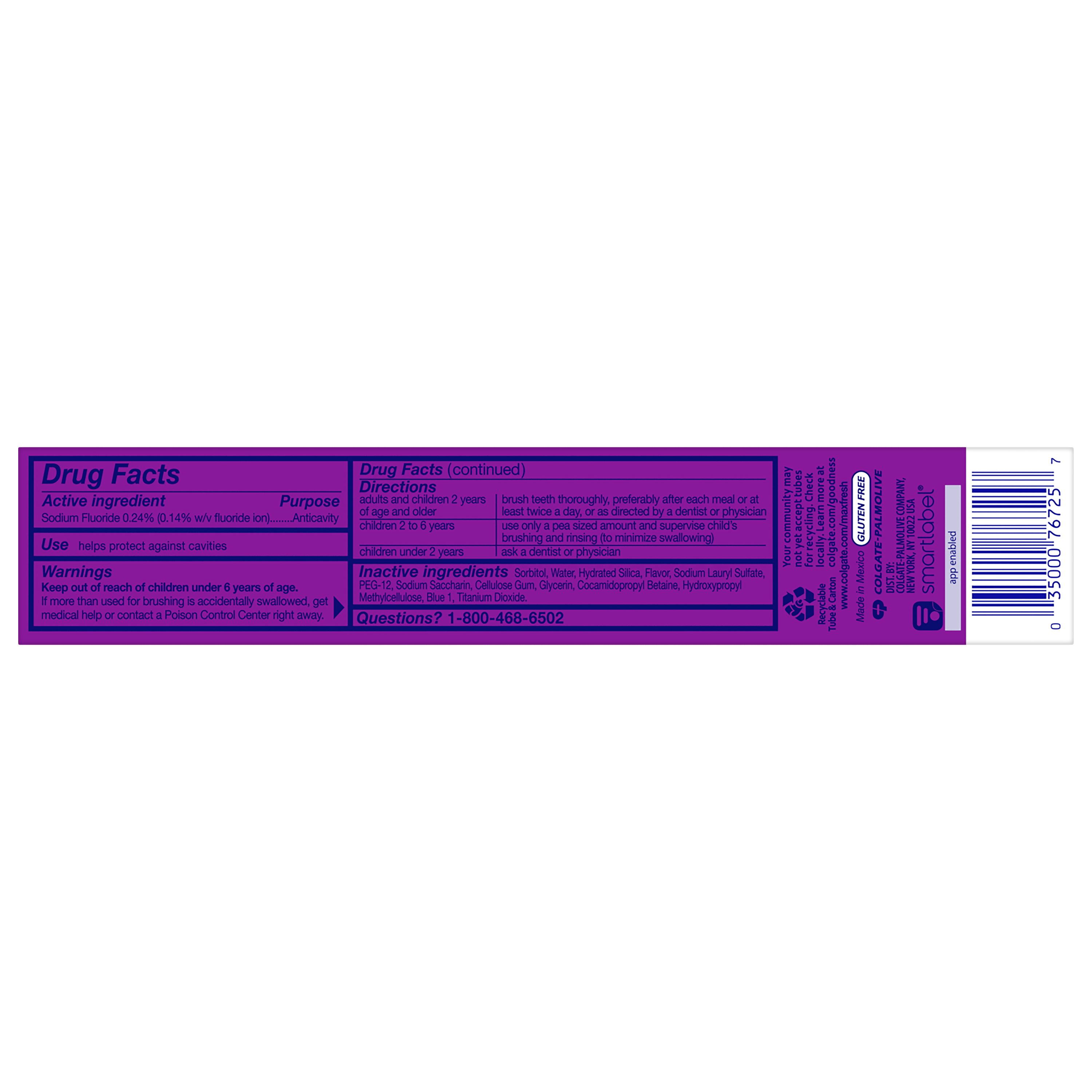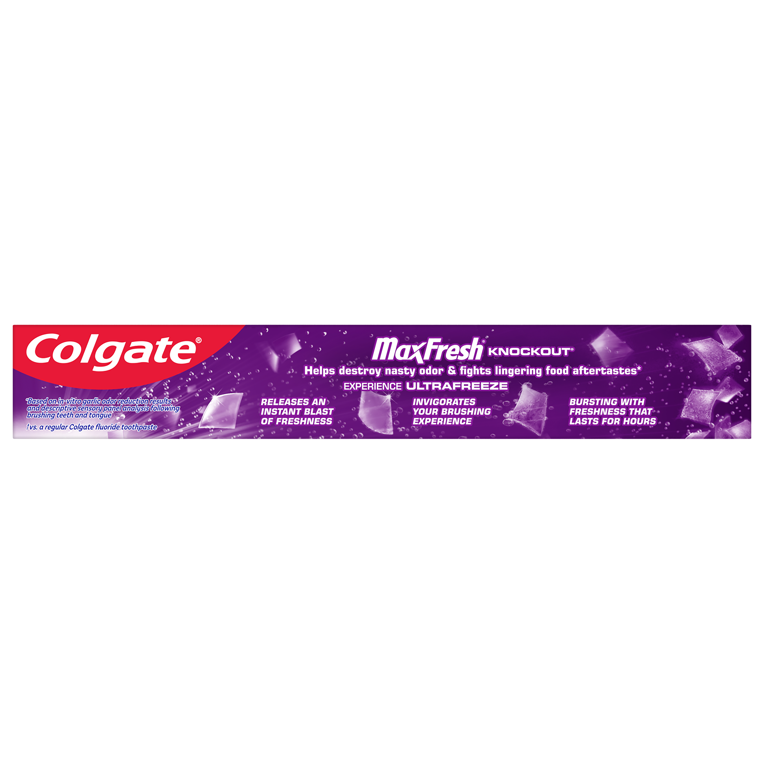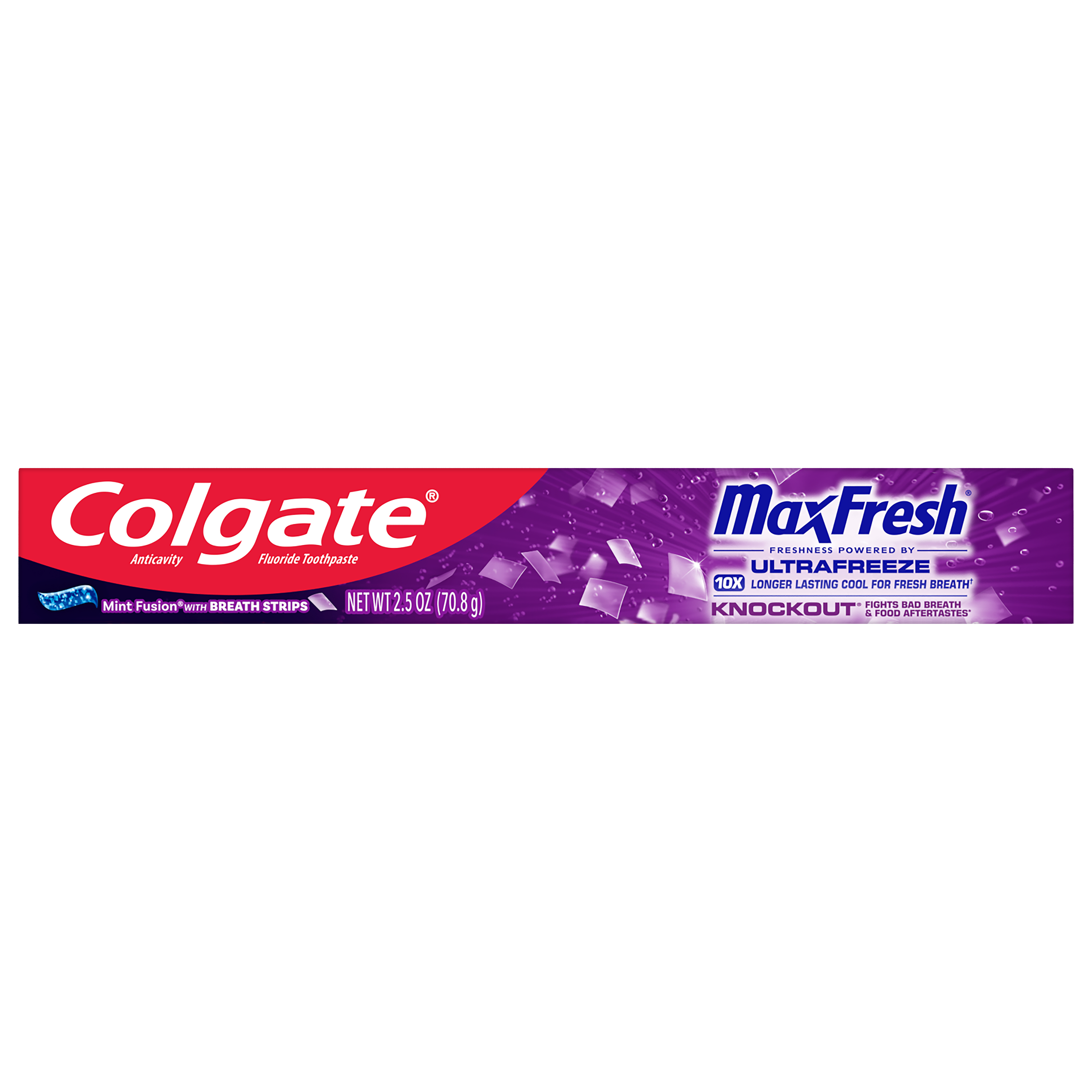 SKU 176725 Consumer Unit - GTIN 00035000767257 Product Category Oral Care Product Sub Category Toothpaste Product Equity (Brand) Colgate Product Sub Brand Colgate Max Fresh TP Product Title Colgate MaxFresh Knockout Mint Toothpaste, Travel Toothpaste, 2.5 oz Product Description Release an instant blast of freshness and help destroy nasty odors with Colgate MaxFresh Knockout Mint Toothpaste. Powered by Ultrafreeze, this invigorating travel size fresh breath toothpaste offers 10X longer-lasting cool for fresh breath* and fights lingering food aftertastes**. This minty travel toothpaste, with the help of Ultrafreeze and hundreds of mini breath strips, is bursting with freshness that lasts for hours. Colgate MaxFresh Knockout Toothpaste comes in a powerful minty toothpaste flavor that invigorates the brushing experience. The unique formula, with odor neutralizing technology, helps destroy even the nastiest odors and keeps your breath fresh for hours.** However, it’s more than just a travel size toothpaste for bad breath, Colgate MaxFresh Knockout Mint Toothpaste is also a fluoride toothpaste and helps prevent cavities. With its refreshing minty flavor and hundreds of mini breath strips, Colgate MaxFresh Knockout Toothpaste leaves your breath feeling fresh for hours. Plus, the fluoride-based formula helps fight cavities. Get long-lasting fresh breath with Colgate MaxFresh Knockout Mint Toothpaste. *vs. a regular Colgate fluoride toothpaste **based on in-vitro garlic odor reduction results and descriptive sensory panel analysis following brushing teeth and tongue eCommerce Copy- Long Description Release an instant blast of freshness and help destroy nasty odors with Colgate® Max Fresh Knockout Mint Toothpaste. Powered by Ultrafreeze, this invigorating fresh breath toothpaste offers 10X longer-lasting cool for fresh breath* and fights lingering food aftertastes**. This minty toothpaste, with the help of Ultrafreeze and hundreds of breath strips, unleashes a powerful rush of freshness for long-lasting fresh breath. Colgate® Max Fresh Knockout Toothpaste comes in a powerful minty toothpaste flavor that invigorates the brushing experience. The unique formula, with odor neutralizing technology, helps destroy even the nastiest odors and keeps your breath fresh for hours.** However, it’s more than just a toothpaste for bad breath, Colgate® Max Fresh Knockout Mint Toothpaste is also a fluoride toothpaste and helps prevent cavities. Get long-lasting fresh breath with Colgate® Max Fresh Knockout Mint Toothpaste. *vs. a regular Colgate® fluoride toothpaste **based on in-vitro garlic odor reduction results and descriptive sensory panel analysis following brushing teeth and tongue Bullet 1 Includes one (1) 2.5 oz tube of Colgate MaxFresh Knockout Mint Toothpaste, Travel Toothpaste Bullet 2 Colgate MaxFresh Knockout Toothpaste provides 10X longer-lasting cool for fresh breath* and helps destroy strong odors and food aftertastes** Bullet 3 Fluoride toothpaste formula helps fight cavities Bullet 4 This mini toothpaste, powered by Ultrafreeze, is bursting with freshness that lasts for hours Bullet 5 Release an instant blast of freshness with Colgate MaxFresh Knockout Mint Toothpaste for Bad Breath Active Ingredients Sodium Fluoride 0.24% (0.14% w/v fluoride ion) Dollar Tree RPC 246222 Family Dollar RPC 997252