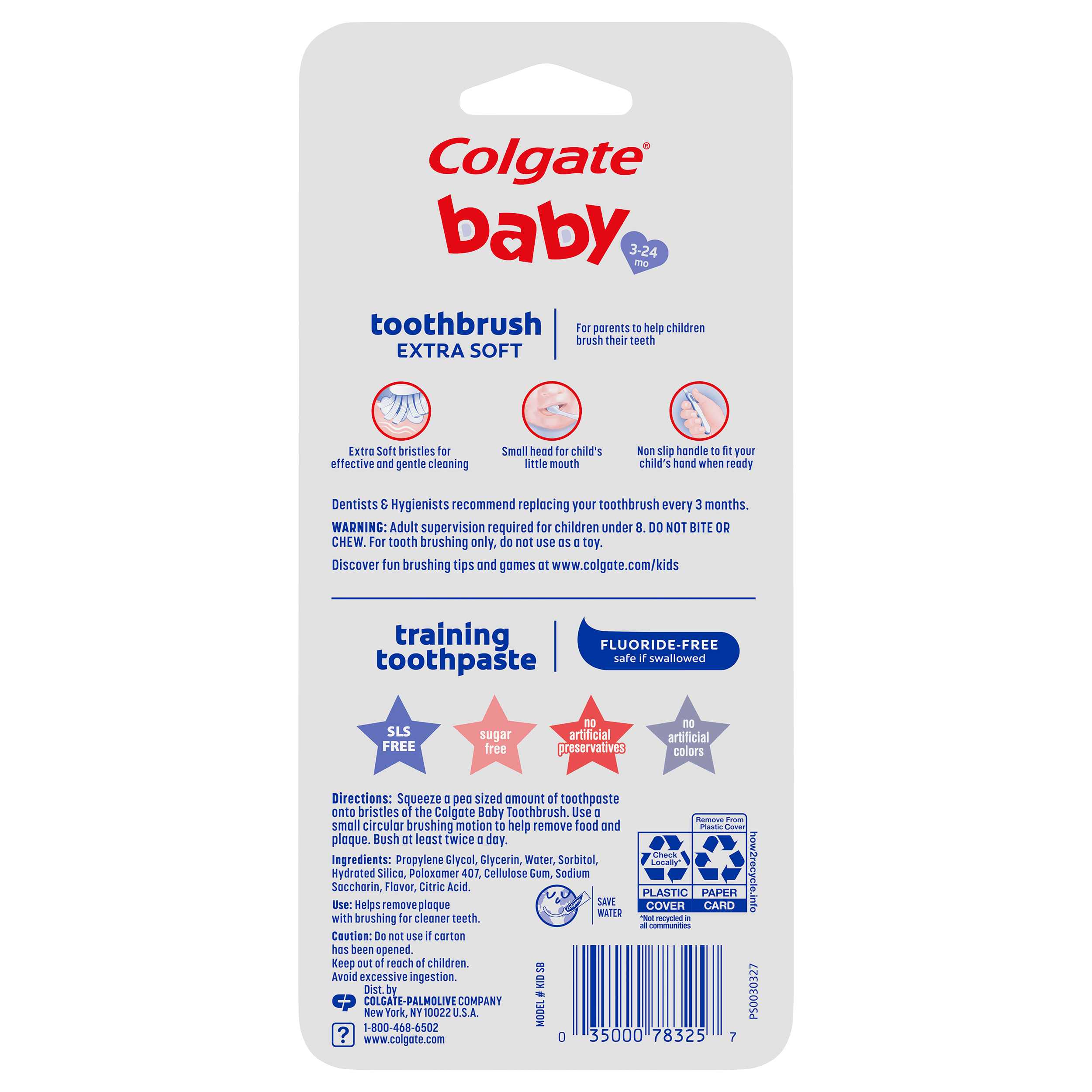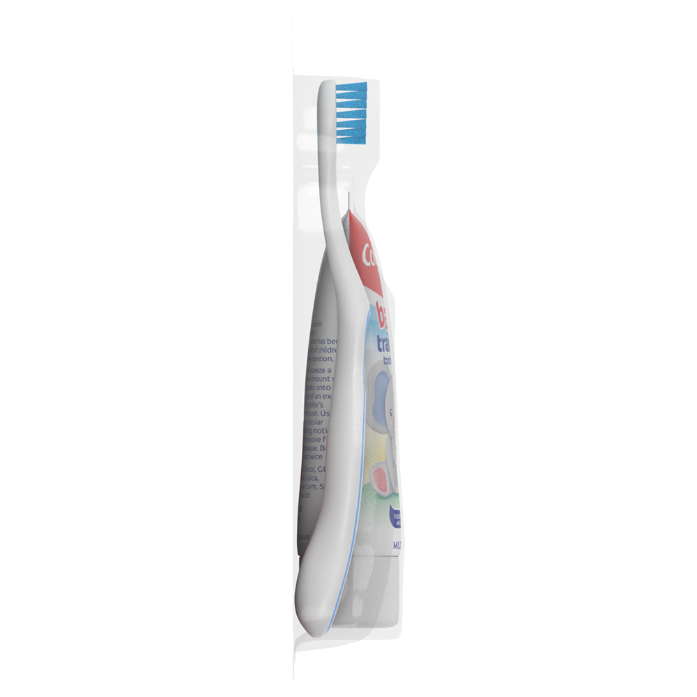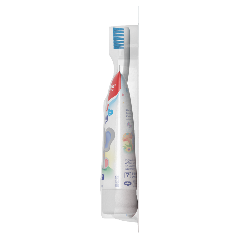 SKU 178325 Consumer Unit - GTIN 00035000783257 Case - GTIN 10035000783254 Product Category Oral Care Product Sub Category Oral Care SUC Mixed Product Equity (Brand) Colgate Product Sub Brand Oral Care SBR Mixed Product Title Colgate Baby Toothbrush and Baby Training Toothpaste Kit Product Description The Colgate Baby Toothbrush and Baby Training Toothpaste Kit is the perfect way to introduce your child to brushing their teeth for the very first time. Designed for babies and toddlers ages 3-24 months, this baby first toothbrush and toothpaste kit features a toothbrush with extra soft bristles for gentle cleaning, a small toothbrush head for easy access to tiny mouths, and a non-slip toothbrush handle that’s easy for both parents and little hands to hold. The included Bubblefruit-flavored kids fluoride free toothpaste tastes like bubblegum and is mild and safe if swallowed. Plus, this baby and toddler toothpaste is sugar free, SLS free, and contains no artificial preservatives or artificial colors. Simply squeeze a pea-sized amount onto the kids toothbrush and use gentle circular motions to help remove plaque and food. The Colgate Kids Extra Soft Baby Toothbrush uses extra soft bristles for effective and gentle cleaning of baby teeth and can also be used with older children as a toddler toothbrush. This extra soft toothbrush helps remove plaque with brushing for clean teeth. Establish good oral hygiene habits early on with the Colgate baby toothbrush and baby toothpaste kit. Bullet 1 Includes one (1) Colgate baby toothbrush with extra soft toothbrush bristles and one (1) 1.75 oz fluoride free baby training toothpaste Bullet 2 The kids fluoride free toothpaste tastes like bubblegum and encourages your child to enjoy brushing Bullet 3 Introduce your child to healthy brushing habits with this extra soft bristle toothbrush and childrens toothpaste kit, ideal for ages 3-24 months Bullet 4 The kids toothbrush features extra soft bristles for gentle, effective cleaning that’s safe on delicate baby teeth and gums Bullet 5 The small toothbrush head is designed to fit tiny mouths and the non-slip toothbrush handle is easy for both parents and kids to hold Bullet 6 The mild, fluoride-free bubblegum toothpaste formula is safe if swallowed and perfect for babies and toddlers just learning to brush Bullet 7 The baby toothpaste is sugar free, SLS free, and contains no artificial preservatives or colors Bullet 8 Squeeze a pea-sized amount onto the baby toothbrush and use gentle circular motions to help remove plaque and food Active Ingredients Inactive Ingredients: Propylene Glycol, Glycerin, Hydrated Silica, Sorbitol, Water, Poloxamer 407, Cellulose Gum, Sodium Saccharin, Citric Acid, Flavor Amazon RPC B00E3EL2Q0 AMZ URL https://www.amazon.com/dp/B00E3EL2Q0 Walmart RPC 24506083 Walmart URL (Computed) https://www.walmart.com/ip/a/24506083