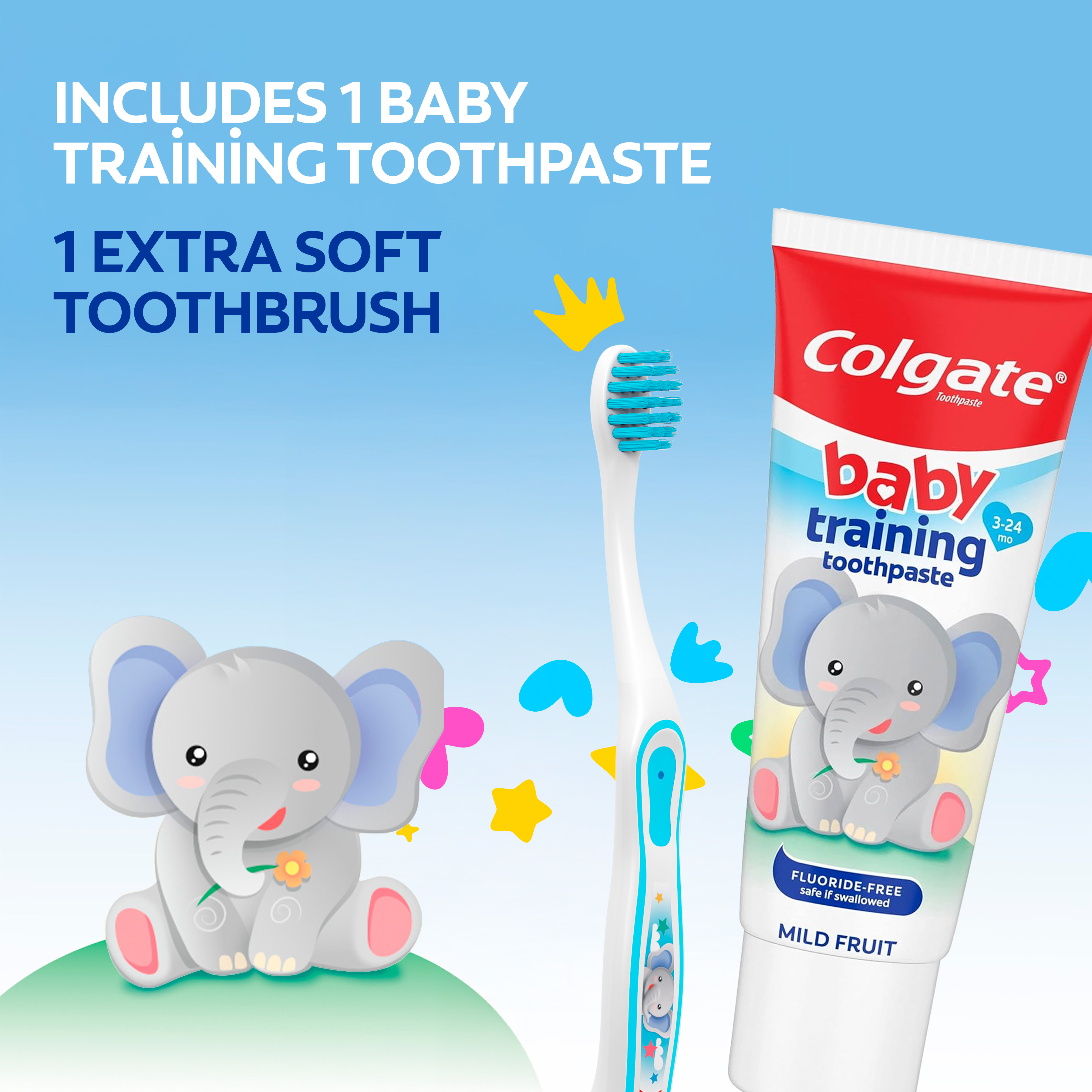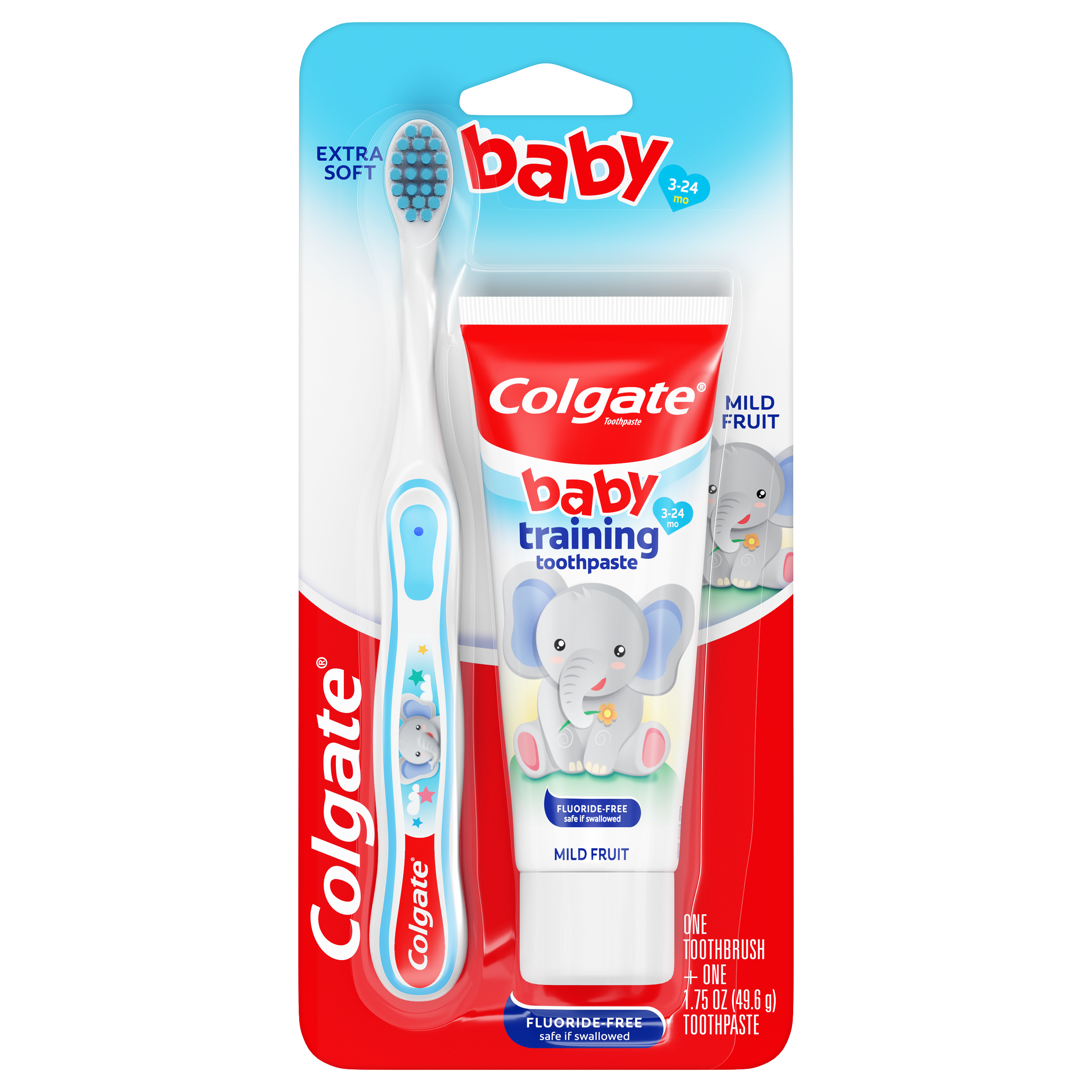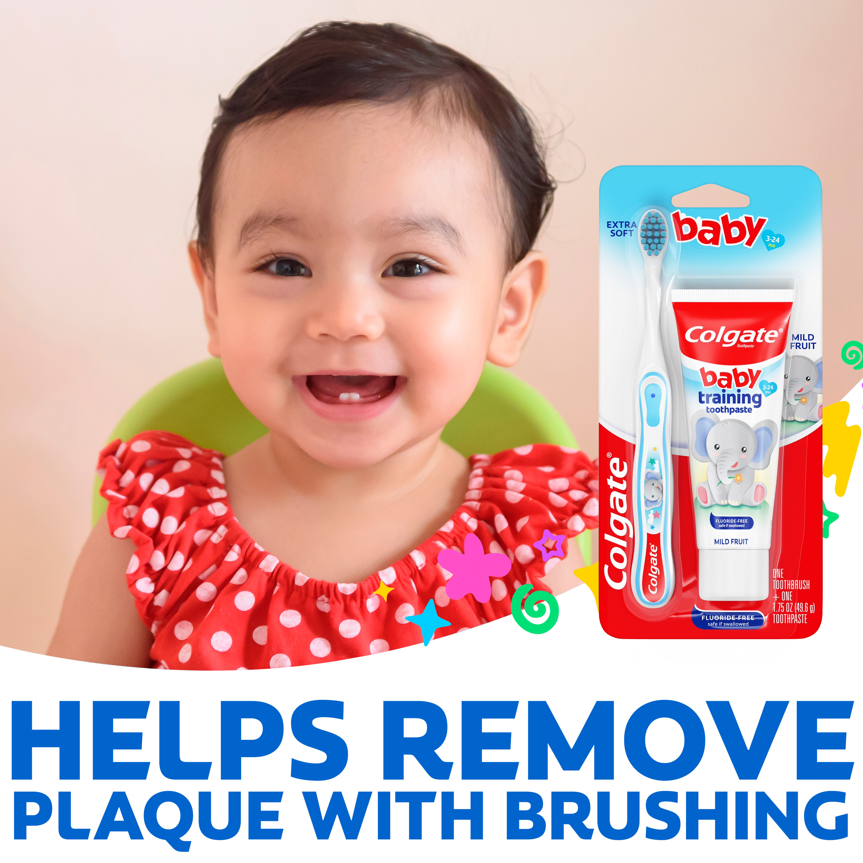 SKU 178325 Consumer Unit - GTIN 00035000783257 Case - GTIN 10035000783254 Product Category Oral Care Product Sub Category Oral Care SUC Mixed Product Equity (Brand) Colgate Product Sub Brand Oral Care SBR Mixed Product Title Colgate Baby Toothbrush and Baby Training Toothpaste Kit Product Description The Colgate Baby Toothbrush and Baby Training Toothpaste Kit is the perfect way to introduce your child to brushing their teeth for the very first time. Designed for babies and toddlers ages 3-24 months, this baby first toothbrush and toothpaste kit features a toothbrush with extra soft bristles for gentle cleaning, a small toothbrush head for easy access to tiny mouths, and a non-slip toothbrush handle that’s easy for both parents and little hands to hold. The included Bubblefruit-flavored kids fluoride free toothpaste tastes like bubblegum and is mild and safe if swallowed. Plus, this baby and toddler toothpaste is sugar free, SLS free, and contains no artificial preservatives or artificial colors. Simply squeeze a pea-sized amount onto the kids toothbrush and use gentle circular motions to help remove plaque and food. The Colgate Kids Extra Soft Baby Toothbrush uses extra soft bristles for effective and gentle cleaning of baby teeth and can also be used with older children as a toddler toothbrush. This extra soft toothbrush helps remove plaque with brushing for clean teeth. Establish good oral hygiene habits early on with the Colgate baby toothbrush and baby toothpaste kit. Bullet 1 Includes one (1) Colgate baby toothbrush with extra soft toothbrush bristles and one (1) 1.75 oz fluoride free baby training toothpaste Bullet 2 The kids fluoride free toothpaste tastes like bubblegum and encourages your child to enjoy brushing Bullet 3 Introduce your child to healthy brushing habits with this extra soft bristle toothbrush and childrens toothpaste kit, ideal for ages 3-24 months Bullet 4 The kids toothbrush features extra soft bristles for gentle, effective cleaning that’s safe on delicate baby teeth and gums Bullet 5 The small toothbrush head is designed to fit tiny mouths and the non-slip toothbrush handle is easy for both parents and kids to hold Bullet 6 The mild, fluoride-free bubblegum toothpaste formula is safe if swallowed and perfect for babies and toddlers just learning to brush Bullet 7 The baby toothpaste is sugar free, SLS free, and contains no artificial preservatives or colors Bullet 8 Squeeze a pea-sized amount onto the baby toothbrush and use gentle circular motions to help remove plaque and food Active Ingredients Inactive Ingredients: Propylene Glycol, Glycerin, Hydrated Silica, Sorbitol, Water, Poloxamer 407, Cellulose Gum, Sodium Saccharin, Citric Acid, Flavor Amazon RPC B00E3EL2Q0 AMZ URL https://www.amazon.com/dp/B00E3EL2Q0 Walmart RPC 24506083 Walmart URL (Computed) https://www.walmart.com/ip/a/24506083