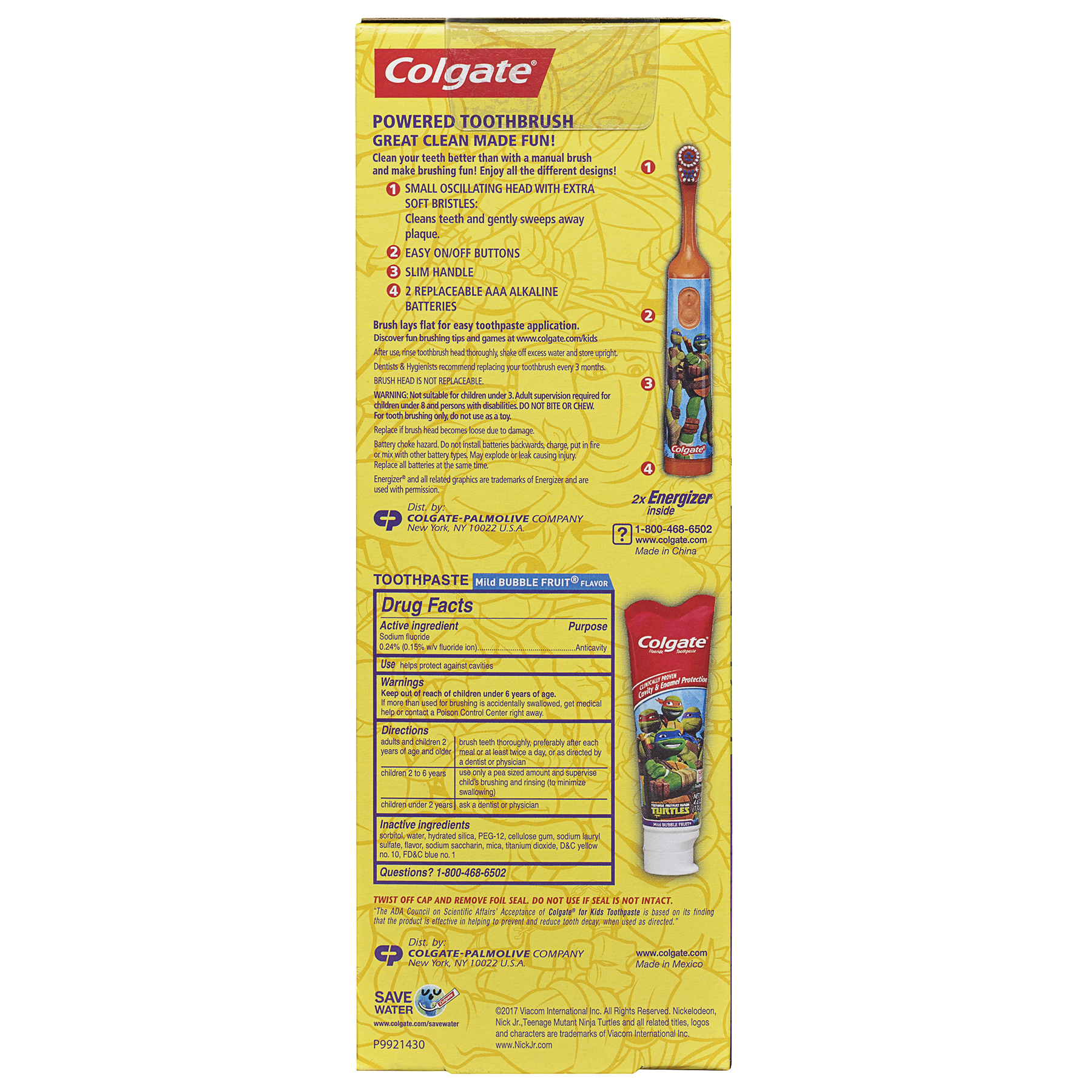 SKU 178339 Consumer Unit - GTIN 00035000783394 Case - GTIN 10035000783391 Product Category Oral Care Product Sub Category Oral Care SUC Mixed Product Equity (Brand) Colgate Product Sub Brand Oral Care SBR Mixed Product Title Colgate Kids Powered Toothbrush, Toothpaste Pack - Teenage Mutant Ninja Turtles Product Description Brushing your teeth is made fun with this Colgate Kids Teenage Mutant Ninja Turtles Oral Care powered toothbrush and toothpaste pack! It features a powered toothbrush and a 4.6 oz. anti-cavity toothpaste. The kids powered toothbrush has a uniquely designed head that cleans teeth and gently sweeps away plaque with extra soft bristles . The kids toothpaste features a convenient stand-up tube with a flip-top cap that encourages kids to brush, and provides clinically-proven cavity and enamel protection that strengthens and protects developing teeth. Bullet 1 Colgate Optic White 2-in-1 Whitening Kit: Bullet 2 Whitens teeth in as little as two days Bullet 3 Helps remove deep-set stains from food and environmental factors Bullet 4 Features stay-on formula Active Ingredients Battery Powered Toothbrush: N/A Toothpaste: Sodium Fluoride 0.24% (0.15% w/v Fluoride Ion). Purpose: Anticavity.