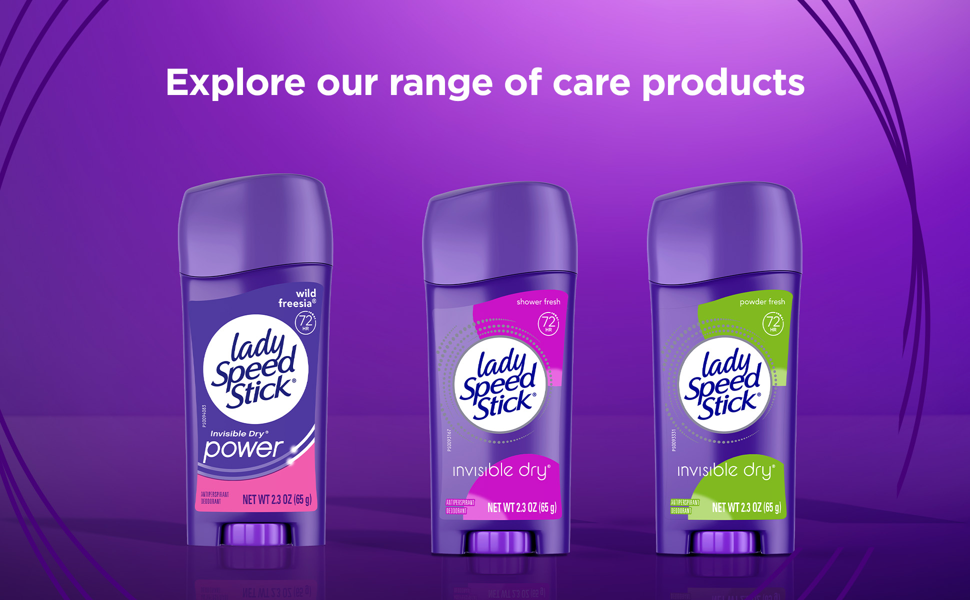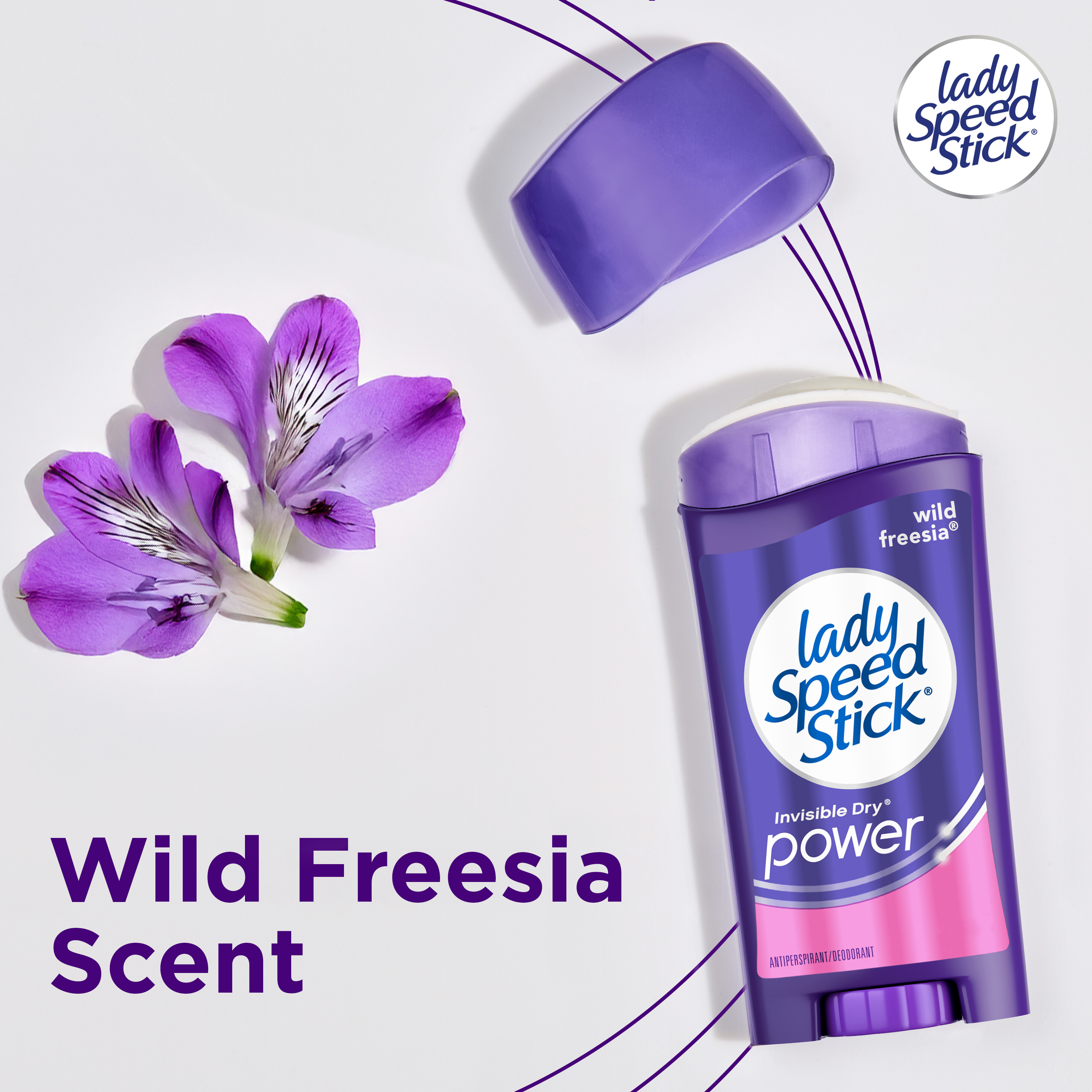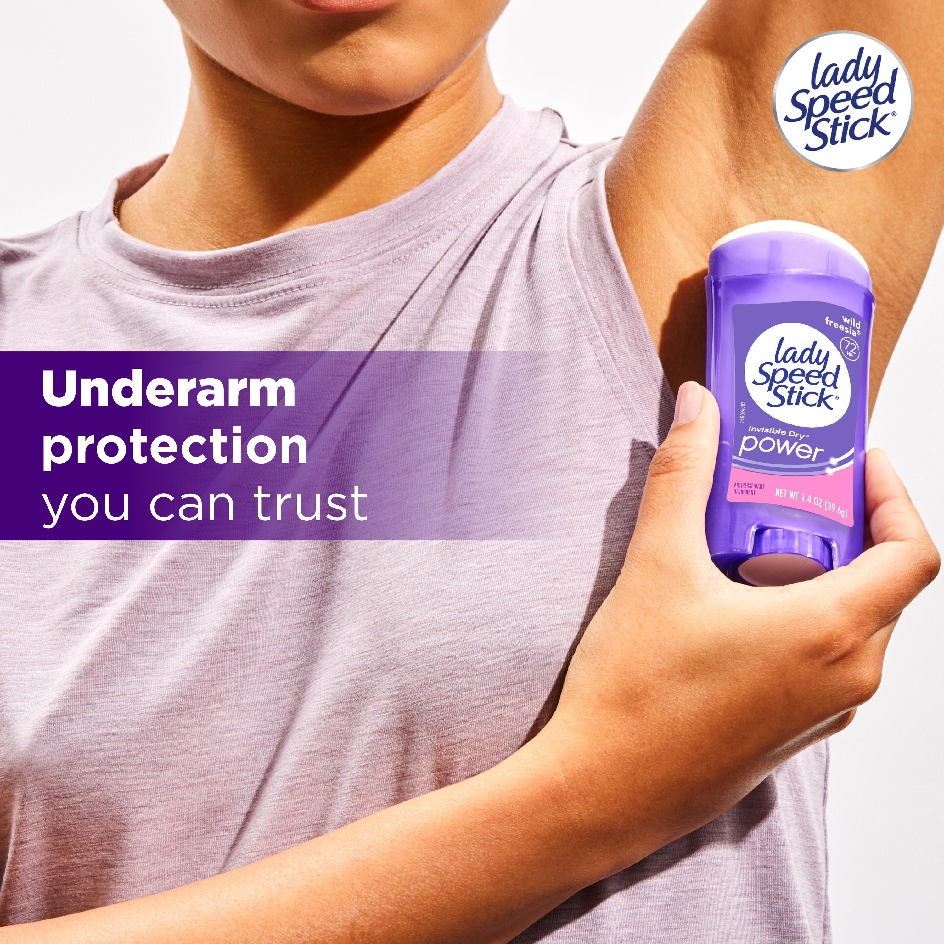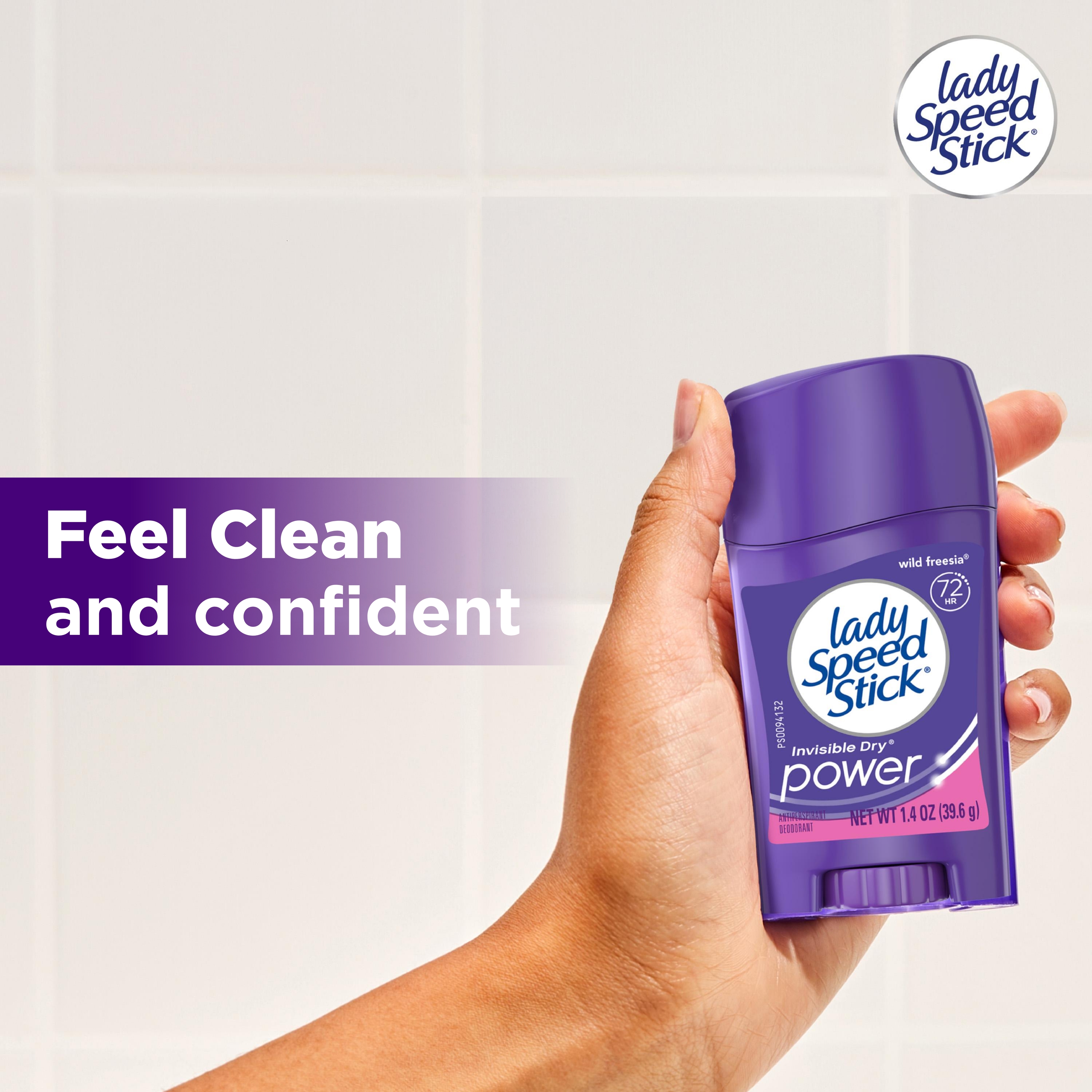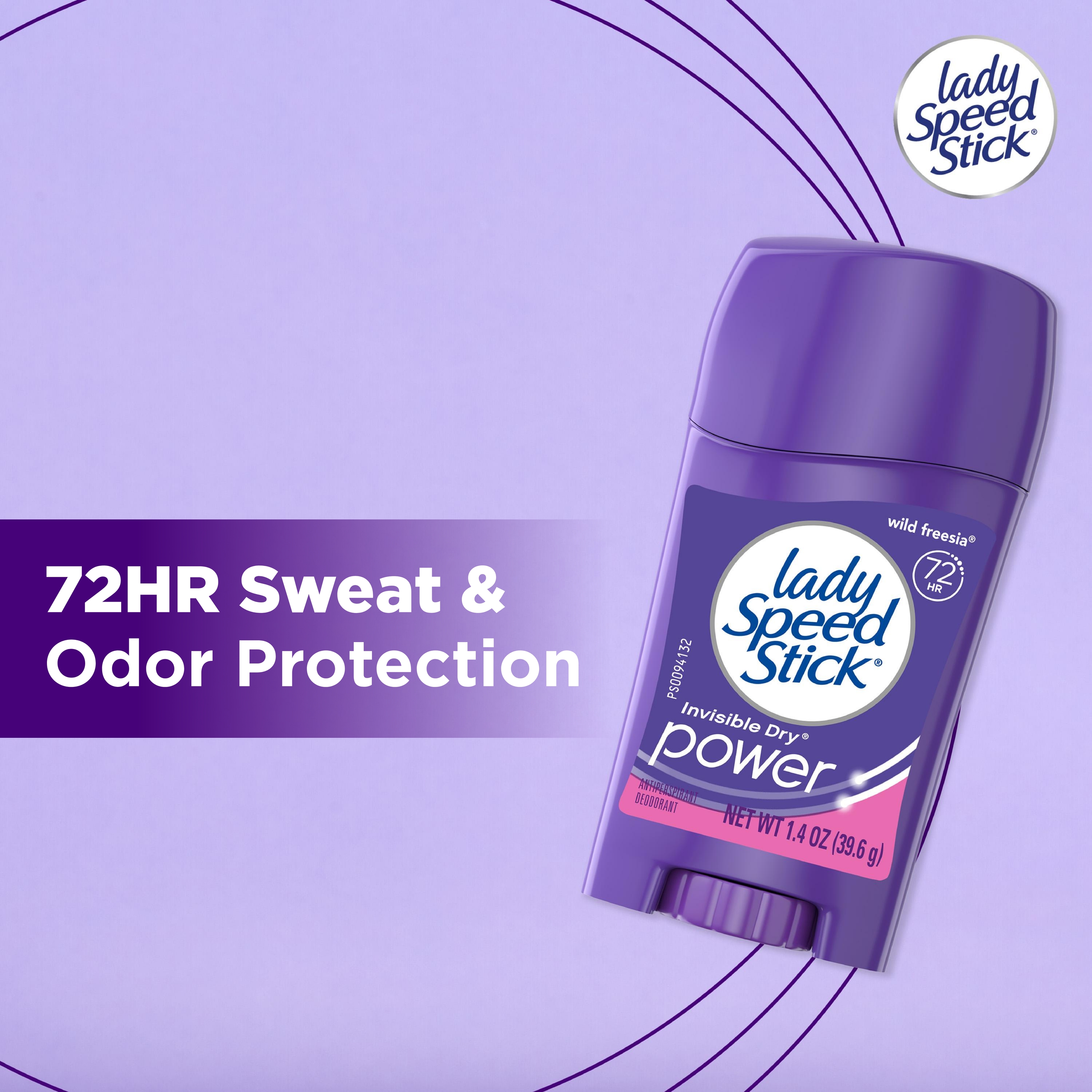 SKU 196343 Consumer Unit - GTIN 00022200963435 Case - GTIN 10022200963432 Product Category Personal Care Product Sub Category AP > Deo Product Equity (Brand) Lady Speed Stick Product Sub Brand Lady Speed Stick Invisible Dry AP/Deo Product Title Lady Speed Stick Antiperspirant Deodorant for Women, 72 HR Sweat & Odor Protection, Invisible Dry, Wild Freesia Scent, 1.4 oz Stick Product Description Lady Speed Stick Antiperspirant Deodorant Stick is your trusted solution for all-day protection and confidence. Designed specifically for women, this antiperspirant delivers 72 HR sweat and odor protection, with a Wild Freesia scent that keeps you feeling dry and confident throughout your day. Engineered for comfort and control, the unique comfort guard applicator delivers a smooth, precise glide and even coverage every time. With invisible dry protection, Lady Speed Stick keeps you dry and confident without leaving messy residue, so you can focus on your day instead of worrying about sweat marks. Whether you’re conquering the office, hitting the gym, or heading out after hours, Lady Speed Stick keeps you covered with premium performance you can rely on. Elevate your grooming routine with antiperspirant deodorant protection that helps you feel confident in any situation with Lady Speed Stick deodorant for women. eCommerce Copy- Long Description Feel fresh, confident and unstoppable with Lady Speed Stick Invisible Dry Antiperspirant Deodorant stick. This Lady Speed Stick antiperspirant for women provides 48-hour odor and wetness protection for maximum confidence. Lady Speed Stick Invisible Dry Power Antiperspirant Deodorant is a solid stick that reduces underarm perspiration. With the fresh scent of Wild Freesia, this deodorant for women will help you smell great and feel confident all day. Lady Speed Stick Invisible Dry Power Antiperspirant Deodorant provides 48 hour odor and wetness protection so you can feel fresh and dry all day. These antiperspirants for women reduce underarm perspiration. Feel confident to take on the day. The Lady Speed Stick line of women’s deodorants and women’s antiperspirants come in a variety of scents and benefits. These include Invisible Dry, Power, Zero and Stainguard variants. Lady Speed Stick Invisible Dry antiperspirants reduce underarm wetness and provide a sheer application. Lady Speed Stick Power antiperspirants provide 48 hour odor and wetness protection. Lady Speed Stick Zero deodorants are free from aluminum, alcohol* and parabens so you can smell and feel great all day. Try them today to find the right deodorant and antiperspirant for you. Feel fresh, confident and unstoppable with Lady Speed Stick. *does not contain ethanol Lady Speed Stick deodorants and antiperspirants should only be applied directly underneath the arms. Remove the cap from the product. Turn the dial on the bottom clockwise to raise the deodorant or antiperspirant stick so that it is protruding from the container. Simply rub the deodorant or antiperspirant directly on the armpit and replace the cap. Bullet 1 Includes one 1.4 oz stick of Speed Stick Antiperspirant Deodorant For Women, Wild Freesia Scent Bullet 2 Experience a refreshing Wild Freesia scent that keeps you feeling clean and confident Bullet 3 Powered by long‑lasting antiperspirant protection, this solid stick delivers 72 hour sweat and odor protection Bullet 4 Enjoy invisible dry protection that lets you wear what you want, when you want, without concern about sweat marks Bullet 5 This women's antiperspirant includes a unique comfort guard applicator, ensuring a smooth application process Bullet 6 Reliable performance for gym sessions, busy workdays, and nights out—designed for women and ideal for active lifestyles Active Ingredients Aluminum Zirconium Tetrachlorohydrex GLY 15.4 % CVS RPC 746920 Dollar Tree RPC 946095 Family Dollar RPC 2005184
