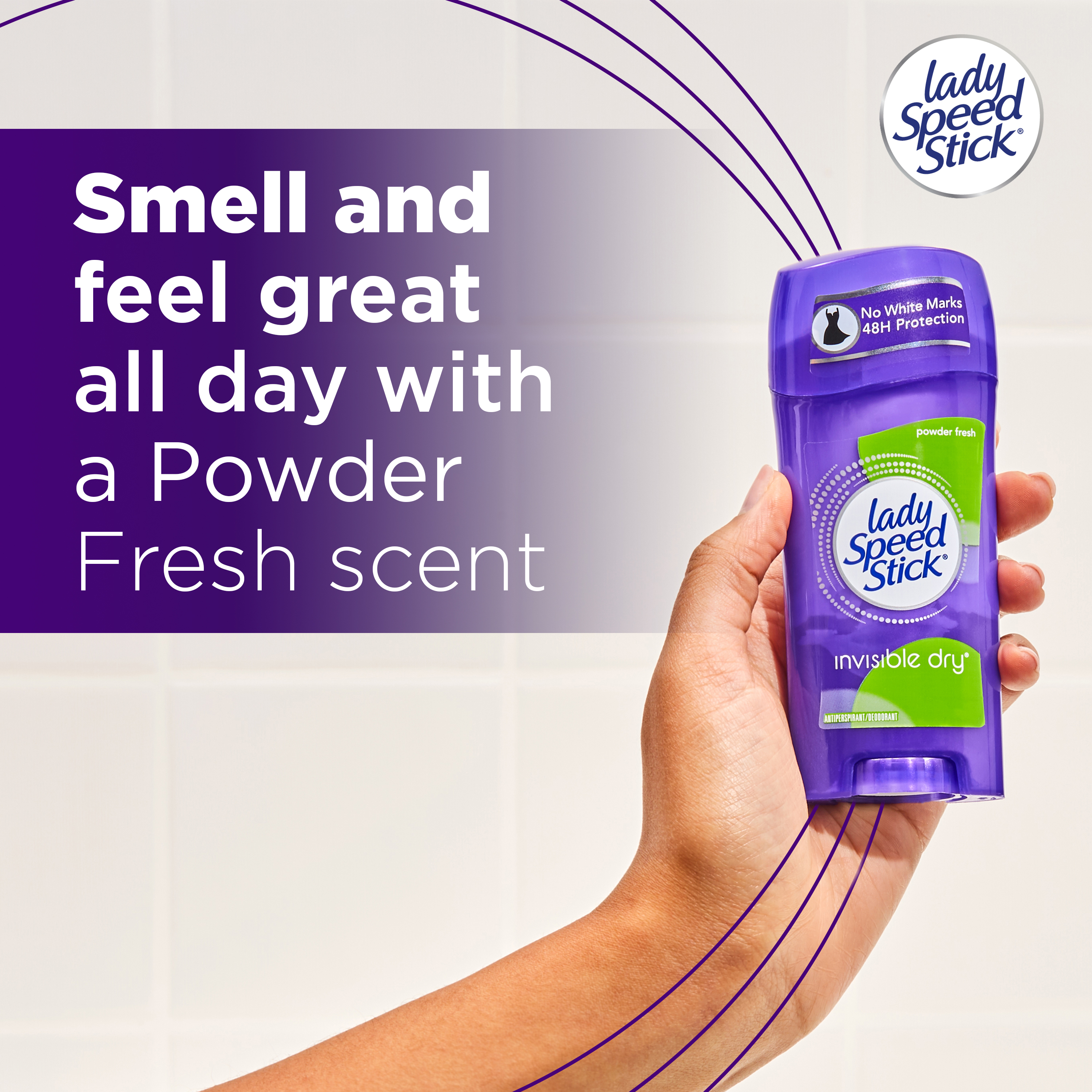SKU 196369 Consumer Unit - GTIN 00022200963695 Case - GTIN 10022200963692 Product Category Personal Care Product Sub Category AP > Deo Product Equity (Brand) Lady Speed Stick Product Sub Brand Lady Speed Stick Invisible Dry AP/Deo Product Title Lady Speed Stick Antiperspirant Deodorant for Women, 72 HR Sweat & Odor Protection, Invisible Dry, Powder Fresh Scent, 1.4 oz Stick Product Description Lady Speed Stick Antiperspirant Deodorant Stick is your trusted solution for all-day protection and confidence. Designed specifically for women, this antiperspirant delivers 72 HR sweat and odor protection, with a Powder Fresh scent that keeps you feeling dry and confident throughout your day. Engineered for comfort and control, the unique comfort guard applicator delivers a smooth, precise glide and even coverage every time. With invisible dry protection, Lady Speed Stick keeps you dry and confident without leaving messy residue, so you can focus on your day instead of worrying about sweat marks. Whether you’re conquering the office, hitting the gym, or heading out after hours, Lady Speed Stick keeps you covered with premium performance you can rely on. Elevate your grooming routine with antiperspirant deodorant protection that helps you feel confident in any situation with Lady Speed Stick deodorant for women. eCommerce Copy- Long Description Feel fresh, confident and unstoppable with Lady Speed Stick Invisible Dry Antiperspirant Deodorant stick. This Lady Speed Stick antiperspirant for women provides 48-hour odor and wetness protection for maximum confidence. Lady Speed Stick Invisible Dry Antiperspirant Deodorant is a solid stick with a sheer application that reduces underarm perspiration. The powerful fresh scent of this deodorant for women will help you smell great and feel confident all day. Lady Speed Stick Invisible Dry Antiperspirant Deodorant provides 48 hour odor and wetness protection so you can feel fresh and dry all day. These antiperspirants for women provide a sheer application and reduce underarm perspiration. Feel confident to take on the day. The Lady Speed Stick line of women’s deodorants and women’s antiperspirants come in a variety of scents and benefits. These include Invisible Dry, Power, Zero and Stainguard variants. Lady Speed Stick Invisible Dry antiperspirants provide a sheer application and reduce underarm wetness. Lady Speed Stick Power antiperspirants provide 48 hour odor and wetness protection. Lady Speed Stick Zero deodorants are free from aluminum, alcohol* and parabens so you can smell and feel great all day. Try them today to find the right deodorant and antiperspirant for you. Feel fresh, confident and unstoppable with Lady Speed Stick. * does not contain ethanol Lady Speed Stick deodorants and antiperspirants should only be applied directly underneath the arms. Remove the cap from the product. Turn the dial on the bottom clockwise to raise the deodorant or antiperspirant stick so that it is protruding from the container. Simply rub the deodorant or antiperspirant directly on the armpit and replace the cap. Bullet 1 Includes one 1.4 oz stick of Speed Stick Antiperspirant Deodorant For Women, Powder Fresh Scent Bullet 2 Experience a refreshing Powder Fresh scent that keeps you feeling clean and confident Bullet 3 Powered by long‑lasting antiperspirant protection, this solid stick delivers 72 hour sweat and odor protection Bullet 4 Enjoy invisible dry protection that lets you wear what you want, when you want, without concern about sweat marks Bullet 5 This women's antiperspirant includes a unique comfort guard applicator, ensuring a smooth application process Bullet 6 Reliable performance for gym sessions, busy workdays, and nights out—designed for women and ideal for active lifestyles Active Ingredients Aluminum Zirconium Tetrachlorohydrex GLY 15.4% Walmart RPC 412639334 Walmart URL (Computed) https://www.walmart.com/ip/a/412639334 CVS RPC 801588 Dollar Tree RPC 878617 Family Dollar RPC 2028365