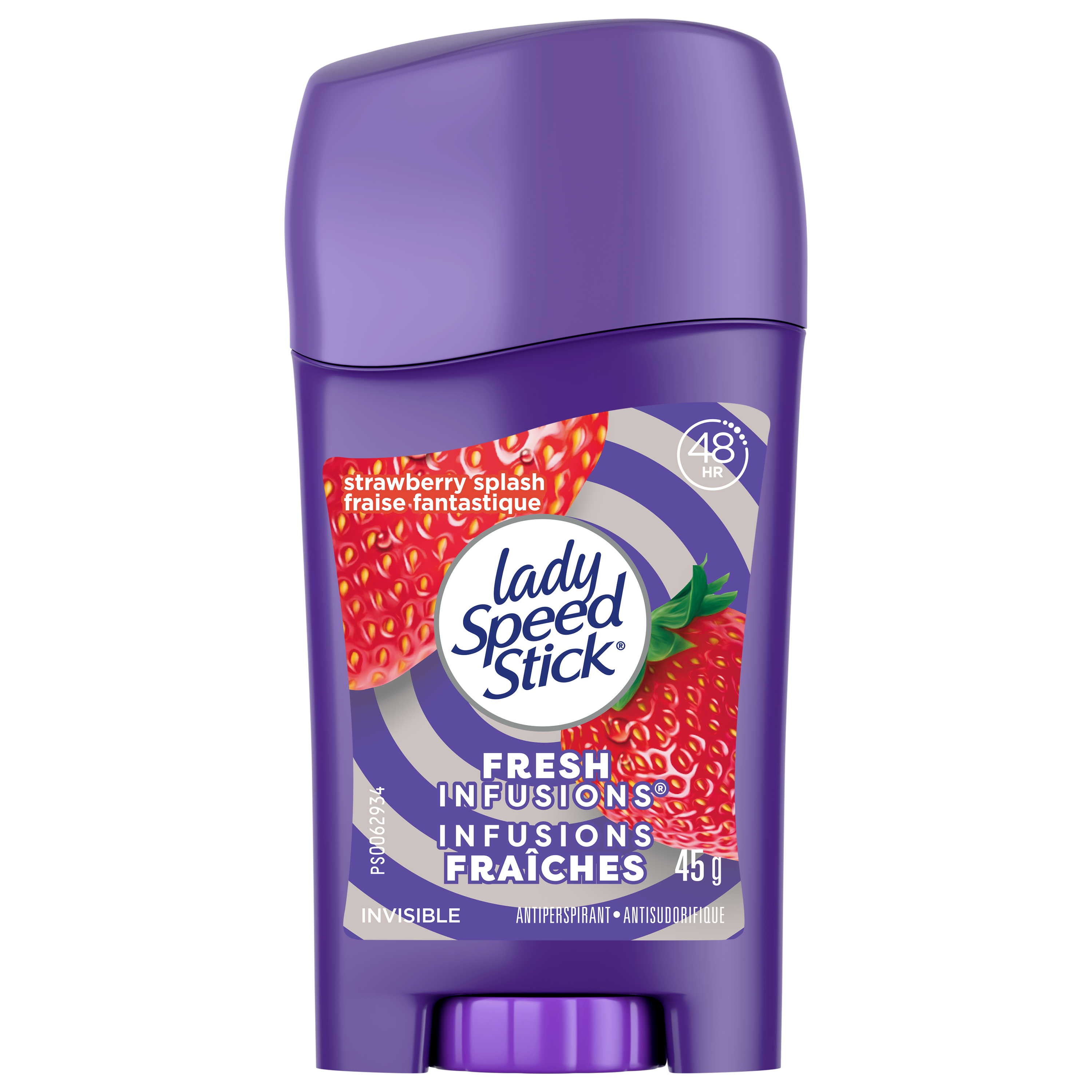 SKU 312522 Consumer Unit - GTIN 00058000006812 Case - GTIN 10058000006819 Product Category Personal Care Product Sub Category AP > Deo Product Equity (Brand) Lady Speed Stick Product Sub Brand Lady Speed Stick Fresh Infusion AP/Deo Product Title Lady Speed Stick Antiperspirant Deodorant, Fresh Infusions, Strawberry Splash, 45g Product Description Lady Speed Stick Antiperspirant Deodorant, Fresh Infusions Invisible Solid, helps you feel forever fresh with 48 hour protection and a burst of vibrant fragrance. This Antiperspirant Deodorant provides you with a 48 hour odour and wetness protection. This Antiperspirant Deodorant is invisible, so it goes on clear for added confidence. eCommerce Copy- Long Description Lady Speed Stick Antiperspirant Deodorant, Fresh Infusions Invisible Solid, helps you feel forever fresh with 48 hour protection and a burst of vibrant fragrance. This Antiperspirant Deodorant provides you with a 48 hour odour and wetness protection. This Antiperspirant Deodorant is invisible, so it goes on clear for added confidence. Bullet 1 Lady Speed Stick Antiperspirant Deodorant, Fresh Infusions Invisible Solid, helps you feel forever fresh with 48 hour protection and a burst of vibrant fragrance. Bullet 2 This Antiperspirant Deodorant provides you with a 48 hour odour and wetness protection. Bullet 3 This Antiperspirant Deodorant is invisible, so it goes on clear for added confidence.