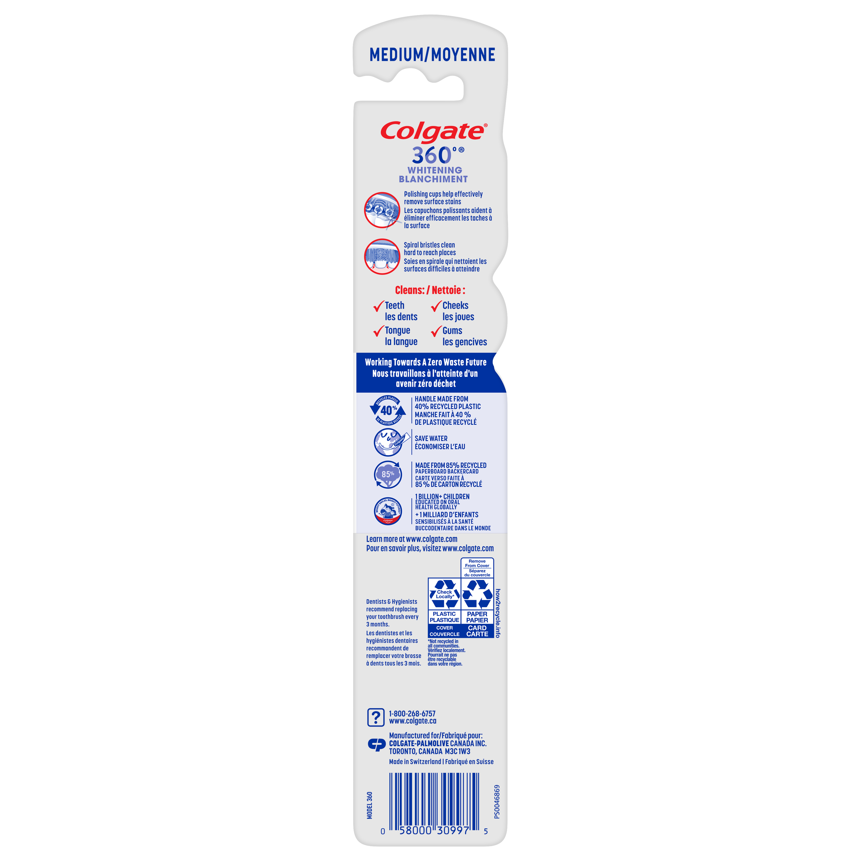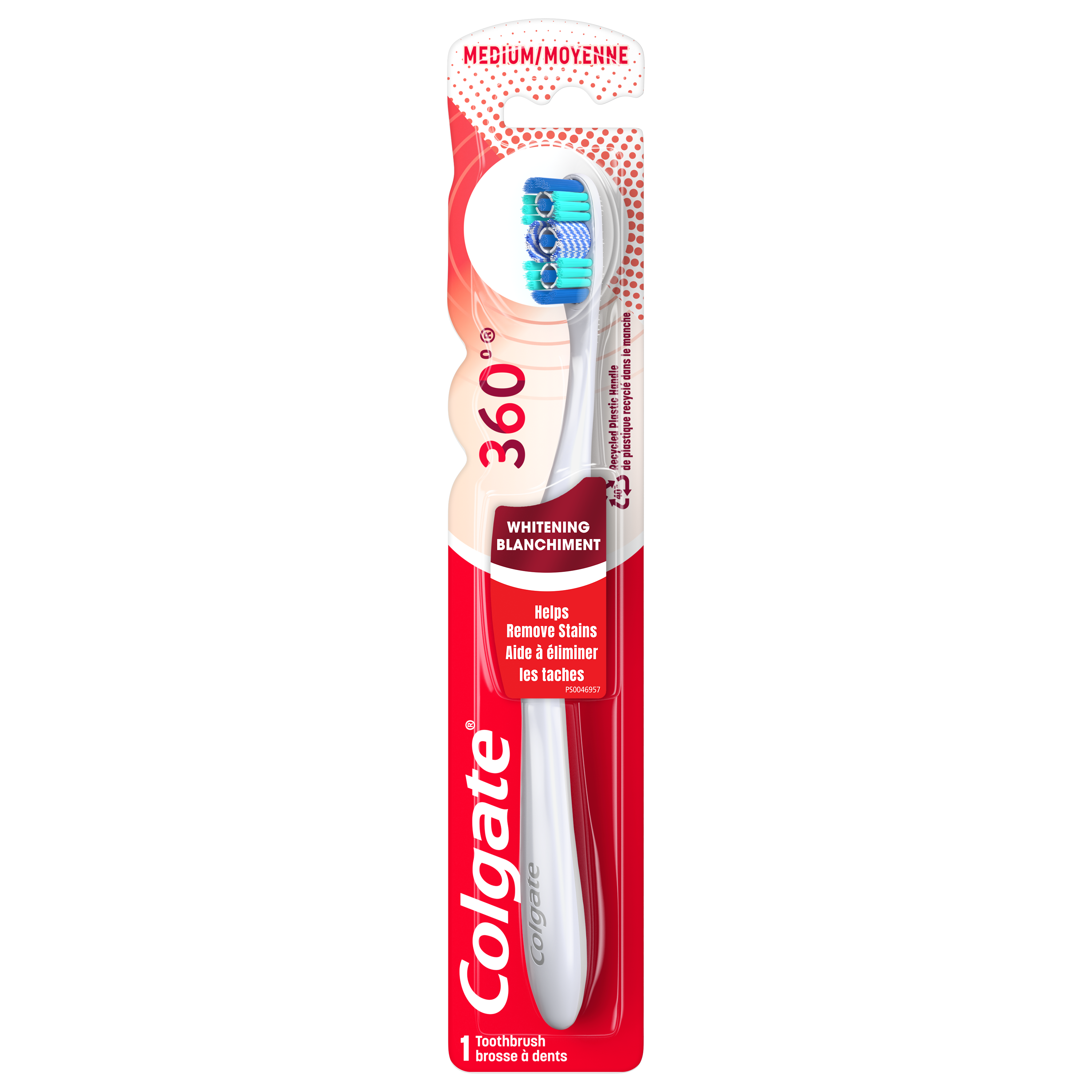 SKU 313119 Consumer Unit - GTIN 00058000309975 Case - GTIN 10058000309972 Product Category Oral Care Product Sub Category Manual TB Product Equity (Brand) Colgate Product Sub Brand Colgate 360 Man TB Product Title Colgate 36 Optic White Whitening Toothbrush, Medium Product Description The Colgate 36⁰ Optic White medium manual whitening toothbrush is designed with whitening cups that hold toothpaste to effectively help remove surface stains for a naturally white smile. The polishing spiral bristles help whiten teeth by polishing away surface stains and clean hard-to-reach areas. This toothbrush also features a unique cheek & tongue cleaner to comfortably remove odor-causing bacteria. eCommerce Copy- Long Description Colgate 360 Optic White Advanced Medium Adult Manual Toothbrush, 1 pk The Colgate 360 Optic White Advanced Medium Adult Manual Toothbrush, 1 pk is an adult manual toothbrush made for easy brushing. This soft toothbrush for adults is designed with whitening cups to remove teeth stains and special polishing soft bristles to whiten teeth. Plus, a unique tongue and cheek cleaner removes odor causing bacteria for a 360 toothbrushing experience! The 360 Teeth Brushing Experience The Colgate 360 Optic White Advanced Soft Adult Manual Toothbrush features multi-action, tooth-fitting polishing cups to remove surface stains. An ergonomic handle design fits comfortably in your hand while flexible finger grips help the adult manual toothbrush to stay in place; reducing slippage and allowing for more precise maneuvering as you brush your teeth. Healthy Smiles With Colgate At Colgate, we make products that promote healthy smiles. Not only because having a healthy smile is important to your overall health, but because when you have a healthy smile, you actually smile more – and that’s a powerful thing. Smiles are the simplest form of optimism, something we need now more than ever. That’s why we’re championing optimism – we are committed to creating a healthier planet and working every day to create healthy smiles for all. Everyone has the right to a bright smile. That’s why we’re committed to raising oral healthcare standards everywhere. Whether it’s building healthy new habits as kids or learning something new from the experts, we’re here for you. Bullet 1 Features Whitening Cups to Remove Teeth Stains Bullet 2 Spiral Polishing Bristles to Whiten Teeth Bullet 3 Ergonomic Handle Design for Maximum Comfort Bullet 4 Cleans Hard-to-Reach Places Bullet 5 Cheek and Tongue Cleaner to Remove Bad Breath Bacteria Bullet 6 Medium Bristles Bullet 7 For Optimal Teeth Whitening, use with Colgate Optic White Whitening Toothpaste Active Ingredients N/A