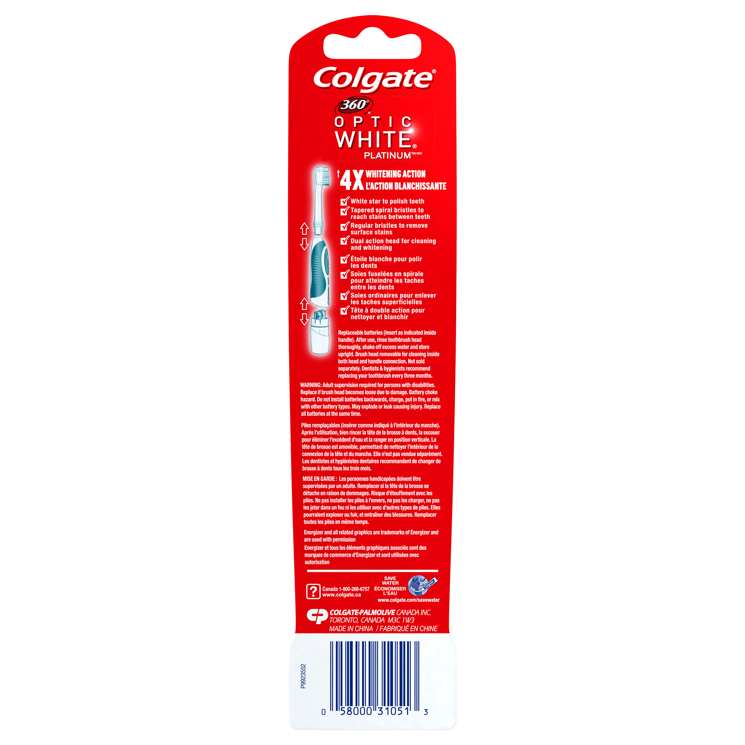 SKU 313202 Consumer Unit - GTIN 00058000310513 Case - GTIN 10058000310510 Product Category Oral Care Product Sub Category Battery TB Product Equity (Brand) Colgate Product Sub Brand Colgate 360 BTB Product Title Colgate 36 Optic White Battery Powered Toothbrush Handle, Soft Product Description Colgate 36 Optic White Toothbrush is no ordinary toothbrush. Specially designed to whiten teeth, Colgate 36 Optic White Toothbrush has whitening cups and polishing bristles that power away bacteria for a healthy whole mouth clean. The soft rubber whitening cups are designed to hold toothpaste more effectively and remove surface stains while the polishing bristles help whiten teeth by polishing away surface stains and cleaning hard-to-reach places. Additional features include a unique cheek and tongue cleaner that comfortably removes odor causing bacteria, textured soft gel handle that feels good while you brush, angled neck for better reach, and a wide thumbgrip area for better control. eCommerce Copy- Long Description Colgate 360 Optic White Toothbrush is no ordinary toothbrush. Specially designed to whiten teeth, Colgate 360 Optic White Toothbrush has whitening cups and polishing bristles that power away bacteria for a healthy whole mouth clean. The soft rubber whitening cups are designed to hold toothpaste more effectively and remove surface stains while the polishing bristles help whiten teeth by polishing away surface stains and cleaning hard-to-reach places. Additional features include a unique cheek and tongue cleaner that comfortably removes odor causing bacteria, textured soft gel handle that feels good while you brush, angled neck for better reach, and a wide thumbgrip area for better control.
