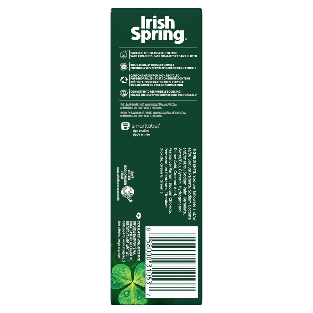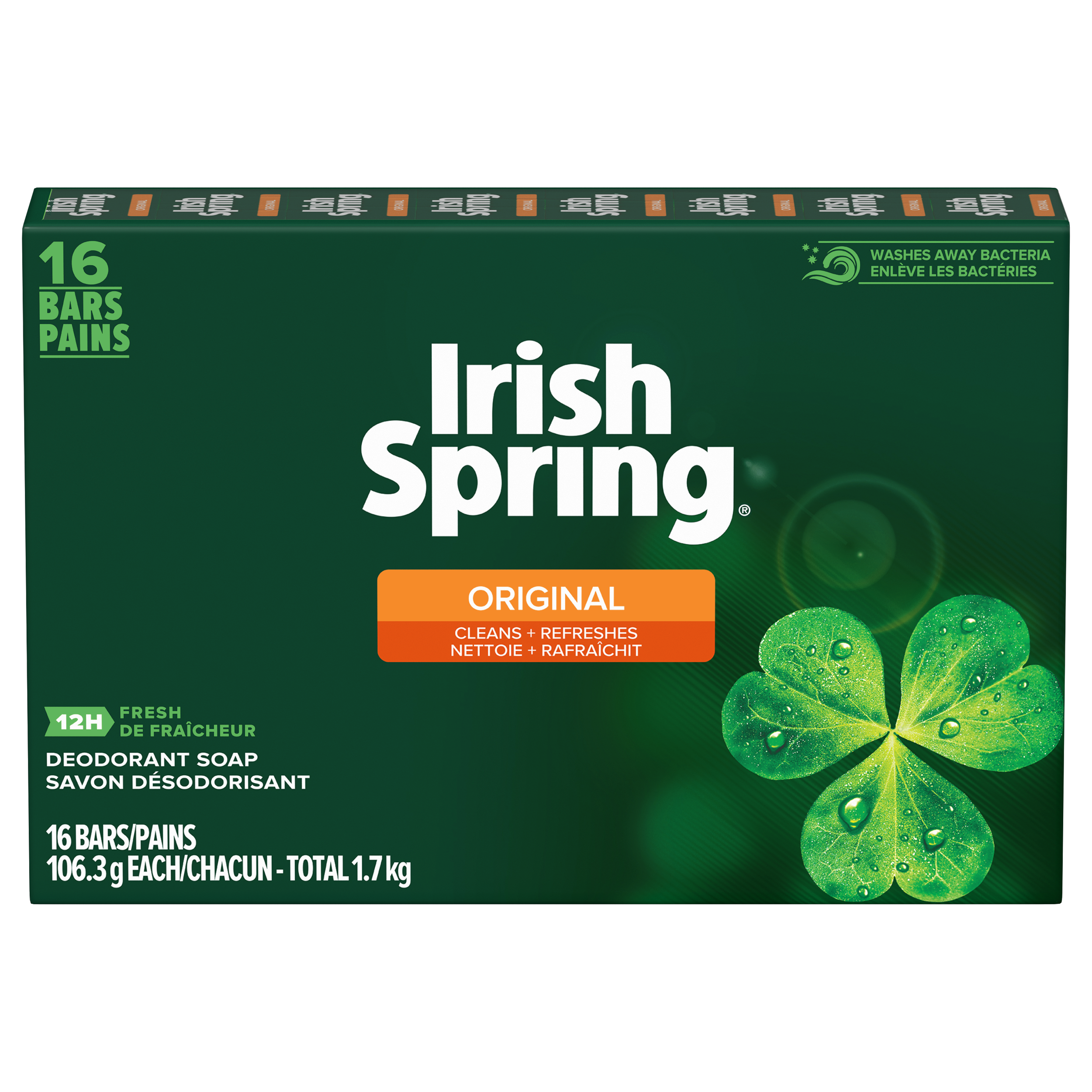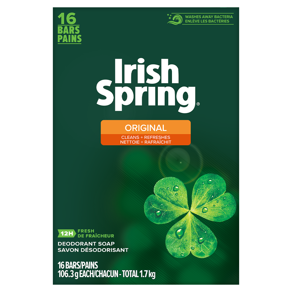 SKU 313210 Consumer Unit - GTIN 00058000310537 Case - GTIN 10058000310534 Product Category Personal Care Product Sub Category Bar Soap Product Equity (Brand) Irish Spring Product Sub Brand Irish Spring BS Product Title Irish Spring Original Mens Deodorant Bar Soap, Body and Hand Soap Bar Washes Away Bacteria, 16g, 16 Bars Product Description The one that started it all! Get that crisp, classic scent you love with Irish Spring Original Deodorant Bar Soap. Irish Spring Original Bar Soap delivers the gentle and caring formula you love, with a fresh, clean, and invigorating scent to leave you refreshed. Irish Spring Original Deodorant Bar Soap provides 12-hour deodorant protection, so you can feel fresh throughout the day. This bar soap washes away bacteria and can be used as a hand soap. It is paraben, phthalate and gluten free and made from a 98% naturally derived formula. eCommerce Copy- Long Description The one that started it all! Get that crisp, classic scent you love with Irish Spring Original Deodorant Bar Soap. Irish Spring Original Bar Soap delivers the gentle and caring formula you love, with a fresh, clean, and invigorating scent to leave you refreshed. Irish Spring Original Deodorant Bar Soap provides 12-hour deodorant protection, so you can feel fresh throughout the day. This bar soap washes away bacteria and can be used as a hand soap. It is paraben, phthalate and gluten free and made from a 98% naturally derived formula. Bullet 1 Deodorant soap bar with an invigorating scent and long lasting Irish Spring Original fragrance Bullet 2 12-hour deodorant protection lets you feel fresh throughout the day Bullet 3 Washes away bacteria and can be used to wash your hands if you run out of hand soap Bullet 4 Irish Spring Original Bar Soap is paraben, phthalate and gluten free and is made from a 98% naturally derived formula Bullet 5 12-hour deodorant protection lets you feel fresh throughout the day