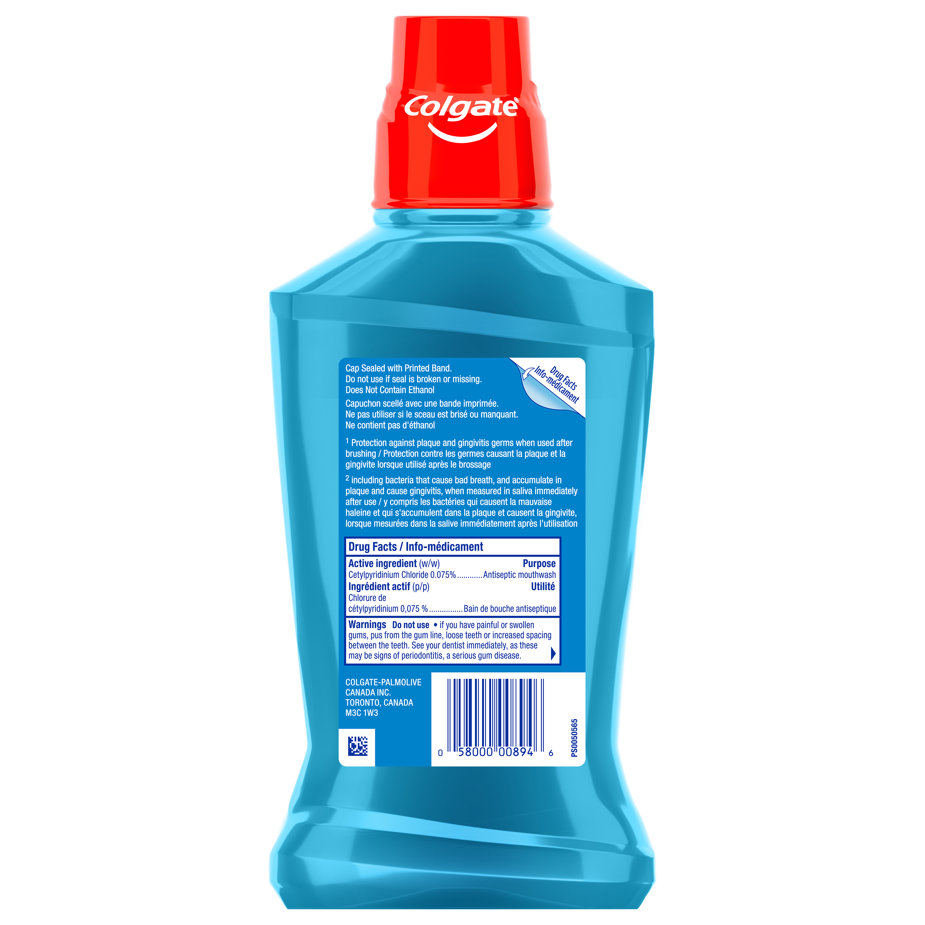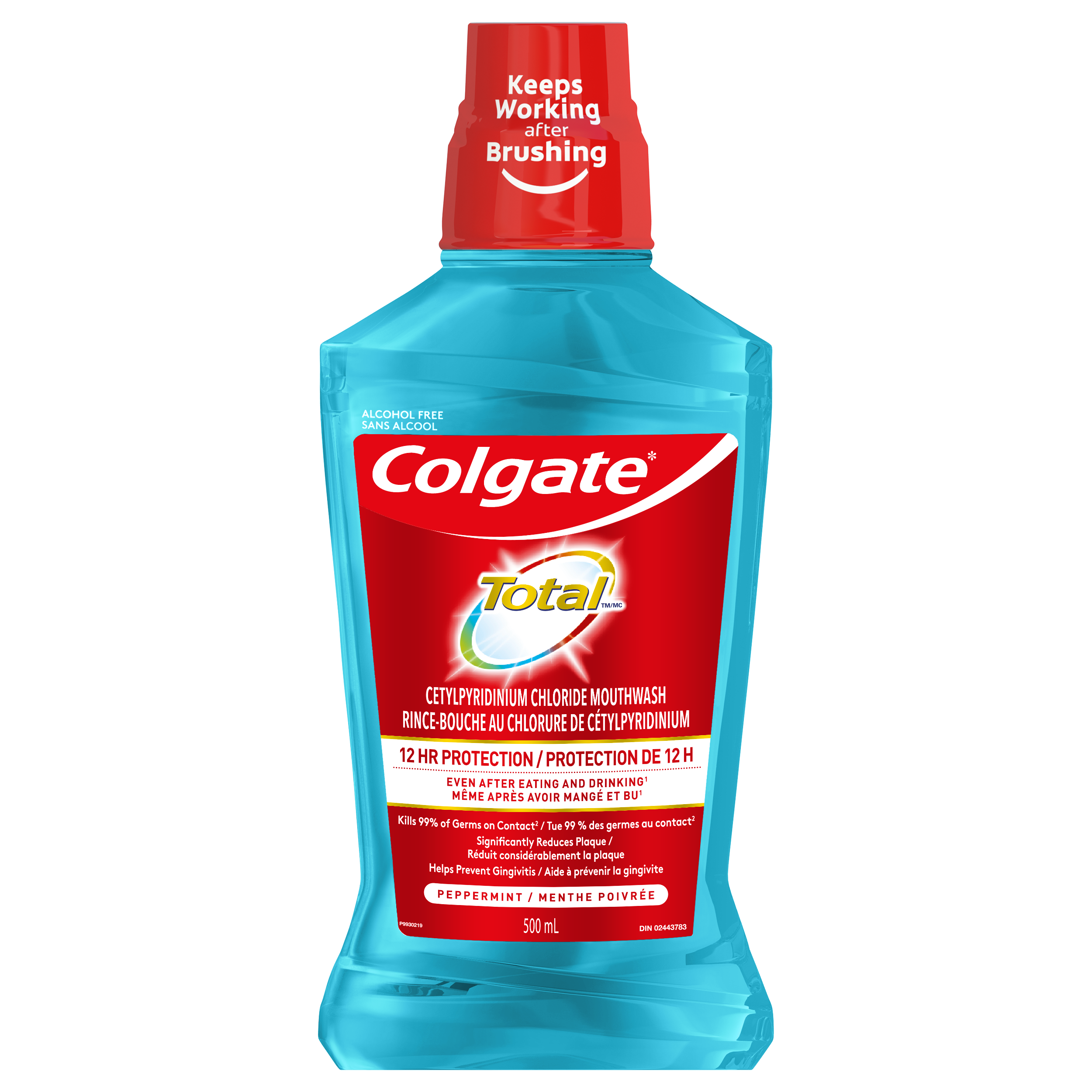SKU 313617 Consumer Unit - GTIN 00058000008946 Case - GTIN 10058000008943 Product Category Oral Care Product Sub Category Mouthwash Product Equity (Brand) Colgate Product Sub Brand Colgate Total MW Product Title Colgate Total Mouthwash, Peppermint - 5 mL Product Description Colgate Total mouthwash doesn't just freshen breath, it provides 12-hour protection against germs even after eating and drinking, helping to keep your mouth healthy and fresh. It kills 99% of germs on contact, significantly reduces plaque and helps prevent the gum disease gingitivis. This mouthwash formula is alcohol-free (does not contain ethanol) and has a refreshing Peppermint Blast flavor. eCommerce Copy- Long Description Colgate Total mouthwash doesn't just freshen breath, it provides 12-hour protection against germs even after eating and drinking, helping to keep your mouth healthy and fresh. It kills 99% of germs on contact, significantly reduces plaque and helps prevent the gum disease gingitivis. This mouthwash formula is alcohol-free (does not contain ethanol) and has a refreshing Peppermint Blast flavor. Bullet 1 12-hour protection against germs even after drinking and eating Bullet 2 Kills 99% of germs on contact Bullet 3 Significantly reduces plaque Bullet 4 Helps prevent gingivitis Bullet 5 Alcohol-free*. *Does not contain ethanol. Bullet 6 Gluten-free Bullet 7 1. Data on fi le. Colgate-Palmolive Company. May 2013. 2. Data on fi le. Colgate-Palmolive Company. Results of a 6-Week Plaque and Gingivitis Clinical Study in Puerto Rico. Results of a 6-Week Plaque and Gingivitis Clinical Study in Dominican Republic. December 2012. Active Ingredients Active Ingredient: Cetylpyridinium Chloride (0.075%). Purpose: Antigingivitis/Antiplaque