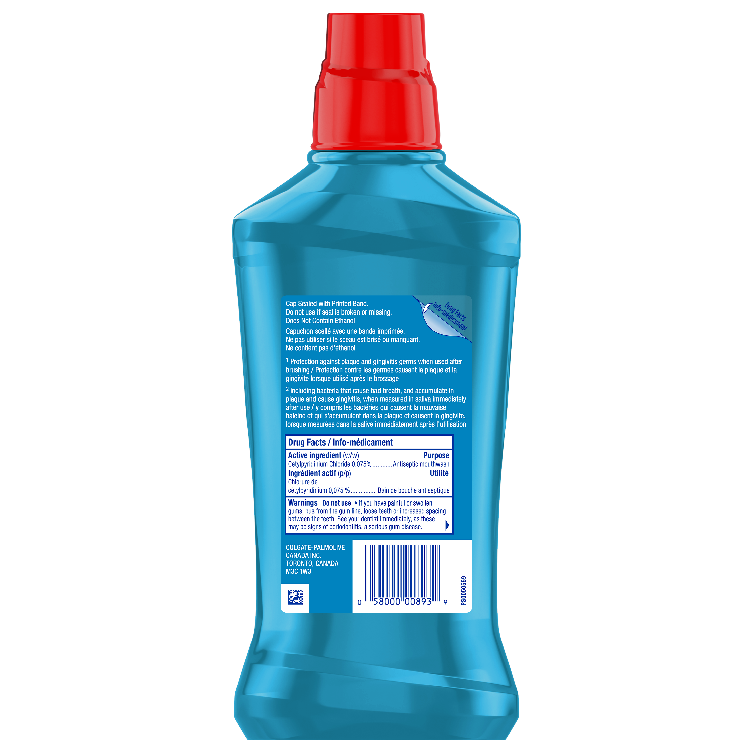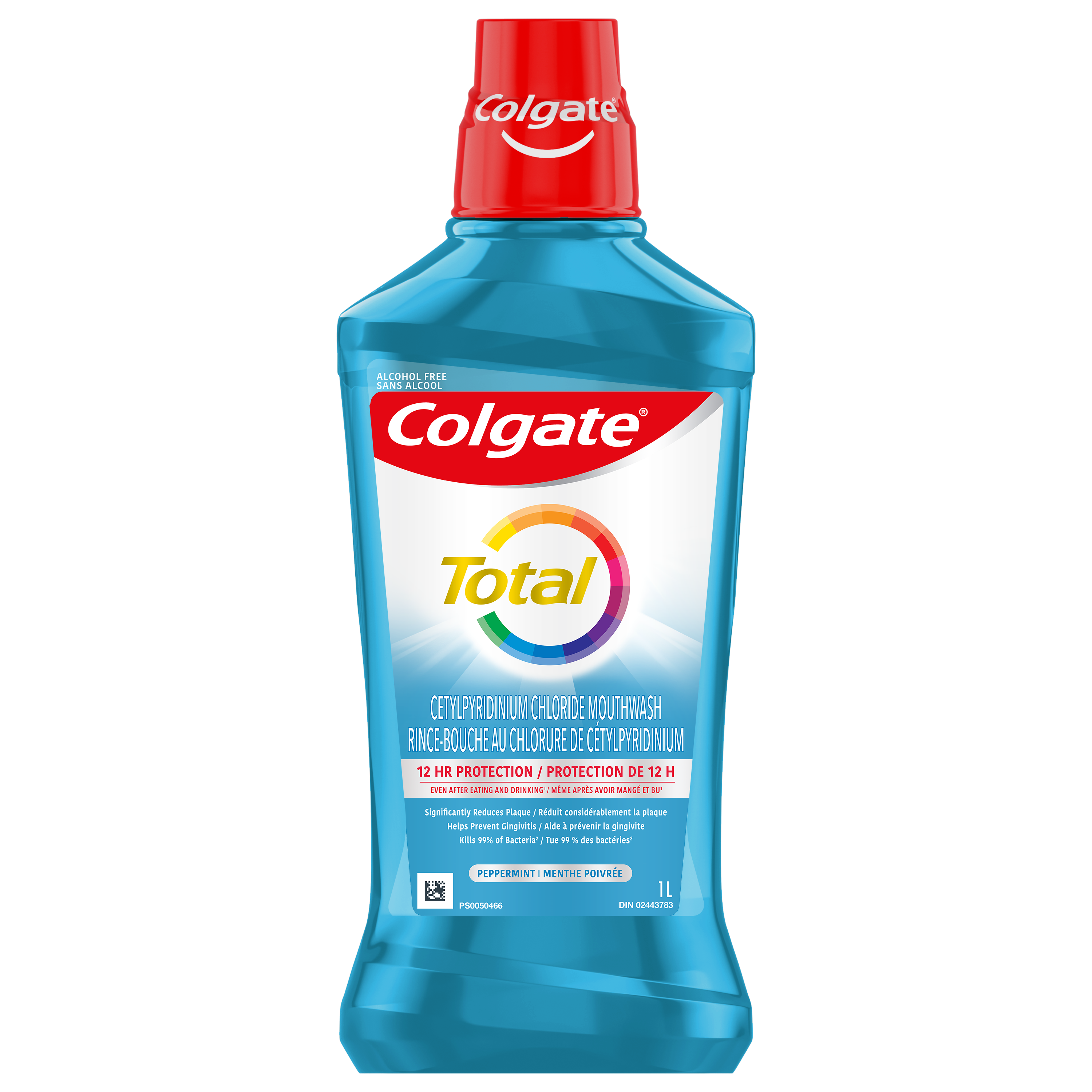 SKU 313928 Consumer Unit - GTIN 00058000008939 Case - GTIN 10058000008936 Product Category Oral Care Product Sub Category Mouthwash Product Equity (Brand) Colgate Product Sub Brand Colgate Total MW Product Title Colgate Total 12HR Pro-Shield Mouthwash Peppermint Blast, 1L Product Description Colgate Total mouthwash doesn't just freshen breath, it provides 12-hour protection against germs even after eating and drinking, helping to keep your mouth healthy and fresh. It kills 99% of germs on contact, significantly reduces plaque and helps prevent the gum disease gingitivis. This mouthwash formula is alcohol-free (does not contain ethanol) and has a refreshing Peppermint Blast flavor. eCommerce Copy- Long Description Colgate Total mouthwash doesn't just freshen breath, it provides 12-hour protection against germs even after eating and drinking, helping to keep your mouth healthy and fresh. It kills 99% of germs on contact, significantly reduces plaque and helps prevent the gum disease gingitivis. This mouthwash formula is alcohol-free (does not contain ethanol) and has a refreshing Peppermint Blast flavor. Bullet 1 12-hour protection against germs even after drinking and eating Bullet 2 Kills 99% of germs on contact Bullet 3 Significantly reduces plaque Bullet 4 Helps prevent gingivitis Bullet 5 Alcohol-free*. *Does not contain ethanol. Bullet 6 Gluten-free Bullet 7 1. Data on fi le. Colgate-Palmolive Company. May 2013. 2. Data on fi le. Colgate-Palmolive Company. Results of a 6-Week Plaque and Gingivitis Clinical Study in Puerto Rico. Results of a 6-Week Plaque and Gingivitis Clinical Study in Dominican Republic. December 2012. Active Ingredients Active Ingredient: Cetylpyridinium Chloride (0.075%). Purpose: Antigingivitis/Antiplaque