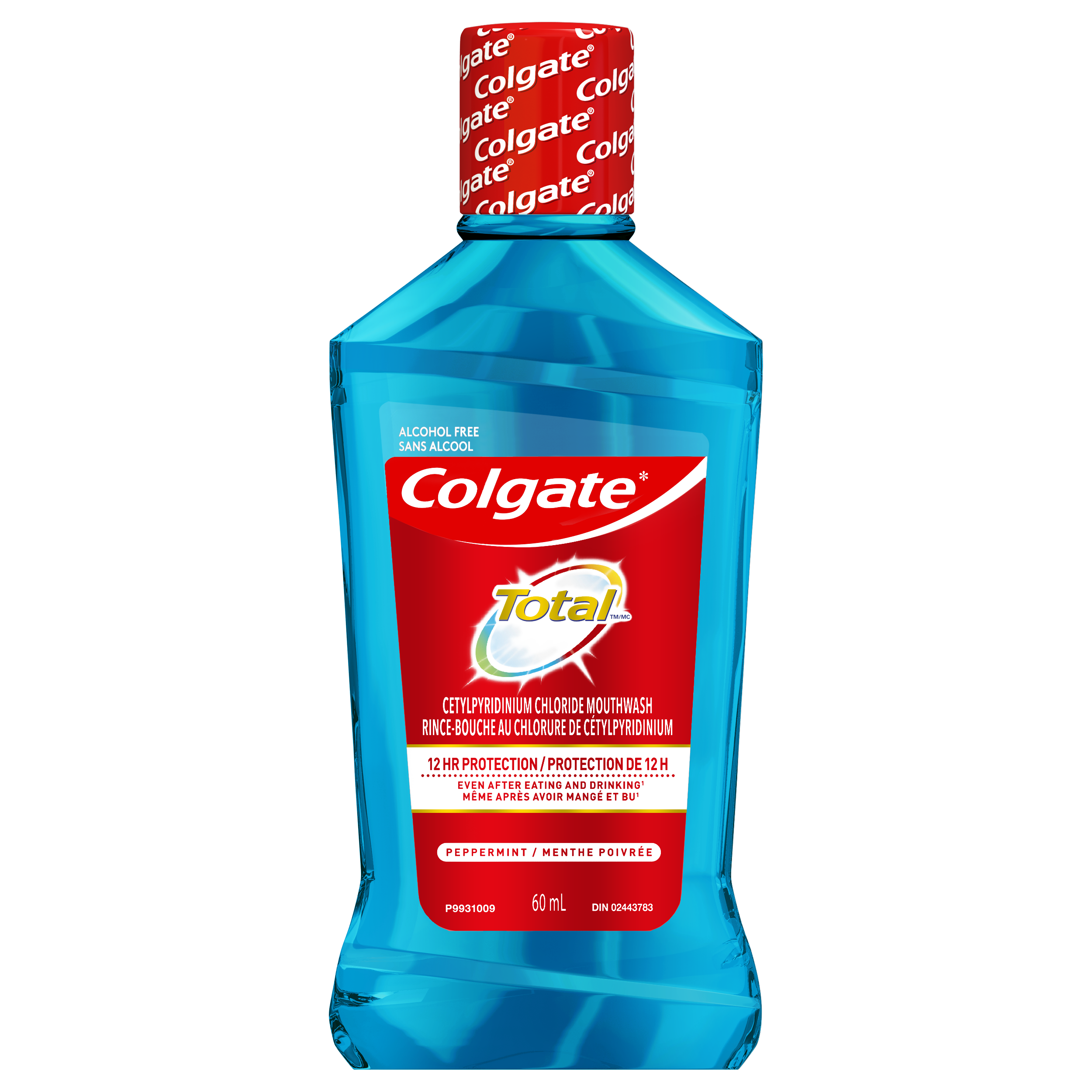 SKU 313931 Consumer Unit - GTIN 00058000008984 Case - GTIN 10058000008981 Product Category Oral Care Product Sub Category Mouthwash Product Equity (Brand) Colgate Product Sub Brand Colgate Total MW Product Title Colgate Total Mouthwash, Peppermint - 6 mL Product Description Colgate Total mouthwash doesn't just freshen breath, it provides 12-hour protection against germs even after eating and drinking, helping to keep your mouth healthy and fresh. It kills 99% of germs on contact, significantly reduces plaque and helps prevent the gum disease gingitivis. This mouthwash formula is alcohol-free (does not contain ethanol) and has a refreshing Peppermint Blast flavor. Bullet 1 12-hour protection against germs even after drinking and eating Bullet 2 Kills 99% of germs on contact Bullet 3 Significantly reduces plaque Bullet 4 Helps prevent gingivitis Bullet 5 Alcohol-free*. *Does not contain ethanol. Bullet 6 Gluten-free Bullet 7 1. Data on fi le. Colgate-Palmolive Company. May 2013. 2. Data on fi le. Colgate-Palmolive Company. Results of a 6-Week Plaque and Gingivitis Clinical Study in Puerto Rico. Results of a 6-Week Plaque and Gingivitis Clinical Study in Dominican Republic. December 2012. Active Ingredients Active Ingredient: Cetylpyridinium Chloride (0.075%). Purpose: Antigingivitis/Antiplaque