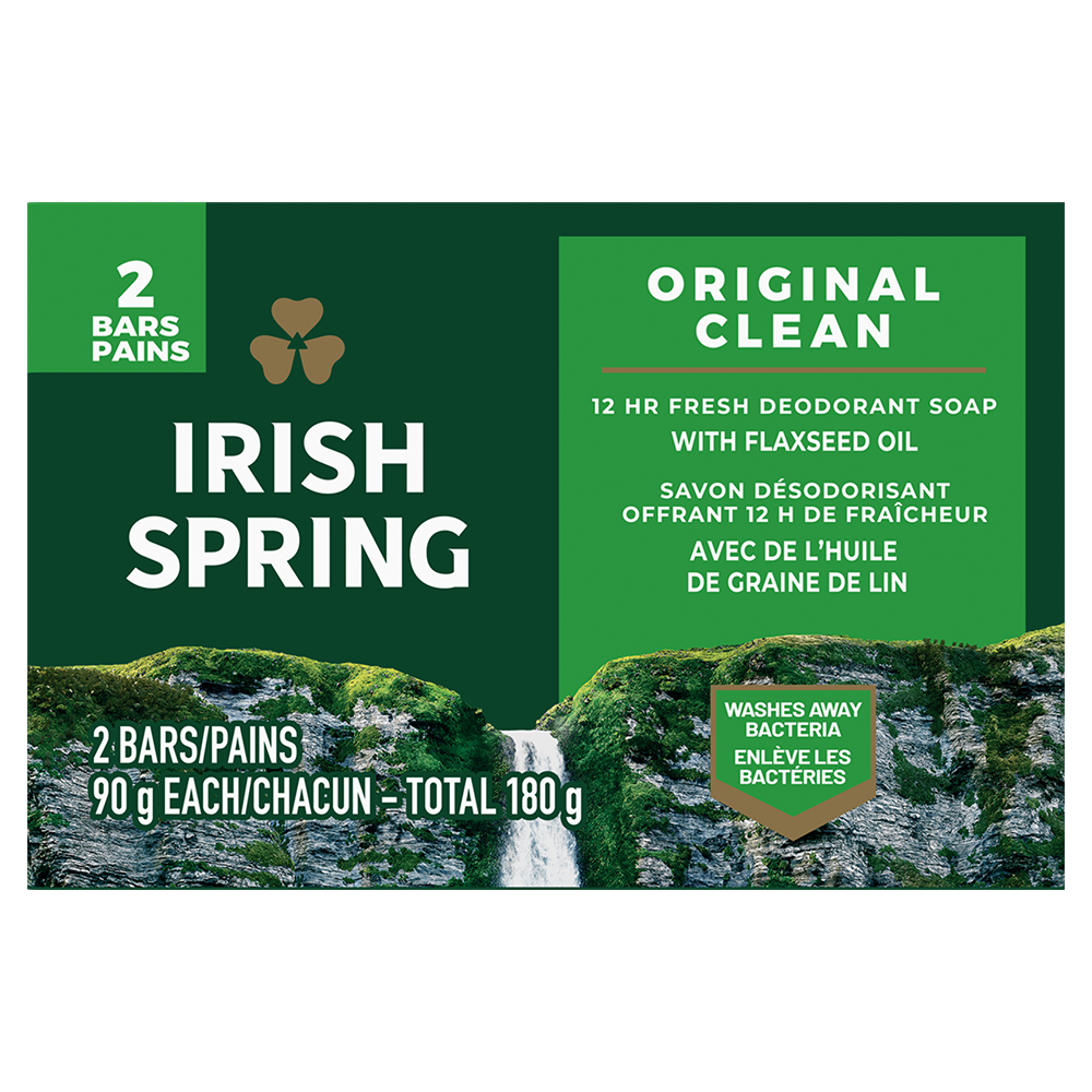 SKU 320101 Consumer Unit - GTIN 00058000302211 Case - GTIN 10058000302218 Product Category Personal Care Product Sub Category Bar Soap Product Equity (Brand) Irish Spring Product Sub Brand Irish Spring BS Product Title Irish Spring Original Mens Deodorant Bar Soap, Body and Hand Soap Bar Washes Away Bacteria, 9g, 2 Bars Product Description The one that started it all! Get that crisp, classic scent you love with Irish Spring Original Deodorant Bar Soap. Irish Spring Original Bar Soap delivers the gentle and caring formula you love, with a fresh, clean, and invigorating scent to leave you refreshed. Irish Spring Original Deodorant Bar Soap provides 12-hour deodorant protection, so you can feel fresh throughout the day. This bar soap washes away bacteria and can be used as a hand soap. It is paraben, phthalate and gluten free and made from a 98% naturally derived formula. eCommerce Copy- Long Description The one that started it all! Get that crisp, classic scent you love with Irish Spring Original Deodorant Bar Soap. Irish Spring Original Bar Soap delivers the gentle and caring formula you love, with a fresh, clean, and invigorating scent to leave you refreshed. Irish Spring Original Deodorant Bar Soap provides 12-hour deodorant protection, so you can feel fresh throughout the day. This bar soap washes away bacteria and can be used as a hand soap. It is paraben, phthalate and gluten free and made from a 98% naturally derived formula. Bullet 1 Deodorant soap bar with an invigorating scent and long lasting Irish Spring Original fragrance Bullet 2 12-hour deodorant protection lets you feel fresh throughout the day Bullet 3 Washes away bacteria and can be used to wash your hands if you run out of hand soap Bullet 4 Irish Spring Original Bar Soap is paraben, phthalate and gluten free and is made from a 98% naturally derived formula Bullet 5 12-hour deodorant protection lets you feel fresh throughout the day