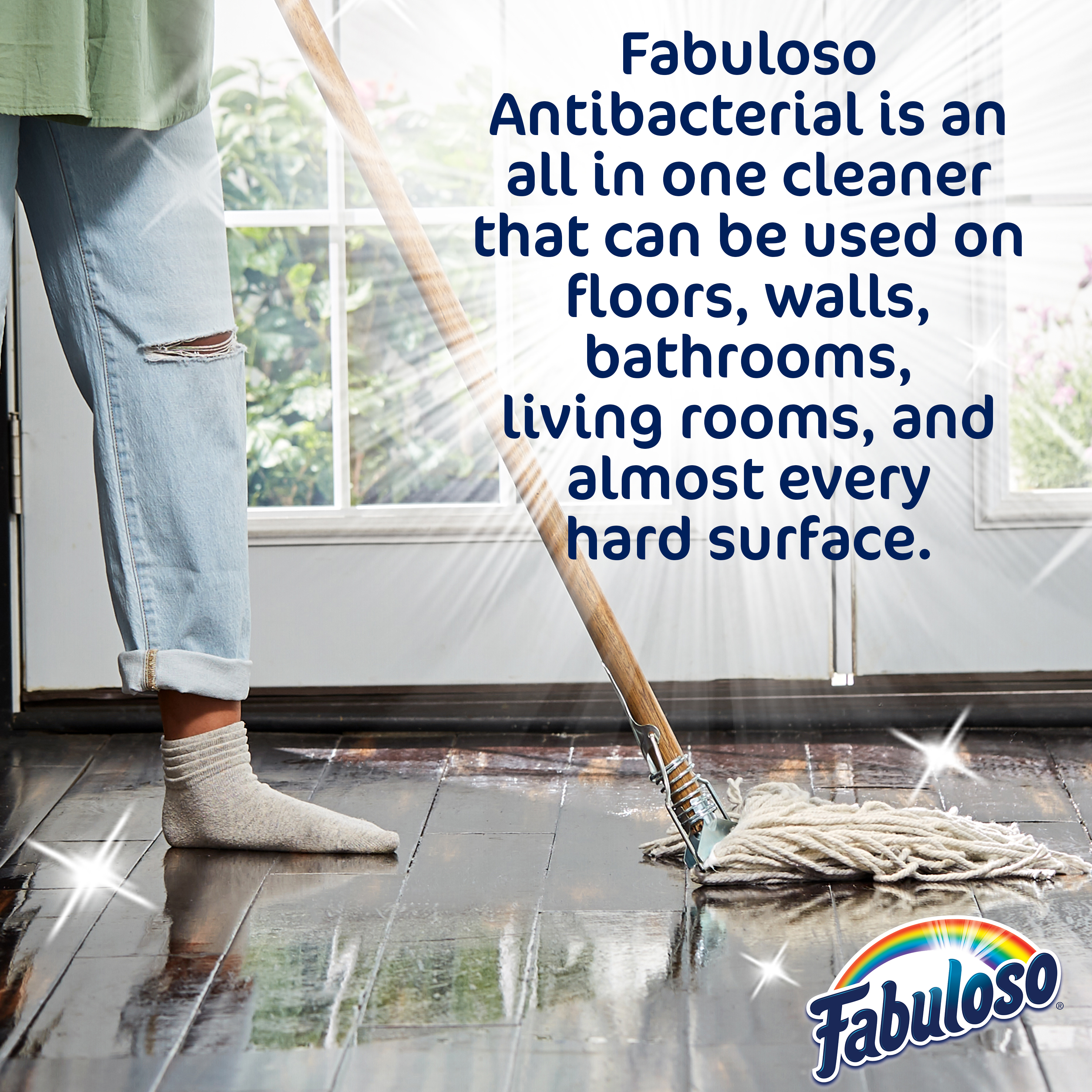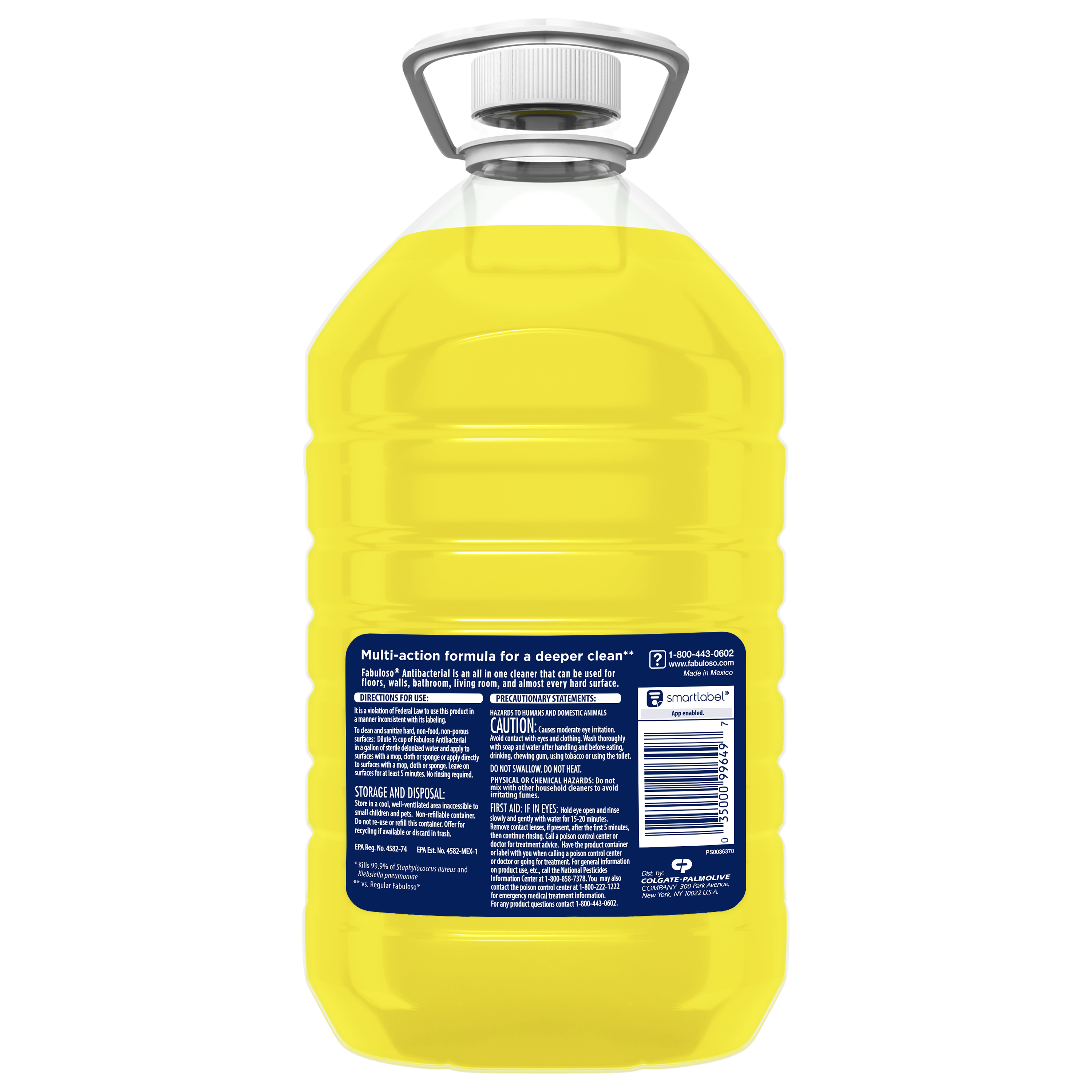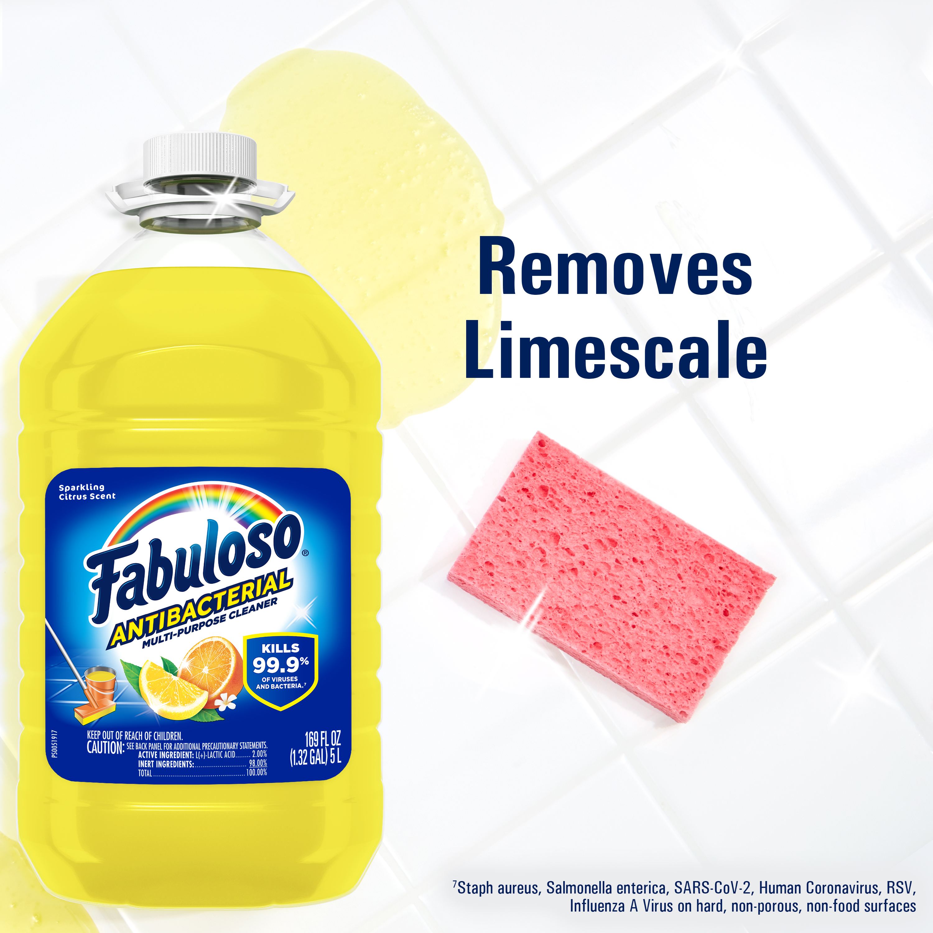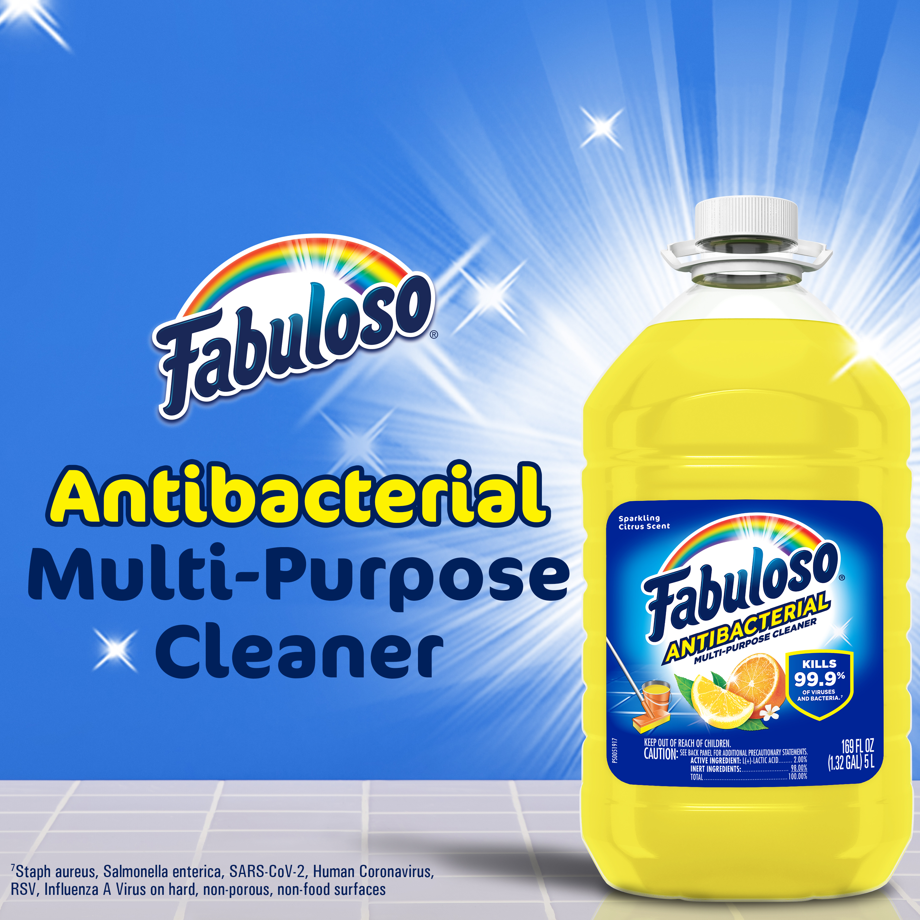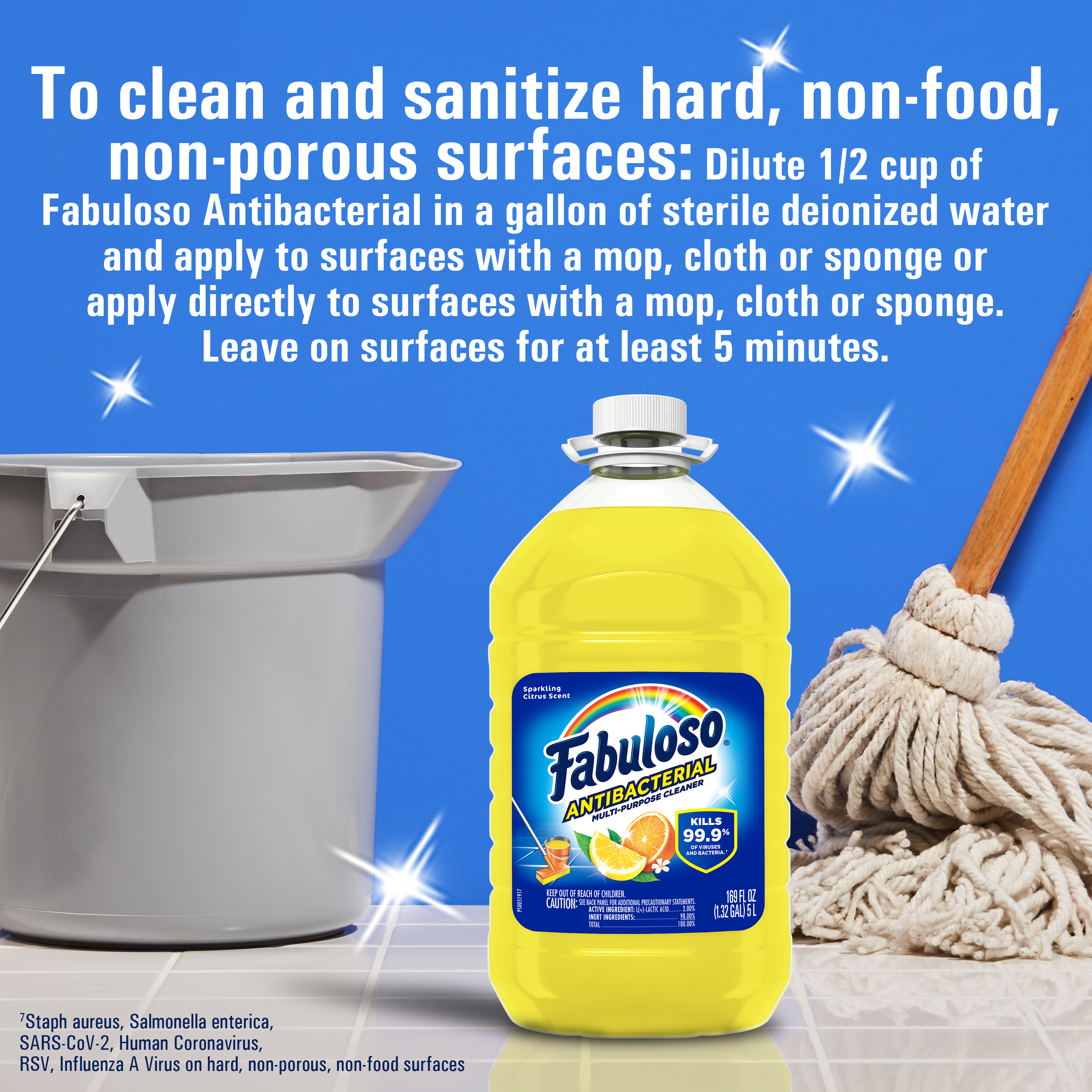 | Product Description | Fabuloso Antibacterial multi-purpose cleaner cuts through grease and removes limescale. It also kills 99.9% of viruses and bacteria (7). Fabuloso Antibacterial is an all in one cleaner that can be used on floors, walls, bathrooms, living rooms, and almost every hard surface. For visibly soiled surfaces, preclean surfaces before sanitizing or disinfecting. To clean and sanitize hard, non-food, non-porous surfaces: Dilute 1/2 cup of Fabuloso Antibacterial in a gallon of sterile deionized water and apply to surfaces with a mop, cloth or sponge or apply directly to surfaces with a mop, cloth or sponge. Leave on surfaces for at least 5 minutes. No rinsing required. To clean and disinfect hard, non-food, non-porous surfaces: Dilute 1 part Fabuloso Antibacterial with equal parts tap water and apply to surfaces by sprayer. Spray 6-8 inches from the surface with 4 pumps or until visibly wet. Leave on surfaces for at least 10 minutes. Wipe with a cloth or sponge. Repeat as necessary. And let's not forget the unmistakable fragrance that fills your space with the citrus scent. Experience the power of cleanliness with every wipe!