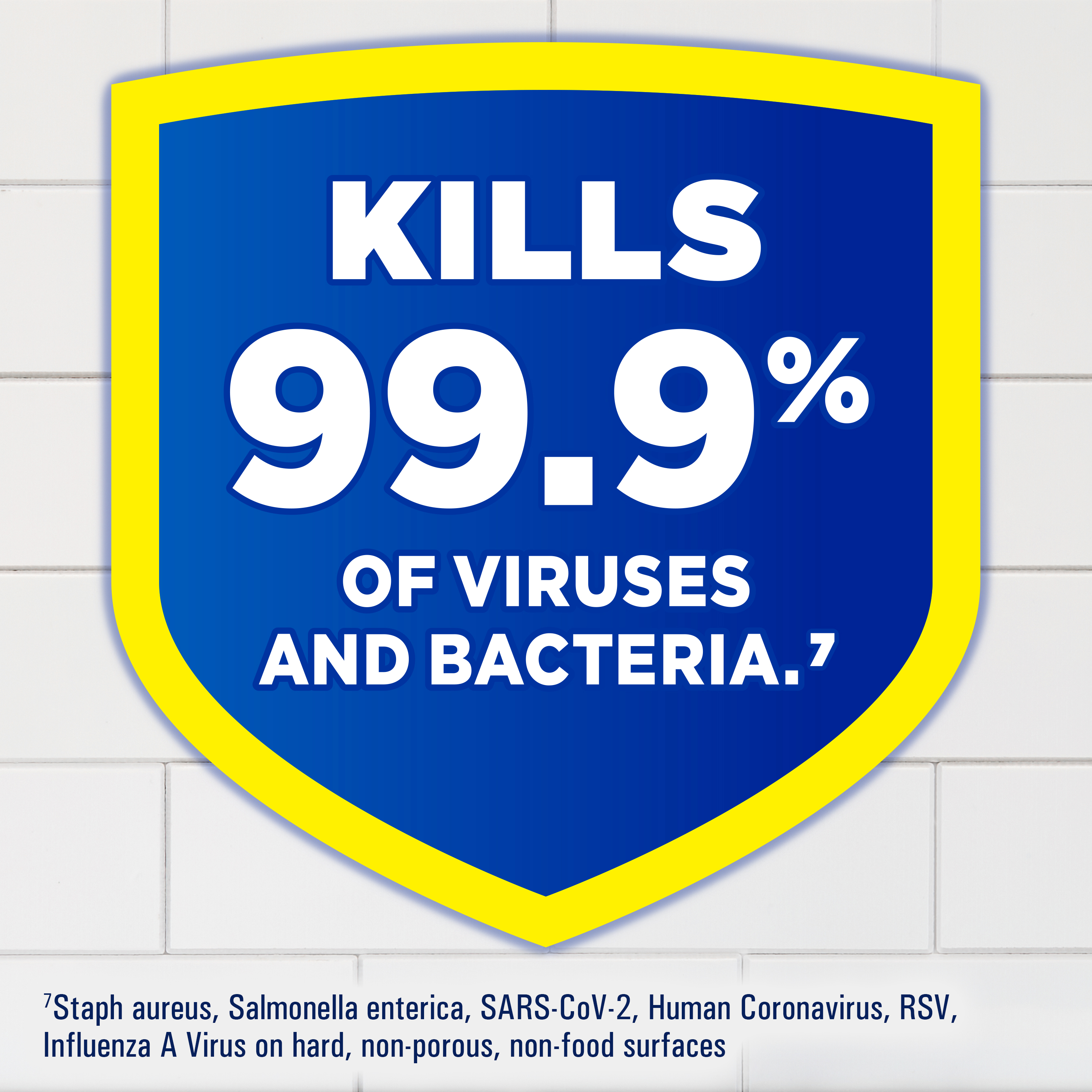 | Bullet 2 | Kills 99.9% of viruses and bacteria (7) and leaves surfaces clean and disinfected |