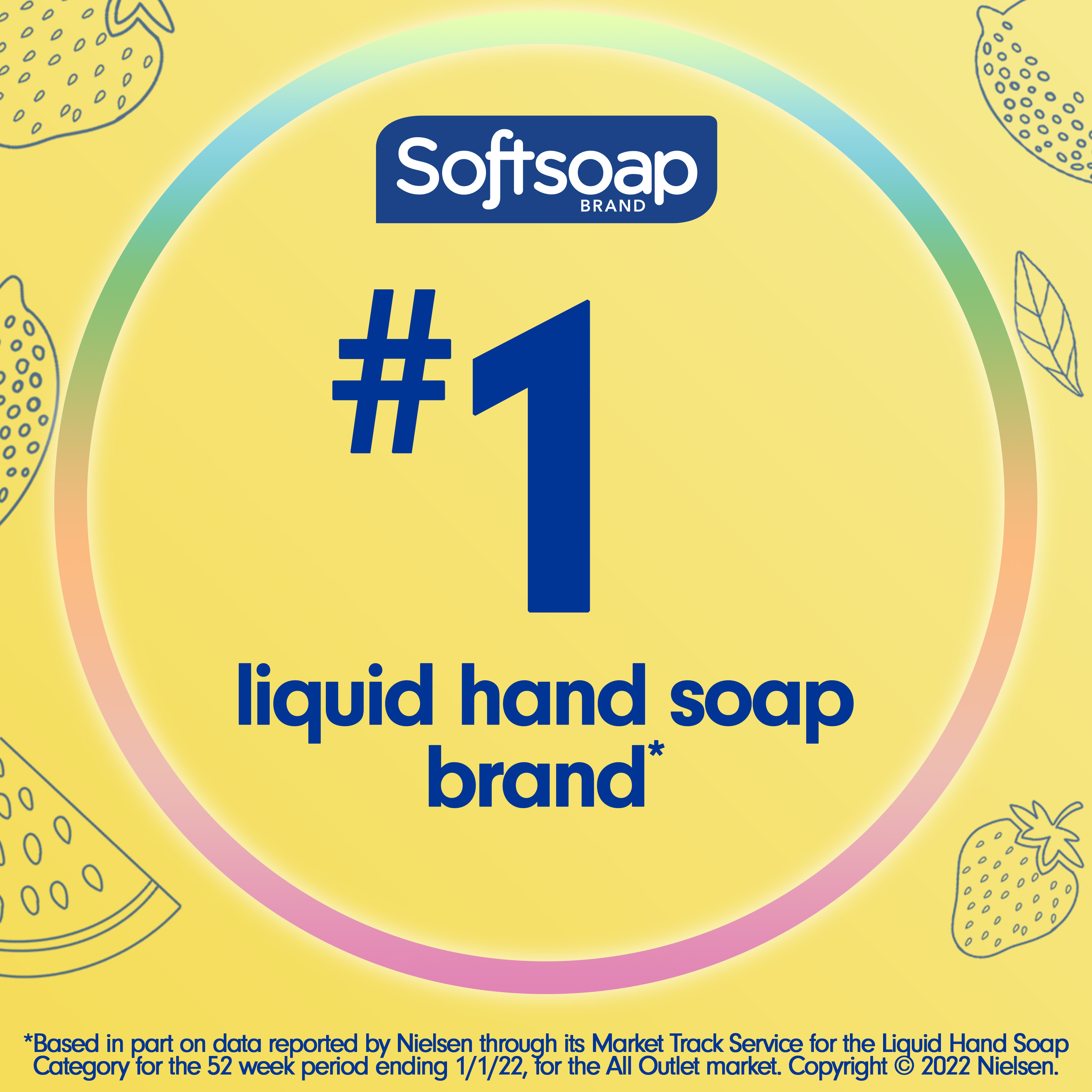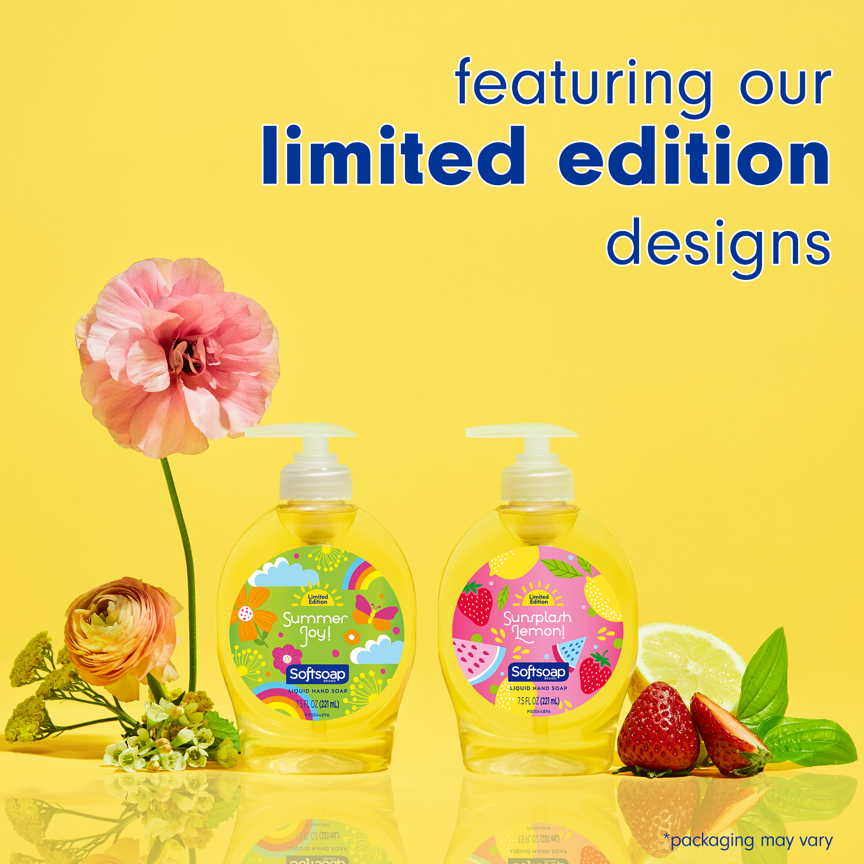 SKU 61011637 Consumer Unit - GTIN 00035000989642 Case - GTIN 10035000989649 Product Category Personal Care Product Sub Category Liquid Hand Wash Product Equity (Brand) Softsoap Product Sub Brand Softsoap LHW Product Title Softsoap Limited Edition Sunsplash Lemon / Summer Joy Liquid Hand Soap, 7.5oz Product Description Softsoap Limited Edition Summer Liquid Hand Soap Bottle The number 1 liquid hand soap brand (1). Softsoap Limited Edition Liquid Hand Soap offers a refreshing and joyful summer scent. Limited Edition Seasonal Soaps This limited edition seasonal soap pack is inspired by the joy and fun of summer. The bright and cheerful summer liquid hand soap packaging is adorned with colorful fruit and calming nature scenes, reminding you of lazy summer days. With a delightfully refreshing design, this liquid hand soap is sure to spark joy and brighten up your day whether you use them as a kitchen hand soap or in the bathroom. Wash Away Bacteria It’s the perfect bathroom soap to wash away bacteria (2) and enjoy the summer season! Our dermatologist tested hand soap formula helps skin to retain its natural moisture, and is paraben-free and formulated without phthalates. Health care agencies recommend washing hands with soap and clean running water for 20 seconds to wash away dirt and bacteria. Versatility Bring seasonal joy to your sink! This refreshing liquid hand soap is perfect for the kitchen, bathroom, or anywhere else you want to add a touch of summer to your routine. So why not treat yourself to our limited edition liquid hand soap and enjoy the season to the fullest? Stock up now while supplies last and bring a little bit of summer fun into your daily routine! (1) Based in part on data reported by Nielsen through its Market Track Service for the Liquid Hand Soap Category for the 52 week period ending 07/01/23, for the All Outlet market. Copyright © 2023 Nielsen. (2) Health care agencies recommend washing hands with soap and clean running water for 20 seconds to wash away dirt and bacteria. eCommerce Copy- Long Description Softsoap Limited Edition Liquid Hand Soap, brings seasonal joy to your sink and washes away bacteria. Softsoap is America's #1 Liquid Hand Soap brand, trusted to clean your hands since 1975. Bullet 1 The Number 1 Liquid Hand Soap Brand (1) Bullet 2 Limited Edition Liquid Hand Soap Bullet 3 Refreshing summer scent sparks joy and brightens your day Bullet 4 Dermatologist tested hand soap formula helps skin to retain its natural moisture Bullet 5 Paraben-free and formulated without phthalates Bullet 6 Health care agencies recommend washing hands with soap and clean running water for 20 seconds to wash away dirt and bacteria Bullet 7 Versatile liquid hand wash soap for kitchen, bathroom or any other space that needs a touch of summer fun Bullet 8 *Based in part on data reported by Nielsen through its Market Track Service for the Liquid Hand Soap Category for the 52 week period ending 07/01/23, for the All Outlet market.