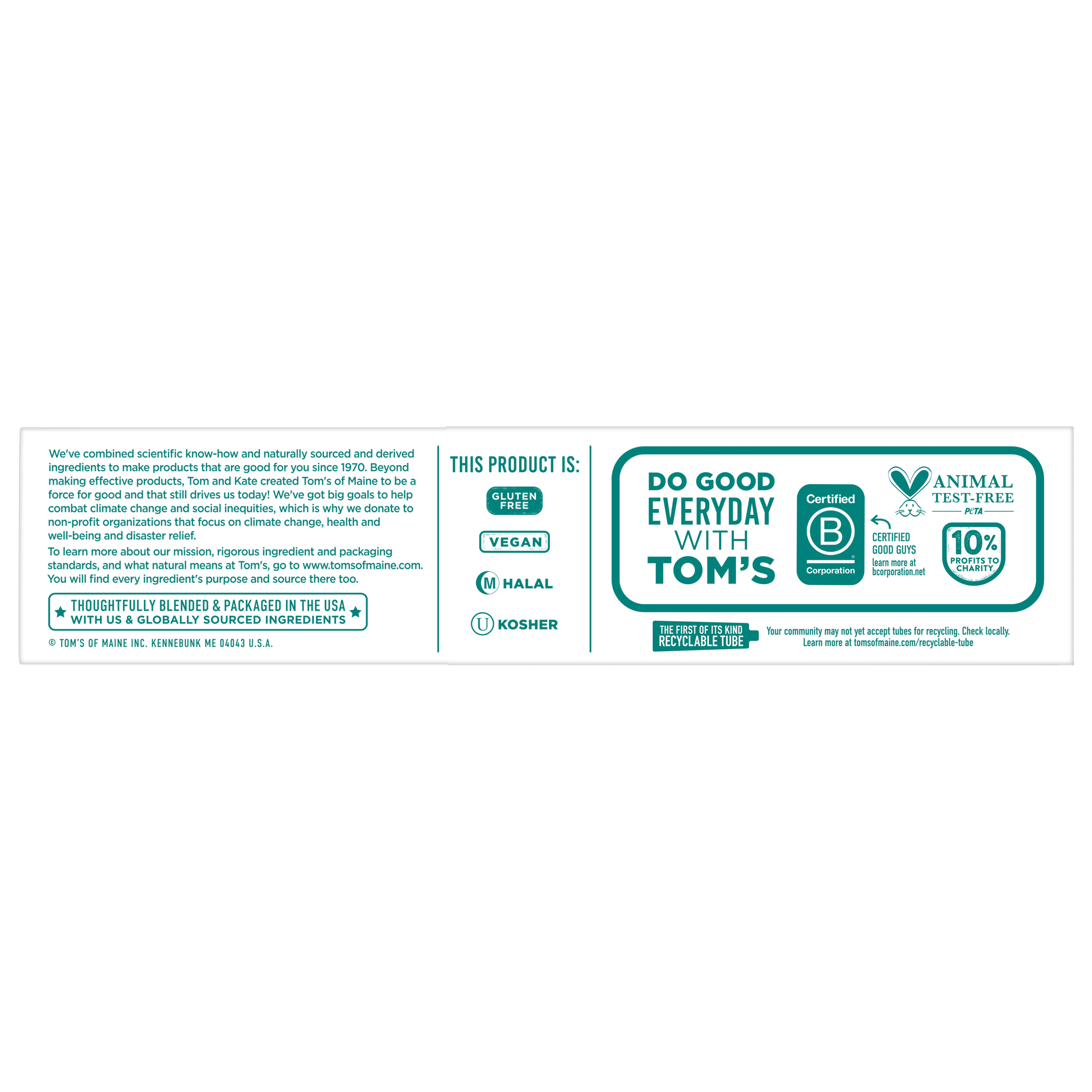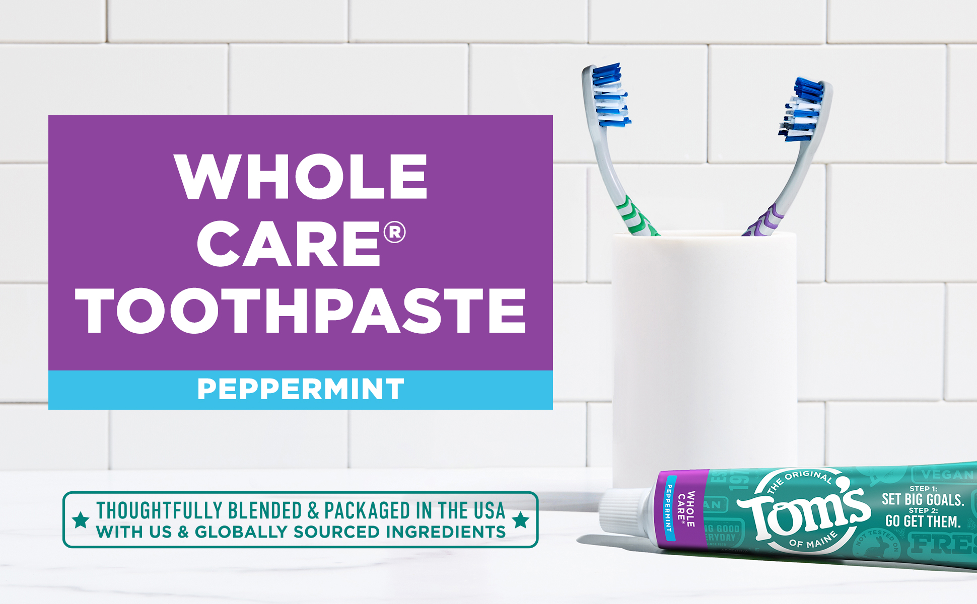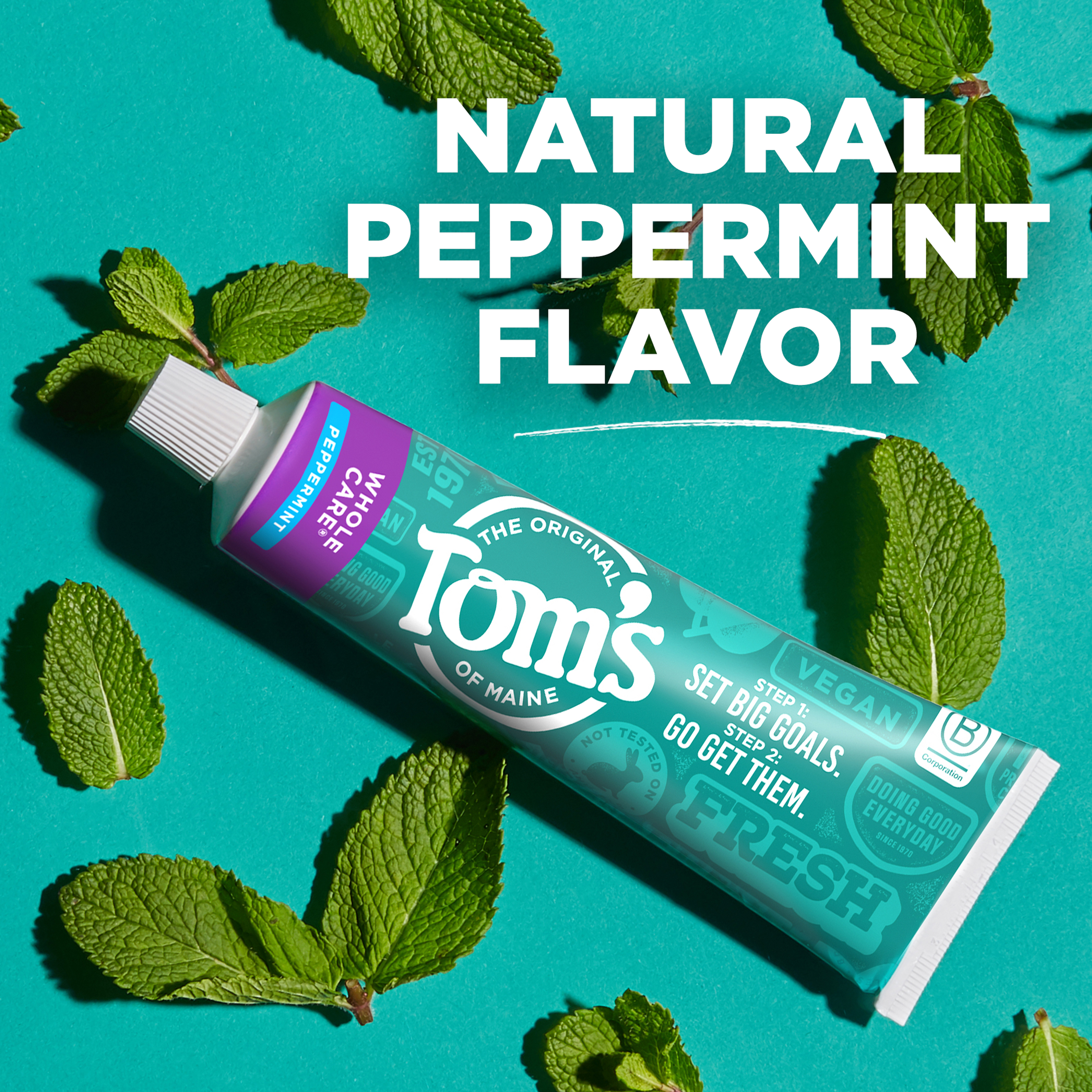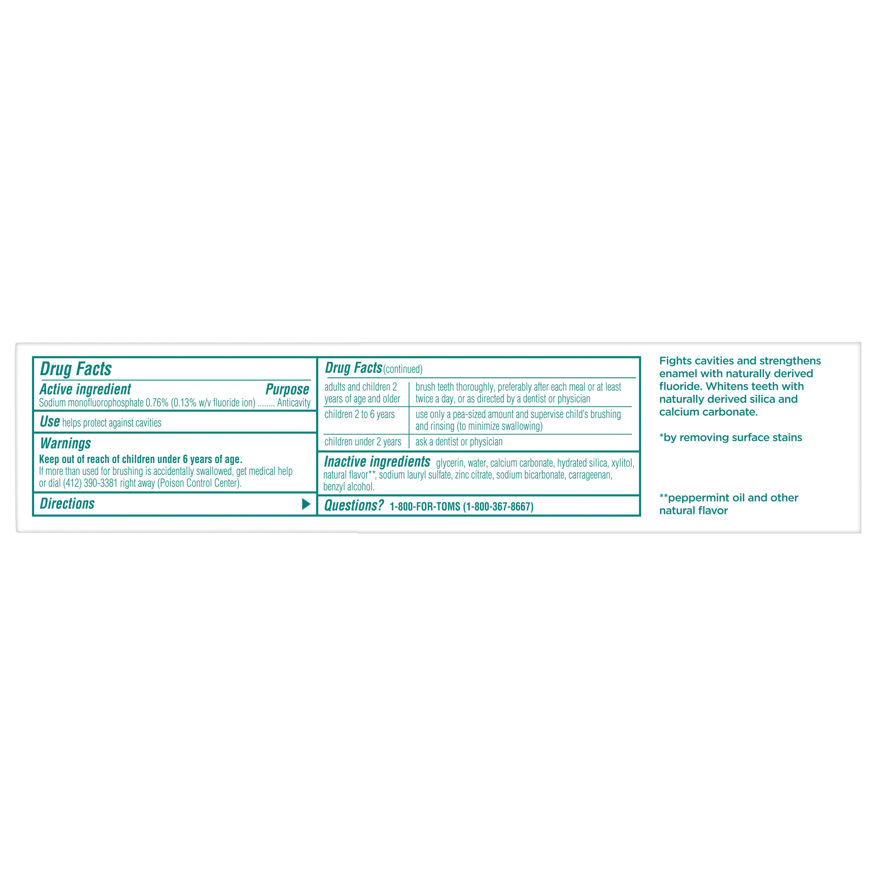 SKU 61011745 Consumer Unit - GTIN 00035000985200 Case - GTIN 10035000985207 Product Category Oral Care Product Sub Category Toothpaste Product Equity (Brand) Tom's Product Sub Brand Tom's Whole Care TP Product Title Tom’s of Maine Whole Care Natural Toothpaste Pack with Fluoride, Peppermint Product Description Promote a clean, bright, healthy smile with the Tom’s of Maine Whole Care Natural Toothpaste with Fluoride. The fluoride toothpaste pack prevents cavities, strengthens enamel, and whitens teeth by removing surface stains. Plus, this mint toothpaste leaves your mouth feeling clean and fresh with its Peppermint flavor. Tom’s of Maine Whole Care Anticavity Toothpaste Pack doubles as a whitening toothpaste by helping to remove surface stains. This cavity protection toothpaste also contains naturally derived fluoride which helps prevent cavities and strengthen teeth enamel. Tom's of Maine uses naturally sourced and derived ingredients to create oral care products that work. This peppermint toothpaste pack contains naturally derived fluoride and is a vegan toothpaste with no artificial flavors or sweeteners and has not been tested on animals. Now that’s something you can feel good about. Get ready to prevent cavities, strengthen enamel, and whiten teeth with Tom’s of Maine Whole Care Natural Toothpaste Pack. eCommerce Copy- Long Description Promote a clean, bright, healthy smile with the Tom’s of Maine Whole Care Natural Toothpaste with Fluoride. The fluoride toothpaste pack prevents cavities, strengthens enamel, and whitens teeth by removing surface stains. Plus, this mint toothpaste leaves your mouth feeling clean and fresh with its Peppermint flavor. Tom’s of Maine Whole Care Anticavity Toothpaste Pack doubles as a whitening toothpaste by helping to remove surface stains. This cavity protection toothpaste also contains naturally derived fluoride which helps prevent cavities and strengthen teeth enamel. Tom's of Maine uses naturally sourced and derived ingredients to create oral care products that work. This peppermint toothpaste pack contains naturally derived fluoride and is a vegan toothpaste with no artificial flavors or sweeteners and has not been tested on animals. Now that’s something you can feel good about. Get ready to prevent cavities, strengthen enamel, and whiten teeth with Tom’s of Maine Whole Care Natural Toothpaste Pack. Bullet 1 Includes two (2) 4.0 oz tubes of Tom’s of Maine Whole Care Natural Toothpaste with Fluoride, Anticavity Toothpaste Bullet 2 Tom’s of Maine Whole Care Enamel Toothpaste helps prevent cavities, strengthens enamel, and whitens teeth by removing surface stains Bullet 3 This cavity protection toothpaste pack is formulated with naturally derived fluoride which helps prevent cavities and strengthens teeth enamel Bullet 4 Peppermint toothpaste flavor leaves your mouth feeling clean and fresh every time you brush Bullet 5 The enamel strengthening toothpaste pack is made with fluoride to help fight cavities to promote a healthy mouth Bullet 6 This vegan toothpaste is free from artificial flavors and sweeteners and has not been tested on animals Bullet 7 Choose a natural toothpaste with fluoride that’s right for your oral care needs with this anticavity toothpaste from Tom’s of Maine Bullet 8 Get ready to smile bright with a fresh mouth with the Tom’s of Maine Whole Care Natural Toothpaste Active Ingredients Sodium monofluorophosphate 0.76% (0.14% w / v fluoride ion) Amazon RPC B08Q4M89K8 AMZ URL https://www.amazon.com/dp/B08Q4M89K8 Walmart RPC 453272319 Walmart URL (Computed) https://www.walmart.com/ip/a/453272319 Target RPC 80137236 Target URL https://www.target.com/p/a/-/A-80137236 CVS RPC 570089
