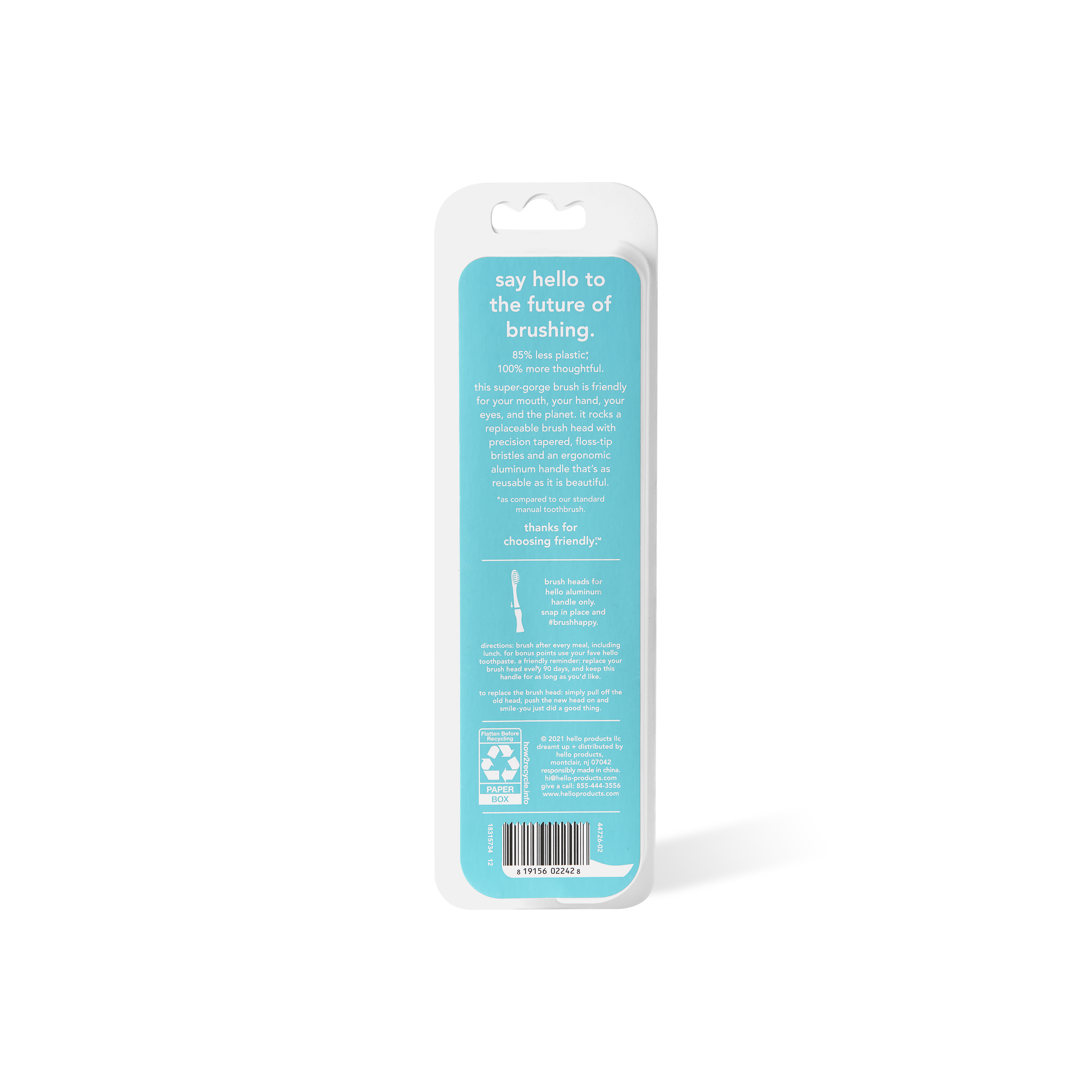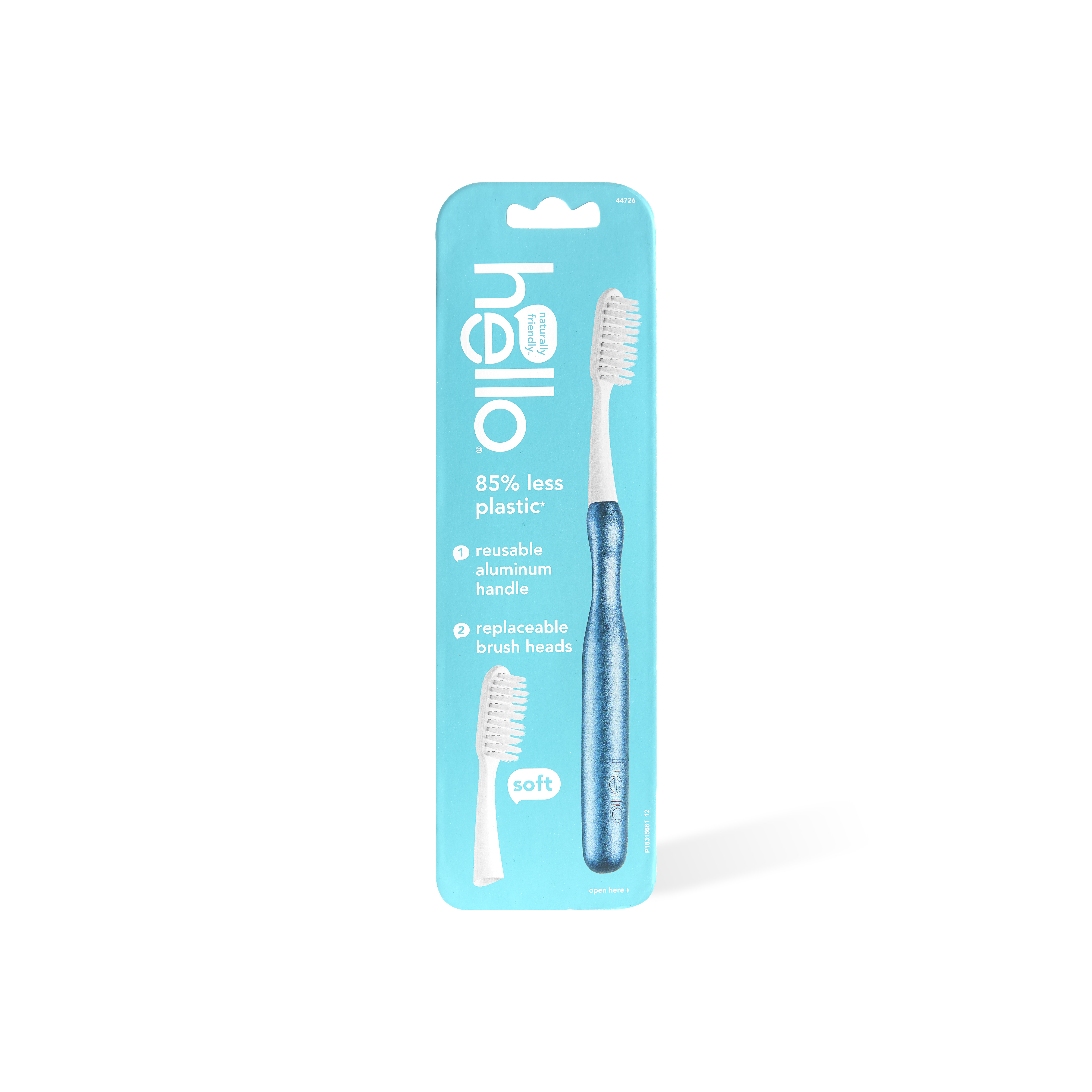 SKU 61012754 Consumer Unit - GTIN 00819156022428 Case - GTIN 20819156022422 Product Category Oral Care Product Sub Category Manual TB Product Equity (Brand) hello Product Sub Brand Hello Man TB Product Title hello Sustainable Toothbrush with Reusable Blue Modern Aluminum Handle & 2 Soft Replacement Heads, BPA-Free eCommerce Copy- Long Description say hello to the future of brushing, again and again. rocking these replaceable brush heads with precision tapered floss-tip bristles helps save 85% plastic over our traditional manual toothbrush. now that's friendly. as always, hello is vegan, cruelty free and not tested on animals (leaping bunny certified and peta recognized). Target RPC 82457499 Target URL https://www.target.com/p/a/-/A-82457499