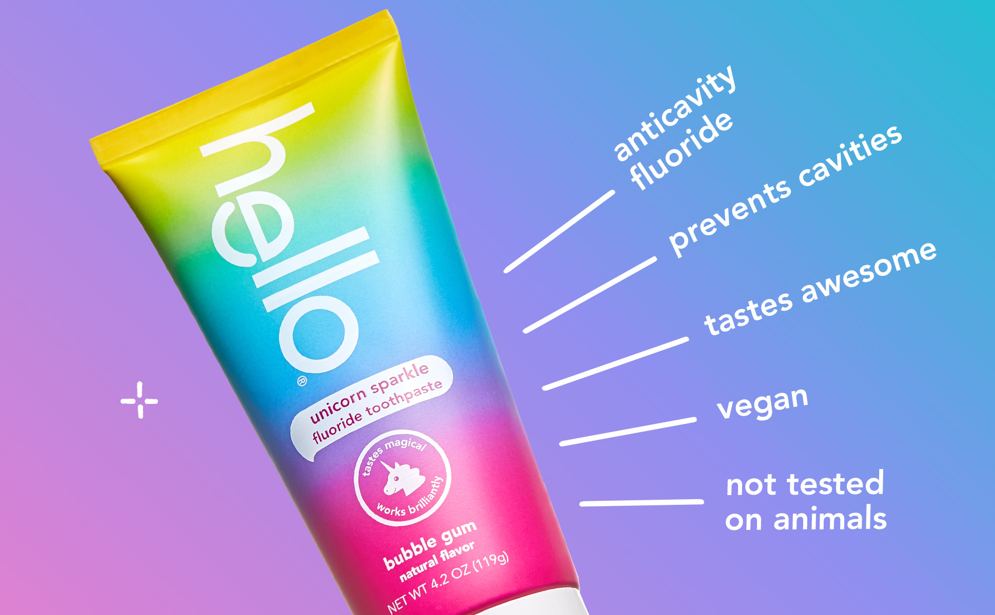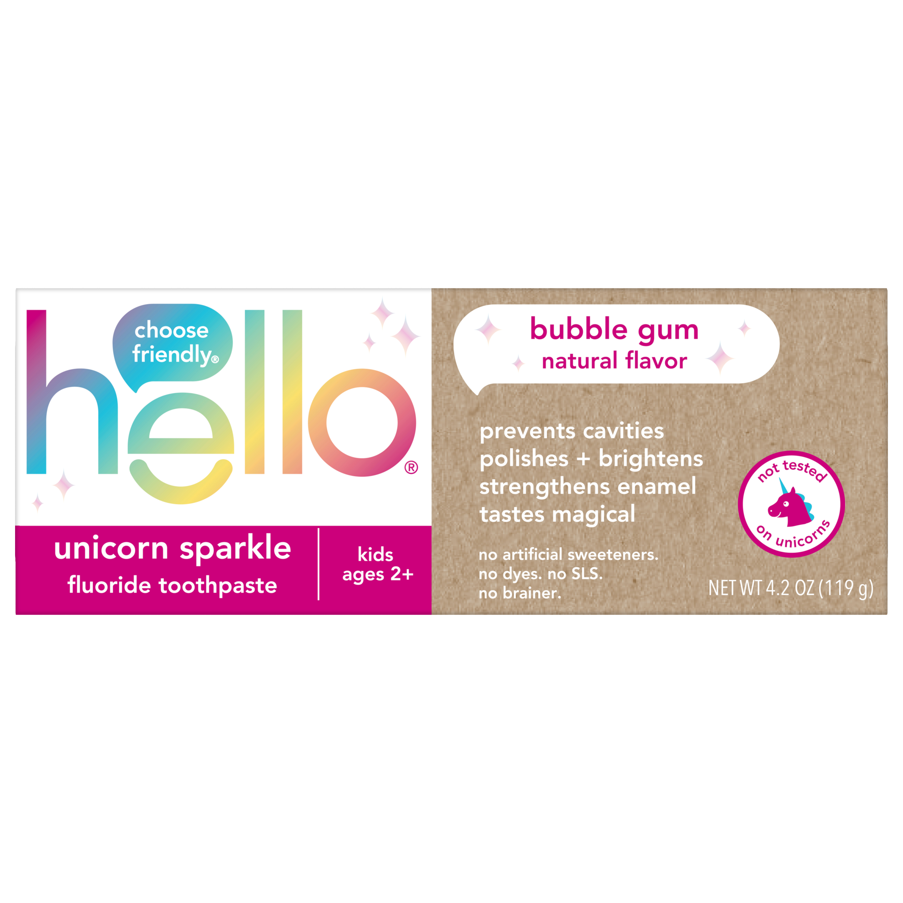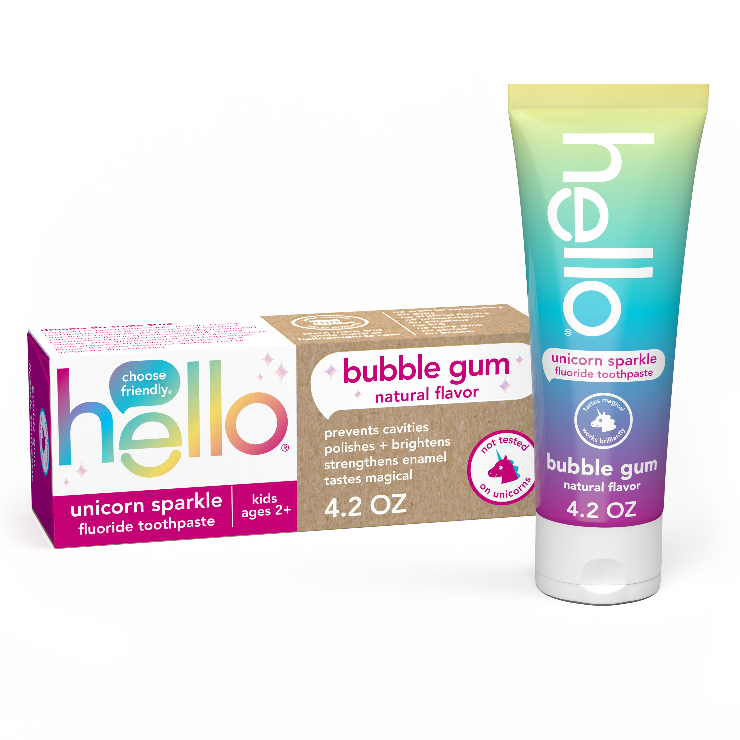 SKU 61012771 Consumer Unit - GTIN 00819156021742 Case - GTIN 50819156021747 Product Category Oral Care Product Sub Category Toothpaste Product Equity (Brand) hello Product Sub Brand Hello Kids TP Product Title hello Unicorn Sparkle Kids Toothpaste with Fluoride, Bubble Gum Toothpaste, 4.2 Oz Tube Product Description hello Unicorn Sparkle Kids Toothpaste with Fluoride, Bubble Gum Toothpaste, 4.2 Oz Tube Say hello to brush time magic and celebrate more everyday yay with hello Unicorn Sparkle Kids Toothpaste with Fluoride. This unicorn sparkle children’s toothpaste tastes like rainbows and sparkles and works brilliantly. This kids fluoride toothpaste is safe for kids ages 2 and up and the magical bubble gum toothpaste flavor is a fun way to encourage regular brushing habits at an early age. Dreams Do Come True hello Unicorn Sparkle Kids Toothpaste with Fluoride is thoughtfully formulated with natural flavor, sparkles, and high quality sweeteners like xylitol and stevia. This kids toothpaste has a fun bubble gum taste making brushing more enjoyable. And because it’s formulated with fluoride, this children’s toothpaste can also help prevent cavities and strengthen enamel, all while brushing away plaque with brilliance and grace. Help polish and brighten your little ones teeth with hello Unicorn Sparkle Kids Fluoride Toothpaste. K(no)w Your Toothpaste We’re serious about being friendly, and about what goes into little mouths. That means making a kids toothpaste that contains no artificial sweeteners, artificial flavors, preservatives, SLS, parabens, dyes, spicy mint, and that is gluten free. Plus, this children’s toothpaste is not tested on animals, real or imaginary. Choose friendly and brush happy with hello Unicorn Sparkle Kids Toothpaste with Fluoride. eCommerce Copy- Long Description dreams do come true. say hello to brush time magic. unicorn sparkle toothpaste tastes like rainbows and sunshine, and works brilliantly. it's thoughtfully formulated with natural flavor, sparkles, and high quality sweeteners like xylitol and stevia. it also prevents cavities, strengthens enamel, and helps brush away plaque with brilliance and grace. and bonus, it's not tested on animals, real or imaginary. and just when you thought it couldn't get any better, carefully open the carton to find a magical surprise inside for your child. #brushhappy Bullet 1 WHAT I’M GETTING: Includes one (1) 4.2 oz tube of hello Unicorn Sparkle Kids Toothpaste with Fluoride, Bubble Gum Toothpaste for Kids Bullet 2 FIGHTS CAVITIES: This kids fluoride toothpaste is safe for children ages 2 and up and helps prevent cavities and strengthens growing teeth using fluoride Bullet 3 MAGICALLY BRILLIANT: The unicorn toothpaste tastes like bubblegum and works brilliantly as a children’s toothpaste to build good brushing habits and help brush away plaque Bullet 4 UNICORN APPROVED: hello Unicorn Sparkle Kids Toothpaste is formulated with natural flavor and also helps polish and brighten little smiles Bullet 5 NO BRAINER: This gluten-free kids toothpaste is made with no SLS, preservatives, parabens, dyes, spicy mint, artificial sweeteners or artificial flavors Active Ingredients Sodium Fluoride 0.24% (0.15% w/v fluoride ion) Walmart RPC 342059247 Walmart URL (Computed) https://www.walmart.com/ip/a/342059247 Target RPC 79635257 Target URL https://www.target.com/p/a/-/A-79635257 CVS RPC 354534 Family Dollar RPC 997367