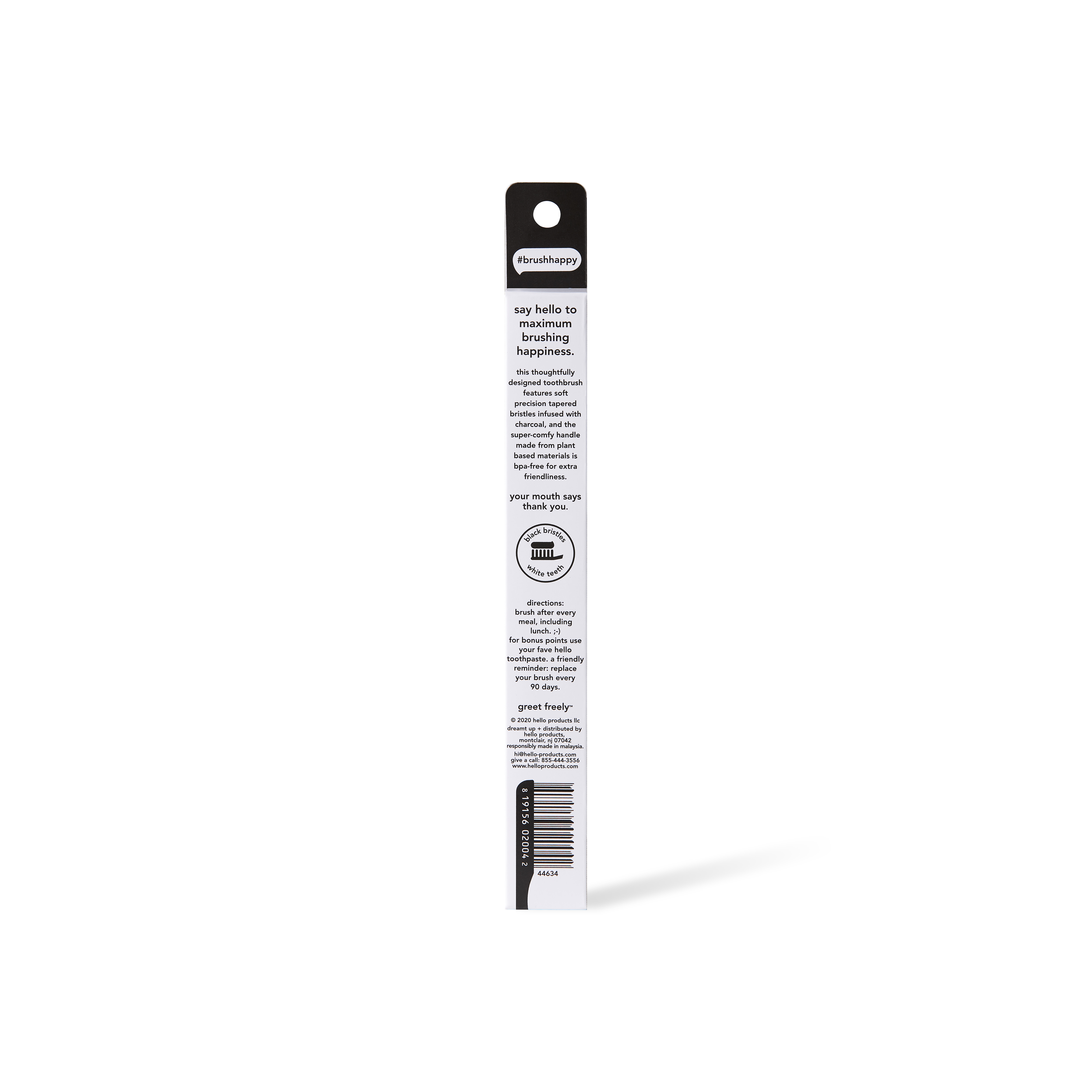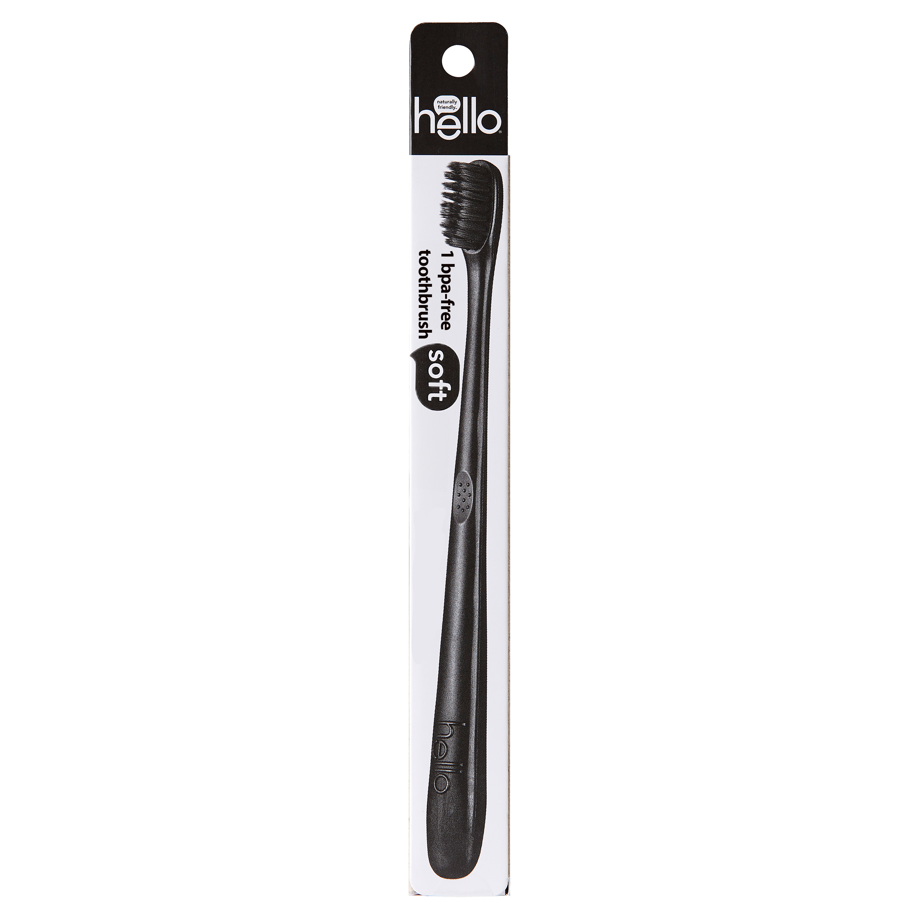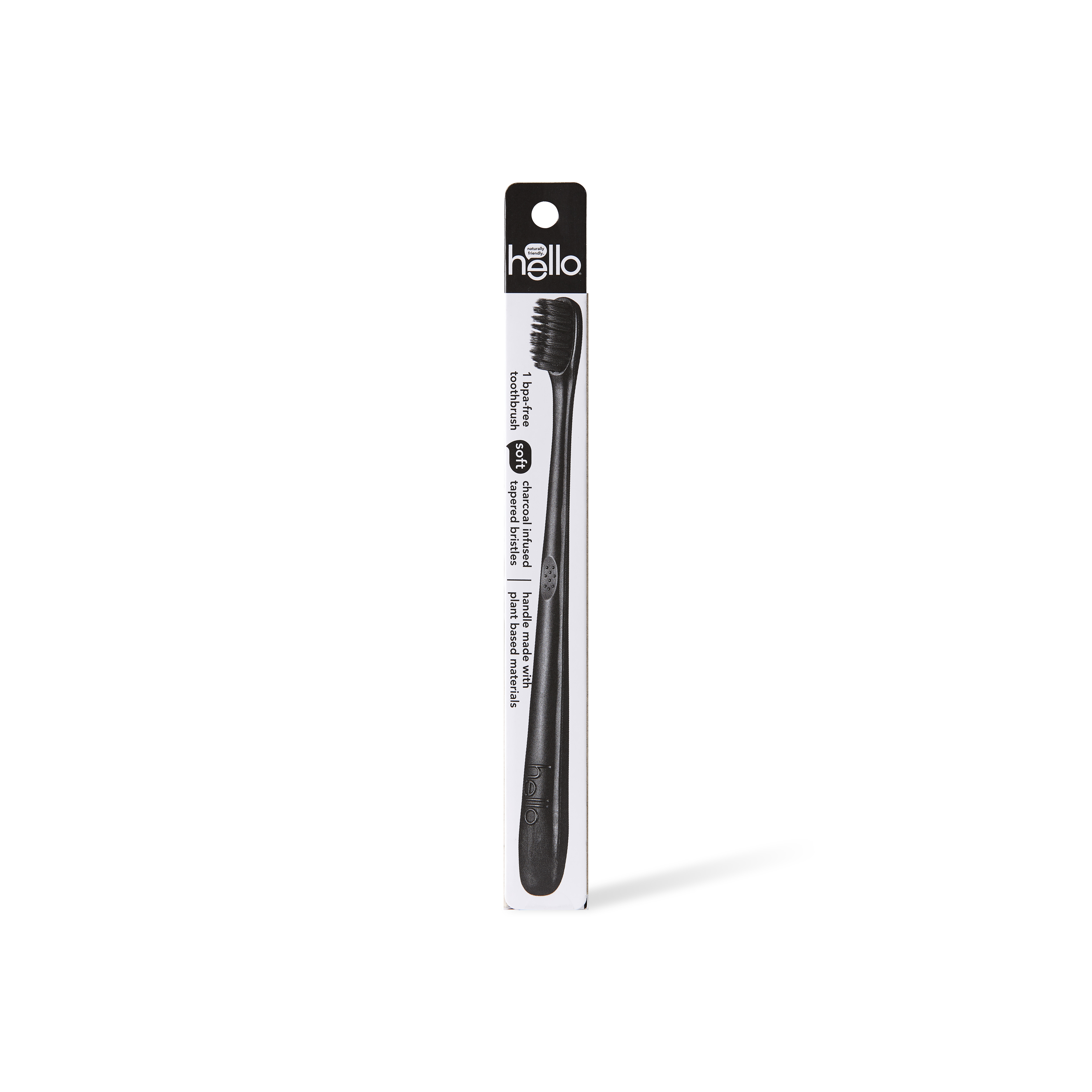 SKU 61012816 Consumer Unit - GTIN 00819156020042 Case - GTIN 20819156020046 Product Category Oral Care Product Sub Category Manual TB Product Equity (Brand) hello Product Sub Brand Hello Adult Man TB Product Title hello Soft Bristle Adult Charcoal Toothbrush, Black, 1 Pack Product Description Say hello to maximum brushing happiness with the hello Soft Bristle Adult Charcoal Toothbrush. Designed with soft, precision tapered bristles infused with charcoal, this BPA-free soft adult toothbrush helps polish away stains and removes pesky plaque buildup. These soft activated charcoal toothbrush bristles are gentle enough for your gums and they’re strong enough for your teeth. This hello Charcoal Soft Toothbrush is BPA-free and the super-comfy ergonomic handle uses plant-based materials for an extra touch of friendliness. Brush softly, and carry a friendly, BPA-free stick with the hello Charcoal Soft Bristle Toothbrush. This black toothbrush from hello is vegan, cruelty-free, and not tested on animals. Looking to add some extra bonus points to your oral care routine? Pair this soft toothbrush with your fave hello toothpaste for the ultimate dream team oral care combo. And a friendly reminder, replace your manual hello toothbrush every 90 days. eCommerce Copy- Long Description hello's activated charcoal bpa-free black toothbrush has soft, super-cool black bristles infused with charcoal from bamboo that are meant to match your charcoal routine! these bristles are soft enough for your gums and strong enough to brush away dirt and grime from your beautiful pearlies. the comfy handle is made with plant-based materials for extra-friendliness. hello is also vegan, cruelty free, and not tested on animals (leaping bunny certified). for optimum hygiene, please remember to score a new toothbrush every 90 days. #brushhappy. Bullet 1 Includes one (1) hello Soft Bristle Adult Charcoal Toothbrush, Black Bullet 2 This charcoal-infused soft bristle toothbrush is completely BPA-free Bullet 3 The soft, precision tapered charcoal bristles on this black toothbrush help polish away stains and remove pesky plaque buildup Bullet 4 This soft toothbrush is made with plant-based materials for an extra touch of friendliness Bullet 5 Friendly reminder, replace your soft bristle hello adult toothbrush every 90 days
