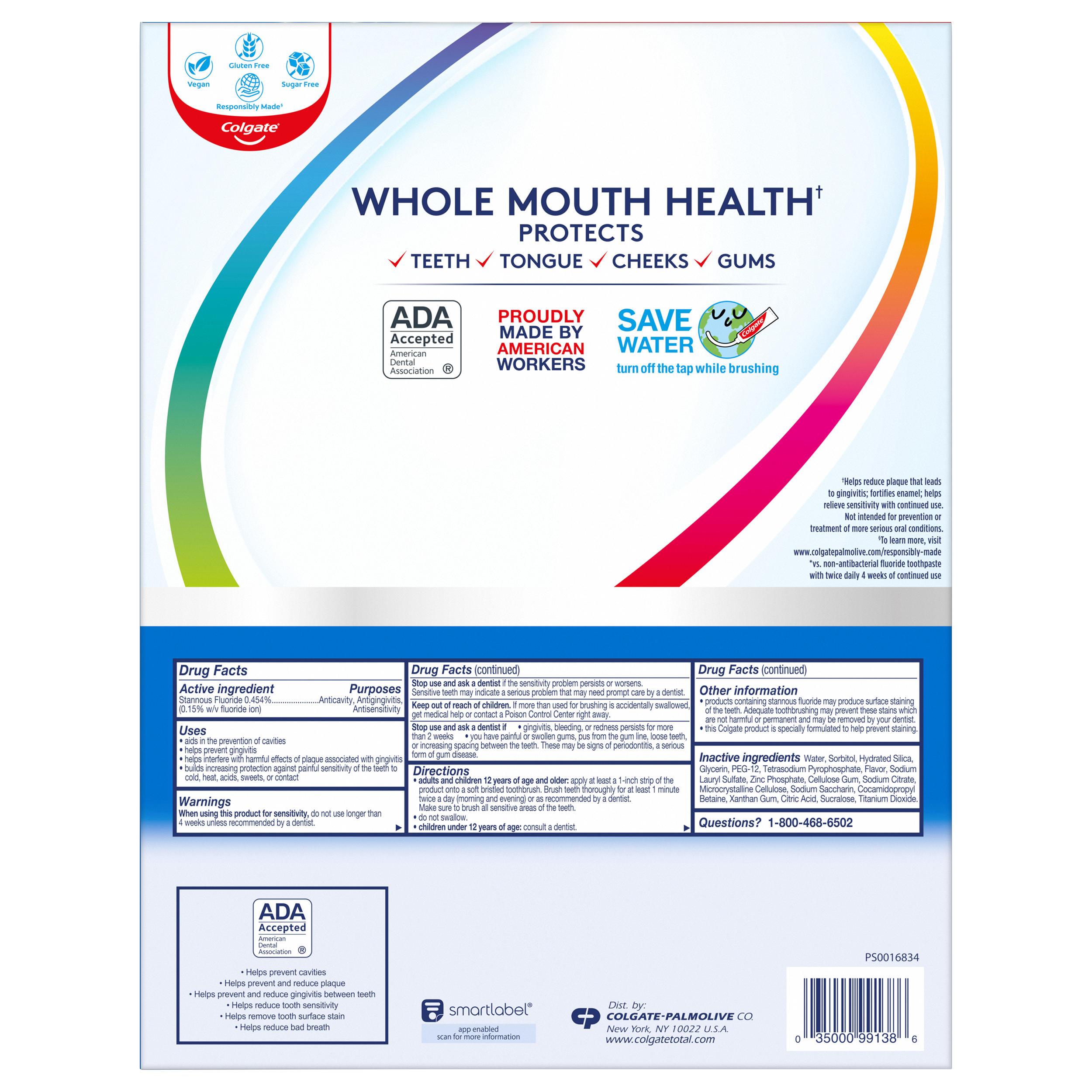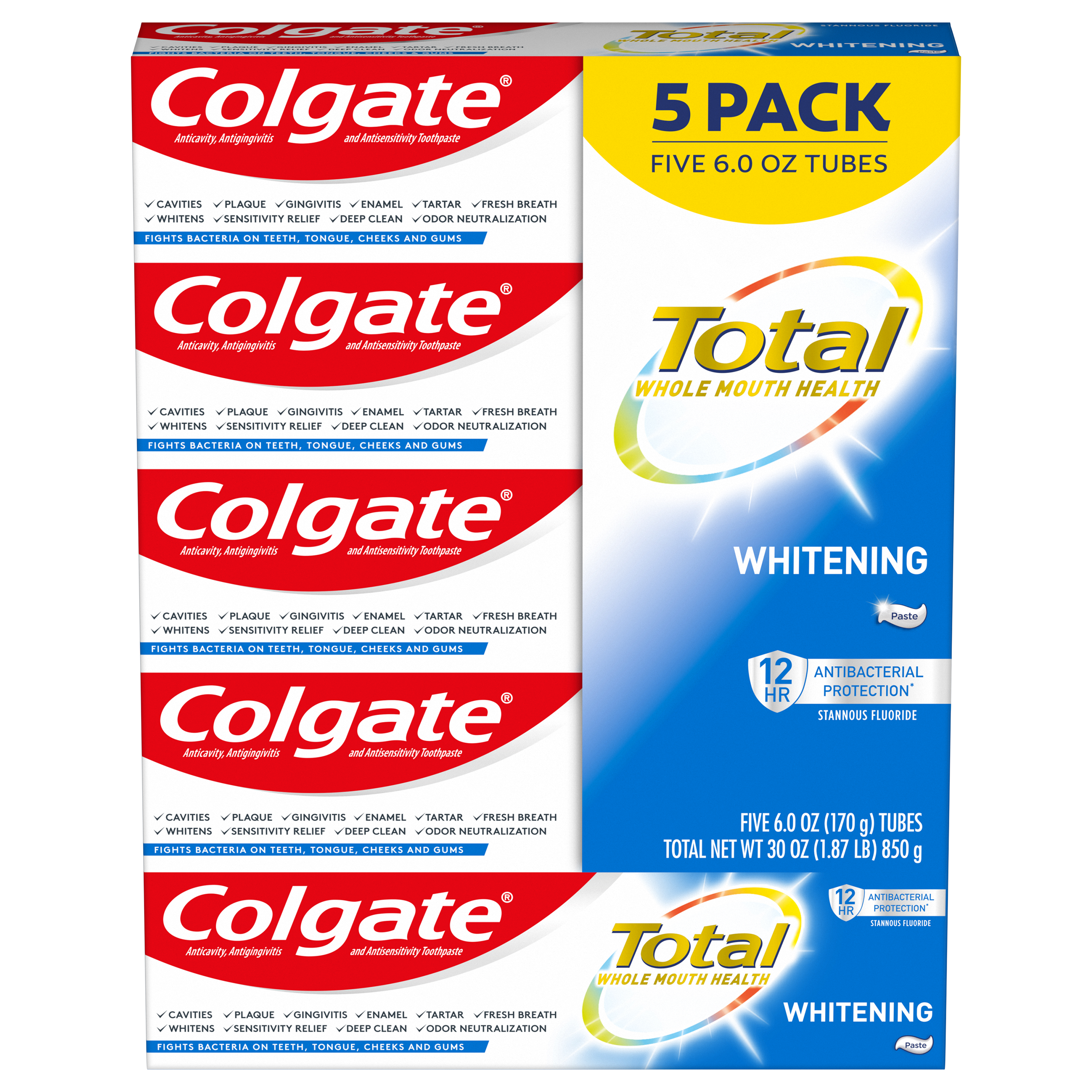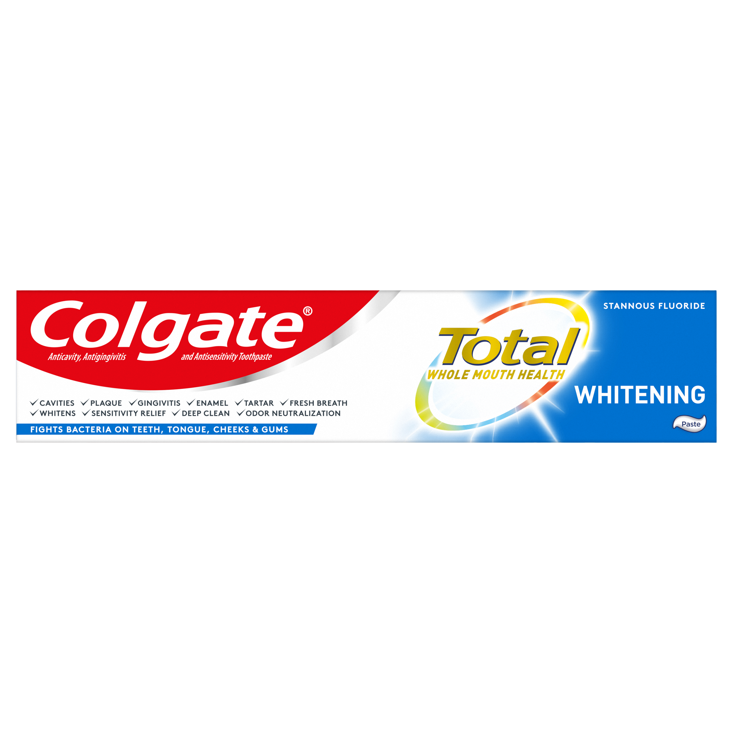 SKU 61013197 Consumer Unit - GTIN 00035000991386 Case - GTIN 10035000991383 Product Category Oral Care Product Sub Category Toothpaste Product Equity (Brand) Colgate Product Sub Brand Colgate Total TP Product Title Colgate Total Whitening Paste Toothpaste 6.0oz 5pk Product Description You can smile confidently when you use Colgate Total + Whitening Toothpaste. It not only offers the benefits of regular toothpaste but also refreshes and whitens teeth by gently removing surface stains. This teeth-whitening toothpaste is specially formulated to eliminate stains and fight against cavities, plaque and gingivitis while preventing the occurrence of new stains and tartar buildup. eCommerce Copy- Long Description You can smile confidently when you use Colgate Total + Whitening Toothpaste. It not only offers the benefits of regular toothpaste but also refreshes and whitens teeth by gently removing surface stains. This teeth-whitening toothpaste is specially formulated to eliminate stains and fight against cavities, plaque and gingivitis while preventing the occurrence of new stains and tartar buildup. Bullet 1 Fight Bacteria for 12 full hours* *vs non antibacterial fluoride toothpaste with twice a day brushing after 4 weeks Bullet 2 Enhanced Flavor Bullet 3 Fights Bacteria on Teeth, Tongue, Cheeks and Gums for Whole Mouth Health Bullet 4 Whitening Toothpaste that Removes and Prevents New Stains Bullet 5 Mint Toothpaste for Long Lasting Fresh Breath Active Ingredients Stannous Fluoride 0.454% (0.15% w/v fluoride ion)