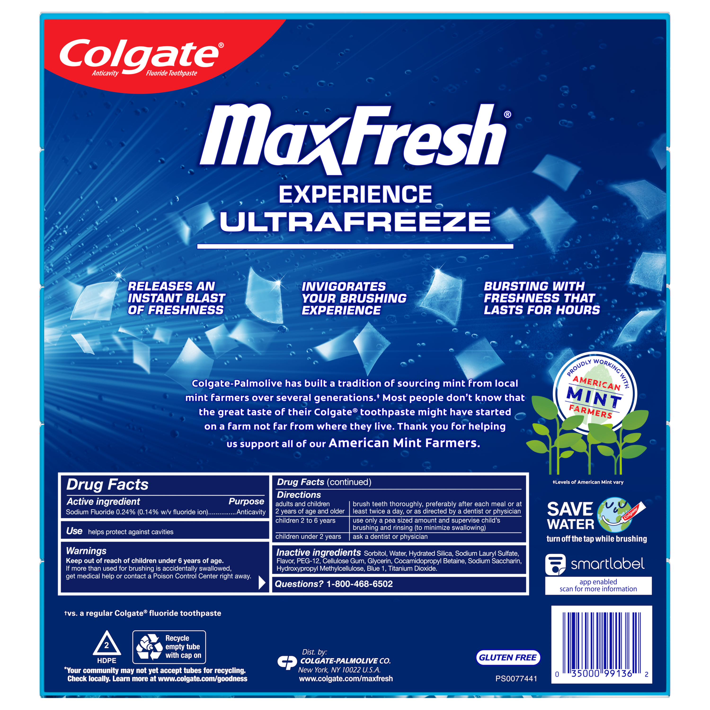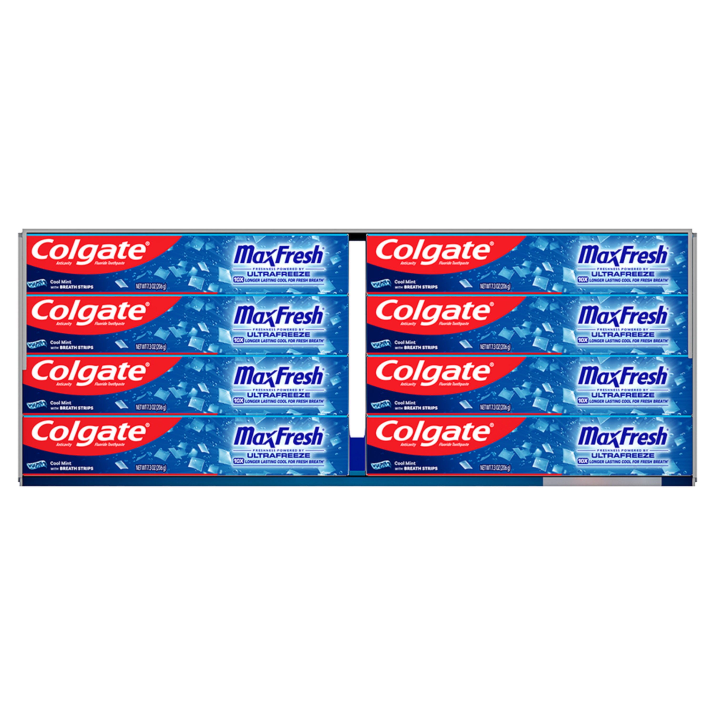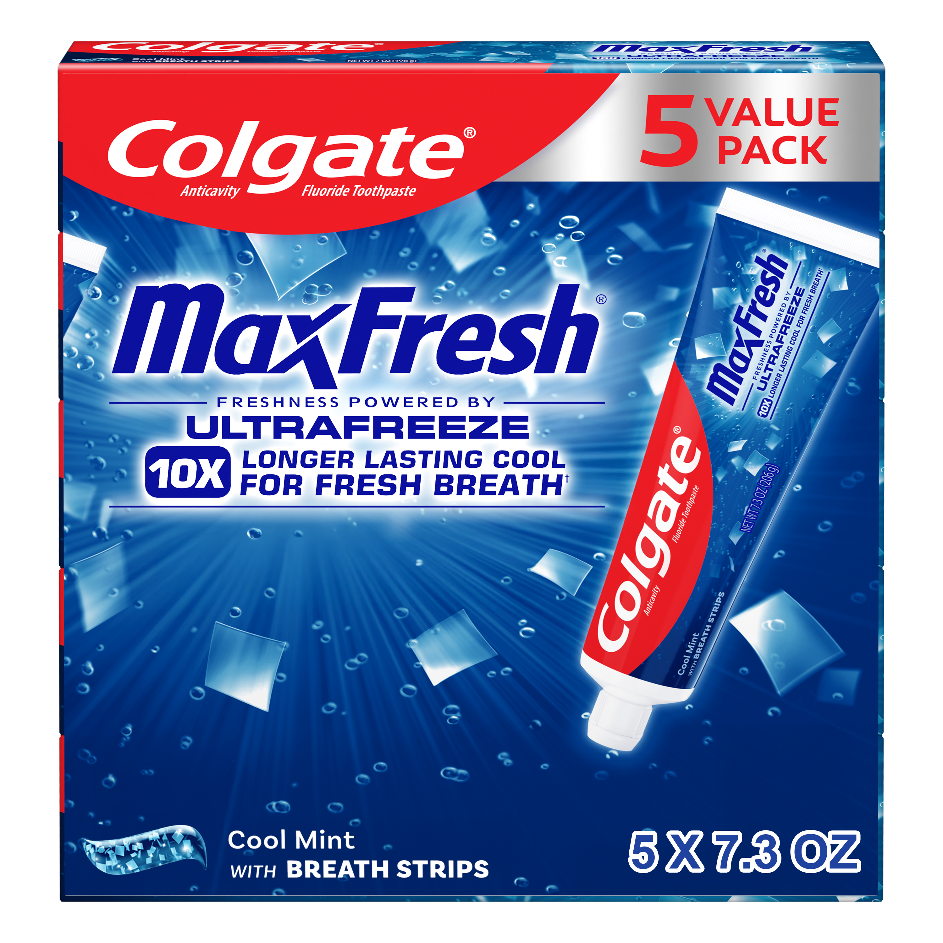 SKU 61013274 Consumer Unit - GTIN 00035000999993 Product Category Oral Care Product Sub Category Toothpaste Product Equity (Brand) Colgate Product Sub Brand Colgate Max Fresh TP Product Title Colgate MaxFresh Cool Mint Toothpaste, 5 Pack, 7.3 oz Product Description Release an instant blast of freshness with Colgate MaxFresh Cool Mint Toothpaste. This refreshing and invigorating Cool Mint toothpaste pack includes five tubes of Colgate MaxFresh Cool Mint Toothpaste. Powered by Ultrafreeze, this invigorating peppermint toothpaste offers 10X longer-lasting cool for fresh breath. This mint toothpaste, with the help of Ultrafreeze and hundreds of mini breath strips, is bursting with freshness that lasts for hours. Colgate MaxFresh Toothpaste comes in a refreshing Cool Mint flavor that invigorates the brushing experience and leaves your breath feeling amazingly cool and refreshed. However, Colgate MaxFresh Toothpaste is more than just a mint toothpaste for bad breath, Colgate MaxFresh Cool Mint Toothpaste is also a fluoride toothpaste and helps prevent cavities. With its refreshing and invigorating Cool Mint flavor and hundreds of mini breath strips, Colgate MaxFresh Cool Mint Toothpaste leaves your breath feeling fresh and minty for hours. Plus, the fluoride-based formula helps fight cavities. Get long-lasting fresh breath with Colgate MaxFresh Cool Mint Toothpaste. vs. a regular Colgate fluoride toothpaste eCommerce Copy- Long Description Release an instant blast of freshness with Colgate® Max Fresh Cool Mint Toothpaste. Powered by Ultrafreeze, this invigorating peppermint toothpaste offers 10X longer-lasting cool for fresh breath*. This mint toothpaste, with the help of Ultrafreeze and hundreds of breath strips, releases a powerful rush of freshness for long-lasting fresh breath. Colgate® Max Fresh Toothpaste comes in a refreshing Cool Mint flavor that invigorates the brushing experience. However, it’s more than just a toothpaste for bad breath, Colgate® Max Fresh Cool Mint Toothpaste is also a fluoride toothpaste and helps prevent cavities. With its refreshing Cool Mint flavor and hundreds of breath strips, Colgate® Max Fresh Toothpaste leaves your breath feeling fresh for hours. *vs. a regular Colgate® fluoride toothpaste Bullet 1 Includes five (5) 7.3 oz tubes of Colgate MaxFresh Cool Mint Toothpaste Bullet 2 Powered by Ultrafreeze, Colgate MaxFresh Toothpaste offers 10X longer-lasting cool for fresh breath* Bullet 3 Fluoride toothpaste formula helps fight cavities Bullet 4 This peppermint toothpaste pack, with hundreds of mini breath strips, is bursting with freshness that lasts for hours Bullet 5 Release an instant blast of freshness with Colgate MaxFresh Cool Mint Toothpaste Active Ingredients Sodium Fluoride 0.24 % (0.15% w/v fluoride ion)