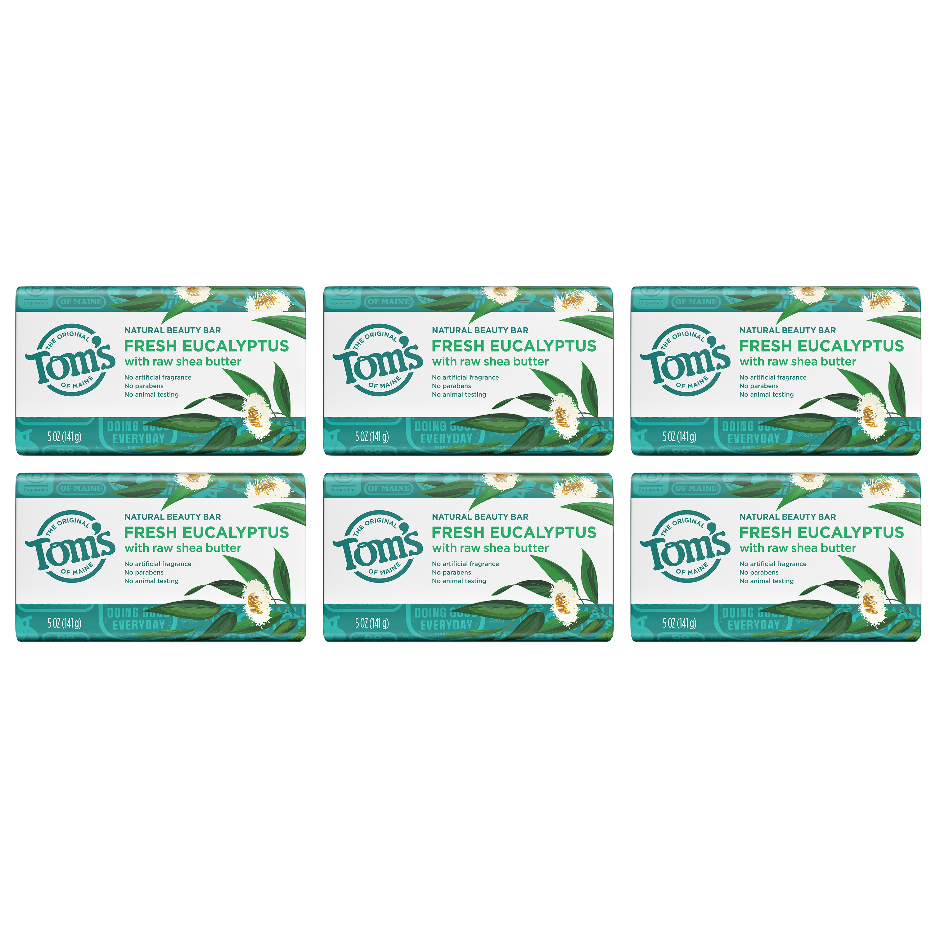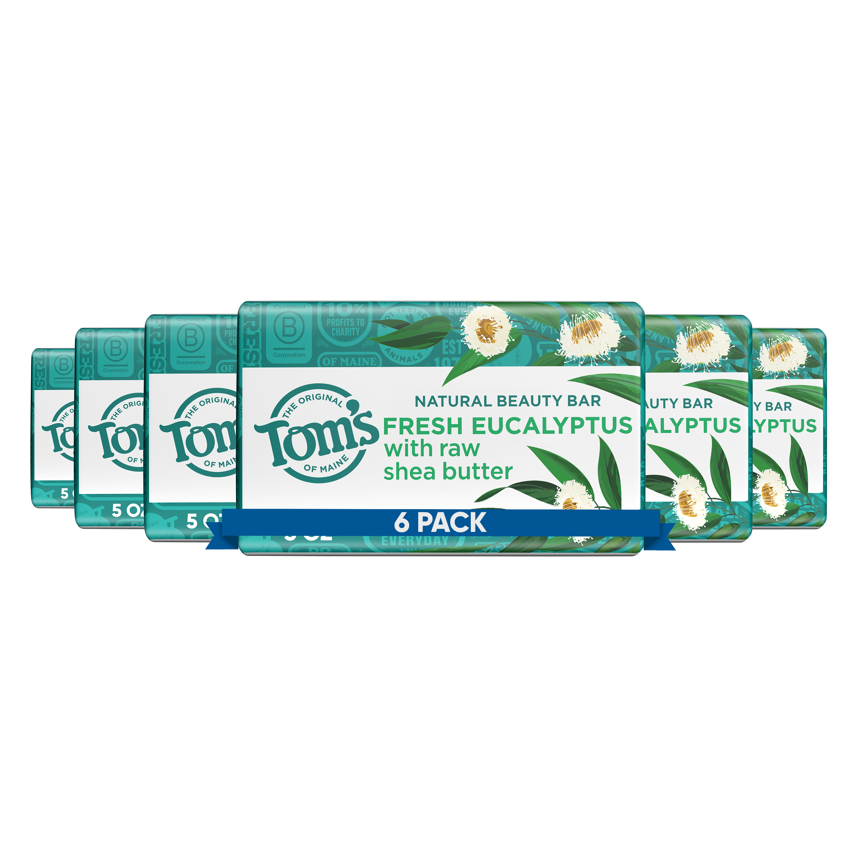 SKU 61015149 Consumer Unit - GTIN 00035000992628 Case - GTIN 10035000992625 Product Category Personal Care Product Sub Category Bar Soap Product Equity (Brand) Tom's of Maine Product Sub Brand Tom's Natural Beauty BS Product Title Tom’s of Maine Moisturizing Natural Beauty Bar Soap For Women and Men, Fresh Eucalyptus, 5 oz Bar (Pack of 6) Product Description Elevate your daily routine with Tom's of Maine Fresh Eucalyptus Natural Beauty Bar Soap. This bar soap effectively washes away bacteria while maintaining your skin’s natural moisture. Each wash releases the refreshing scent of eucalyptus, and is made with shea butter for a deeply moisturizing experience. Our vegan bar soap is crafted with no artificial fragrances and no parabens. Breathe in the refreshing fragrance of Fresh Eucalyptus with every wash with Tom's of Maine, a brand dedicated to responsible and sustainable practices. Our bar soaps are not tested on animals, free from preservatives, and provide a refreshing bathing experience. Bullet 1 Six (6) 5 oz bars of Tom's of Maine Moisturizing Fresh Eucalyptus Natural Beauty Bar Soap for Men and Women Bullet 2 Each wash releases the calming scent of eucalyptus Bullet 3 Made with raw shea butter for a soothing experience Bullet 4 This body bar soap washes away bacteria and retains natural moisture Bullet 5 Our natural bar soap is free from artificial fragrances, parabens, and preservatives, and is not tested on animals Amazon RPC B07P5HNRYQ AMZ URL https://www.amazon.com/dp/B07P5HNRYQ