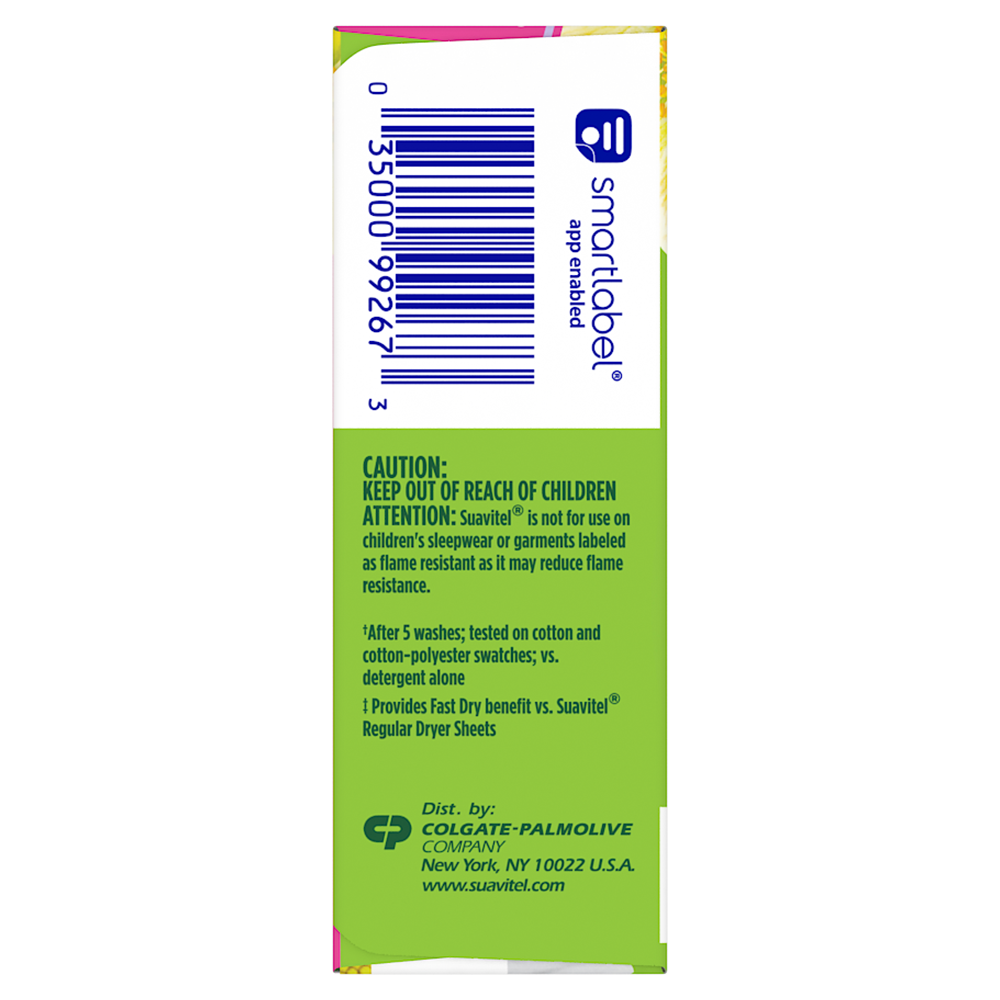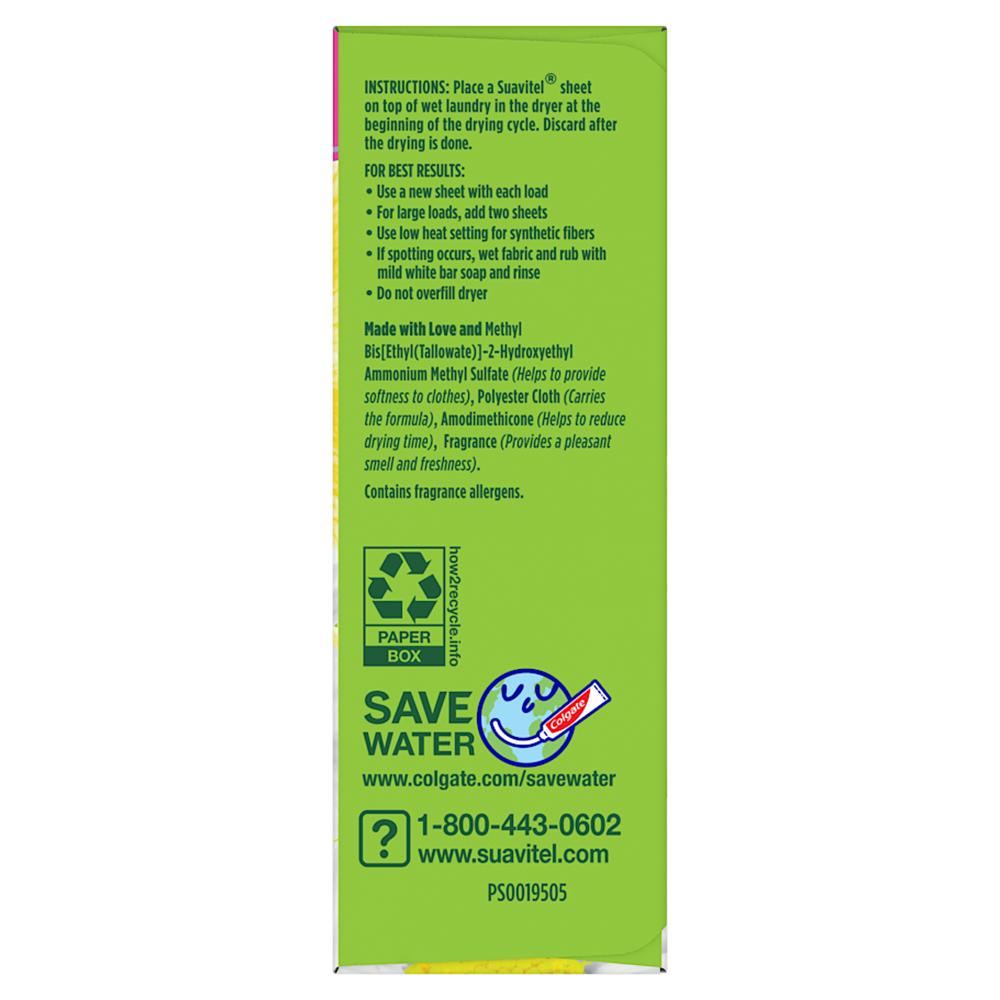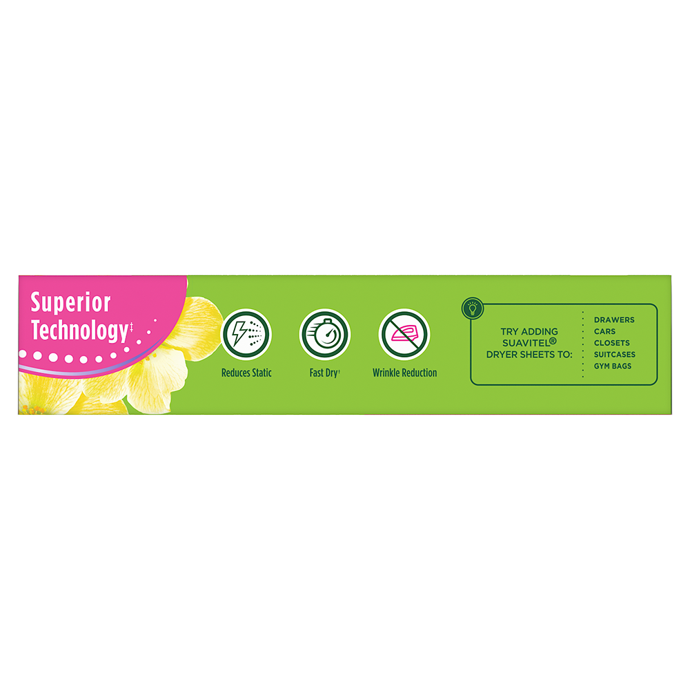 SKU 61015182 Consumer Unit - GTIN 00035000992673 Case - GTIN 10035000992670 Product Category Home Care Product Sub Category FC Sheets Product Equity (Brand) Suavitel Product Sub Brand Suavitel Cmplt Sheets FC Product Title Suavitel Complete Dryer Sheets, Fabric Conditioner, Floral Burst Scent, 36 Sheets Product Description Discover the power of superior technology (1) with Suavitel Complete Floral Burst Dryer Sheets. Engineered to streamline your laundry experience, these fabric softener sheets offer a remarkable Fast Dry (2) technology, allowing your clothes to dry quicker compared to regular dryer sheets. Our clothes softener effectively reduces static and provides wrinkle reduction, ensuring a smooth finish for your clothes. This invigorating fragrance blends citrus, raspberries, and red fruits with elegant white florals, musk, vanilla, sandalwood, and spicy notes to transform your everyday laundry into a delightful experience. But why stop at laundry? Extend the fresh scent to other areas of your life by placing Suavitel dryer sheets in dresser drawers, closets, suitcases, and gym bags. Enjoy the irresistibly fresh scent and the exceptional care that Suavitel laundry softener brings to your clothes, making freshness easier and more delightful than ever for you and your family. (1) Provides Fast Dry benefit vs. Suavitel Regular Dryer Sheets (2) after 5 washes; tested on cotton and cotton-polyester swatches; vs. detergent alone Bullet 1 One 36 count box of Suavitel Complete Dryer Sheets, Fabric Conditioner, Floral Burst Scent Bullet 2 Enjoy a 2X Longer Lasting Fragrance (1) keeping your laundry fresh for weeks Bullet 3 Effectively reduces static, ensuring your clothes are smoother and more comfortable to wear Bullet 4 Effectively reduces static and provides wrinkle reduction, ensuring a smooth finish for your linens Bullet 5 Citrus, berries, florals, and spices create an invigorating scent Bullet 6 Provides incredible softness, enhancing the comfort and feel of your clothing with every load Bullet 7 This laundry fabric softener makes freshness easier and more delightful than ever for you and your family Family Dollar RPC 1498740