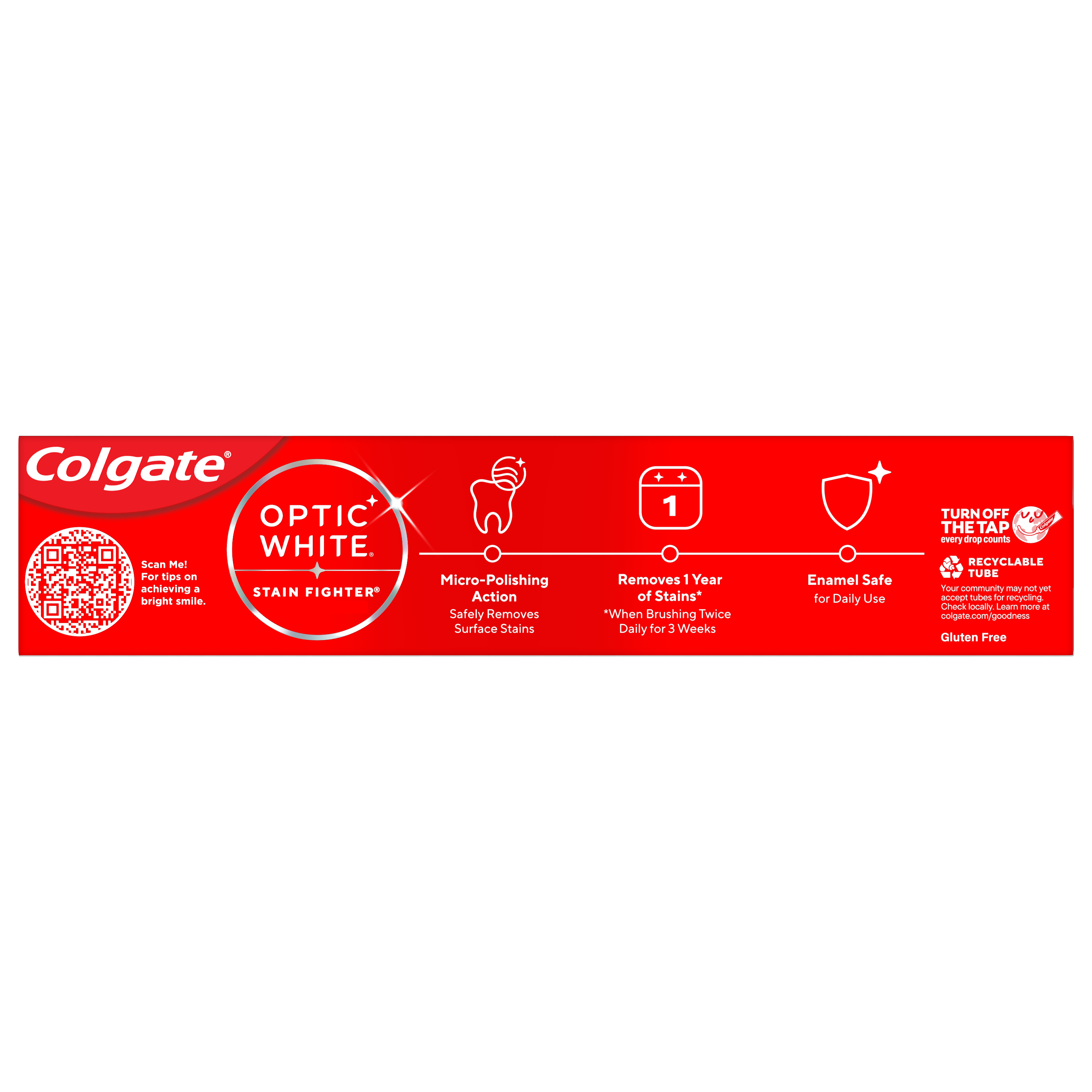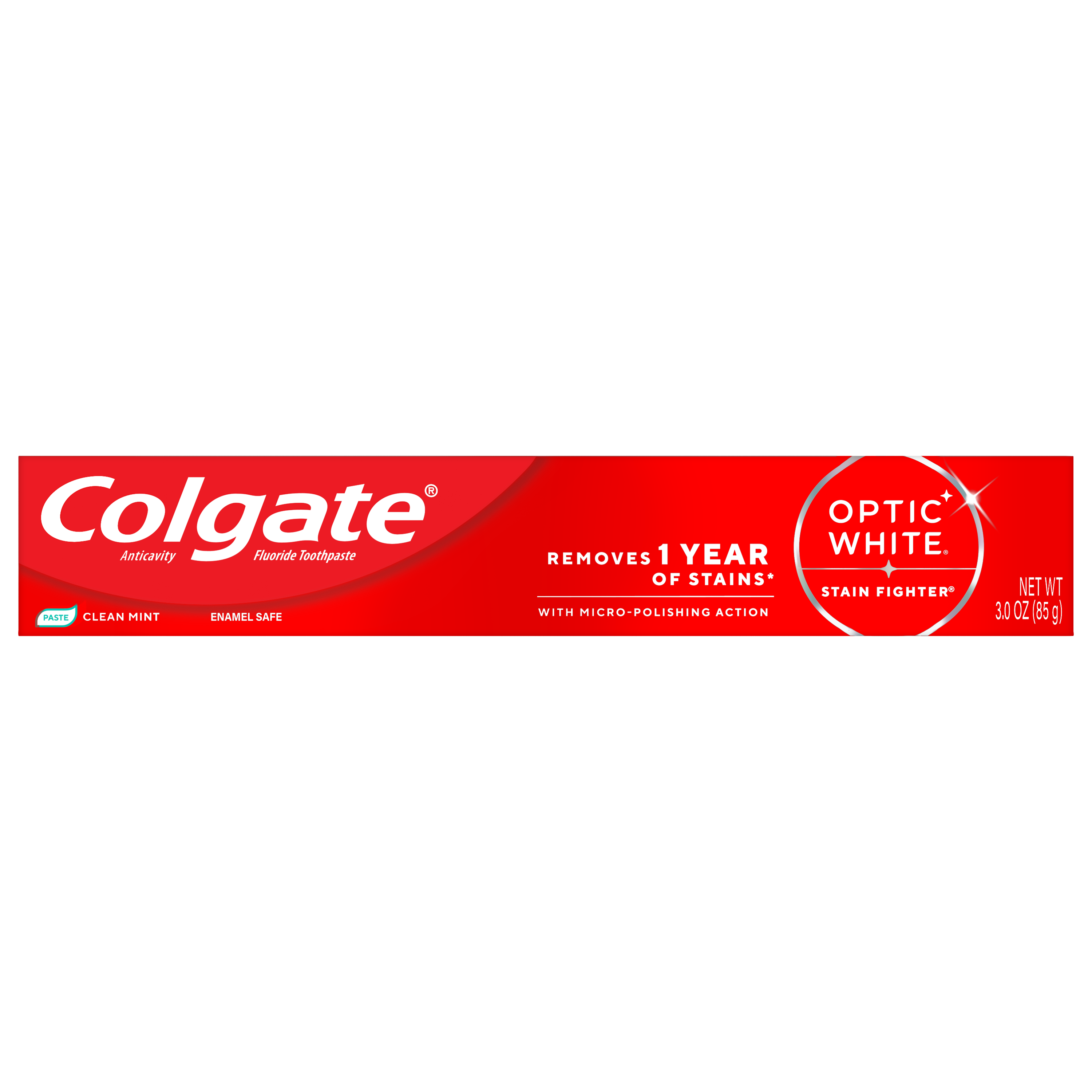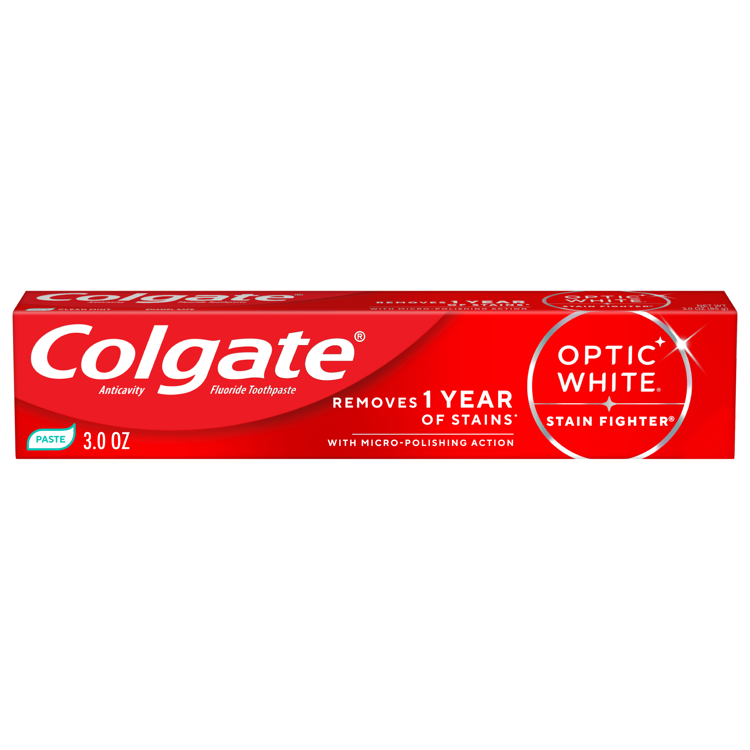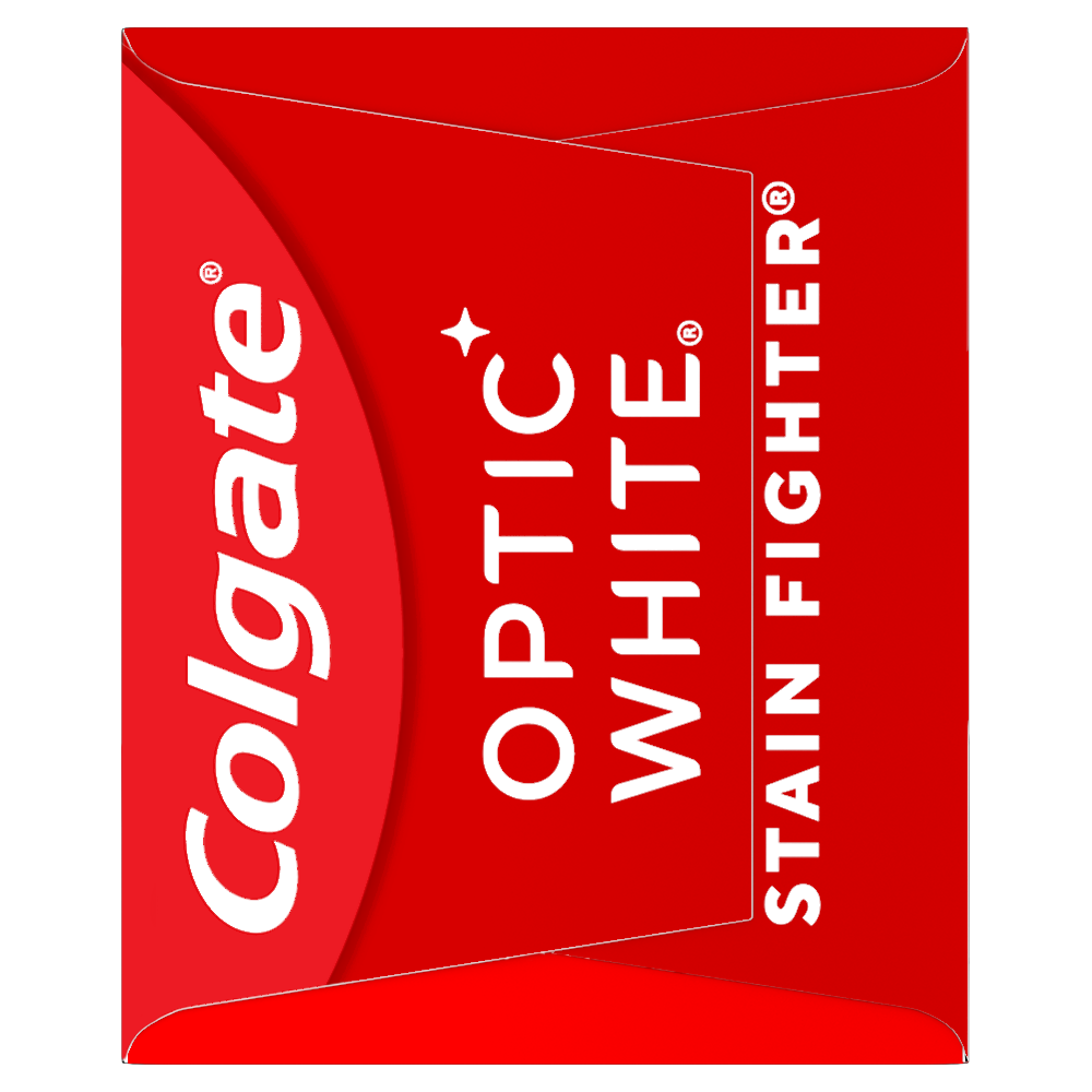 SKU 61016666 Consumer Unit - GTIN 00035000993489 Case - GTIN 10035000993486 Product Category Oral Care Product Sub Category Toothpaste Product Equity (Brand) Colgate Product Sub Brand Colgate Optic White TP Product Title Colgate Optic White Stain Fighter Clean Mint Paste Teeth Whitening Toothpaste, Anticavity Toothpaste with Fluoride, 3.0 OZ Product Description Colgate Optic White Stain Fighter Clean Mint Paste Toothpaste removes 1 year of stains* while freshening breath with its mint flavor. Its micro-polishing action safely removes 5X more surface stains**. Plus, Optic White Stain Fighter contains fluoride to fight cavities and is an enamel safe stain remover toothpaste. Get an invigorating clean with this effective teeth stain remover. Colgate Optic White Stain Fighter uses a patented whitening formula for thorough, effective stain removal. The micropolishers in Stain Fighter don’t just brush away surface stains – they help prevent new ones from forming. Our peppermint toothpaste provides a clean, invigorating taste that lasts from the first taste to the finish. Stain Fighter is a fluoride toothpaste that fights cavities. This patented whitening formula removes 1 year of stains* and is enamel safe for daily use. *when brushing twice daily for 3 weeks **vs. ordinary, non-whitening toothpaste after 2 weeks of continued use eCommerce Copy- Long Description Remove every day surface stains to reveal a brighter smile with Colgate Optic White Stain Fighter Stain Removal Toothpaste. This whitening toothpaste for adults removes 95% of daily surface stains for a brighter smile.* Get ready to reveal a beautiful smile that’s ready to shine with Colgate Optic White Stain Fighter Stain Removal Toothpaste. Patented Teeth Whitening Formula with Minty Freshness Colgate Optic White Stain Fighter Stain Removal Toothpaste uses a patented whitening formula to remove 95% of daily surface stains*. Using special micro-polishing action, this anticavity toothpaste removes 5x more surface stains** on teeth. Plus, this fluoride toothpaste comes in a refreshing Clean Mint Paste flavor so that you can enjoy minty freshness each and every time you brush. Enamel Safe Whitening That Works Colgate Optic White Stain Fighter Stain Removal Toothpaste is a sugar free and vegan toothpaste that is enamel safe for daily use. For whitening that works, choose Colgate Optic White Stain Fighter Stain Removal Toothpaste. *after 2 weeks of twice daily use **vs. ordinary, non whitening toothpaste after 2 weeks of continued use Bullet 1 One 3.0 OZ tube of Colgate Optic White Stain Fighter Clean Mint Paste Teeth Whitening Toothpaste Bullet 2 Removes 1 year of stains* (*when brushing twice daily for 3 weeks) Bullet 3 Safely removes 5X more surface stains with micro-polishing action** (**vs. ordinary, non-whitening toothpaste after 2 weeks of continued use) Bullet 4 Clean Mint flavor provides a clean, invigorating taste that lasts from the first taste to the finish Bullet 5 Enamel safe for daily use Bullet 6 Optic White Stain Fighter is an anticavity toothpaste; it contains fluoride to fight cavities Bullet 7 Optic White Stain Fighter is a vegan toothpaste Active Ingredients Sodium Fluoride 0.24 % (0.15% w/v fluoride ion) Dollar Tree RPC 341944