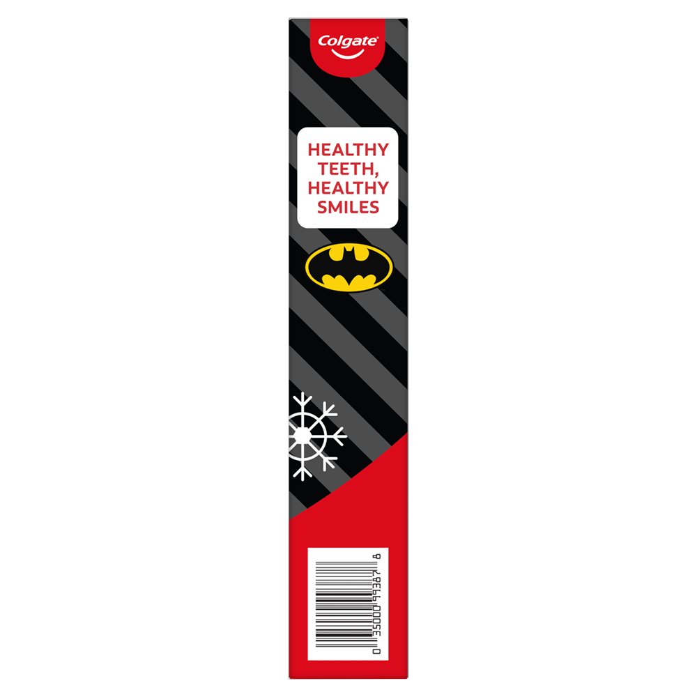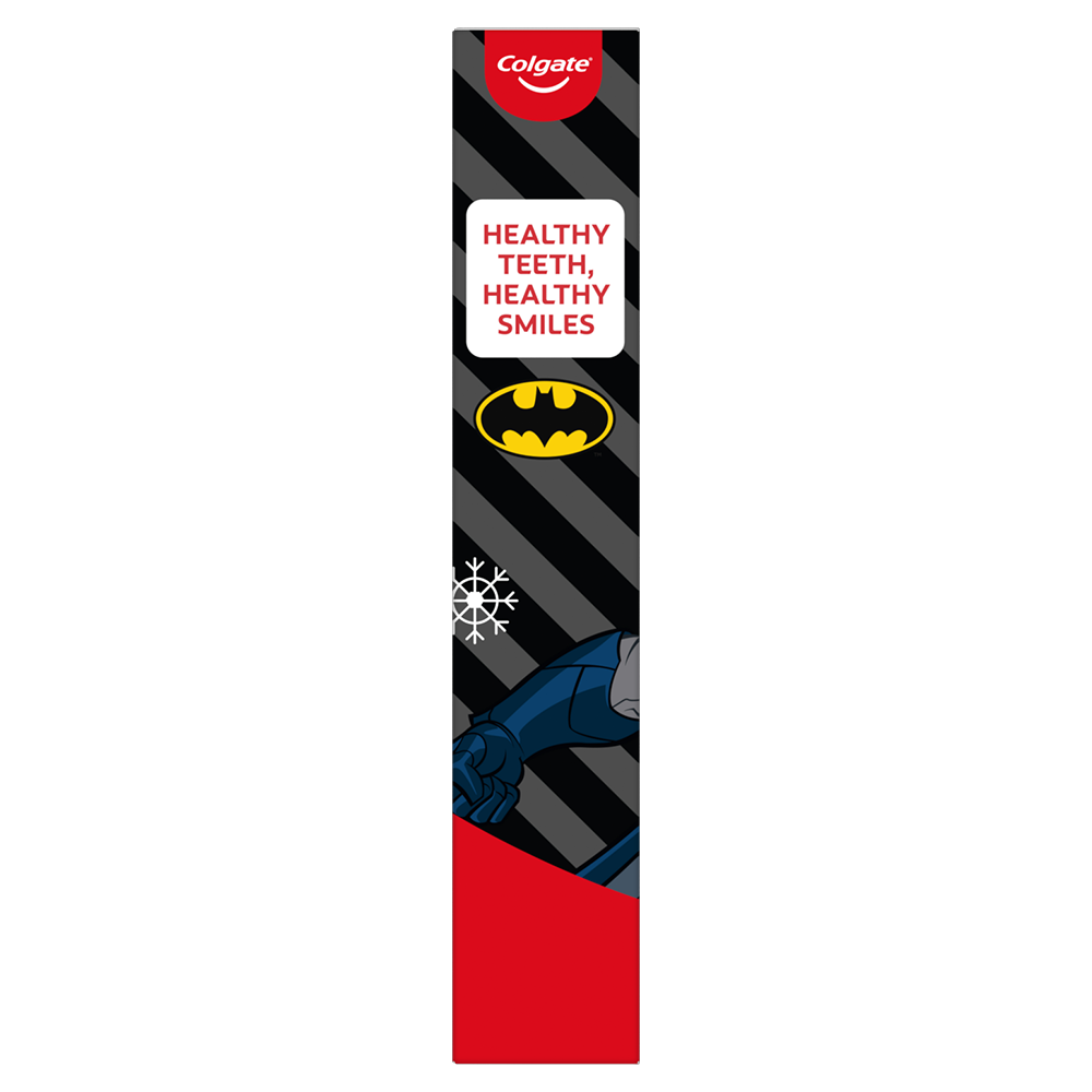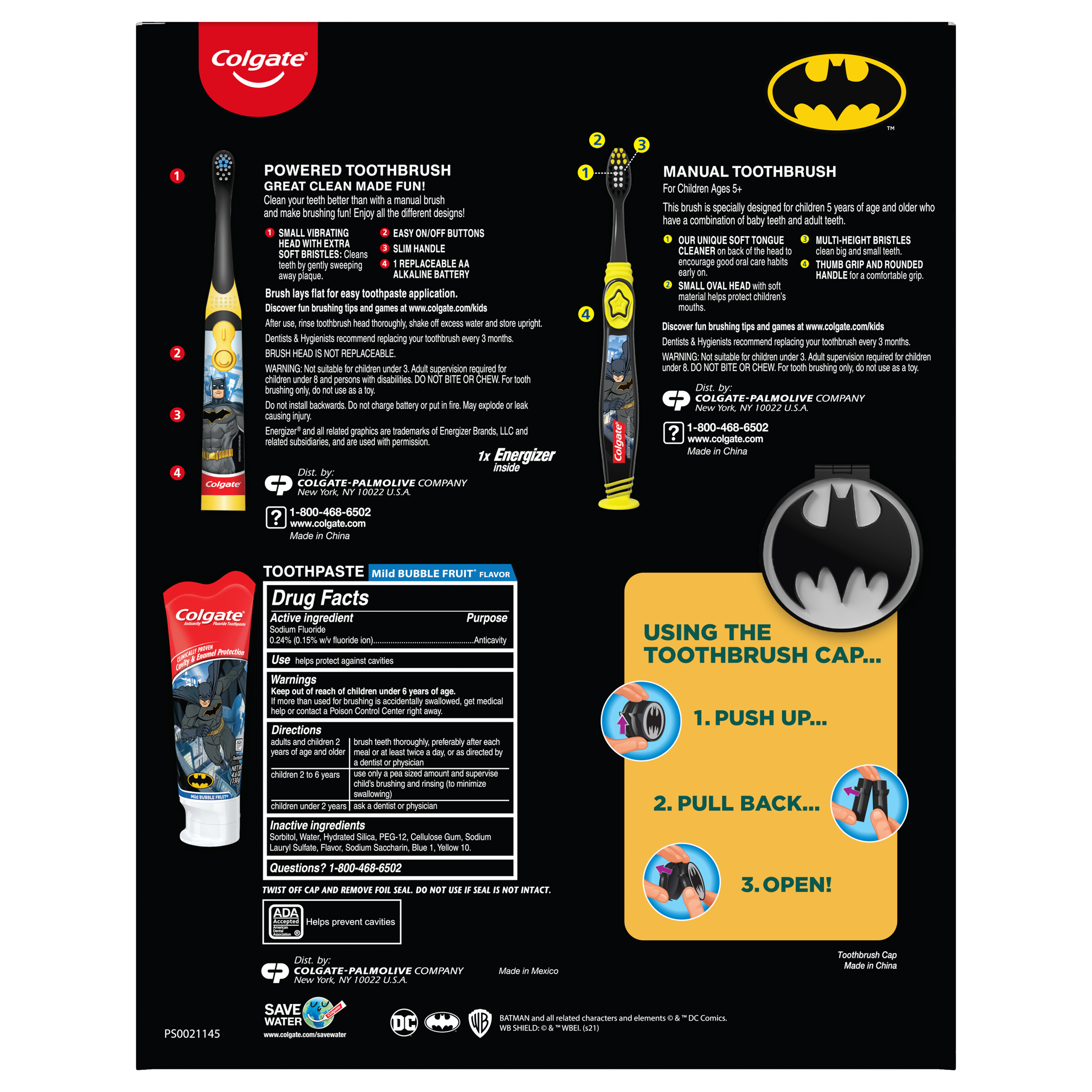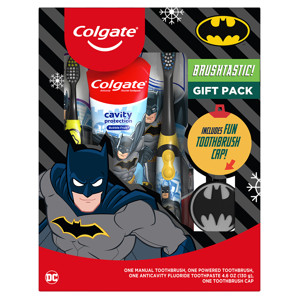 SKU 61016770 Consumer Unit - GTIN 00035000993878 Case - GTIN 10035000993875 Product Category Oral Care Product Sub Category Oral Care SUC Mixed Product Equity (Brand) Colgate Product Sub Brand Oral Care SBR Mixed Product Title Colgate Kids Toothbrush Set with Toothpaste, Batman Gift Pack Bullet 1 Give the gift of Colgate Kids and encourage good brushing habits with this special Batman toothpaste and toothbrush set Bullet 2 The included kids toothbrushes have extra soft bristles that sweep away plaque and clean cavity-causing bacteria from all tooth surfaces Bullet 3 Kids toothpaste and toothbrush set includes 1 cavity protection toothpaste, 1 kids battery toothbrush, 1 manual kids toothbrush and 1 fun toothbrush cap Bullet 4 The included kids toothbrushes have extra soft bristles that sweep away plaque and clean cavity-causing bacteria from all tooth surfaces Bullet 5 Kids cavity protection toothpaste with fluoride has a gentle formula that’s ADA-accepted and clinically proven to protect against cavities Bullet 6 Make teeth brushing fun with Batman and a fun toothbrush cap