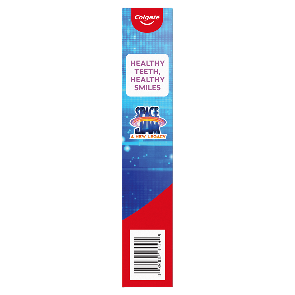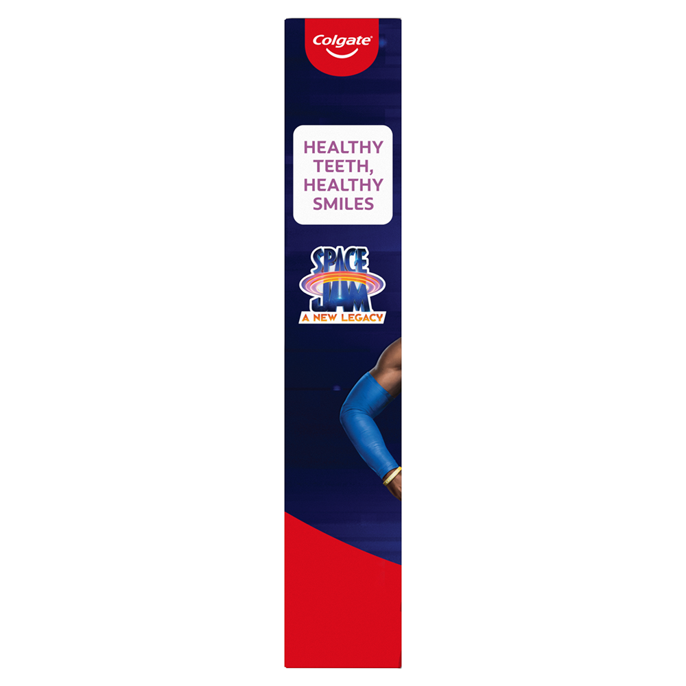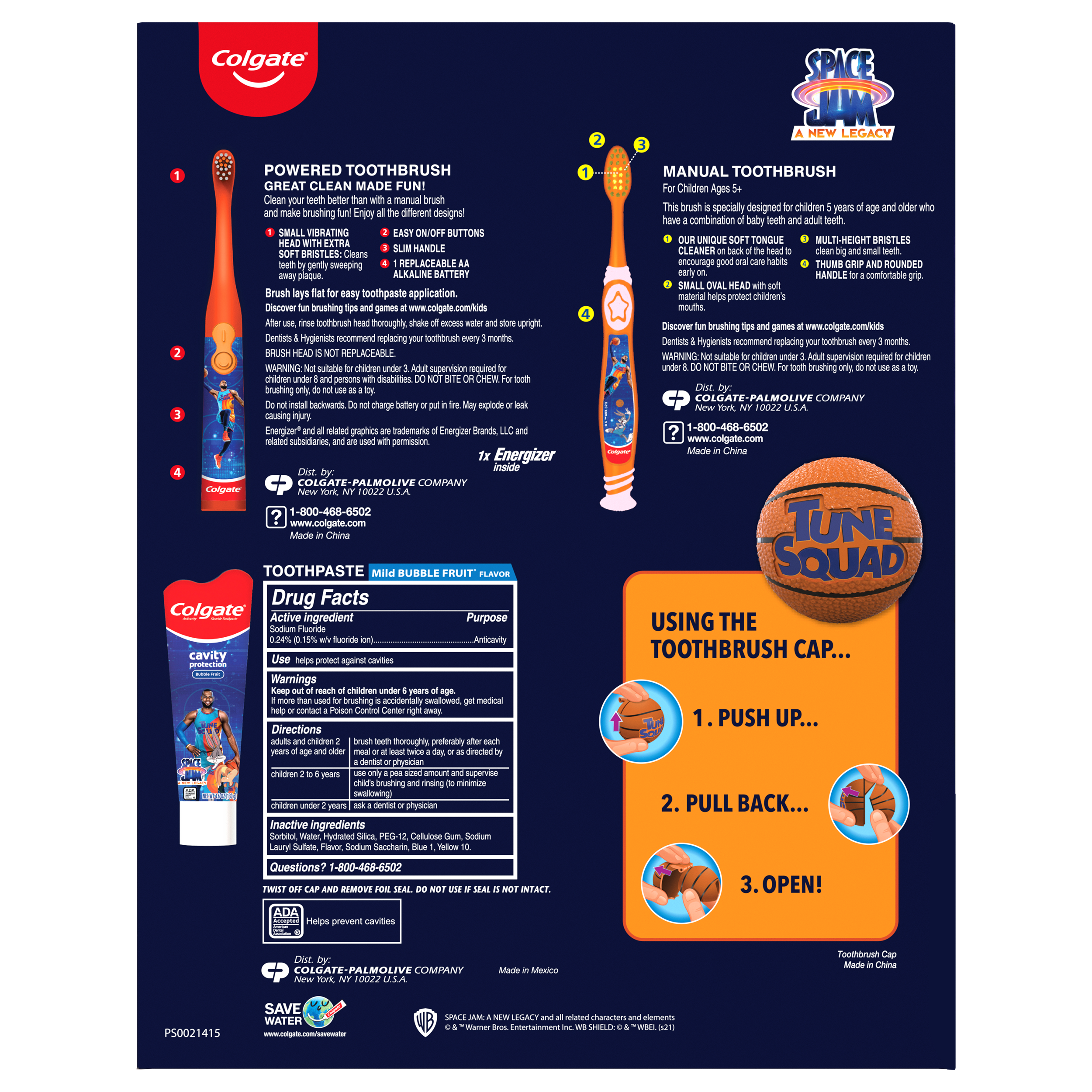 SKU 61016772 Consumer Unit - GTIN 00035000994134 Case - GTIN 10035000994131 Product Category Oral Care Product Sub Category Oral Care SUC Mixed Product Equity (Brand) Colgate Product Sub Brand Oral Care SBR Mixed Product Title Colgate Kids Toothbrush Set with Toothpaste, Space Jam Gift Pack Bullet 1 Give the gift of Colgate Kids and encourage good brushing habits with this special Space Jam toothpaste and toothbrush set Bullet 2 Kids toothpaste and toothbrush set includes 1 cavity protection toothpaste, 1 kids battery toothbrush, 1 manual kids toothbrush and 1 fun toothbrush cap Bullet 3 The included kids toothbrushes have extra soft bristles that sweep away plaque and clean cavity-causing bacteria from all tooth surfaces Bullet 4 The manual kids toothbrush lets kids take the lead on brushing while the kids electric toothbrush is battery operated to help kids brush better (1 AA battery included) Bullet 5 Kids cavity protection toothpaste with fluoride has a gentle formula that’s ADA-accepted and clinically proven to protect against cavities Bullet 6 Make teeth brushing fun with Space Jam and the Tune Squad and a basketball shaped toothbrush cap Active Ingredients Sodium Fluoride 0.24 % (0.15% w/v fluoride ion)