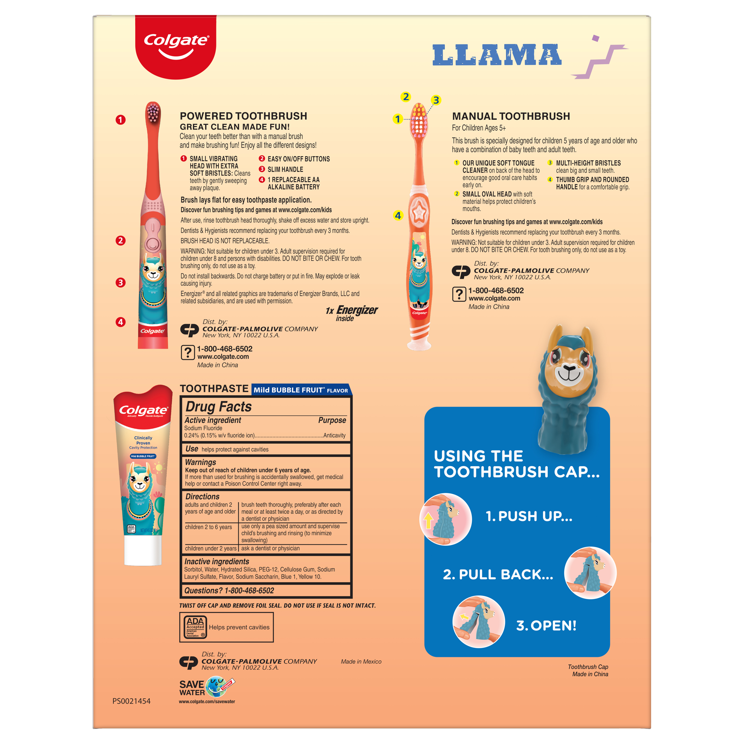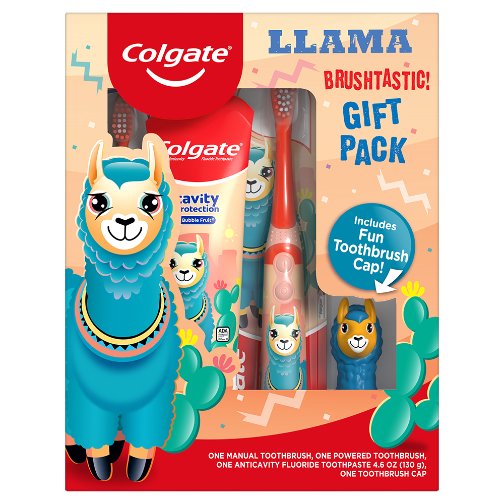 SKU 61016773 Consumer Unit - GTIN 00035000993861 Case - GTIN 10035000993868 Product Category Oral Care Product Sub Category Oral Care SUC Mixed Product Equity (Brand) Colgate Product Sub Brand Oral Care SBR Mixed Product Title Colgate Kids Toothbrush Set with Toothpaste, Llama Gift Pack Bullet 1 Give the gift of Colgate Kids and encourage good brushing habits with this special Llama toothpaste and toothbrush set Bullet 2 Kids toothpaste and toothbrush set includes 1 cavity protection toothpaste, 1 kids battery toothbrush, 1 manual kids toothbrush and 1 fun toothbrush cap Bullet 3 The included kids toothbrushes have extra soft bristles that sweep away plaque and clean cavity-causing bacteria from all tooth surfaces Bullet 4 The manual kids toothbrush lets kids take the lead on brushing while the kids electric toothbrush is battery operated to help kids brush better (1 AA battery included) Bullet 5 Kids cavity protection toothpaste with fluoride has a gentle formula that’s ADA-accepted and clinically proven to protect against cavities Bullet 6 Make teeth brushing fun with a llama toothbrush cap