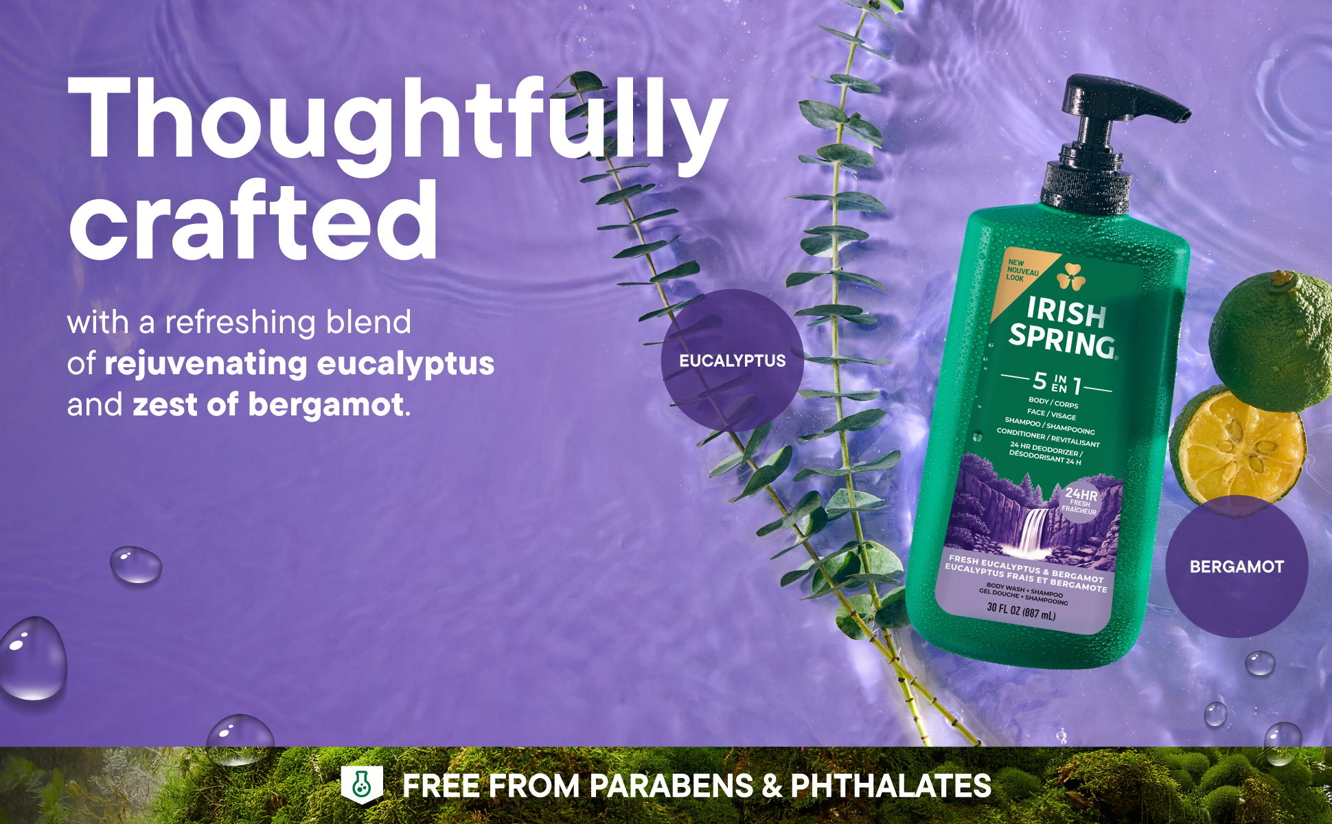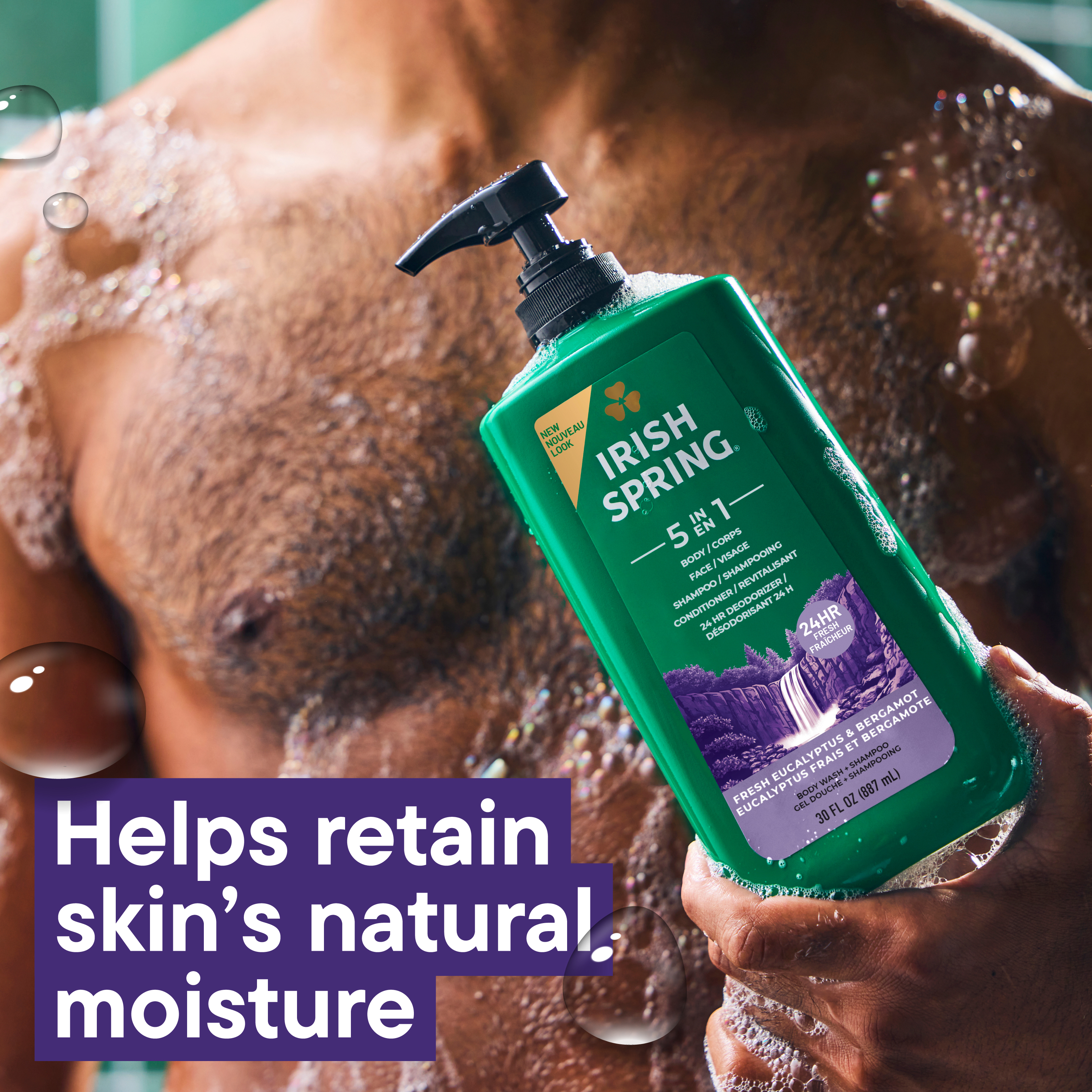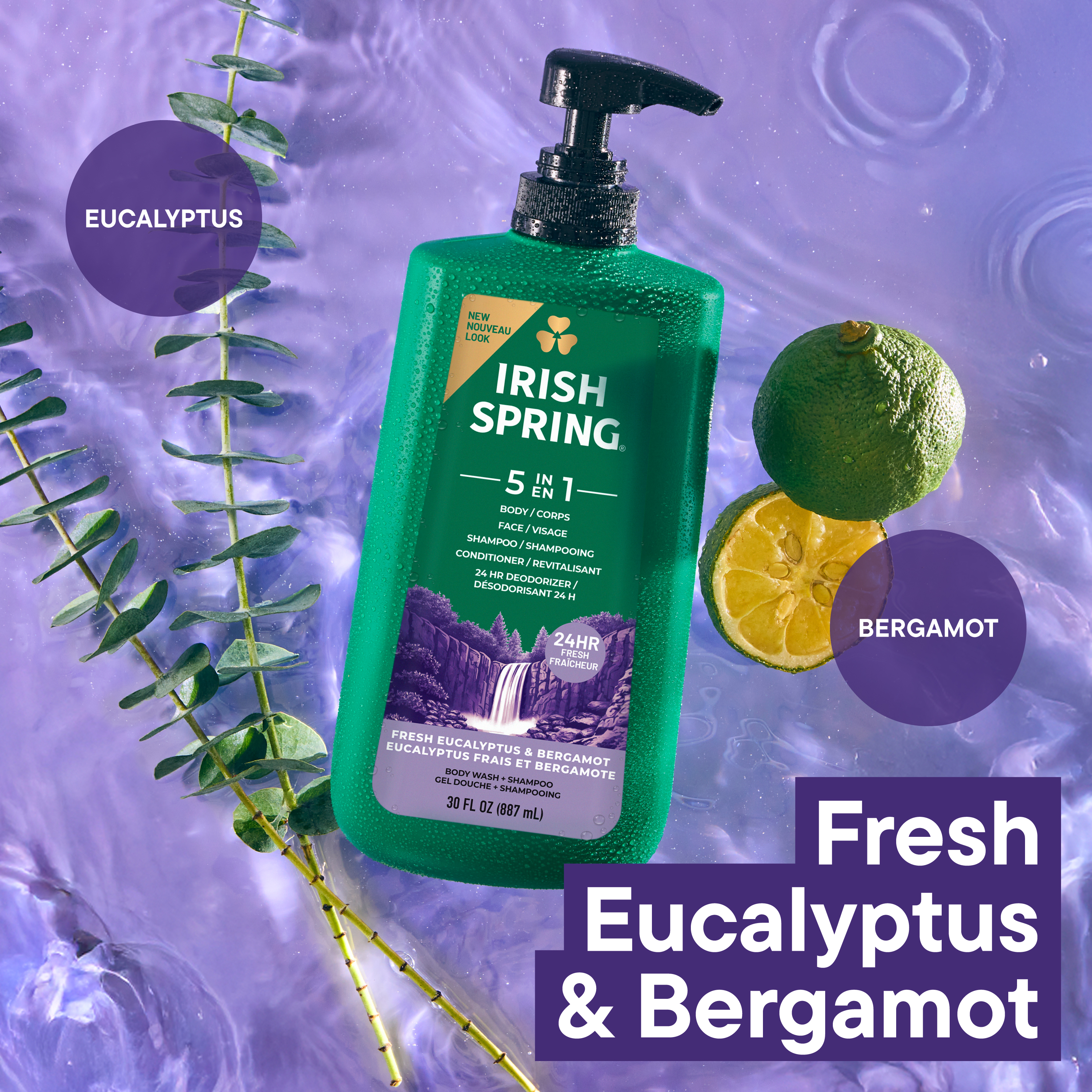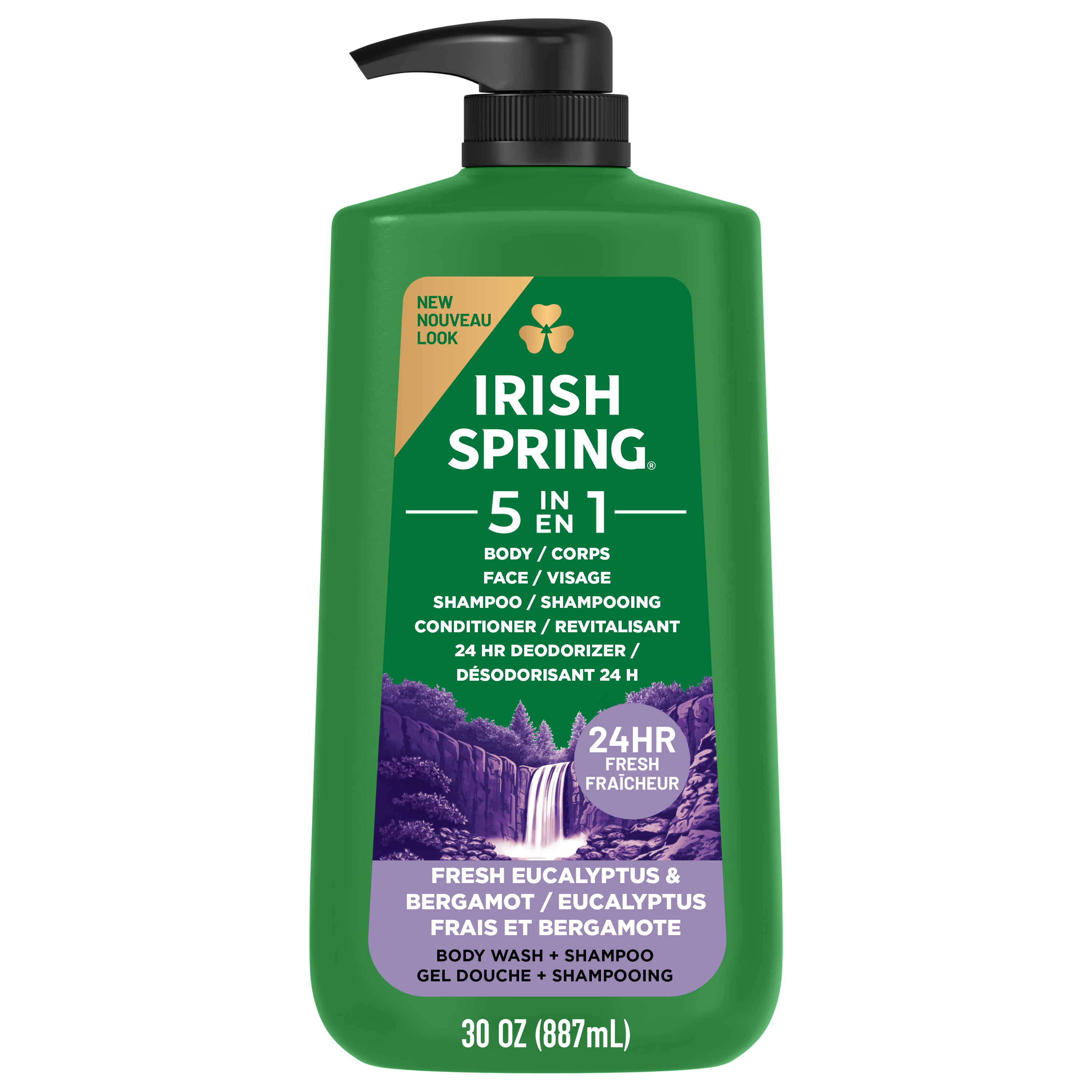 SKU 61017106 Consumer Unit - GTIN 00035000994004 Case - GTIN 10035000994001 Product Category Personal Care Product Sub Category Body Wash Product Equity (Brand) Irish Spring Product Sub Brand Irish Spring BW Product Title Irish Spring 5 in 1 Moisturizing Body Wash for Men, Shampoo, Conditioner, Body and Face Wash, and 24 Hour Deodorizer, Paraben-Free, Fresh Eucalyptus & Bergamot Scent, 30 fl oz Product Description Feel invigorated every day with Irish Spring 5 in 1 Moisturizing Body Wash for Men in Fresh Eucalyptus & Bergamot Scent. Simplify your grooming routine with this men’s body wash that works as your shampoo, conditioner, face wash, body wash, and 24 hour deodorizer. Experience a moisturizing body wash that creates a rich, deep cleansing lather, and retains skin’s moisture, leaving you feeling clean all day. Enjoy invigorating, outdoor freshness in every wash with rejuvenating eucalyptus and the zest of bergamot, making this the perfect men's body soap and eucalyptus body wash for men who love a long-lasting scent. This men's body soap is crafted for an active lifestyle and is suitable for sensitive skin. Each bottle has a leak proof cap making it perfect for bathroom, gym bag, or travel, and ideal for your daily shower routine. Formulated as a paraben free body wash and phthalate free body wash, it offers ingredient transparency for peace of mind. Make Irish Spring body wash part of your daily routine for all-day freshness. eCommerce Copy- Long Description Irish Spring 5-in-1 Body Wash, 30 Oz Pump Smell like you came from a nice-smelling place with Irish Spring Body Wash. Count on Irish Spring 5-in-1 Body Wash to leave your skin feeling clean — our 5-in-1 body wash for men retains skin’s natural moisture while keeping you fresh for 24 hours. Keep the good smells going with Irish Spring body wash. Fresh Look, Great Smell Feel clean, smell serene with the new Irish Spring. Our body wash pump might have a refreshed design, but it’s still the same great body wash you love. Our packaging refresh is all part of our master plan to bring the amazing places you love to smell straight to your bathroom. Plus, with its convenient pump bottle, this body wash pump is shower-shelf ready. Get as fresh as the great outdoors and add some adventure to your everyday with the whole Spring of bar soaps and body washes for men. We want you to smell as great as you feel, so you can focus on moments that turn into memories. Body Wash for Body, Hands and Face Irish Spring 5-in-1 Body Wash has a sudsy lather that washes away bacteria, so you can use it as a face wash or hand soap and keep the fresh smell going all day long. Made with biodegradable cleansing ingredients, this men’s body wash is paraben free and formulated without phthalates. Feel good while washing from head-to-toe with Irish Spring. Bullet 1 One 30 fl oz bottle of Irish Spring 5 in 1 Moisturizing Body Wash for Men, Fresh Eucalyptus & Bergamot Scent Bullet 2 Simplify your grooming routine with this men’s body wash that works as your shampoo, conditioner, face wash, body wash, and 24 hour deodorizer Bullet 3 Moisturizing body wash that retains skin’s moisture, is gentle on skin, and forms a rich lather for a clean feel Bullet 4 Enjoy invigorating, outdoor freshness in every wash with the blend of rejuvenating eucalyptus and zest of bergamot Bullet 5 Formulated as a paraben free body wash and phthalate free body wash, it offers ingredient transparency for peace of mind Bullet 6 Each bottle has a leak proof cap making it perfect for bathroom, gym bag, or travel, and ideal for your daily shower routine Bullet 7 This men’s body soap is crafted for an active lifestyle and is suitable for sensitive skin Amazon RPC B09GN1L2LK AMZ URL https://www.amazon.com/dp/B09GN1L2LK Walmart RPC 673158045 Walmart URL (Computed) https://www.walmart.com/ip/a/673158045 Target RPC 83278027 Target URL https://www.target.com/p/a/-/A-83278027 CVS RPC 595045