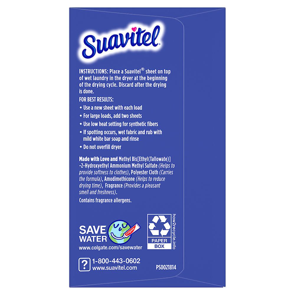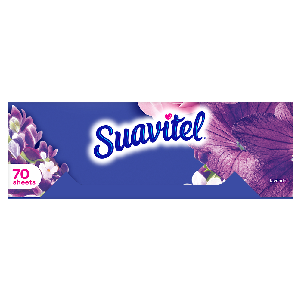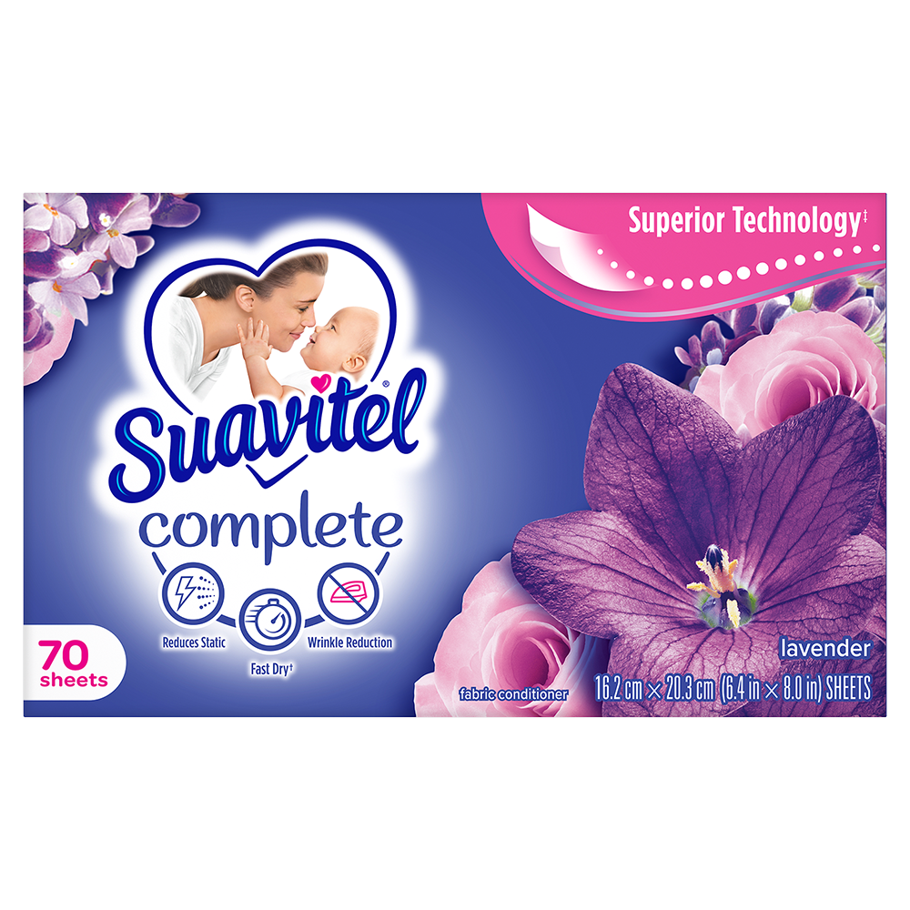 SKU 61017709 Consumer Unit - GTIN 00035000994325 Case - GTIN 10035000994322 Product Category Home Care Product Sub Category FC Sheets Product Equity (Brand) Suavitel Product Sub Brand Suavitel Cmplt Sheets FC Product Title Suavitel Complete Dryer Sheets, Fabric Conditioner, Lavender Scent, 70 Sheets Product Description Discover the power of superior technology (1) with Suavitel Complete Fabric Softener Dryer Sheets. Engineered to streamline your laundry experience, these clothes softener dryer sheets offer a remarkable Fast Dry (2) technology, allowing your clothes to dry quicker compared to regular dryer sheets. Effectively reduces static and provides wrinkle reduction, ensuring a smooth finish for your clothes. Enjoy the added bonus of enduring crisp floral freshness and exceptional softness, transforming your everyday laundry into a delightful experience. But why stop at laundry? Extend the fresh, Lavender scent to other areas of your life by placing Suavitel dryer sheets in dresser drawers, closets, suitcases, and gym bags. Enjoy the irresistibly fresh scent and the exceptional care that Suavitel brings to your clothes, making freshness easier and more delightful than ever for you and your family. (1) Provides Fast Dry benefit vs. Suavitel Regular Dryer Sheets (2) after 5 washes; tested on cotton and cotton-polyester swatches; vs. detergent alone eCommerce Copy- Long Description Suavitel Complete Lavender Fabric Softener Dryer Sheets have superior technology* that reduces static and wrinkles, and provides Fast Dry benefits** – all while delivering irresistible softening and freshness that you and your family will love. Try placing them in dresser drawers, closets, suitcases, gym bags – even in your car – to keep the lavender scent with you wherever you go. And for even better laundry results, pair Suavitel Complete Lavender Dryer Sheets with Suavitel Complete Soothing Lavender Liquid Fabric Conditioner, which helps keep clothes looking newer longer**! *Provides Fast Dry benefit vs. Suavitel Regular Dryer Sheets **After 5 washes; tested on cotton and cotton polyester fabric; vs. detergent alone 50 Years of Loving Softness, Freshness & Care For decades, people have chosen Suavitel for the way it makes their laundry smell and feel - but also for how it makes them feel at home. Suavitel is more than just the sum of its parts: it’s unconditional love, bottled. Today, our fabric conditioners are accessible and affordable, responsibly made,* and are safe for all washing machines. As a brand, we care about more than your clothes - we are committed to helping you care for what you love most and helping you give your family a loving touch that lasts. *To learn more, visit www.colgatepalmolive.com/responsibly-made Bullet 1 One 70 count box of Suavitel Complete Dryer Sheets, Fabric Conditioner, Lavender Scent Bullet 2 Enhanced with 25% more softening ingredients than Suavitel Ultra for superior fabric care Bullet 3 Offers 3-in-1 softening care: increases silkiness, fluffiness, and comfort in every wash Bullet 4 This laundry softener effectively reduces static and provides wrinkle reduction, ensuring a smooth finish for your linens Bullet 5 Wrap yourself in the long-lasting burst of lavender fragrance and a creamy blend of sweet fruits, and soft floral notes Bullet 6 Economical choice with enough liquid for 235 loads Bullet 7 Making freshness easier and more delightful than ever for you and your family with this addition to your laundry supplies Walmart RPC 298353322 Walmart URL (Computed) https://www.walmart.com/ip/a/298353322