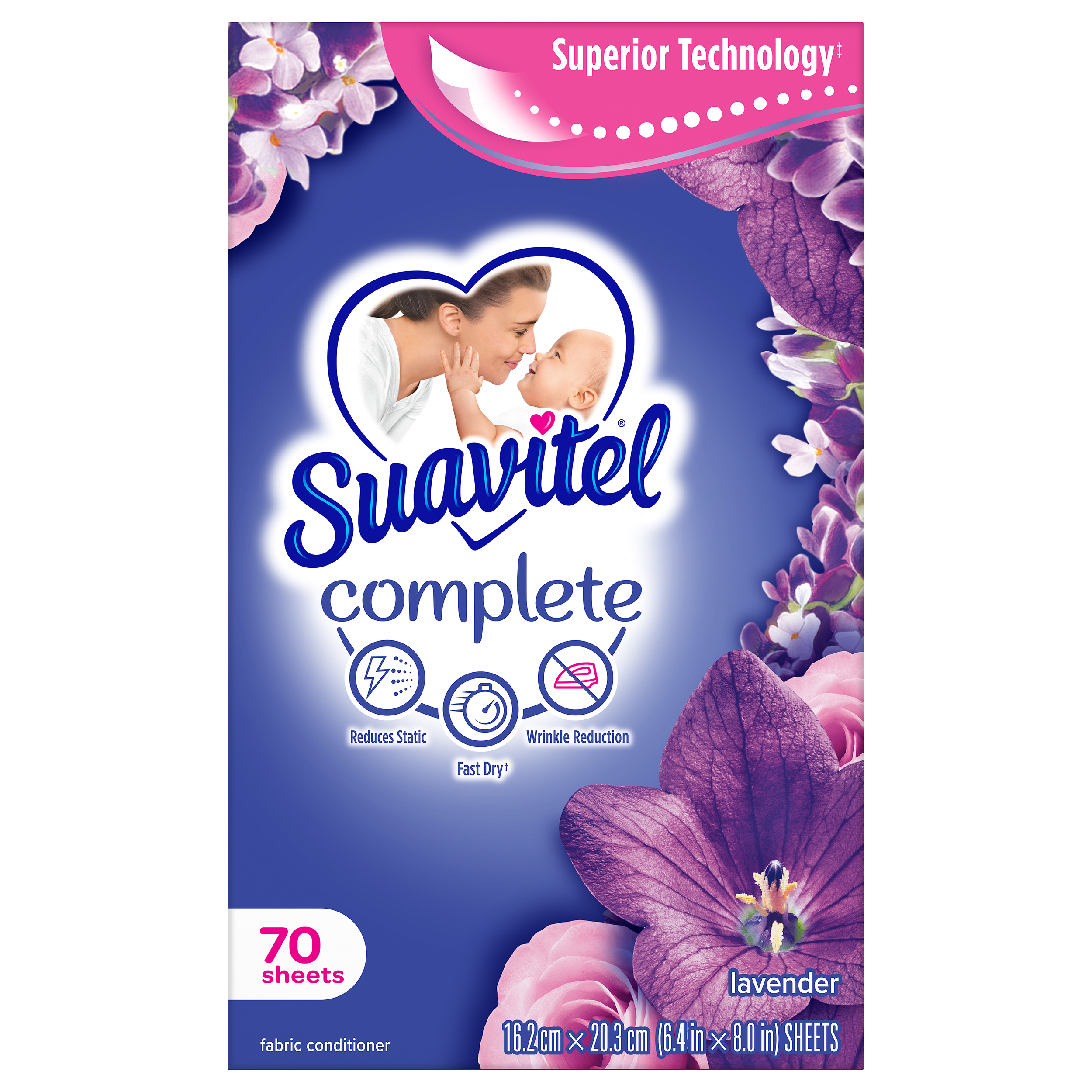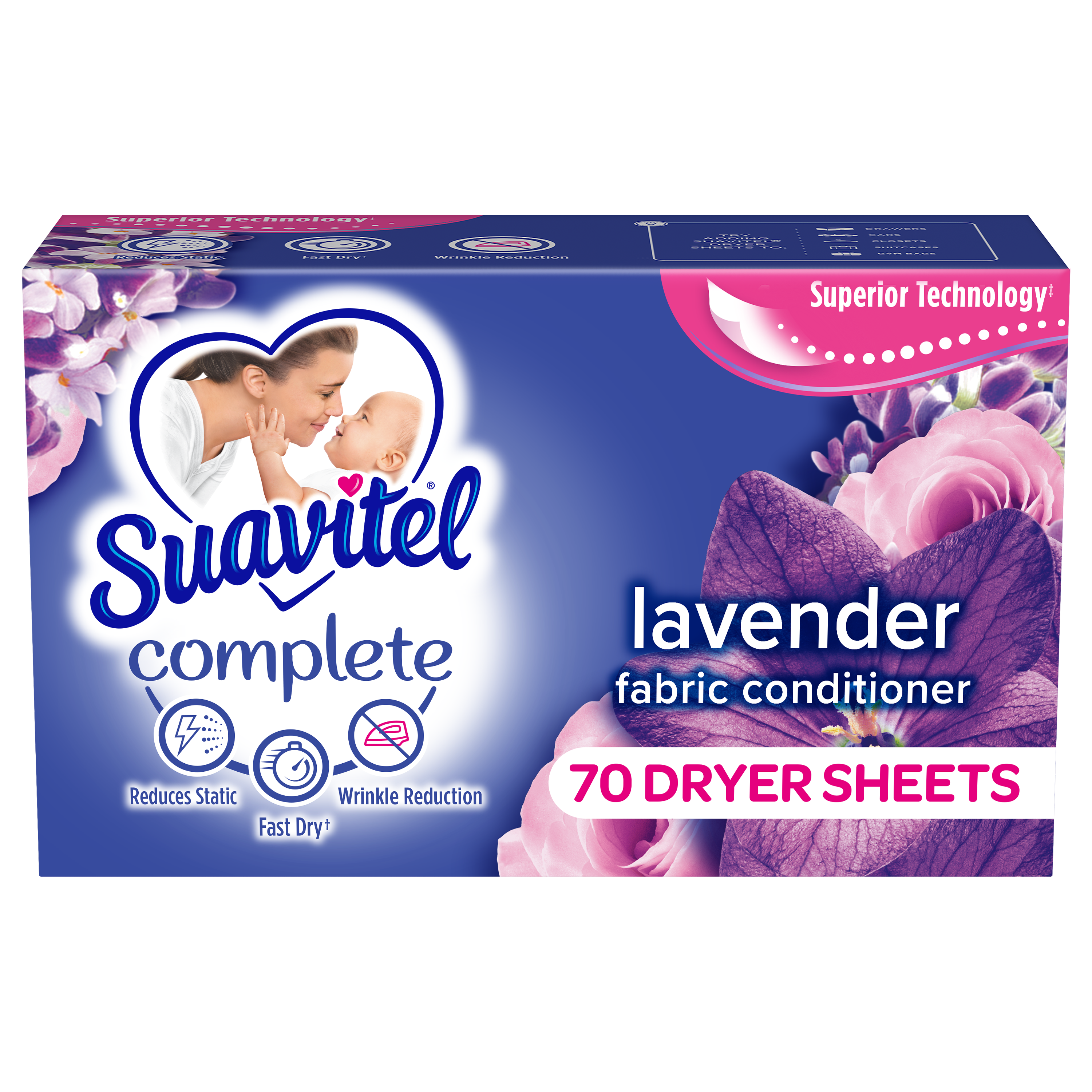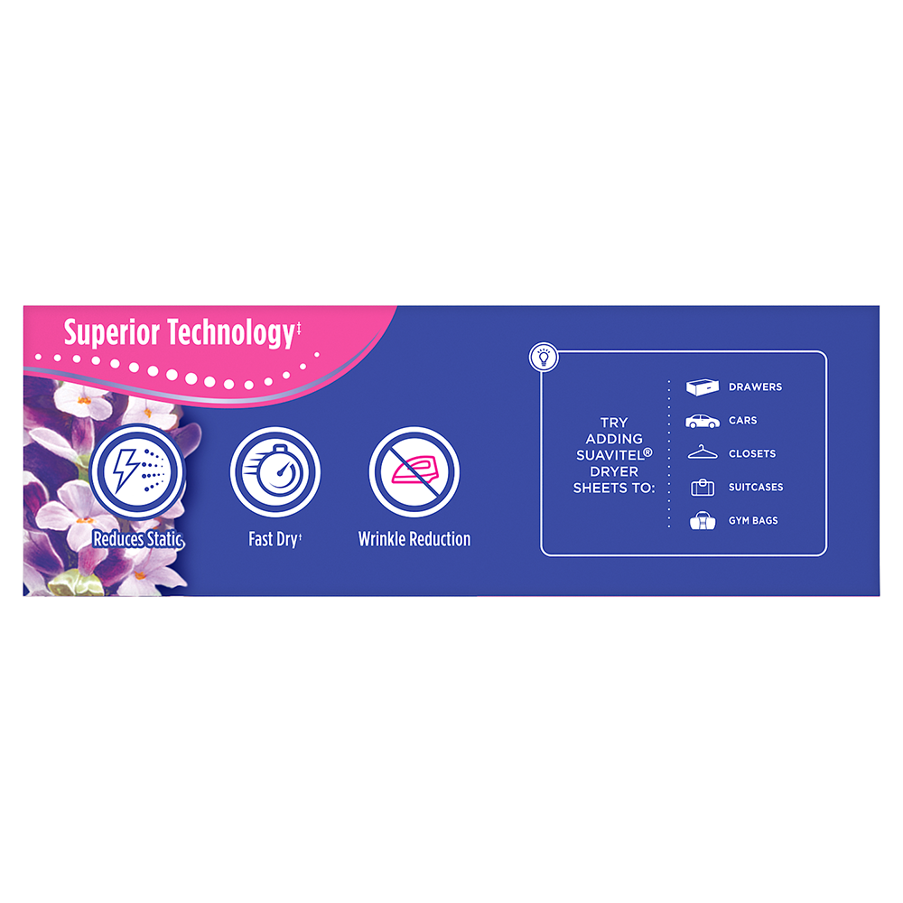 SKU 61017709 Consumer Unit - GTIN 00035000994325 Case - GTIN 10035000994322 Product Category Home Care Product Sub Category FC Sheets Product Equity (Brand) Suavitel Product Sub Brand Suavitel Cmplt Sheets FC Product Title Suavitel Complete Dryer Sheets, Fabric Conditioner, Lavender Scent, 70 Sheets Product Description Discover the power of superior technology (1) with Suavitel Complete Fabric Softener Dryer Sheets. Engineered to streamline your laundry experience, these clothes softener dryer sheets offer a remarkable Fast Dry (2) technology, allowing your clothes to dry quicker compared to regular dryer sheets. Effectively reduces static and provides wrinkle reduction, ensuring a smooth finish for your clothes. Enjoy the added bonus of enduring crisp floral freshness and exceptional softness, transforming your everyday laundry into a delightful experience. But why stop at laundry? Extend the fresh, Lavender scent to other areas of your life by placing Suavitel dryer sheets in dresser drawers, closets, suitcases, and gym bags. Enjoy the irresistibly fresh scent and the exceptional care that Suavitel brings to your clothes, making freshness easier and more delightful than ever for you and your family. (1) Provides Fast Dry benefit vs. Suavitel Regular Dryer Sheets (2) after 5 washes; tested on cotton and cotton-polyester swatches; vs. detergent alone eCommerce Copy- Long Description Suavitel Complete Lavender Fabric Softener Dryer Sheets have superior technology* that reduces static and wrinkles, and provides Fast Dry benefits** – all while delivering irresistible softening and freshness that you and your family will love. Try placing them in dresser drawers, closets, suitcases, gym bags – even in your car – to keep the lavender scent with you wherever you go. And for even better laundry results, pair Suavitel Complete Lavender Dryer Sheets with Suavitel Complete Soothing Lavender Liquid Fabric Conditioner, which helps keep clothes looking newer longer**! *Provides Fast Dry benefit vs. Suavitel Regular Dryer Sheets **After 5 washes; tested on cotton and cotton polyester fabric; vs. detergent alone 50 Years of Loving Softness, Freshness & Care For decades, people have chosen Suavitel for the way it makes their laundry smell and feel - but also for how it makes them feel at home. Suavitel is more than just the sum of its parts: it’s unconditional love, bottled. Today, our fabric conditioners are accessible and affordable, responsibly made,* and are safe for all washing machines. As a brand, we care about more than your clothes - we are committed to helping you care for what you love most and helping you give your family a loving touch that lasts. *To learn more, visit www.colgatepalmolive.com/responsibly-made Bullet 1 One 70 count box of Suavitel Complete Dryer Sheets, Fabric Conditioner, Lavender Scent Bullet 2 Enhanced with 25% more softening ingredients than Suavitel Ultra for superior fabric care Bullet 3 Offers 3-in-1 softening care: increases silkiness, fluffiness, and comfort in every wash Bullet 4 This laundry softener effectively reduces static and provides wrinkle reduction, ensuring a smooth finish for your linens Bullet 5 Wrap yourself in the long-lasting burst of lavender fragrance and a creamy blend of sweet fruits, and soft floral notes Bullet 6 Economical choice with enough liquid for 235 loads Bullet 7 Making freshness easier and more delightful than ever for you and your family with this addition to your laundry supplies Walmart RPC 298353322 Walmart URL (Computed) https://www.walmart.com/ip/a/298353322