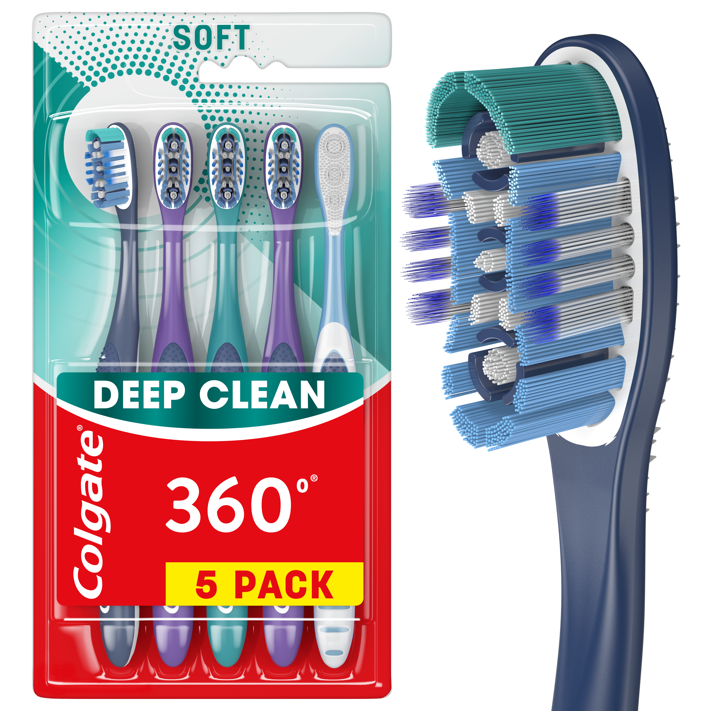 SKU 61017962 Consumer Unit - GTIN 00035000994462 Product Category Oral Care Product Sub Category Manual TB Product Equity (Brand) Colgate Product Sub Brand Colgate 360 Man TB Product Title Colgate 360 Whole Mouth Clean Toothbrush, Adult Soft Toothbrushes, 5 Pack eCommerce Copy- Long Description The Colgate 360⁰ Whole Mouth Clean adult toothbrush is designed with cleaning bristles and polishing cups that help remove more plaque and stains than an ordinary flat-trim toothbrush. This medium toothbrush has a unique cheek & tongue cleaner that helps reduce 151% more bacteria† from your mouth. The cheek and tongue cleaner also comfortably removes odor-causing bacteria. Plus, the Colgate 360⁰ Toothbrush is responsibly made.* Made in a zero true waste, LEED-certified facility, the Colgate 360 toothbrush has 25% recycled plastic and a 100% recycled paperboard backercard. This toothbrush pack includes different colors of toothbrushes for multiple people in a household or for stocking up. Remember to change your toothbrush every 3 months. *To learn more, visit www.colgatepalmolive.com/responsibly-made †Bacteria that cause bad breath vs. brushing teeth alone with an ordinary flat-trim toothbrush Amazon RPC B0BQ1P47X9 AMZ URL https://www.amazon.com/dp/B0BQ1P47X9 Walmart RPC 115805811 Walmart URL (Computed) https://www.walmart.com/ip/a/115805811