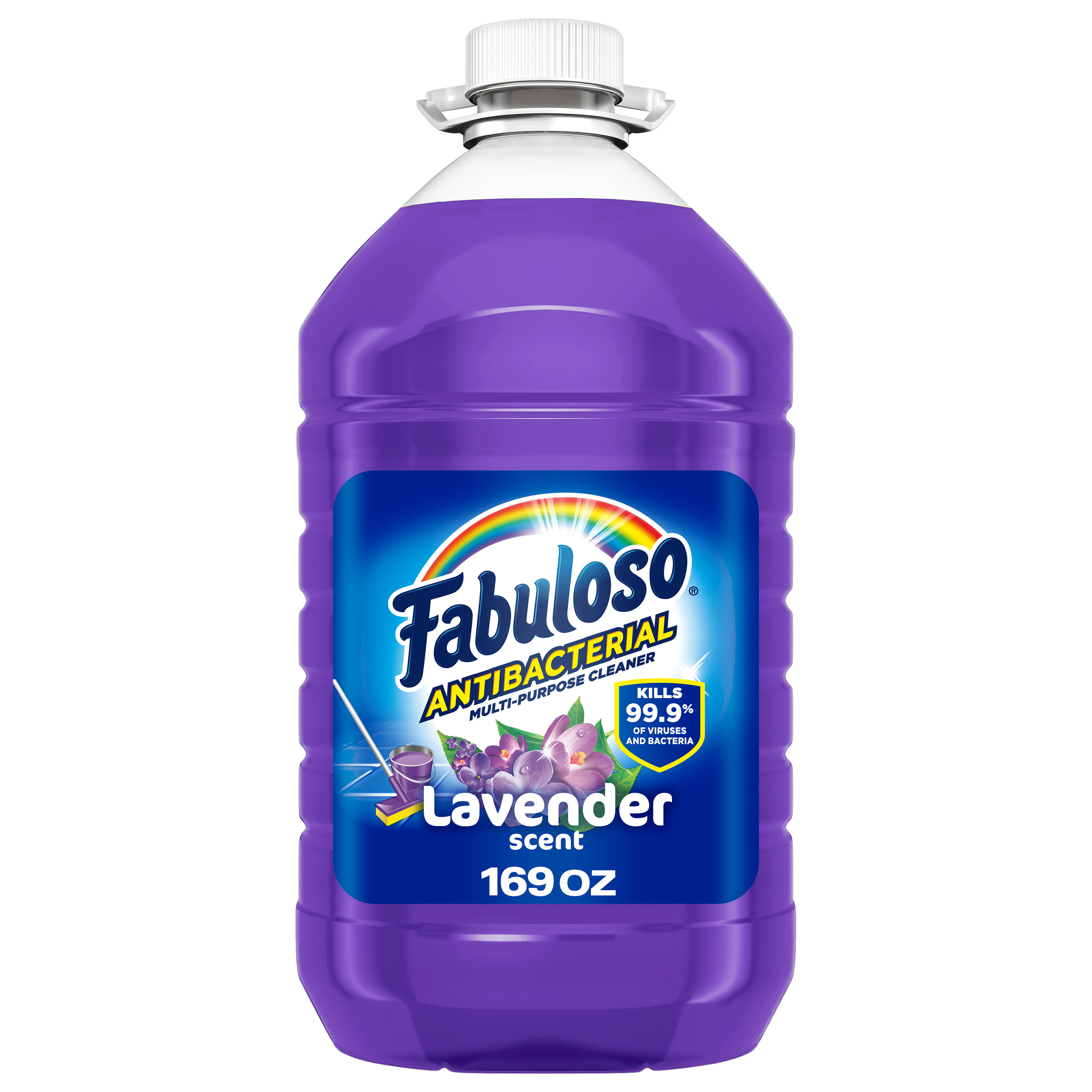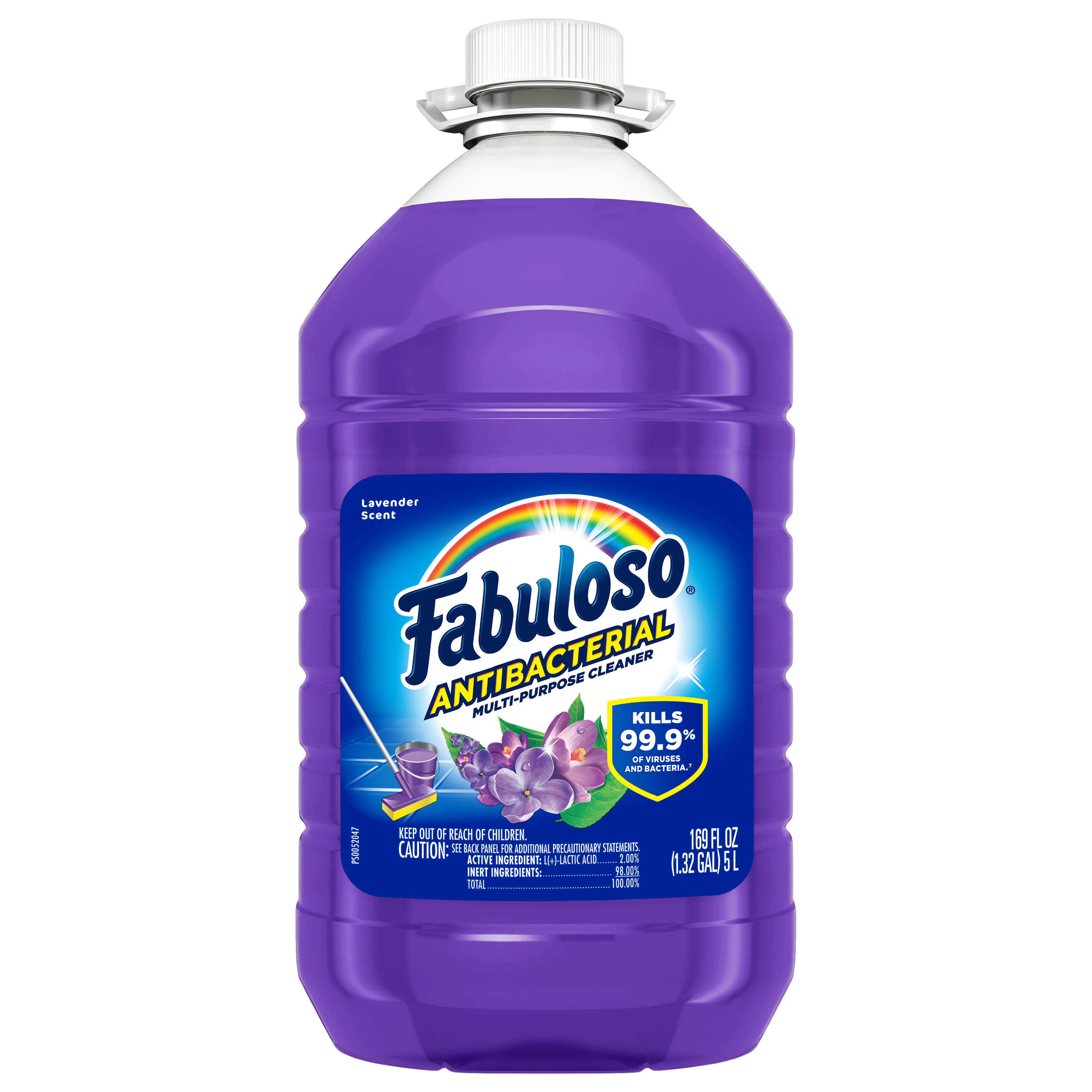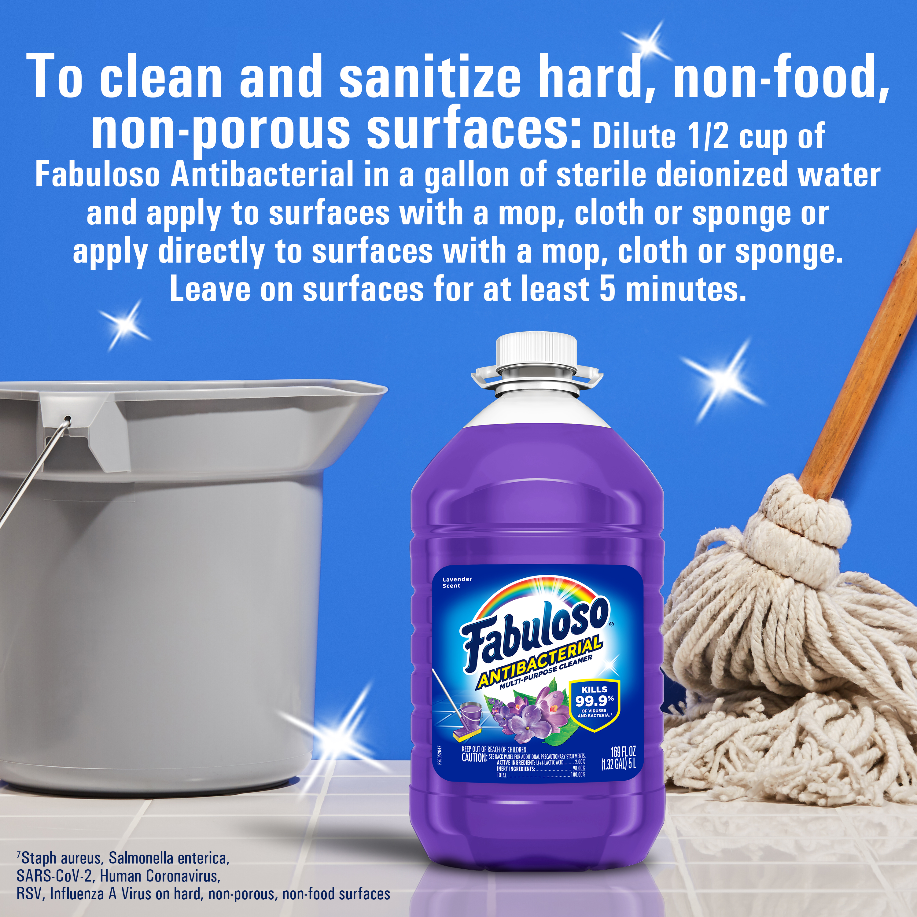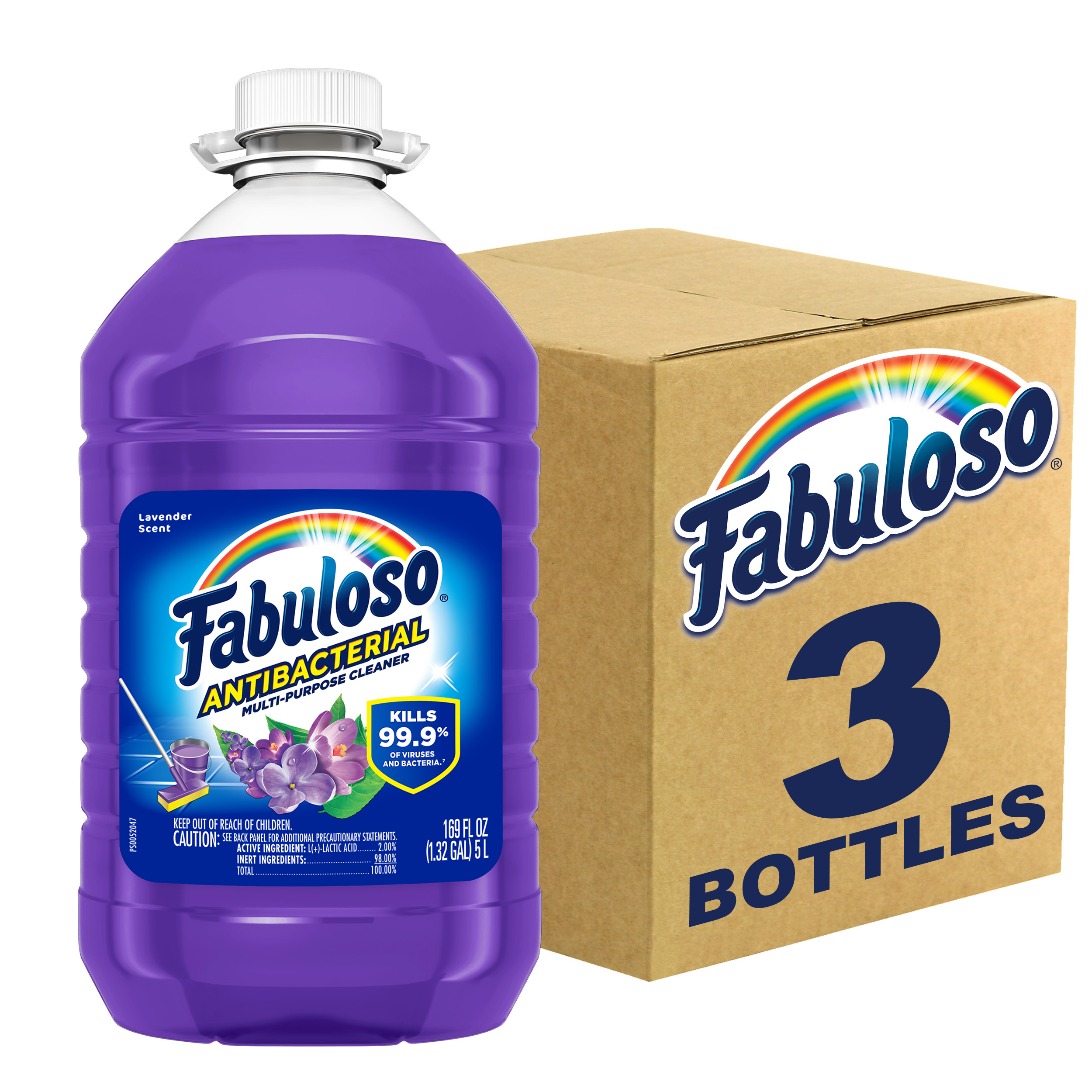 Bullet 1 One 169 oz Bottle of Fabuloso Antibacterial Multi-Purpose Cleaner, Lavender Scent Bullet 2 Kills 99.9% of viruses and bacteria (7) and leaves surfaces clean and disinfected Bullet 3 This multi-action formula cuts through grease, removes limescale, cleans counters, and has an irresistible fragrance Bullet 4 Fills your space with the lavender scent Bullet 5 This all in one cleaner can be used on floors, walls, bathrooms, living rooms, and almost every hard surface Bullet 6 For visibly soiled surfaces, preclean surfaces before sanitizing or disinfecting Bullet 7 See the back of bottle for directions for use Active Ingredients Active Ingredients: L-Lactic Acid (2.00%).